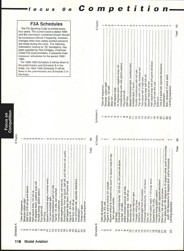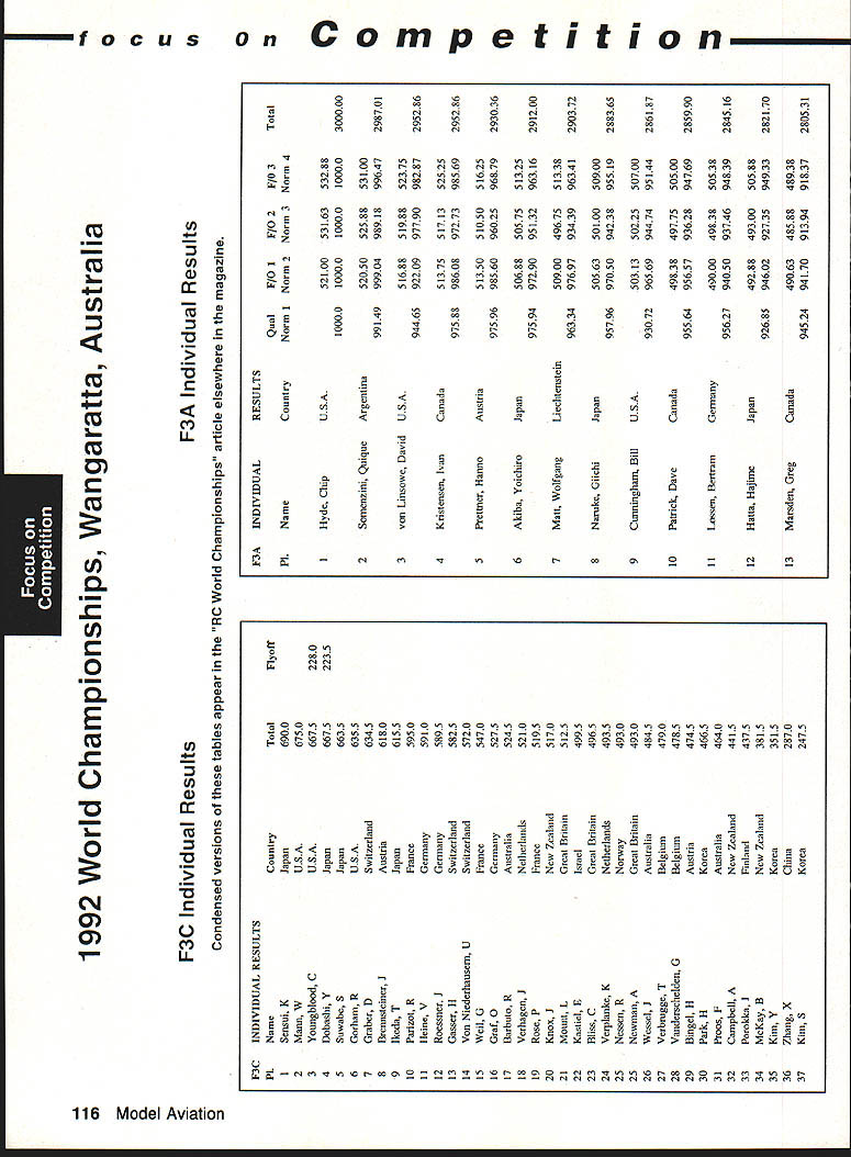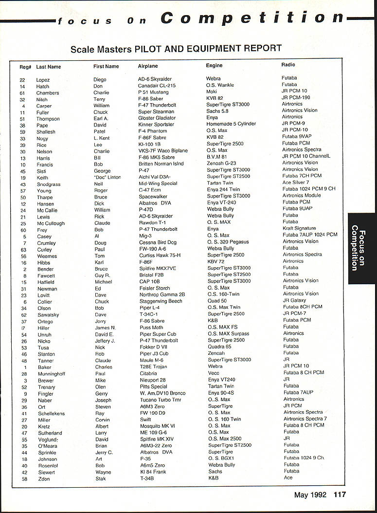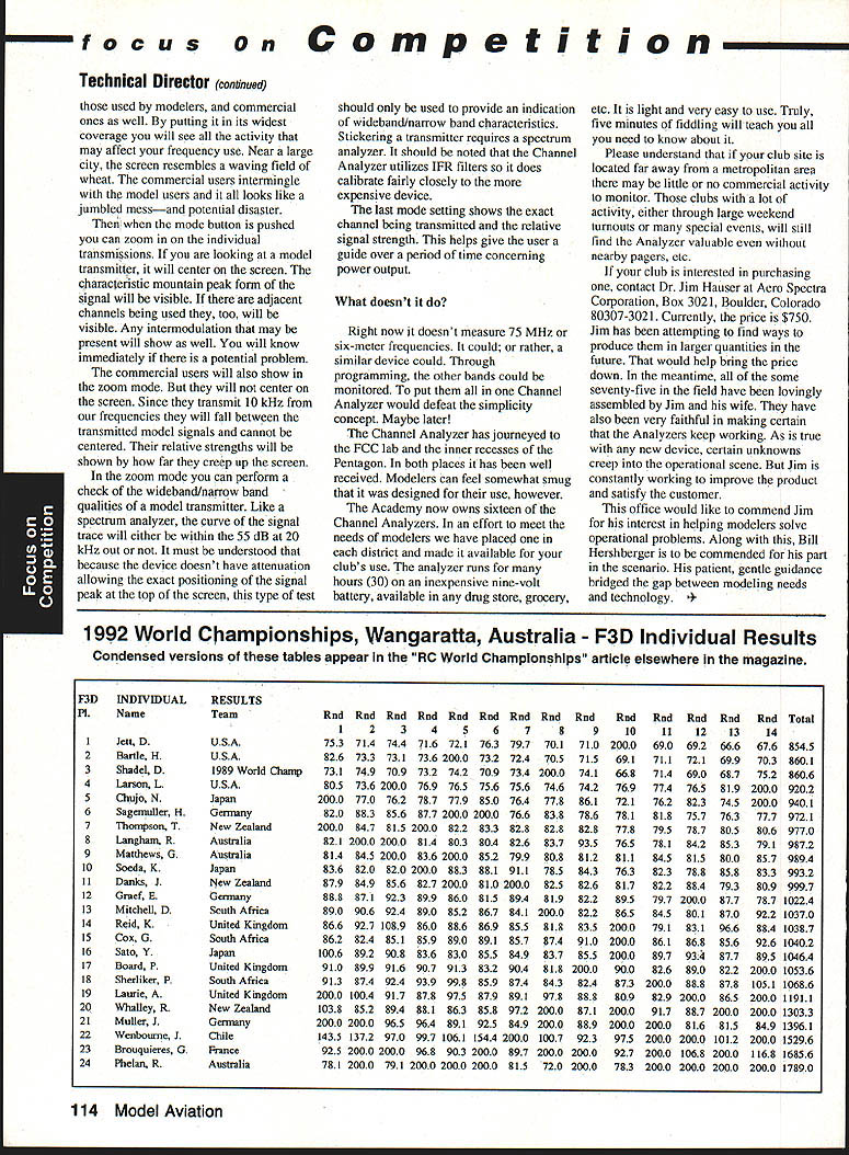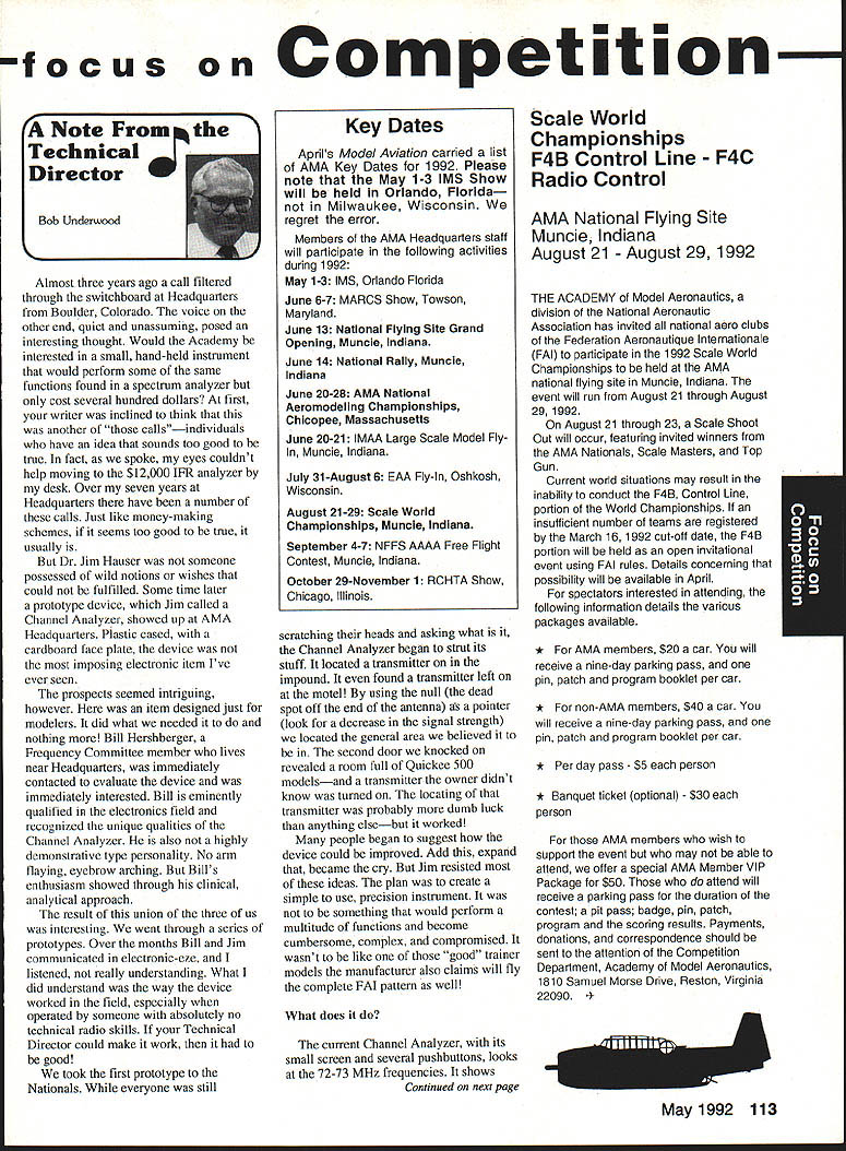 -focus Competition Technical Director Bob Underwood Almost three years ago call filtered through switchboard Headquarters Boulder Colorado voice other end quiet unassuming posed interesting thought Would Academy interested small hand-held instrument would perform some same functions found spectrum analyzer cost several hundred dollars first writer inclined think another callsindividuals have idea sounds too good true fact spoke eyes couldnt help moving $12000 IFR analyzer desk Over seven years Headquarters have number calls Just like money-making schemes seems too good true usually Dr Jim Hauser someone possessed wild notions wishes could fulfilled Some time later prototype device Jim called Channel Analyzer showed up AMA Headquarters Plastic cased cardboard face plate device imposing electronic item Ive ever seen prospects seemed intriguing however item designed just modelers did what needed nothing Bill Hershberger Frequency Committee member lives near Headquarters immediately contacted evaluate device immediately interested Bill eminently qualified electronics field recognized unique qualities Channel Analyzer also highly demonstrative type personality No arm haying eyebrow arching Bills enthusiasm showed through clinical analytical approach result union three us interesting went through series prototypes Over months Bill Jim communicated electronic-eze listened really understanding Wbat did understand way device worked field especially operated someone absolutely no technical radio skills Technical Director could make work good took first prototype Nationals everyone still scratching heads asking what Channel Analyzer began strut its stuff located transmitter impound found transmitter left motel using null dead spot off end antenna pointer look decrease signal strength located general area believed second door knocked revealed room full Quickee 500 modelsand transmitter owner didnt know turned locating transmitter probably dumb luck anything elsebut worked people began suggest device could improved Add expand became cry Jim resisted ideas plan create simple use precision instrument something would perform multitude functions become cumbersome complex compromised wasnt like good trainer models manufacturer also claims will fly complete FAI pattern well What does current Channel Analyzer its small screen several pushbuttons looks 72-7 3 MHz frequencies shows Continued next page Scale World Championships F4B Control Line F4C Radio Control AMA National Flying Site Muncie Indiana August21 -August 29 1992 THE ACADEMY Model Aeronautics division National Aeronautic Association has invited national aero clubs Federation Aeronautique Internationale FAI participate 1992 Scale World Championships held AMA national flying site Muncie Indiana event will run August 21 through August 291992 August 21 through 23 Scale Shoot Out will occur featuring invited winners AMA Nationals Scale Masters Top Gun Current world situations may result inability conduct F4B Control Line portion World Championships insufficient number teams registered March 161992 cut-off date F4B portion will held open invitational event using FAI rules Details concerning possibility will available April spectators interested attending following information details various packages available * For AMA members $20 car will receive nine-day parking pass pin patch program booklet per car * For non-AMA members $40 car will receive nine-day parking pass pin patch program booklet per car * Per day pass $5 person * Banquet ticket optional $30 person AMA members wish support event may able attend offer special AMA Member VIP Package $50 attend will receive parking pass duration contest pit pass badge pin patch program scoring results Payments donations correspondence should sent attention Competition Department Academy Model Aeronautics 1810 Samuel Morse Drive Reston Virginia 22090 992 113 Key Dates Aprils Model Aviation carried list AMA Key Dates 1992 Please note May 1-3 IMS Show will held Orlando Florida Milwaukee Wisconsin regret error Members AMA Headquarters staff will participate following activities during 1992 May 1-3 IMS Orlando Florida June 6-7 MARCS Show Towson Maryland June 13 National Flying Site Grand Opening Muncie Indiana June 14 NatIonal Rally Muncie Indiana June 20-28 AMA National Aeromodeling Championships Chicopee Massachusetts June 20-21 IMAA Large Scale Model FlyIn Muncie Indiana July 31-August 6 EAA Fly-In Oshkosh Wisconsin August 21-29 Scale World Championships Muncie Indiana September 4-7 NFFS AAAA Free Flight Contest Muncie Indiana October 29-November 1 RCHTA Show Chicago Illinois intocus Competition Technical Director continued used modelers commercial ones well putting its widest coverage will see activity may affect frequency use Near large city screen resembles waving field wheat commercial users intermingle model users looks like jumbled messand potential disaster mode button pushed can zoom individual transmissions looking model transmitter will center screen characteristic mountain peak form signal will visible adjacent channels being used too will visible Any intermodulation may present will show well will know immediately potential problem commercial users will also show zoom mode will center screen Since transmit 10 kHz frequencies will fall between transmitted model signals cannot centered relative strengths will shown far creep up screen zoom mode can perform check wideband/narrow band qualities model transmitter Like spectrum analyzer curve signal trace will either within 55 dB 20 kHz out must understood because device doesnt have attenuation allowing exact positioning signal peak top screen type test should used provide indication wideband/narrow band characteristics Stickering transmitter requires spectrum analyzer should noted Channel Analyzer utilizes IFR filters does calibrate fairly closely expensive device last mode setting shows exact channel being transmitted relative signal strength helps give 