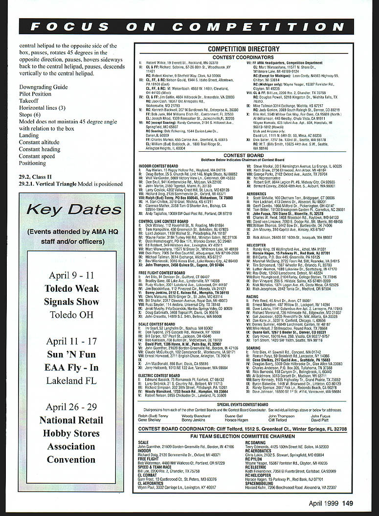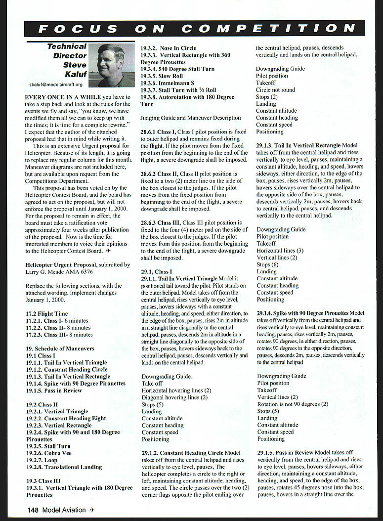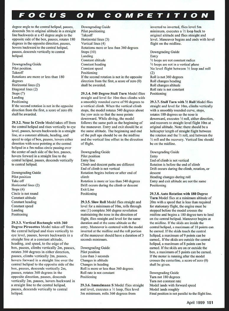 W W W.wW Win Aim — Technical Dire ctor Steve Kalul skaluf@ modelaircraftorg EVERY ONCE IN WHILE have take step back look rules events fly say know have modified can keep up times time complete rewrite expect author attached proposal mind writing extensive Urgent proposal Helicopter Because its length going replace regular column month Maneuver diagrams included available upon request Competitions Department proposal has voted Helicopter Contest Board board has agreed act proposal will enforce proposal until January 1 2000 proposal remain effect board must take ratification vote approximately four weeks after publication proposal Now time interested members voice opinions Helicopter Contest Board 4Helicopter Urgent Proposal submitted Larry G Meade AMA 6376 Replace following sections attached wording Implement changes January 1 2000 172 Flight Time 1721 Class I- 6 minutes 1722 Class II- 8 minutes 1723 Class III- 8 minutes 19 Schedule Maneuvers 191 Class 1911 Tail Vertical Triangle 1912 Constant Heading Circle 1913 Tail Vertical Rectangle 1914 Spike 90 Degree Pirouettes 1915 Pass Review 192 Class II 1921 Vertical Triangle 1922 Constant Heading Eight 1923 Vertical Rectangle 1924 Spike 90 180 Degree Pirouettes 1925 Stall Turn 1926 Cobra Vee 1927 Loop 1928 Translational Landing 193 Class III 1931 Vertical Triangle 180 Degree Pirouettes 1932 Nose Circle 1933 Vertical Rectangle 360 Degree Pirouettes 1934 540 Degree Stall Turn 1935 Slow Roll 1936 Immelmann S 1937 Stall Turn Roll 1938 Autorotation 180 Degree Turn Judging Guide Maneuver Description 2861 Class Class pilot position fixed outer helipad remains fixed during flight pilot moves fixed position beginning end flight severe downgrade shall imposed 2862 Class II Class II pilot position fixed two 2 meter line side box closest judges pilot moves fixed position beginning end flight severe downgrade shall imposed 2863 Class III Class III pilot position fixed four 4 meter pad side box closest judges pilot moves position beginning end flight severe downgrade shall imposed 291 Class 2911 Tail Vertical Triangle Model positioned tail toward pilot Pilot stands outer helipad Model takes off central helipad rises vertically eye level pauses hovers sideways constant altitude heading speed either direction edge box pauses rises 2m altitude straight line diagonally central helipad pauses descends 2m altitude straight line diagonally opposite side box pauses hovers sideways back central helipad pauses descends vertically lands central helipad Downgrading Guide Take off Horizontal hovering lines 2 Diagonal hovering lines 2 Stops 5 Landing Constant altitude Constant heading Constant speed Positioning 2912 Constant Heading Circle Model takes off central helipad rises vertically eye level pauses helicopter completes circle right left maintaining constant altitude heading speed circle passes over two 2 corner flags opposite pilot ending over central helipad pauses descends vertically lands central helipad Downgrading Guide Pilot position Takeoff Circle round Stops 2 Landing Constant altitude Constant heading Constant speed Positioning 2913 Tail Vertical Rectangle Model takes off central helipad rises vertically eye level pauses maintaining constant altitude heading speed hovers sideways either direction edge box pauses rises vertically 2m pauses hovers sideways over central helipad opposite side box pauses descends vertically 2m pauses hovers back central helipad pauses descends vertically central helipad Downgrading Guide Pilot position Takeoff Horizontal lines 3 Vertical lines 2 Stops 6 Landing Constant altitude Constant heading Constant speed Positioning 2914 Spike 90 Degree Pirouettes Model takes off vertically central helipad rises vertically eye level maintaining constant heading pauses rises vertically 2m pauses rotates 90 degrees either direction pauses rotates 90 degrees opposite direction pauses descends 2m pauses descends vertically central helipad Downgrading Guide Pilot position Takeoff Vertical lines 2 Rotation 90 degrees 2 Stops 5 Landing Constant altitude Constant speed Positioning 2915 Pass Review Model takes off vertically central helipad rises eye level pauses hovers sideways either direction maintaining constant altitude heading speed edge box pauses rotates 45 degrees nose box pauses hovers straight line over 148 Modet Aviation 4 central helipad opposite side box pauses rotates 45 degrees opposite direction pauses hovers sideways back central helipad pauses descends vertically central helipad Downgrading Guide Pilot Position Takeoff Horizontal lines 3 Stops 6 Model does maintain 45 degree angle relation box Landing Constant altitude Constant heading Constant speed Positioning 292 Class II 2921 Vertical Triangle Model positioned Toledo OH April 11 17 Sun N Fun EAA Fly Lakeland FL April 26 29 National Retail Hobby Stores Association Convention I Robert Wilkie 19 Everett St Rockloed MA 02370 II CL & FE Richard Sobrino 87-26 88th St Woodhaven NY 11421 AC Robert Kircher 9 ShelIeld Way Clark NJ 07066 Ill CL FF & Nelson Gould 19440 Idaho Street Allentown PA 1Rt03 East CL FE & AC M Weisenbach 4568W 146th Cleveland 0044135 West 18 CL & FE Jim Cotfin 4604 Hillbrook Anrandale VA 22003 AC Jack Cash 10317 Old Annapolis Rd Walkerseille MD 21793 8 AC Kenneth Rlackwell 207 WSasdcreek Rd Enterprise AL 36330 FE Bob Junk 984 Williams Ditch Rd Cantonment FL 32533 CL Joseph Mood 1339 Renosalnee St JacksonvilleFL 32205 RI AC except Soaring Randy Cameron 2t34S Hillcrest Ave Springfield MD 65807 AC Soaring Dale Folkoning 1544 Darien Lake Dr DarieniL 60559 FE Charles Markos 655 Canine Ann Snort old IL 60015 CL William Bad Rodoloch Jo 1055 Trail Ridge Sn Arlington Heights IL 60004 INDOOR CONTEST BOARD I Ray Harlan 15 Hoppy Hollow Rd. Wayland MA 01778 II Snag Barber 255 Chonch Rd Unit 146 Maple Shade NJ 68052 III Walt VanGerdee 5668 Victery View Ln Cincinnati OH 45233 IV Den SnaIl 941 Kimberwicke Rd McLean VA 22102 V Jobs Martin 2180 Tigertail Miami FL 33133 VI Larry