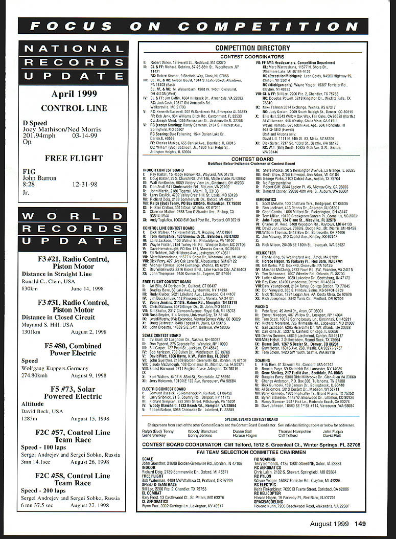 W WM Winw kU W 1Wmm m — W& m EinAAKX -3A April 1999 CONTROL LINE D Speed Jocy Mathison/Ned Morris 20194mph03-14-99 op FREE FLIGHT I Robert Wilkie 19 Everett St Rockland MA 02370 II CL & FF Richard Sobnino 87-26 88th St. Woodhaven NY 11421 BC Robert Kircher 9 Stetfeld Way Clark NJ 07066 III CL FF & RC Nelson Gould 1944 S Idaho Street Allertowo PA 18103 toot CL FE & RC V Weioerbacn 4568W 146th Clovelard OH 44t35 Woot IV CL & FE Jim Colts 4604 Hillbrook Dr Annandale VA 22003 RC Jaco Cash t0317 Od Annapolis Rd Walkarocille MD 2t 793 9 BC Kenneth Blackwell 207 WOandcreek Rd Enteryrise AL 36330 FE Bob Junk 984 Wiliams Ditch Rd Cantunment FL 32033 CLt Joseph Mead 1339 Reessalarn St JacksonvilleFL 32205 VI RC leocept Soariogl Randy Cameron 2t34 S Hillcrest Ave Spninotield MO 60807 RC Soaring Dale FeIrening 1544 Darien Lace Dr DanieniL 60559 FE Charles Markus 655 Canine Ave Deertield IL 60010 CLt William Bud Bedeitch Jr. 1800 Trail Ridge St Anlir9ton HeiGhts IL 60004 911 FE AMA Headguarlers Compelilion Deparlmeal CL Marc Warwashana 115775 Shore Dr Whitmore Lake Ml 48189-9124 BC lEoceyl br Michiganl Leon Curdy 94503 Highway 55 Crilton WI 53014 BC Michigan 0191 Wayne Veager 15367 Forrisler Rd Clayton Ml 49235 VIII CL & EF 611 Lee 2200 Ree 2 Chandler TO 75758 BC Douglas Powell 5218 Kingston Dr. Wichita Falls TO 76310 IXMike Tullman 3014 Exchange Wichita KS 67217 BC Judy Serker 2009 South RaleigE St Cencer CO 80219 9Ellis Hall 5543 Wllnm Oak Way Fair Oaks CA 95628 Surly Al Williamson 445 Westby Chula Vista CA 91911 Wayne Hamada 625 elan Ave ApI. 604 Honolulu HI 96813-1812 Hawaii Olar Arnnna Dacid Lilt 1111 N 64th St 53 Mesa AZ 85205 XI Dck SaIler 7217 So 133rd 51 Seattle WA 98178 BC WT Bill Smith 10625 441r Ace SW Seattle WA 98146 FiG John Barron 828 12-31-98 Jr F3 #21 Radio Control Piston Motor Distance Straight Line Ronald C. Clem USA 830kmJune 14 1998 F3 #31 Radio Control Piston Motor Distance Closed Circuit Maynard S Hill USA 1301kmAugust 2 1998 F5 #80 Combined Power Electric Speed Wolfgang KuppersGermany 274S0kmhAugust 9 1998 F5 #73 Solar Powered Electric Altitude David Beck USA 1283m August 15 1998 F2C #57 Control Line Team Race Speed 100 laps Sergei Andrejev Sergei Sobko Russia 3mn 14lsec August 26 1998 F2C #58 Control Line Team Race Speed 200 laps Sergei Andrejev Sergei Sobko Russia 6 mn 375 sec August 27 1998 INDOOR CONTEST BOARD I Ray Harlan 15 Happy Hollow Rd Wayland MA 01779 II Doug Barber 25S Church Rd Unit t46 Maple Shade NJ 08052 III Walt VanSeeder 5669 Victory View Lo Cincinnati OH 45233 IV Don Scull 941 Kimberwicke Rd. McLean VA 22102 V John Martin 2180 Tigertail Miami FL 33133 VI Larry Coslick 4202 Valley Crest Hill St Louis MD 63128 VII Ricuard Duig 2139 Semmemille Dr Ontord Ml 48371 VIII Ralph lOBdI Tenay P0 Boo 838545 Richardseme TX 701180 IX H Stan Chilton 3019 Grail Wichita KS 67211 X Clarence Mather 2358 Tam OShanter Aye Bishop CA 93514-1944 XI Andy Tagliatico 190390W Quarl Post Rd Portland 0997219 CONTROL LINE CONTEST BOARD I Dick Wolsoy 112 Hacerhill Sn N 9eading MA 01964 II Tom Hampshire 430 Greenwich SI Belvidere NJ 07823 III Laird Jackson 1100 Walnut St Ptriladelphia PA 19107 IV Wayne Pester 31 84 Turkey Hill Rd Winston Salem NC 27196 V Dace Hemstrnught PD Ben 171 Moncks Corner SC 29461 VI Ed Robbert 349 HubDone Ace Leninglon KY 40511 VII Marc Warwashana 11577 N Shore Dr Whirmuro Lake Ml 48169 VIII Dick Perry 427 Lice Oak Lane NE Aleuquergue NM 87122 IX Michael Tallman 3014 Enchange Wichita KS 67217 B BeuWisniewoki 3316 Kiowa Bind Lake Hacaso City AZ 66403 XI John Thompson 2456 Quince St Eugene 0997404 FREE FLIGHT CONTEST BOARD I Art ElIlo 64 Denison Dr Guilloed CT 66437 II Bradley Bane 60 Lake Ace Lyndoncille NY 14098 III Rudy Klulber 2021 Lakeland Ace Lakewone 0844107 IV Jim Bocckintuso 112 Pinecrest Cm Moneta VA 24121 B BonnyJenkins 3112 E Rairres Rd Memphis TN 38118 VI Chrro Matouno 8576 Singer Dr St John MO 63114 VII Bill Shailor 2317 Clawuon Acenue Royal Oak Ml 48073 VIII Russ Snyder 114 Andora Unicersal City TX 79149 IX Jerald Murphy 9 Via Escondido Mansoy Spdngs Valley CD 80829 X Doug Salbreath 3498 Topsail P1 Davis CA 95616 Xl John Crosetto 14809 SE 54th Bellecue WA 98006 SCALE CONTEST BOARD I Im Sean 52 .angnolm Dr Nashua NH 03062 II Don Typond 275 Cascade Rd Warwick NY 10990 III Bill Carper 127 Pearl St Jackson 0845640 IV Bob Karloson 708 Bullet Dr Middletown DE 19709 V David PIaD 1306 Navre NW Palm Bay FL 32987 VI John Suentnee 21609 Borden-Sneenyille Rd Borden 1547106 VII Claude McCullough 102 Constance St Montezuma IA 50171 VIII Ernest harwood 2711 English Ctase Arlington TO 76016 IX X Kent Walters 6407 N 83rd St Scollodale AZ 85250 Xl Jerry Holcomb 1610 NE 122 Ace Vancouver WA 98684 ELECTRIC CONTEST BOARD I Edmund Bassick 75 Romanock P1 Fairfield CT 06432 II Larry Sniboick 21 5 Country Rd Beliport NY 11713 Ill Richard Simpson 332 391n Street PiDsburgh PA 15201 IV Woody Blanchard 1133 Beach Rd Hamplan VA 23664 V Robert Nelson 5955 Chickadee Dr Lakeland FL 33809 leve Mookal 30S 4evsington Avenue Lagrange IL 60525 Bith Sham 2756 Olmwvod Ann Arber Ml 48104 VIIISeor9e Parks 2102 Ovtord Acv Austin TO 78704 IX No Represenlalice obert SIiO8044 Legion Fl #6 Midway City CA 92655 ernard Cawley 29838 481n Ave S Auburn WA 98001 AEROBATICS coT Melville 100 Chatham Tere Bridgeport CT 06606 Lockhart 413 Dennis Dr Aboecon NJ 08201 IIIGeolt Combo 1066 Miltord Dr Pickeringlva 0643147 IVTom Miller 19130 Brnokgreen Saloon P1 Cornelius NC 28631 oh FBqBa 724 Diane SI Niceville FL 32578 VICharles W Reed 5408 Woodoon Rd Raylown MO 64133 VII David von Littuwe 70936 Dodge Re. Ml Morris Ml 48458 VIlItWilliam Thomas 5442 Bow Dr. Bartlesuille OK 74006 IX Jim Mowroy 310 Capitol Ave. Kinsley KS 67547 B Xl Rick Allison 26405 SE 160th 51 Issaquab WA 88027 HELICOPTER I Randy King 59 Wallie9tnrd Ave AlSo MA 01331 II Horace Hagen 15 Parkway Fl Red Bank NJ 87701 III Bill Curtis PO Boo 449 Greenville PA 16125 IV Manshall McCljng 2722 Fawn Rd SW Roanoke VA 24815 V Tim Schoonard 1507 Wheeler Rd 