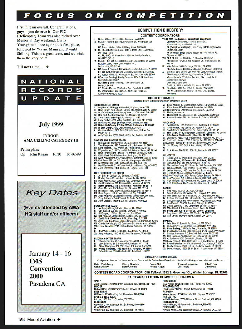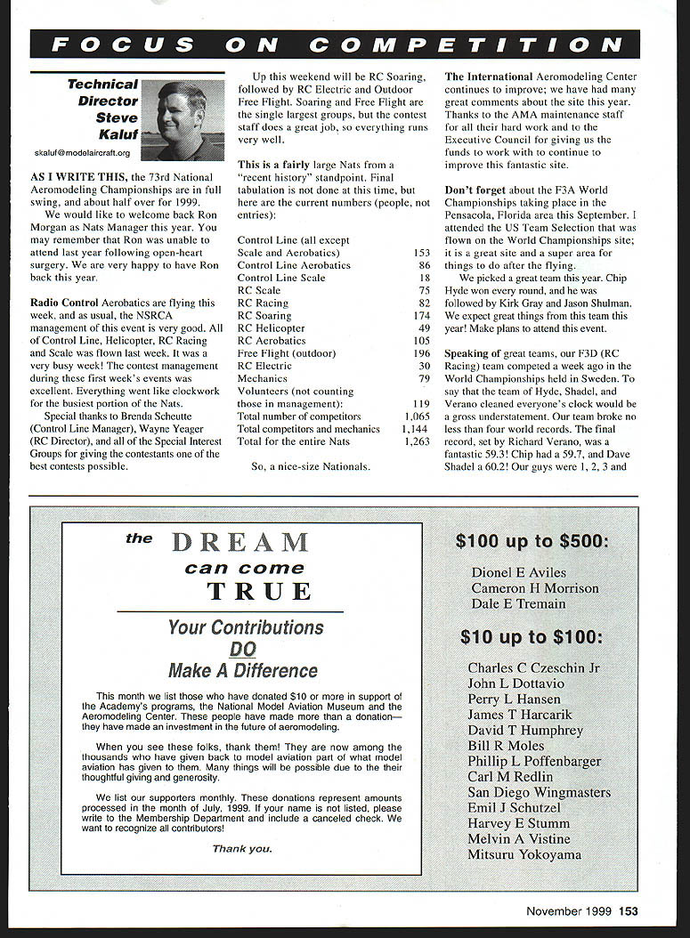 Technical Director Steve Kaluf skaluf@modelaircraft org AS WRITE THIS 73rd National Aeromodeling Championships full swing about half over 1999 would like welcome back Ron Morgan Nats Manager year may remember Ron unable attend last year following open-heart surgery very happy have Ron back year Radio Control Aerobatics flying week usual NSRCA management event very good Control Line Helicopter RC Racing Scale flown last week very busy week contest management during first weeks events excellent Everything went like clockwork busiest portion Nats Special thanks Brenda Scheutte Control Line Manager Wayne Yeager RC Director Special Interest Groups giving contestants best contests possible Up weekend will RC Soaring followed RC Electric Outdoor Free Flight Soaring Free Flight single largest groups contest staff does great job everything runs very well fairly large Nats recent history standpoint Final tabulation done time current numbers people entries Control Line except Scale Aerobatics Control Line Aerobatics Control Line Scale RC Scale RC Racing RC Soaring RC Helicopter RC Aerobatics Free Flight outdoor RC Electric Mechanics Volunteers counting management Total number competitors Total competitors mechanics Total entire Nats 153 86 18 75 82 174 49 105 196 30 79 119 1065 1144 1263 So nice-size Nationals International Aeromodeling Center continues improve have great comments about site year Thanks AMA maintenance staff hard work Executive Council giving us funds work continue improve fantastic site Dont forget about F3A World Championships taking place Pensacola Florida area September attended US Team Selection flown World Championships site great site super area things after flying picked great team year Chip Hyde won round followed Kirk Gray Jason Shulman expect great things team year Make plans attend event Speaking great teams F3D RC Racing team competed week ago World Championships held Sweden say team Hyde Shadel Verano cleaned everyones clock would gross understatement team broke no less four world records final record set Richard Verano fantastic 593 Chip 597 Dave Shadel 602 guys 1 2 3 DREAM can come TRUE Contributions DO Make Difference month list have donated $10 support Academys programs National Model Aviation Museum Aeromodeling Center people have made donation have made investment future aeromodeling see folks thank now among thousands have given back model aviation part what model aviation has given things will possible due thoughtful giving generosity list supporters monthly donations represent amounts processed month July 1999 name listed please write Membership Department include canceled check want recognize contributors $100 up $500 Dionel E Aviles Cameron H Morrison Dale E Tremain $10 up $100 Charles C Czeschin Jr John L Dottavio Perry L Hansen James T Harcarik David T Humphrey Bill R Moles Phillip L Poffenbarger Carl M Redlin San Diego Wingmasters Emil J Schutzel Harvey H Stumm IA~1n XJktnp Thank youMitsuru Yokoyama November 1999 153 first team overall Congratulations guysyou deserve F3C Helicopter Team also picked over Memorial Day weekend Curtis Youngblood once again took first place followed Wayne Mann Dwight Shilling great team wish very best Till next time . 1999 INDOOR AMA CEILING CATEGORY III Pennyplane Op John Kagan 1620 05-02-99 I Robert Wilkin 19 Everett St Rockland MA 02370 II CL & FF Richard Gobrino 87-26 88111 St Woodhanen NY 11421 RC Robed Kircher 9 Shefteld Way Clark NJ 07066 Ill CL FF & NC Nelson Gould 1944 3 Idaho Street Alleetawn PA 18103 East CL FF & RC M Weiseebach 4568W 146th Clenelaed OH 44135 West IV CI & FF Jim Coffin 4604 Hillbrouk Sr Aenoodale VA 22003 RC Jack Cash 10317 Old Annapolis Rd Walkersoille MD 21793 8 06 Konoeth Blackwell 207 WSandcreek Rd boteryrise AL 36330 FF Bob Jan11 984 Williams Ditch Rd Cantonment FL 32033 CL Joseph Mood 1339 Reessaloer St JacksvavilleFL 32205 Vt NC except Soaring Randy Cameron 2134 S Hillcrest Ave Springfield MO 60807 00 Soaring Sale Folkenieg 1544 Sariea Lake Dr DarieniL 60559 Fr Charles Markas 655 Caruso Ave Deerfield IL 600th CL William Bad Badnioch Jr 1805 Trail Ridge St Arlington Heights IL 60004 INDOOR CONTEST BOARD I Ray Harlan 15 Happy Hallow Rd Wayland MA 01778 II Soag Barber 25S Chonch Rd End 146 Maple Shade NJ 08052 III Walt VaoSorder 5660 Victory View Lu Cincinnati OH 45233 IV Son Grail 941 Kimberwicke Rd McLean VA 22102 V Joho Martia 2180 Tigertail Miami FL 33133 VI Larry Coslick 4202 Valley Crest Hill St Loais MO 63128 VII Richard Soig 2130 Sommemille Sr Onford Ml 48371 VIII Rnlph Bed Tenny PD Sea 030541 Richardoan IX 75080 IX H Stan Chilton 3010 Grail Wichiu KS 67211 X Clarence Mother 2358 Tam OShanter Ave Bishop CA 0351 4-1 044 Xl Andy Tagliaf ice 10039 SW Osail Pso Rd PorEand 0807219 CONTROL LINE CONTEST BOARD I Sick Wolsey 112 Haverhill St N Reading MA 01864 II Tnm Hampohire 430 Greenwich St Belnidere NJ 07023 III Laird Jackson 1100 WaInat St Philadelphia PA 10107 IV Wayne Poster 3104 Turkey Hill Rd Wienten Salem NC 27186 V Dave Hemotrooght P0 Boo 171 Moecks Corner SC 20461 VI Ed Robbed 349 HillsbBrn Ave Levington KY 40511 VII Marc Watmashaea 11577 N Shore Dr Whitmare Lake MI 48180 VIII Dick Perry 427 Live Oak Lane NE Albaqverqoe NM 87122 IX MichaulTallman 3014 Eachunge Wichita KG 67217 X Boo Winniewski 3316 Kiowa Blvd Lake Huvaso City AZ 86483 Xl John Thompson 2406 Doince St Eugene 0807404 FREE FLIGHT CONTEST BOARD I Ad Ellis 04 Denisno Sr Goilford CT 06437 II Bradley Bane 60 Lake Ave Lyndonoille NY 14098 III Rudy Klaiber 2021 Lakeland Ave Lakownod OH 44107 IV Jim Bocckinfaso 112 PinecrestCir Moneta VA 24121 V BnenyJenkino 3112 E Rainno Rd Memphie TN 30118 VI Chris Matoone 8576 Ginger St Jnhn MO 63114 VII Bill Shailor 2317 Clawoon Avenue Rnyal Oak Ml 48073 VIII Ross Snyder 114 Andora Universal City TX 78148 IX Jemid Marplnj Oho Escoedije Maedao Spdngs Vufey CO 80820 Doog Galbroath 3408 Topsail P1 Davis CA 05616 XI John Crnnette 14889 GE 54th Behoove WA 08086 SCALE CONTEST BOARD I Im Sean 52 L