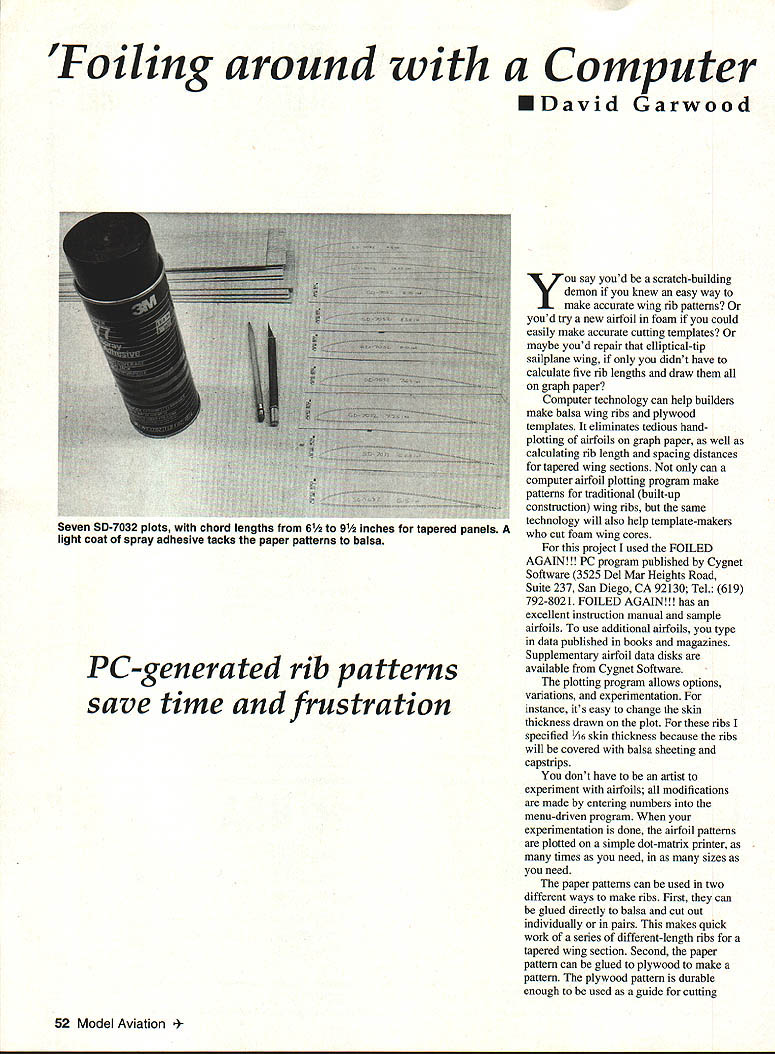 Foiling around Computer U David Garwood PC-generated rib patterns save time frustration say youd scratch-building demon knew easy way make accurate wing rib patterns youd try new airfoil foam could easily make accurate cutting templates maybe youd repair elliptical-tip sailplane wing didnt have calculate five rib lengths draw graph paper Computer technology can help builders make balsa wing ribs plywood templates eliminates tedious handplotting airfoils graph paper well calculating rib length spacing distances tapered wing sections can computer airfoil plotting program make patterns traditional built-up construction wing ribs same technology will also help template-makers cut foam wing cores project used FOILED AGAIN! PC program published Cygnet Software 3525 Del Mar Heights Road Suite 237 San Diego CA 92130 Tel 619 792-8021 FOILED AGAIN! has excellent instruction manual sample airfoils use additional airfoils type data published books magazines Supplementary airfoil data disks available Cygnet Software plotting program allows options variations experimentation instance its easy change skin thickness drawn plot ribs specified 1A6 skin thickness because ribs will covered balsa sheeting capstrips dont have artist experiment airfoils modifications made entering numbers menu-driven program experimentation done airfoil patterns plotted simple dot-matrix printer times need sizes need paper patterns can used two different ways make ribs First can glued directly balsa cut out individually pairs makes quick work series different-length ribs tapered wing section Second paper pattern can glued plywood make pattern plywood pattern durable enough used guide cutting 52 Model Aviation n SD-7032 plots chord lengths 61/2 9 inches tapered panels light coat spray adhesive tacks paper patterns balsa multiple ribs example 20 ribs needed wings center non tapered panel foam wing makers plywood template can used guide hot wire cutting foam wing cores After ribs templates cut wing construction proceeds usual Making own ribs eliminates fear breaking rib destroying rib removing die-cut sheet disaster causing great consternation angst maybe cussword Replacements broken ribs quickiy easily cut balsa stock duplicate paper pattern Its paper balsa instead hard-to-replace part Computer assisted airfoil plotting clearly step forward builders have artist experiment airfoils. January1994 53 Three center-panel rib stages Top plot wing sheeting thickness center plywood cutting pattern bottom balsa rib made using plywood guide Ribs cut hand using razor knife Two layers balsa cut same timeone side wing Pins hold work steady volume production same-size ribs paper pattern glued /8 plywood used cutting guide Pins keep stack alignment