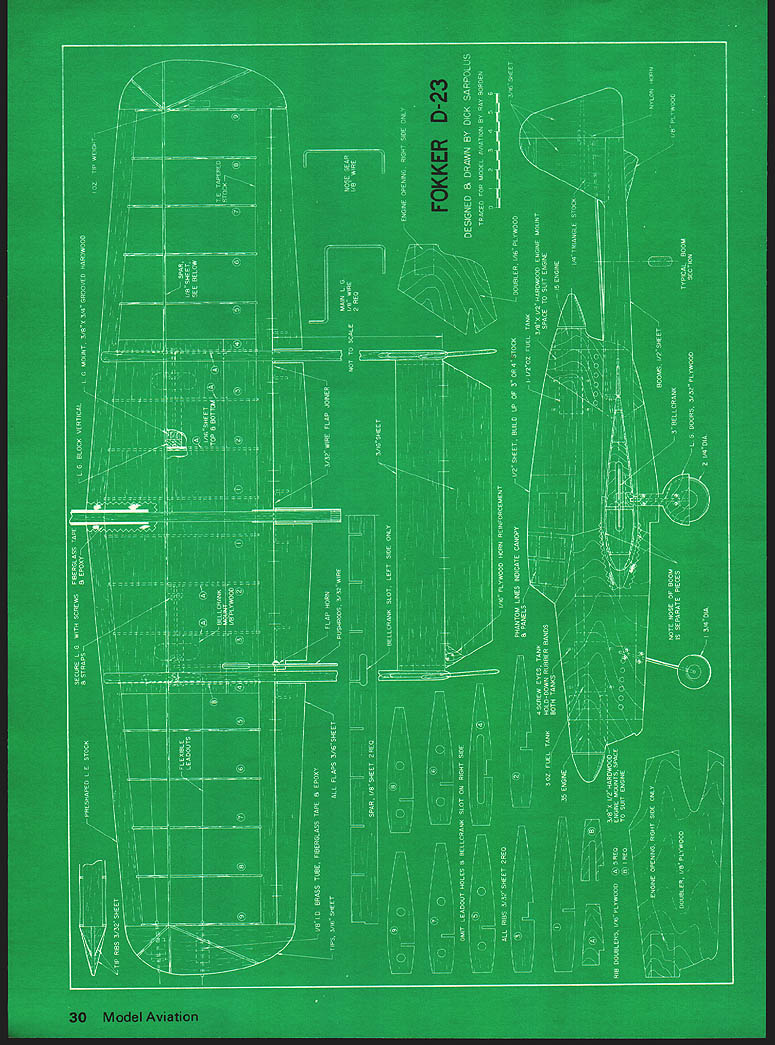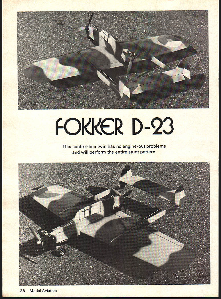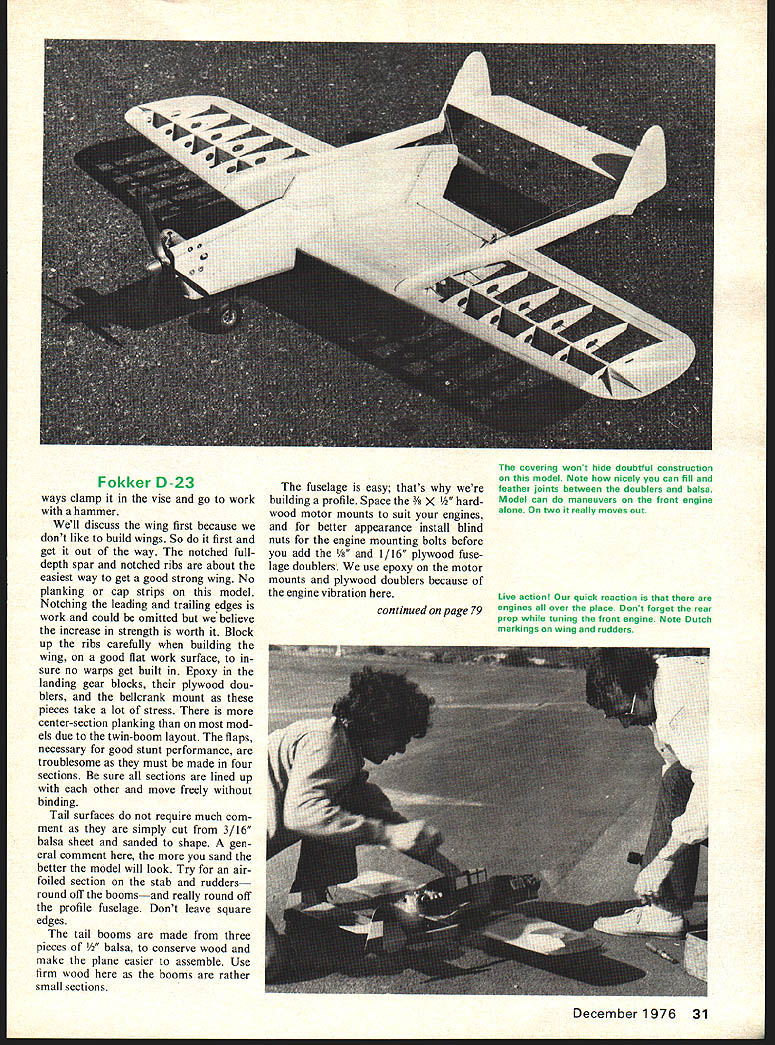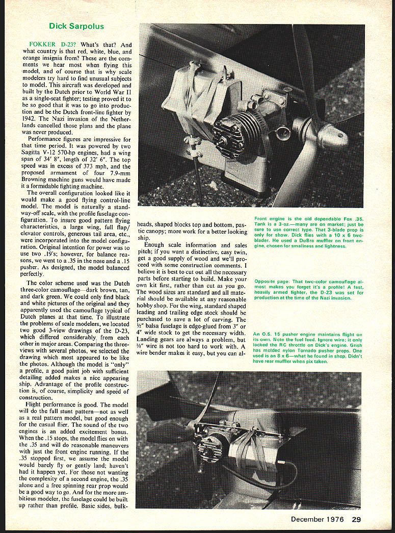 FOkkCk D-23 control-line twin has no engine-out problems will perform entire stunt pattern 28 Model Aviation Dick Sarpolus FOKKER D-23 Whats what country red white blue orange insignia com ments hear flying model course scale modelers try hard find unusual subjects model aircraft developed built Dutch prior World War II single-seat fighter testing proved good go produc tion Dutch front-line fighter 1942 Nazi invasion Nether lands cancelled plans plane never produced Performance figures impressive time period powered two Sagitta V-12 570-hp engines wing span 34 8 length 32 6 top speed excess 373 mph proposed armament four 79-mm Browning machine guns would have made formidable fighting machine overall configuration looked like would make good flying control-line model model naturally standway-off scale profile fuselage con figuration insure good pattern flying characteristics large wing full flap/ elevator controls generous tail area etc incorporated model configu ration Original intention power use two 19s however balance rea sons went 35 nose 15 pusher As designed model balanced perfectly color scheme used Dutch three-color camouflagedark brown tan dark green could find black white pictures original apparently used camouflage typical Dutch planes time illustrate problems scale modelers located two good 3-view drawings D-23 differed considerably other major areas Comparing threeviews several photos selected drawing appeared like photos Although model profile good paint job sufficient detailing added makes nice appearing ship Advantage profile construc tion course simplicity speed construction Flight performance good model will full stunt patternnot well real pattern model good enough casual flier sound two engines added excitement bonus 15 stops model flies 35 will reasonable maneuvers just front engine running 35 stopped first assume model would barely fly gently land havent happen yet wanting complexity second engine 35 alone free spinning rear prop would good way go am bitious modeler fuselage could built up rather profile Basic sides bulkheads shaped blocks top bottom pas tic canopy work better looking ship Enough scale information sales pitch want distinctive easy twin get good supply wood well pro ceed some construction comments believe best cut out necessary parts before starting build Make own kit first rather cut go wood sizes standard mate rial should available reasonable hobby shop wing standard shaped leading trailing edge stock should purchased save lot carving V2 balsa fuselage edge-glued 3 4 wide stock get necessary width Landing gears always problem Vt wire too hard work wire bender makes easy can al Front engine aid dependable Fox 35 Tank 3-ozmany market just sure use correct type 3-blade prop show Dick flies 10 x 6 two blader used DuBro muffler front en gine chosen smallness lightness Opposite page two-color camouflage al makes forget its profile fast heavily armed fighter D-23 set production time Nazi invasion An OS 15 pusher engine maintains flight its own Note fuel feed Ignore wire locked RC throttle Dicks engine Grish has molded nylon Tornado pusher props used 8 x 6what found shop Didnt have rear muffler pix taken December1976 29 NO OCR TEXT Fokker 0-23 ways clamp vise go work hammer Well discuss wing first because dont like build wings So first get out way notched fulldepth spar notched ribs about easiest way get good strong wing No planking cap strips model Notching leading trailing edges work could omitted believe increase strength worth Block up ribs carefully building wing good flat work surface sure no warps get built Epoxy landing gear blocks plywood dou blers bellcrank mount pieces take lot stress center-section planking mod els due twin-boom layout flaps necessary good stunt performance troublesome must made four sections sure sections lined up other move freely binding Tail surfaces require much com ment simply cut 3/16 balsa sheet sanded shape gen eral comment sand better model will look Try airfoiled section stab rudders round off boomsand really round off profile fuselage Dont leave square edges tail booms made three pieces a conserve wood make plane easier assemble Use firm wood booms rather small sections fuselage easy thats building profile Space /8 X wood motor mounts suit engines better appearance install blind nuts engine mounting bolts before add 1/16 plywood fuse lage doublers use epoxy motor mounts plywood doublers because engine vibration December 1976 31 covering wont hide doubtful Construction model Note nicely can fill feather joints between doublers balsa Model can maneuvers front engine alone two really moves out Live action quick reaction continued page 79 engines over place Dont forget rear prop tuning front engine Note Dutch markings wing rudders CL Combat/Johnson continued page 23 idea Slow Combat slow event down speed-wise make slow event dull Current planes inboard tanks super-short nose mo ments full-race engines far outclass Sunday fliers plane Some other proposals eliminate rules either unnecessary enforce able may build same old thing regardless rules remember opponent may take advantage ev ery loophole give treatment AT OUR ANNUAL contest tried new method airplane/line processing new us anyway set up pit area big enough planes first round plane next opposing flying order according draw tightly stretched string marked point center models two strings marked plus-or-minus 6-in area Length thickness pull tests easily accomplished passing out streamers tremendously speeds up show also makes safe place park model lines out helping friends though contest ants knew thorough processing fac ing two tried get away long lines two undersize 015s Fast Combat joker tried tell us HP 40 really 36 because put short rod Event Director asked him what size thought hed have put rod out Chevy pickup Processing can real pain efficient organization can accom plish its goals keeping everyone safe honest no-kill rule tried Slow Com bat result being better