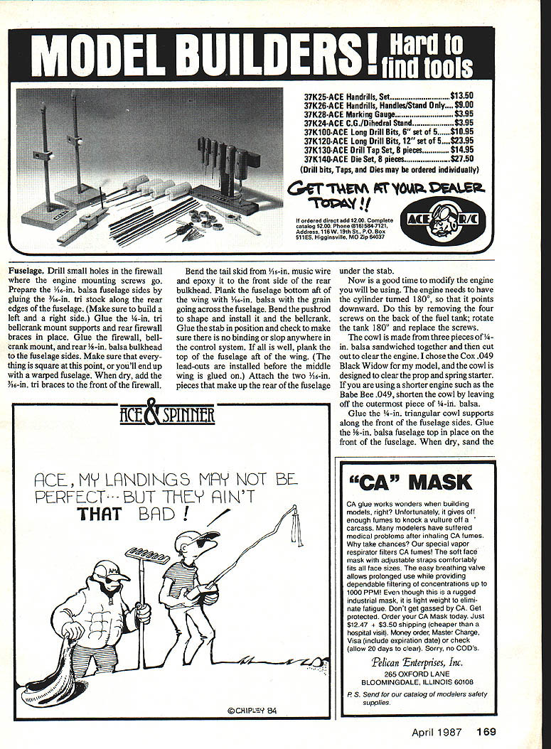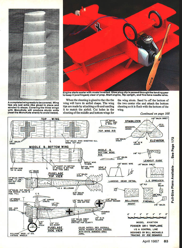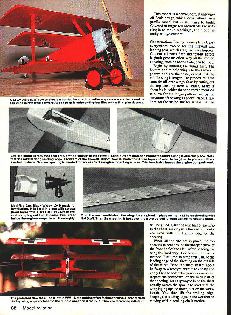 OF ALL THE fighter planes World War German Fokker DR-i probably best known people virtually no knowledge aviation history recognize Red Barons airplane success Baron von Richtofen other aces en joyed flying DR-i certainly con tributed planes fame course its distinctive appearance no doubt helped secure its place aviation history well Actually DR-i saw front-line service fairly short period time rapid advances aircraft design power plants during WW planes became ob solete faster todays computer systems DR-i entered service end August 1917 retired combat nine months later May 1918 think DR-i first successful triplane miscon ception idea triplane came Anthony Fokker 1917 after observed maneuverability high rate climb British Sopwith Triplane Fokker returned factory chief engineer Reinhold Platz design triplane fighter Included Platzs design armament two machine guns marked improvement over Sopwiths armament gun DR-is strengths its excellent maneuverability high rate climb powerful armament dogfight out classed Allied planes except Sopwith Camel Its weaknesses included low maximum speed poor performance high altitudes fault low-power Oberusel rotary engine suitable power plant available Fokker time April 1987 81 its size simplicity semiscale 1/2A Control Line model has lots eye appeal Its certainly different other models will find flying circle model compact 12 wingspan nearlyall-sheet construction Shorttaii moment offset fairiy small elevators model fairly easy fly lead-out guide made 1/16 ply lead-outs run under middle wing keep construction simple Machine gun made scrap balsa Cockpit opening black oval Trim MonoKote Easy-to-make markings vintage wheels wood prop add character model semi-Sport stand-wayoff Scale design looks better profile model still easy build Covered bright red MonoKote simple-to-make markings model really eye-catcher Construction Use cyranoacrylate CyA everywhere except firewall landing gear glued epoxy Cut out parts first test-fit before beginning construction Any plastic iron-on covering such MonoKote can used Begin building wings first bottom middle wing use same rib pattern same except middle wing longer procedure same three wings Start cutting out top sheeting 2 balsa Make about /16 wider cord dimension allow longer path caused curvature wings upper surface Draw lines inside sufface ribs Left Belicrank mounted anal/i 6 ply flooriust aft firewall Lead-outs attached before middle wing glued place Note middle wing leading edge forward firewall Right Cowl made three layers -In balsa glued place sanded shape Square opening needed access engine mounting screws Tn-stock balsa braces engine compartment will glued Glue rear half rib sheet making sure end ribs trailing edge sheeting ribs place top sheeting bent around sharper curve front half ribs After building wing hard way discovered easier method First moisten first 1 leading edge sheeting outside curve Bend sheet about halfway want end up apply CyA hold what youve done far Repeat procedure back half sheeting An easy way bend sheet equally across span start wing laying upside down flat work bench lift trailing edge keeping leading edge workbench moving rocking-chair motion 82 Model Aviation Cox 049 Black WIdow engine mounted Inverted better appearance because top wing rather far forward Wood prop display flies 5-In plastic prop Modified Cox Black Widow 049 ready installation held place screws treat holes drop Hot Stuff pre vent stripping out threads Fuel-proof Inside engine compartment thoroughly First rear two-thIrds wing ribs glued place 1/32 balsa sheeting Hot Stuff sheeting bent overthe more-curved forward part ribs glued B prsterrea view TOFaas top wing appear closer TO tne miaaie man reaiiy ney aimosm equloistant sheeting glued ribs the wing struts Sand Y32 off bottom wing will have its airfoil shape wing two center ribs attach bottom tips made attaching rib sanding sheeting flush bottom match airfoil Cut holes wing sheeting middle bottom wings for Continued page 168 TOP WING 1 IIZIY-H 4 BALSA SHEET -9 MIDDLE 8 i BOTTOM WING 1/8 BALSA SHEET RIBS B WING TIP TOP WING RIB 1/32 BALSA WING SHEETING -ALL WINGS TOP ONLY STABILIZER SHEET JOINER Ii rnvThu41_ MIDDLE WING TO HERE /1/32 SHEET ON BOTTOMBOTTOM WING BOTTOM WINGIOF MIDDLE B BOTTOMTO HERE TIP 1 HERE/4 BALSAWING-THIS AREA TRI-STOCKFUSELAGEI/B BALSA 1/4 BALSA SHEETSHEET COWL-SLAMCUTOUT FORI BELLCRANK /8 BALSA CUT HOLES FOR NEEDLE VALVE 163/16 BALSA FUEL FILLTRI STOCK G 1/B SPRUCE T CABANES SHETQ COX 049 ENGINE 1/16 BALSA SHEET TOP AND BOTTOM MIDDLE B BOTTOM WING RIB SHEET 1/16 MUSIC WIRE WRAP B SOLDE LANDING GEAR DETAIL PLY 1/16 BALSA SHEET RUDDER BELLCRANK /4 TRIMOUNT STOCKII EXITo I2 -1/16 MW 1/16 BALSA SHEETTAILSKID 3/16SIDES LEFT SIDE TRII 16 PLYOMITTED FOR CLARITY K B/C MOUNT FUSELAGECOLOR NOTES RED OVERALL SIDE VIEW WILLIAMS BROS 5 DIACOWL VINTAGE WHEELS WITH WHITE BORDERS-GREY 1/16 PLY LEADOUT GUIDE 1/8 BALSA SHEET II I, LQ SPREADER I/a PLY I/B BALSA SKID FIREWALL 1/16 BALSA 3456 I I J MODEL AVIATION FOKKER DR-I TRIPLANE 1/2 CONTROL LINE DESIGNED BY BILL MICHAELS TRACING BY 30E DEMARCO April 1987 83 Acompieted wing readyto covered Wing tips just extra ribs glued place sanded shape Covering three wings MonoKote will produce sturdy units heat MonoKote evenly avoid warps starts easiermoai iveni w piugIs passea tnrougn landing gear Keep fingers clear ot prop Stan engine flip upright finetune needle valve cd 1 S 01 U 0 S 0 S 0 S U 6 C U S N 0 IA pp p p1h g p BENTOM BROWN JH- CAMPHLLL COMET COVERITE COX DUBRO EASY BUILT MODELS ENYA FAF FLYLINE FOX GOLDBERG GOLDEN AGE REPRO GENE DUBOIS GUILLOW- K&B K&S L R MRC OS MAX PACTRA- PECK-POLYMER PERFECT R N MODELS SEAGLEN SIG STERLING SULLIVAN SUPER TIGRE TAFFINDER TELCO TOP FLITE- TREXLER WILLIAMS & OTHERS ESTES MODEL ROCKETS Send 1100 Csh Check Stanspa oar 44 page tabloid nice DISCOUNT Catalog 900 illustrations over 700 Kits choose MAILORDER PHONEORDER IN STORE PENN VALLEY HOllY CENTER 87 WMain St Lansdalsla19446 Problems