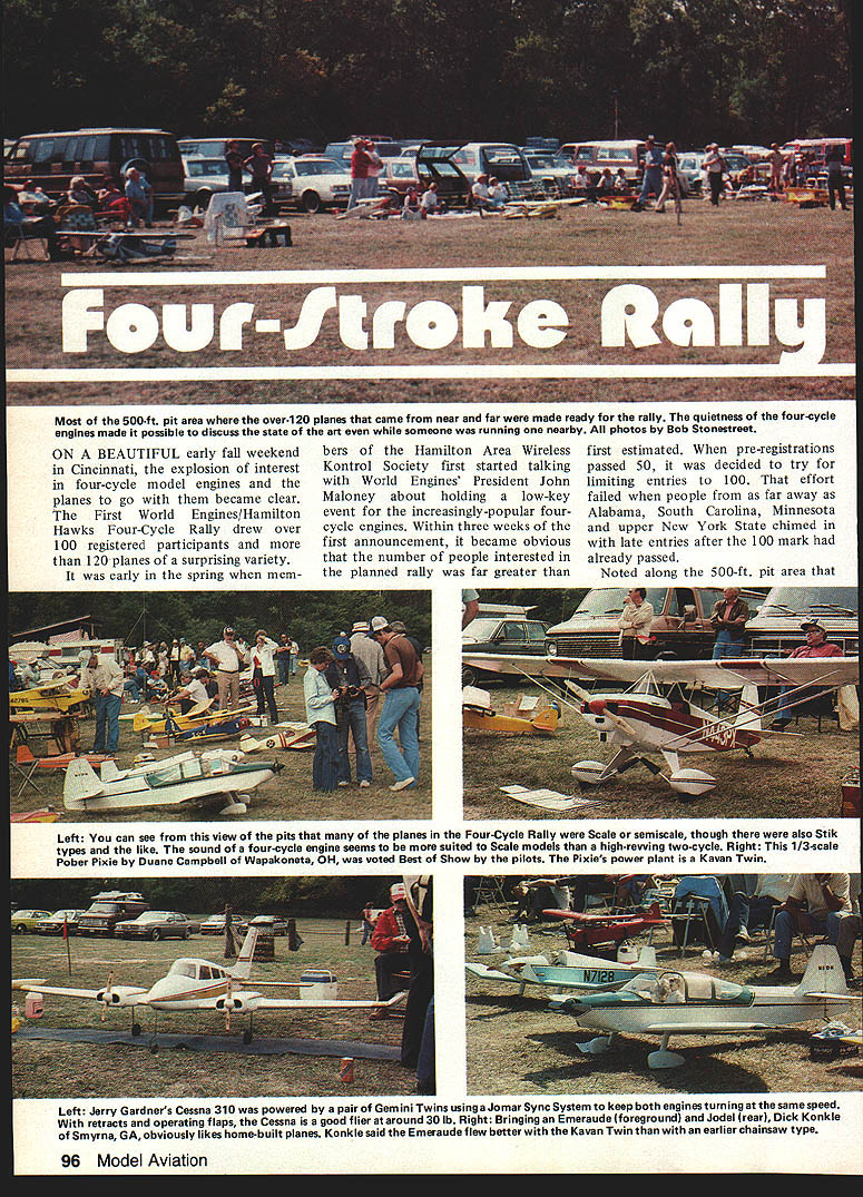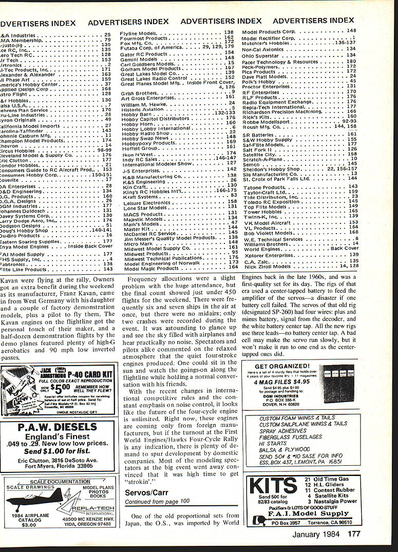 Most 500-ft pit area over-i 20 planes came near far made ready rally quietness four-cycle engines made possible discuss state art someone running nearby photos Bob Stonestreet ON BEAUTIFUL early fall weekend Cincinnati explosion interest four-cycle model engines planes go became clear First World Engines/Hamilton Hawks Four-Cycle Rally drew over 100 registered participants 120 planes surprising variety early spring mem 96 Model Aviation hers Hamilton Area Wireless Kontrol Society first started talking World Engines President John Maloney about holding low-key event increasingly-popular fourcycle engines Within three weeks first announcement became obvious number people interested planned rally far greater first estimated pre-registrations passed 50 decided try limiting entries 100 effort failed people far away Alabama South Carollna Minnesota upper New York State chimed late entries after 100 mark already passed Noted along 500-ft pit area U Left can see view pits planes Four-Cycle Rally Scale semiscale though also Stik types like sound four-cycle engine seems suited Scale models high-revving two-cycle Right 1/3-scale Pober Pixie Duane Campbell Wapakoneta OH voted Best Show pilots Pixies power plant Kavan Twin Left Jerry Gardners Cessna 310 powered pair Gemini Twins using Jomar Sync System keep both engines turning same speed retracts operating flaps Cessna good flier around 30 lb Right Bringing Emeraude foreground Jodel rear Dick Konkle Smyrna GA obviously likes home-built planes Konkle said Emeraude flew better Kavan Twin earlier chainsaw type sprang up Saturday morning expected biplanes high-wing ships good number Stik-type sport planes also evidence unex pected included several World War Il-era Scale planes like Bob Karissons magnif icent Wildcat Navy carrier fighter pow ered OS 1 2 four-cycle doubt about ability relatively low-revving four-cycle engines pull WW II plane along author ity realistic speed Wildcat laid rest Another high-tech hit rally brought Jerry Gardner Ft Smith AR Nosen Cessna 310 twin powered pair OS Gemini twincylinder engines Synchronized Jomar Electronic Sync System four-cycles hauled over-3 0-lb ship around no trouble alland very realistic sound pilots choice Best Show won Duane Campbells beautiful Pober Pixie onethird scale powered Kavan Twin US Scale Team Manager Cliff Continued page 176 Left Ron Taylor Carroll OH flew beautiful Stampe Bipe markings British Rothman Aerobatic Team Right Bob Karlasons beautiful Grumman Wildcat has OS 12 four-cycle up front Four-Cycle Rally sponsored Hamilton Hawks World Engines Left The slow stately RC-assisted Old-Timers seem made new crop four-cycle engines quiet sound engines good match relaxed nature kind flying Right Kavan factory representative West Germany gives Duane Campbell hand adjusting mixture Pober pixies engine Kavan guys also flew pair Scale ships shipped especially rally January 1984 97 beginner p. written illus trated RiCer over 50 years model air plane experience Teaches basic model aerodynam ics commonsense manner. covers radio equipment learning fly much Easy understand must RiC modelers library $1195 Please add $100 ordered direct Available hobby shops order direct ACE R/C BOX 511 HIGGINSVILLE MO 64037 GREAT PLANES MODEL DISTRIBUTOR BOX 725 URBANA ILLINOIS 61801 ZENITH AVIATION BOOKS BOX 1 OSCEOLA WISCONSIN 54020 CLELAND GIANTS GIANT SCALE BUFFS Worlds Largest Gas Plans Assortment INTERNATIONALLY FAMOUS C-D QUALITY MODELS PLANS 77 Locoobe Sedon $25 D7Fir$3973NAMiokBo,b $4 6 Pole Race $32 65 TMMoroode 8-26 $42 & So Gee-Bee $32 78 Sopoolh Pop $24 .oine 568 $34 81 DO 88oqolo tb $38 t9Soperoorioe S6t $32 108 DO Moeqo8oob S4t 62 Co- Hocok P-6E $36 61 Corli, tobjo 005 $16 94 Co9ck P-6E F, $54 98 Sico PTi7Koyde SAt 62 Lockheed Vgo $24 99 Ntik Wdooc P61 $65 Posl LNt-4 $28 71 DoogDC-3 Iron $29 le GB 11 $39 95 DoogDC-3 Tron $45 oope Spori $36 86 Hocok Teooco 13 $32 9 Bolldog $39 108 Co8201/4 L&S $56 61 non C-s Spi $35 78 Aroc SpiPcr A2 $3o glo 8-38 Ob $24 60 Dooglo 143 Moil $24 122 Dooglo 038 Oh $49 6$ 8iiol tolidog Fir $30 v ~094 Poge cr1 tocer $45 39 trocontoceMLA $54 Moln 810 took $29 107 Gro, teorci P87 $24 7tTo,ey WW Roc 835 73 Tocoel Aj 6800 $24 64 Ccr Gokk P112 $38 1071401 Mt-i $oc $46 okk P112 $54 91 Locdke0g NX2i 1 $39 Coc,el R0 824 61 AEG GIV Li 80, $24 MolIlgoc 935 108 PoichPTi9 7$59 94 too Mc Molligon $45 90 Woco TopeWj,g $39 63 Boeng P26A Pr $36 75 WHoIid Lyo,6e $33 84 toeng P-26A Fl $48 100 WeolId Lyonde $69 69 Woco 6 Cobi, $36 57Ford T,oci 4-AT $38 64 Beech 178 Slog 939 76 Food Tjcc0 4AT $45 68eenh 179 Slog$49114 Ford Ti,i 4AT$59 55 Lock ii Eleolco$2484 BerlJoce 9FJ3$56 ,..83 Lock 1 Eleocco$3393 Loenirog C2A,pk$99 o, T/W 087$1658 GoccJ3-P Dock$39 tlSlooo, TW 587$2478 Go,J2-F Dccl$56 122 Sl,,o, TW 087$32SOGoIho GiV to,$22 598 P2-B$20117 Golho G1V to,$39 788 o F, P2893268 Doog 0-46A Oh$32 WO 188 l P28545108 Sikor S38 Aopk$49 747 L Pesco Spec9456OBoe 100 SpocI$36 63 Sky ockel 07571$2090 Boe 100 Spool$49 560 Wookk P40$2490 Sli,Alooo Wi,0$56 - -78 Lock Ligkl,g P38$3880 Moli 7474141839 56 Rep SeoBee A,82475 H-Pg 0400 9o,b$25 j74 Rp Scot Acoplo$39100 HP9 0400 to,$49 Pp J3 ok 939 65 Mkioo lippe $50 99 Lo k Hodoo 8,k$3897 Mhio Ippe$69 63 G o, FOP Heilcol$2871 Loooo 2 Ajl,$24 *77 toe og8-l7OFol$2966 B0133 BO Jog,829 S4ool Socill XP934828 03900 8I7GFo,96968 tooW,kle 8,d845 08 RyoT Nooo$3963 L,dbeg ISicios824 68 BBocooo V Toil83955 ecolocHiod Fl8c,$32 NO KITSAVAILABLEIPicesokjeclochoge Cihe Scoles o,d Sizes frono 6 Spoo ooplele Wilk PoOe,, Fo, 25c ~--- Add 10 ioolloodeosfoo okippog Si,. coo. _____ USA Coo & Meo Elicookere odd 15% 120 ojl Pclooool cololog $150 Pice IjOl ocollo oboe 55c *byoi,Roeigeodd$1801* .rCLEVELAND MODEL&SUPPLY Co 103073 Daira6 A,Clenelond Ohio 44182 176Model Aviation everyones surprise Monday check-in day greeted misty rain Tuesday official practice day began heavy rain wind gradually eased off ended sunshine pleasant temperatures However evening early Wednesday morning first day com petition