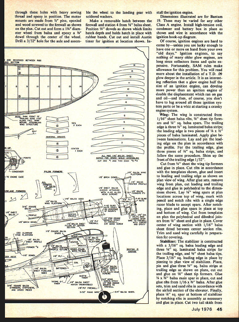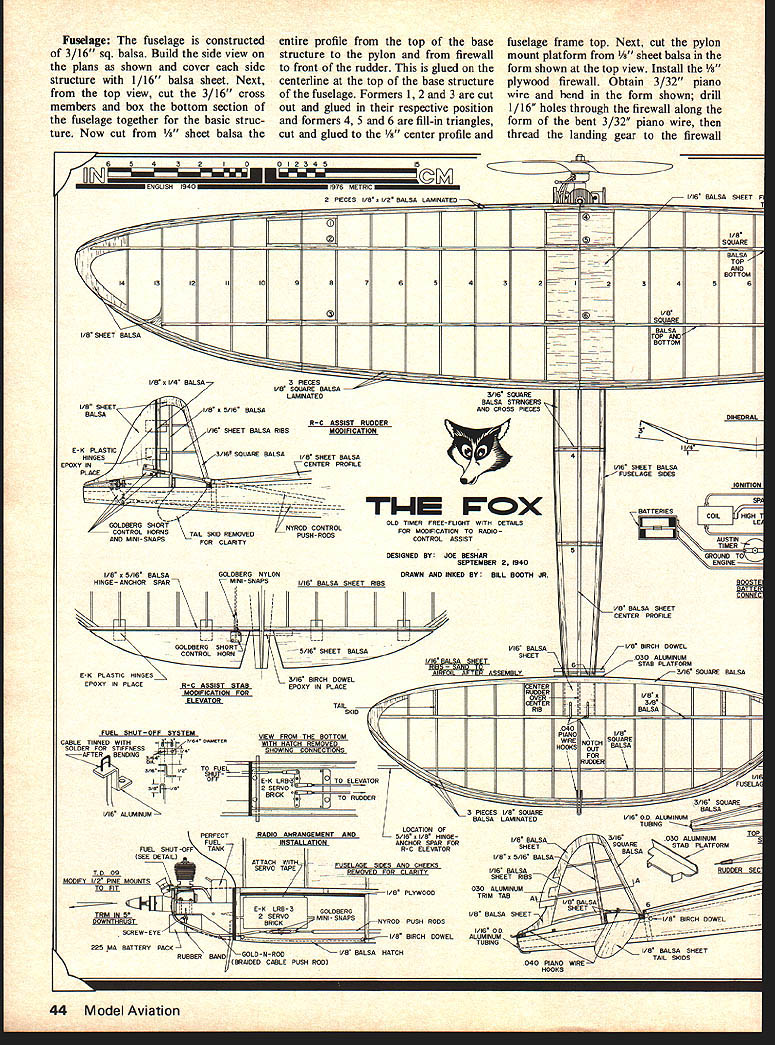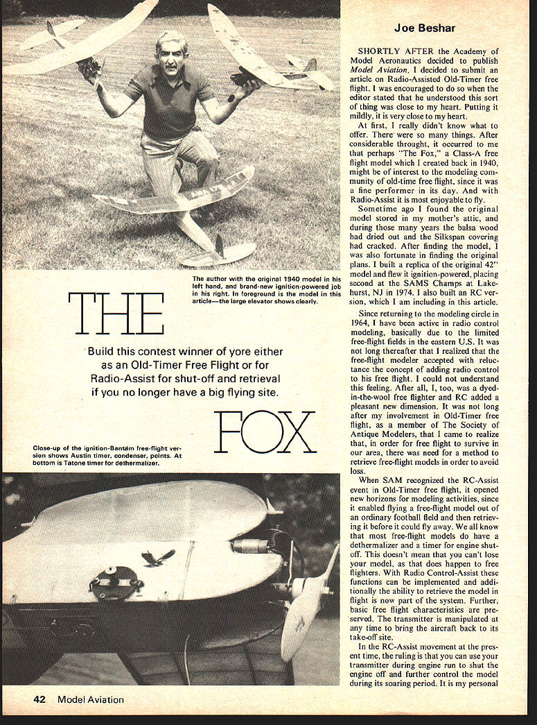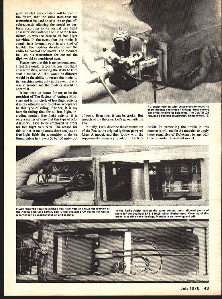 Joe Beshar author original 1940 model left hand brand-new ignition-powered job right foreground model articlethe large elevator shows clearly Build contest winner yore either Old-Timer Free Flight Radio-Assist shut-off retrieval no longer have big flying site Close-up ignition-Bantdm free-flight ver sion shows Austin timer condenser points bottom Tatone timer dethermalizer FOX SHORTLY AFTER Academy Model Aeronautics decided publish Model Aviation decided submit article Radio-Assisted Old-Timer free flight encouraged editor stated understood sort thing close heart Putting mildly very close heart first really didnt know what offer things After considerable throught occurred perhaps Fox Class-A free flight model created back 1940 might interest modeling com munity old-time free flight since fine performer its day Radio-Assist enjoyable fly Sometime ago found original model stored mothers attic during years balsa wood dried out Silkspan covering cracked After finding model also fortunate finding original plans built replica original 42 model flew ignition-powered placing second SAMS Champs Lake hurst NJ 1974 also built RC ver sion am including article Since returning modeling circle 1964 have active radio control modeling basically due limited free-flight fields eastern US long thereafter realized free-flight modeler accepted reluc tance concept adding radio control free flight could understand feeling After too dyedin-the-wool free fighter RC added pleasant new dimension long after involvement Old-Timer free flight member Society Antique Modelers came realize order free flight survive area need method retrieve free-flight models order avoid loss SAM recognized RC-Assist event Old-Timer free flight opened new horizons modeling activities since enabled flying free-flight model out ordinary football field retriev ing before could fly away know free-flight models have dethermalizer timer engine shut off doesnt mean cant lose model does happen free fighters Radio Control-Assist functions can implemented addi tionally ability retrieve model flight now part system Further basic free flight characteristics pre served transmitter manipulated time bring aircraft back its take-off site RC-Assist movement pres ent time ruling can use transmitter during engine run shut engine off further control model during its soaring period personal TI-TI goal am confident will happen future rules state transmitter used shut engine off subsequently allowing model per form according its normal free flight characteristics use trans mitter case free flight activities event model caught thermal kind trouble modeler decides use radio control model moment uses transmitter control flight would considered over Please note personal goal feel would restore true free flight characteristics requiring skills trim such model would different would ability return model its launching point event trouble modeler saw fit control has honor president Society Antique Mod elers circle free flight activity ultimate aim obtain acceptance type ruling Further humble feeling free flight cluding modern free flight activity matter time type RC Assist will have employed order free flight survive reason areas just no free-flight fields modeler thing unless travels 50 100 miles out town can tricky enough theories Lets go Fox Initially will describe construction Fox original ignition-powered Class model follow supplements necessary adapt RC Assist presenting article manner will enable modeler apply principles RC-Assist oldtime modern free-flight model July1976 43 RC assist version cowl block removed show mounts shut-off linkage Note battery box under engine balancing Cox TD 09 required 5 degrees downthrust Bantam 19 Hatch removed ignition free-flight version shows location Austin timer battery box Under present SAM ruling AssistIn Radio-Assist version same compartment allowed plenty X-mitter can used shut-off soaringroom Logictrol LRB-3 brick Beshar used Covering model silk fuselaae Monokote wino tail Fuselage The fuselage constructed 3/16 sq balsa Build side view plans shown cover side structure 1/16 balsa sheet Next top view cut 3/16 cross members box bottom section fuselage together basic struc ture Now cut sheet balsa entire profile top base structure pylon firewall front rudder glued centerline top base structure fuselage Formers 1 2 3 cut out glued respective position formers 4 5 6 fill-in triangles cut glued center profile fuselage frame top Next cut pylon mount platform 1/s sheet balsa form shown top view Install plywood firewall Obtain 3/32 piano wire bend form shown drill 1/16 holes through firewall along form bent 3/32 piano wire thread landing gear firewall 654320 ENGLISH 1940 2 PECES I/B 1/2 BALSA LAMINATED 7 I/B H 1/4 BALSA I3/16 SQUARE BALSAI/B SHEET BALSA CENTER PROFLE - rzsgZ-ZWt GOLDBERG SHORTSYNOD CONTROL CONTROL HORNSTAIL SKID REMOVEDPUSH-RODS AND MINI-SNAPSFOR CLARITY S 3 PIECES - I/B SQUARE BALSA LAMINATED 4 3 ECES 1/8 SQUARE BALSA LAMINATED S 3/16 SQUARE BALSA STRINGERS AND CROSS PIECES R-C ASSIST RUDDER MODIFICATION THE FOX OLD TIMER FREE-FLIGIT WITH DETAILS FOR MODIFICATION TO RADIO CONTROL ASSIST DESIGNED BY JOE BESHAR SEPTEMBER 2 1940 DRAWN AND INKED BY BILL BOOTH JR I/B x 5/16 BALSAGOLDBERG NYLON HINGE-ANCHOR SPARMINI-SNAPS1/16 BALSA SHEET RIBS - U4V -- GOLDBERG SH~ CONTROL HORN E-K PLASTIC HINGES EPOXY IN PLACE R-C ASSIST STAB MODIFICATION FOR 1 1/16 BALSA SHEET --5/16 SHEET BALSA 3/16 BIRCH DOWEL EPOXY IN PLACE TAIL SKIDVUIUJt FUEL SHUT-OFF SYSTEMVIEW FROM THE BOTTOM CABLE TINNED WITH f- ITH HATCH REMOVEDII SOLDER FOR STIFFNESSrSEf-SHOWING ECTIONSNIII ElIII AFTER BENDING , -- 3A6 TO FUEL nTE-K LRB-3TO ELEVATOR INAs2 SERVO TO RUDDER I/I6 LOCATION OF 5/16 I/B HINGEANCHOR SPAR FOR R-C ELEVATOR PERFECTRADIO ARRANGEMENT AND FUEL INSTALLATION FUEL SHUT-OFFTANK SEE DETAIL /II ATTACH WITH SERVO TAPE _____ITOOG___________ MOOFY 2 PINE MOUNTS TOFIT-______ - I/B 1:E-K LRB-3GOLDBERG 1BJK3 2 SERVOMINI- SNAPS QQW&kIaJSIBRICK SCREW EYE