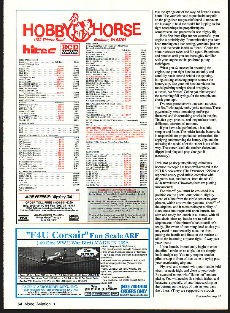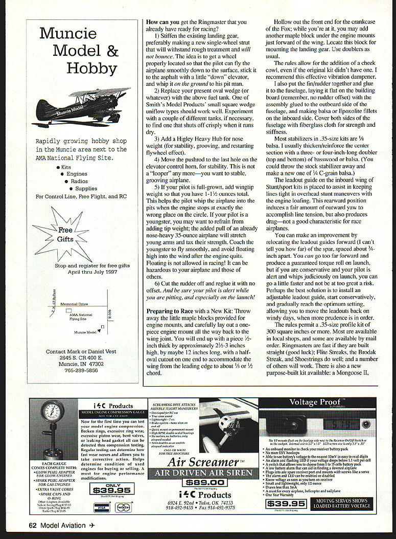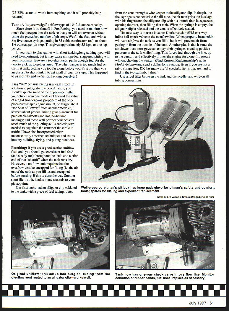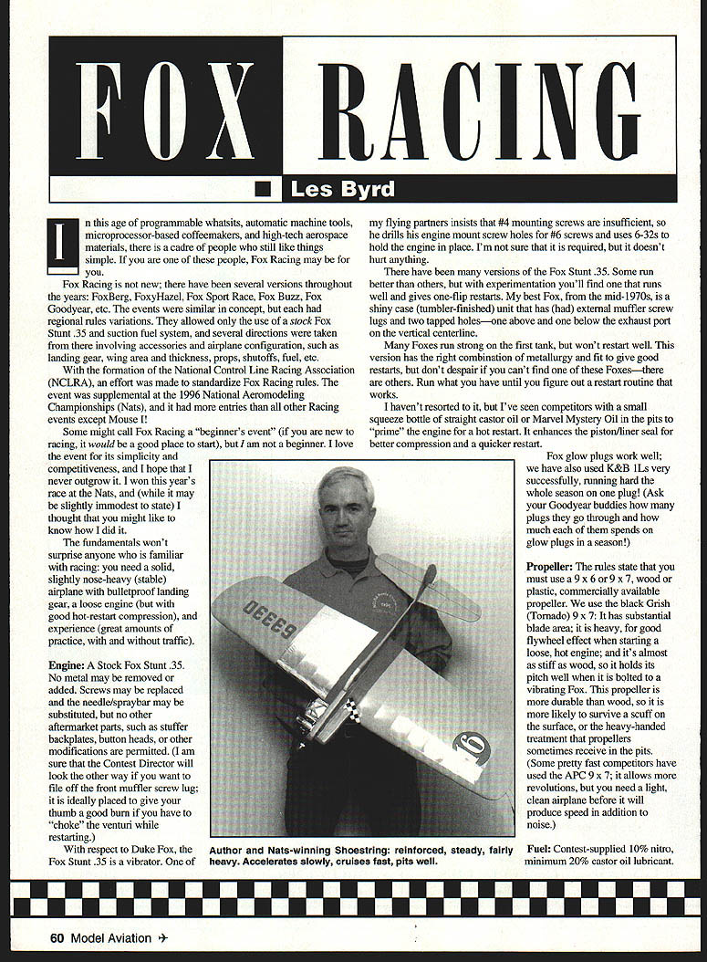 n age programmable whatsits automatic machine tools microprocessor-based coffeemakers high-tech aerospace materials cadre people still like things simple people Fox Racing may Fox Racing new have several versions throughout years FoxBerg FoxyHazel Fox Sport Race Fox Buzz Fox Goodyear etc events similar concept regional rules variations allowed use stock Fox Stunt 35 suction fuel system several directions taken involving accessories alrplane configuration such landing gear wing area thickness props shutoffs fuel etc formation National Control Line Racing Association NCLRA effort made standardize Fox Racing rules event supplemental 1996 National Aeromodelmg Championships Nats entries other Racing events except Mouse Some might call Fox Racing beginners event new racing would good place start am beginner love event its simplicity competitiveness hope never outgrow won years race Nats may slightly immodest state thought might like know howl did fundamentals wont surprise anyone familiar racing need solid slightly nose-heavy stable airplane bulletproof landing gear loose engine good hot-restart compression experience great amounts practice traffic Engine Stock Fox Stunt 35 No metal may removed added Screws may replaced needle/spraybar may substituted no other aftermarket parts such stuffer backplates button heads other modifications pennitted am sure Contest Director will look other way want file off front muffler screw lug ideally placed give thumb good bum have choke venturi restarting respect Duke Fox Fox Stunt 35 vibrator flying partners insists #4 mounting screws insufficient drills engine mount screw holes #6 screws uses 6-32s hold engine place Im sure required doesnt hurt anything have versions Fox Stunt 35 Some run better others experimentation youll find runs well gives one-ffip restarts best Fox mid-1970s shiny case tumbler-finished unit has external muffler screw lugs two tapped holesone above below exhaust port vertical centerline Foxes run strong first tank wont restart well version has right combination metallurgy fit give good restarts dont despair cant find Foxesthere others Run what have until figure out restart routine works havent resorted Ive seen competitors small squeeze bottle straight castor oil Marvel Mystery Oil pits prime engine hot restart enhances piston/liner seal better compression quicker restart Fox glow plugs work well have also used K&B iLs very successfully running hard whole season plug Ask Goodyear buddies plugs go through much spends glow plugs season Propeller rules state must use 9 x 6 9 x 7 wood plastic commercially available propeller use black Utish Tornado 9 x 7 has substantial blade area heavy good flywheel effect starting loose hot engine its almost stiff wood holds its pitch well bolted vibrating Fox propeller durable wood likely survive scuff surface heavy-handed treatment propellers sometimes receive pits Some pretty fast competitors have used APC 9 x 7 allows revolutions need light clean airplane before will produce speed addition noise 60 Model Aviation NG U Author Nats-winning Shoestring reinforced steady fairly Fuel Contest-supplied 10% nitro heavy Accelerates slowly cruises fast pits well minimum 20% castor oil lubricant 22-25% castor oil wont hurt anything will probably help restarts Tank square wedge uniflow type 1 -2A-ounce capacity Since no shutoff Fox Racing need monitor much fuel put tank will ovemin using prescribed number pit stops fill fuel tank Sig five-ounce syringe putting 35 cubic centimeters cc about 11/4 ounces per pit stop gives approximately 35 laps lap per cc want play games short tanking/long tanking will need experiment may cause unimpeded staggered pitting racemates Beware too-short tank put enough fuel tank pick up get restarted other danger too much fuel first tank getting too far along before first pit forced short-tank get pit stops happened us recently still kicking ourselves say because racing team effort addition pilot/pit-crew coordination should tap some experience within club modeler learned value rigid front enda proponent onepiece hard-maple engine mount taught about Seat Power another modeler leamed about proper landing gear placement predictable takeoffs hot no-bounce landings prior experience can teach much piloting skills etiquette needed negotiate center circle traffic have also incorporated other unconsciously absorbed techniques truths building flying pitting practices Plumbing use good suction uniflow fuel tank should get consistent fuel feed steady run throughout tank crisp end-of-run shutoff tank runs dry However uniflow tank requires overflow vent uncapped filling let air out tank fill recapped before starting done way Stunt sport fliers it adds seconds pit stop time first tanks alligator clip soldered tank piece fuel tubing routed vent through wire keeper alligator clip pit fuel syringe connected fill tube pit man grips fuselage fingers alligator clip thumb squeezes opening vent filling tank syringe empty alligator clip released vent effectively sealed new way use Kustom Kraftsmanship #515 one-way inline ball-check valve overflow line properly installed will vent airfrom tank fill it will prevent air getting outside tank Another plus vents air slower guys can empty syringes creating positive pressure tank filling forces fuel through line up venturi effectively primes engine one-flip restart choking venturi Find Kustom Kraftsmanships ad Model Aviation send dollar catalog rabid competitor KK has useful specialty items hard find typical hobby shop Use fuel filter between tank needle wire-on tubing connections Photos Eric Williams Graphic Design Carla Kunz July1997 61 Well-prepared pitmans pit box has knee pad glove pitmans safety comfort tools spares fueling expedient replacement Original uniflow tank setup surgical tubing Tank now has one-way check valve overflow line Monitor overflow vent routed alligator clipworks well condition rubber bands fuel lines replace necessary Muncie Model & Hobby Rap