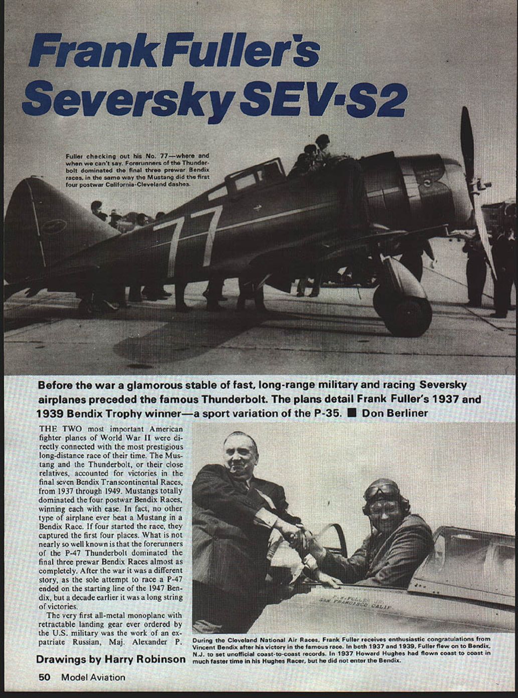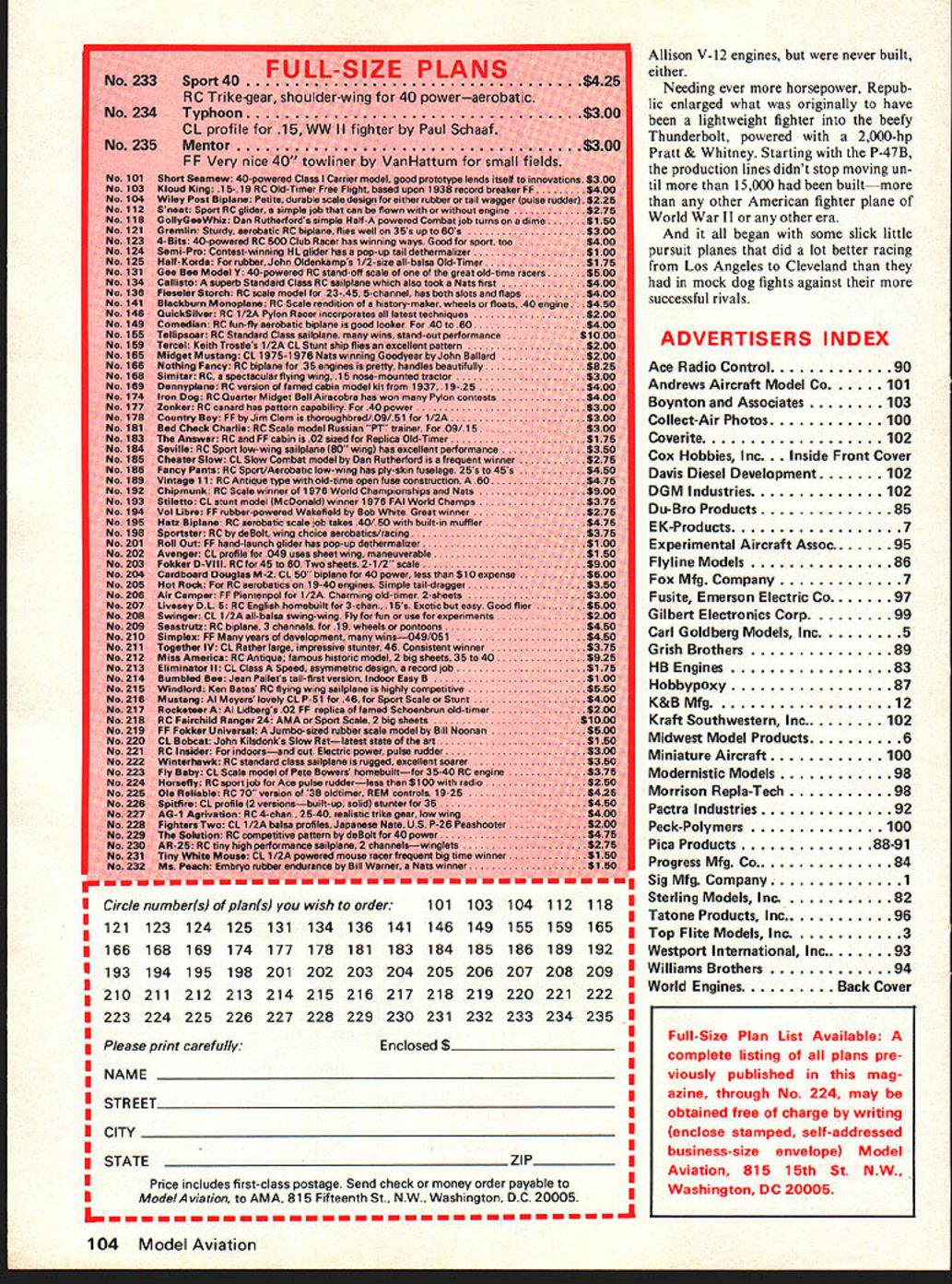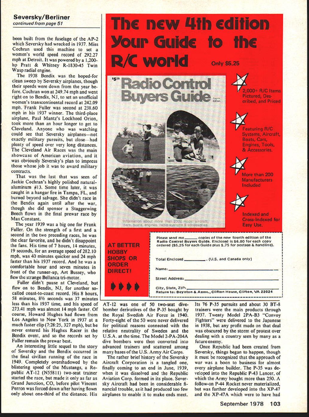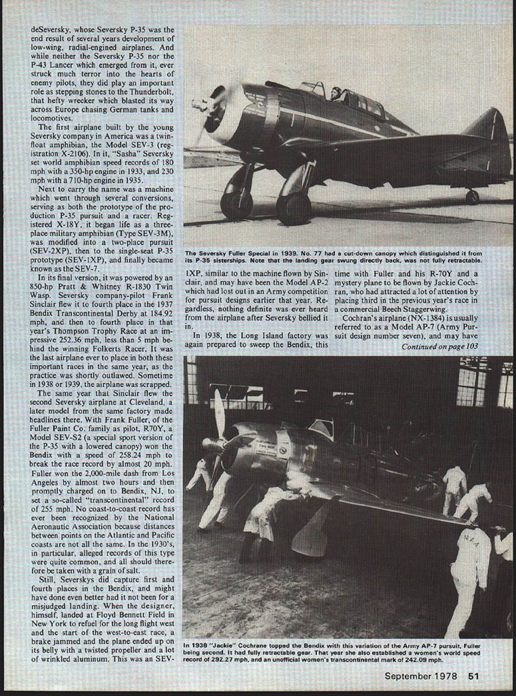 1st long-ran derbolt variation o During CIe Vincent Bendix NJ set unof n much faster tim aces fnm yes enthusiast i37 1939 F ard Hughes uci Bendix 50 Model Aviation Se ers 1 Lu-metal n kV 1 igcd th play bk g Germn ceti tnc n Arm Ilte vi vcep Seversky/Berli ner continued page 51 built fuselage AP-2 Seversky wrecked 1937 Miss Cochran used machine set womens world speed record 29227 mph Detroit powered 1200hp Pratt & Whitney R-1830-45 Twin Wasp radial engine 1938 Bendix hoped-for clean sweep Seversky airplanes though speeds down year fore Cochran won 24974 mph went right Bendix NJ set unofficial womens transcontinental record 24209 mph Frank Fuller second 23860 mph 1937 winner third-place airplane Paul Mantzs Lockheed Orion took hour longer get Cleveland Anyone watching could see Seversky airplanesnot exactly military pursuits closehad plenty speed over very long distances Cleveland Air Races main showcase American aviation obviously Severskys plan impress job award military contracts last seen Jackie Cochrans highly polished naturalaluminum #13 Some time later caught hangar fire Tampa FL burned beyond salvage didnt race Bendix again until after war though did sponsor Staggerwing Beech flown final prewar race Max Constant year 1939 big Frank Fuller strength first second two preceding races clear favorite didnt disappoint fans time 7 hours 14 minutes 19 seconds average speed 28210 mph 40 minutes quicker 24 mph faster 1937 record comfortable hour seven minutes front runner-up Art Bussey flew strange Bellanca tn-motor Fuller didnt pause Cleveland flew Bendix NJ another socalled coast-to-coast record 8 hours 58 minutes 8 seconds 37 minutes less 1937 time speed 27341 mph almost 14 mph faster course Howard Hughes flown LosAngeles New York 1937 much faster clip 72825 327 mph never entered Hughes Racer Bendix event records set Fuller remain prewar best An interesting little sequel story Seversky Bendix occurred final civilian running race 1949 Completely overshadowed blistering speed Mustangs Re public AT-12 N5581 1 two-seat trainer started race made far Grand Junction CO before pilot Vincent Perron forced down after having flown about one-third distance AT-12 50 two-seat divebomber derivatives P-35 bought Royal Swedish Air Force 1940 Forty-eight 50 never delivered political reasons connected relative neutrality Sweden USA time Model 2-PA-204A dive bombers converted advanced trainers scattered among bases US Army Air Corps rather brief history Seversky Aircraft Corporation tangled finally coming end June 1939 dissolved Republic Aviation Corp formed its place Seversky Aircraft considerable fi nancial trouble produced too few airplanes enable make ends meet Its 76 P-35 pursuits about 30 BT-8 trainers main products through 1937 Twenty Model 2PA-B3 Convoy Fighters delivered Japanese 1938 profit made deal obscured storm protest over dealing country seen future enemy Once Republic created Seversky things began happen though must recognized approach war boon business almost airplane builder P-35 de veloped Republic P-43 Lancer Army bought 250 follow-on P-44 Rocket never materialized further developed XP-47 XP-47A have September1978 103 Please send me......... copies new fourth edition Radio Control Buyers Guide Enclosed $600 copy ordered $525 Guide plus $75 postage & handling Total Enclosed __________ anada City State ZIP Return Boynton & Assoc Clifton House Clifton VA 22024 Circle numbers plans wish order118 I 121123124125131134 136141146149155 159165 166168169174177178 181183184185186 189192 I 193194195198201202203204205206207208209 210211212213214215216217218219220221222 I223224225226227228229230231232233234235 II Please print carefullyEnclosed $I NAME STREETH II CITYI II ESTATEZIP_____ IPrice includes first-class postage Send check money order payable Mode/Aviation AMA 815 Fifteenth St. NW. Washington DC 20005I Allison V-12 engines never built either Needing ever horsepower Repub lic enlarged what originally have lightweight fighter beefy Thunderbolt powered 2000-hp Pratt & Whitney Starting P-47B production lines didnt stop moving un til 15000 builtmore other American fighter plane World War II other era began some slick little pursuit planes did lot better racing Los Angeles Cleveland mock dog fights against successful rivals ADVERTISERS INDEX Ace Radio Control90 Andrews Aircraft Model Co101 Boynton Associates103 Collect-Air Photos100 Coverite102 Cox Hobbies Inc. de Front Cover Davis Diesel Development102 DGM Industries102 Du-Bro Products85 EK-Products7 Experimental Aircraft Assoc95 Flyline Models86 Fox Mfg Company7 Fusite Emerson Electric Co97 Gilbert Electronics Corp99 Carl Goldberg Models Inc5 Grish Brothers89 HB Engines83 Hobbypoxy87 K&BMfg12 Kraft Southwestern Inc102 Midwest Model Products6 Miniature Aircraft100 Modernistic Models98 Morrison Repla-Tech98 Pactra Industries92 Peck-Polymers100 Pica Products88-9 1 Progress Mfg Co84 Sig Mfg Company1 Sterling Models Inc82 Tatone Products Inc96 Top Flite Models Inc3 Westport International Inc93 Williams Brothers94 World EnginesBack Cover 104 Model Aviation Full-Size Plan List Available complete listing plans pre viously published mag azine through No 224 may obtained free charge writing enclose stamped self-addressed business-size envelope Model Aviation 815 15th St NW Washington DC 20005