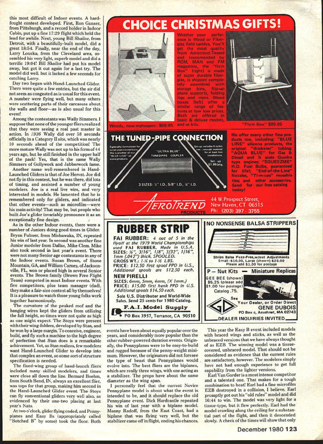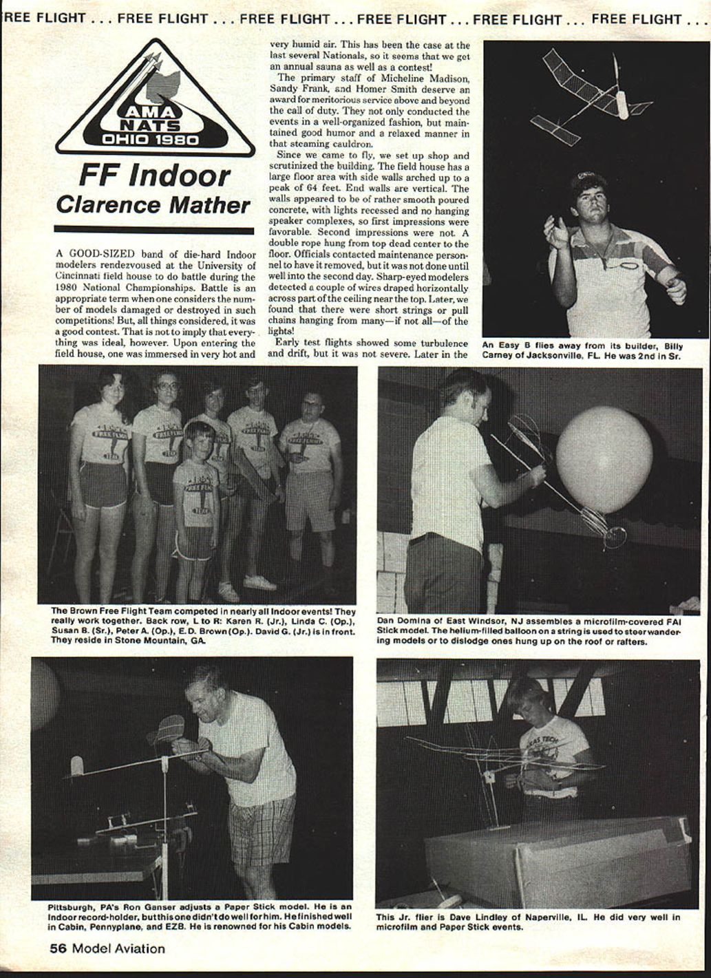 E FLIGHT . FREE FLIGHT. FREE FLIGHT. FREE FLIGHT. FREE FLIGHT. FREE FLIGHT . FR1 day air became stable Dan Domina always good competitor put up first officials well over 23 minutes So work cut out us Dan soon second flight up scratching ceiling model hung securely string wire warningvery few microfilm flights could cruise top bumping ceiling getting caught longest flights did get way peak trick get prop-rubber combination gave long cruise Most modelers flew FAI models Stick events current FAI designs wide chords wing stab long sticks big props potent flying machines though limited 254 span minimum weight gram takes very good AMA Stick beat AMA Sticks restricted maximum 300 sq wings Dan Belieff Washing ton DC excellent model Dick Kowalskis 50-minute record holder big model great potentiaL Dan took some flights too little power model climbed halfway up switched larger motor soon model up roof began drifting towards wires steering attempt Dan folded wing Such incidents Indoor contest Dick Hardcastle St Louis FM models very large 9-in chords means aspect-ratio about three-to-one long ago modelers thought such low ratios inefficient Dicks models flew very well outstanding crop Juniors Continued page 122 Bob Boyer uses building-stretcher technique attempt get grestest possible flight time microfilm-covered Easy B Open-class flier San Diego CA Launching low just off floor makes maximum use buildings height December 1980 57 wiiiiam L maKer Norman ur iauncnes iennypiane tie flew upen category inc indoor otticials conducted event very competent manner Cool heads sweltering-hot site Thanks L R Sandy Frank Micheline Madison Homer Smith Mike sm won latin Jr Pennyplane Right Flier model Does Dallas TX home flying site get hot Nats Indoor events director Sandy Frank verifies wingspan model within limits Mike puts model through suspended-thread gauge onn oHeilly eases Pennyplane intoflight John placed4th Jr resides Wichita KS REE FLIGHT. FREE FLIGHT. FREE FLIGHT. FREE FLIGHT. FREE FLIGHT . FREE FLIGHT . FF Indoor Clarence Mather GOOD-SIZED band die-hard Indoor modelers rendezvoused University Cincinnati field house battle during 1980 National Championships Battle appropriate term considers num ber models damaged destroyed such competitions things considered good contest imply everything ideal however Upon entering field house immersed very hot very humid air has case last several Nationals seems get annual sauna well contest primary staff Micheline Madison Sandy Frank Homer Smith deserve award meritorious service above beyond call duty conducted events well-organized fashion main tained good humor relaxed manner steaming cauldron Since came fly set up shop scrutinized building field house has large floor area side walls arched up peak 64 feet End walls vertical walls appeared rather smooth poured concrete lights recessed no hanging speaker complexes first impressions favorable Second impressions double rope hung top dead center floor Officials contacted maintenance person nel have removed done until well second day Sharp-eyed modelers detected couple wires draped horizontally across part ceiling near top Later found short strings pull chains hanging manyif allof lights Early test flights showed some turbulence drift severe Later 56 Mode Aviation Rfl asy away Trom Its builder Ulily Carney Jacksonville FL 2nd Sr Irownam competed nearly . loor really work together Back row L R Karen R Jr Linda C Op Susan B Sr PeterA Op E D Brown Op David G Jr front reside Stone Mountain GA uan Uomina ot ast Windsor assembles micr n-covered Stick model helium-filled balloon string used steerwander ing models dislodge ones hung up roof rafters riusourgn rM5 non unur ujurn s door record-holder butthisonedidntdo w r ,m finished well Cabin Pennyplane EZB renownuu tor Cabin models Jr flier Dave Lindley Naperville IL did very well microfilm Paper Stick events CESS Perhaps need something bit out-of-the ordinary scale competition Cessna 182 isa big stable airplane ideal scale trainer 40 engine Put 60 under cowl fly circles around competition semi-symmetrical airfoil makes 182 groove yet its docile kitten total scale realism add optional flaps Trike gear pleasant ground handling kit all-balsa lots hardware molded parts speedy construction clear plans special illustrated construction booklet make kit anyone can build Kit features Span 72 Area 702 Sq 5-7 lbs flying weight 4 channel Power 40 60 MASTER AIRSCREW ANNOUNCING NEW 1l2A SERIES Accurately Pitched Balanced High Performance Alsbl Thoogh Ledng NTION ERS Worlds hijam due humidity heat whatever planes up usual form Walt Eggert flying very nice DH 60 Warren Weisenbach lovely Ramsey Bathtub no power problems fact might have gotten away bit less Its nice have bit engine normally fly just case Dave Rees Bellanca Skyrocket Flyline kit neatly built featured curtains windows Dave used old OK CO-2 powerplant conjunction large Peck tank Skyrocket some very nice flights between 20 30 seconds As power judged realism flight 20-sec mmmum plenty Lee-Richards annular monoplane writer brought electric-powered plane despite rough takeoff contuirUne GWftOiTIeS FUOOBOOM AMA mO6OmOOm FAK MOMOOOM FAin. S4P PEW $2800 2800 2400 250 ILL [I7FEL P0 X 997740SAN DIEGOsCAUF 9210 TELEPhONE 7144834984 surface managed get few good HOGs four wheels ground plane tracks straight-arrow long run gentle lift- off Astro 02 motor four -length Nicad pencells Mainly because its configuration good flight characteristics model awarded NASA FF Outdoor Scale Achievement award model weight about 13 oz 265 square inches Some really outstanding striking models years outdoor event include Dave Rees rubber Caudron Simoun Jack McGillivarys red-and-white Missel Thrush jumbo Bob Clemens lovely Farman Jabiru CO-2 Peanut-class Pacific Standard C-i racer Rolfe Gregorys Lindberg-kit Stinson Reliant rubber ship Joseph Scuros nifty red Stinson Voyager rubber ship John Blairs Stinson SM-2 Curt Sanfords J-3 Cub 182 Nats FF md Scale/Warner Con