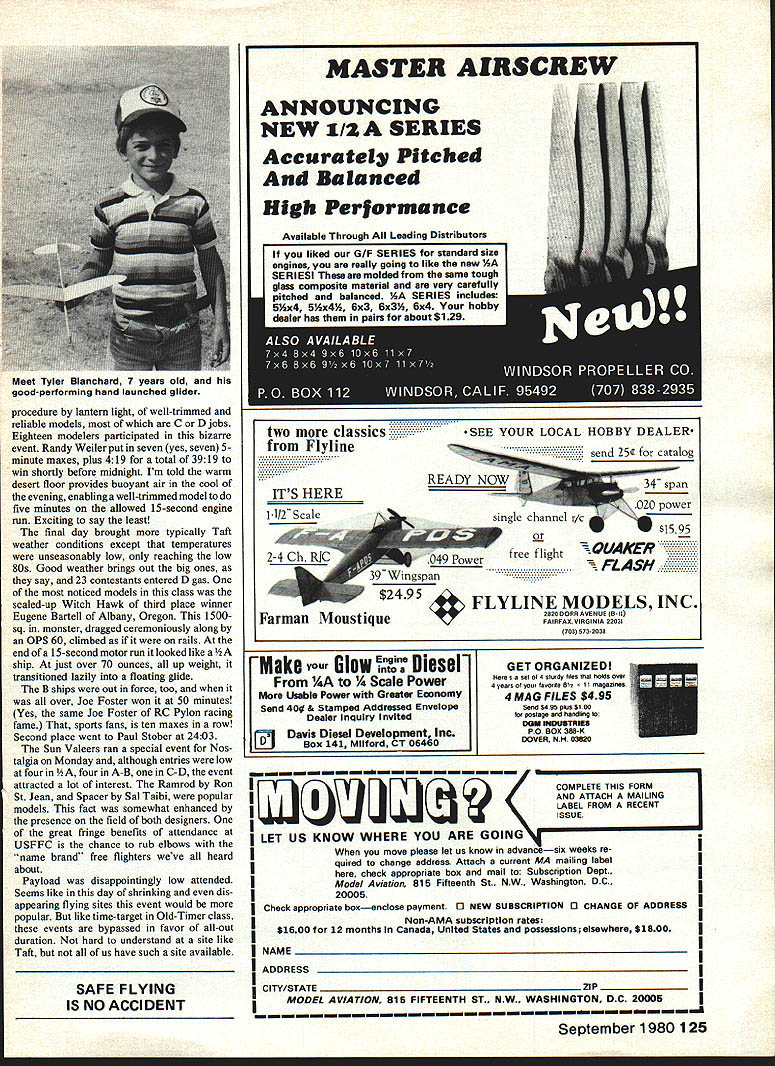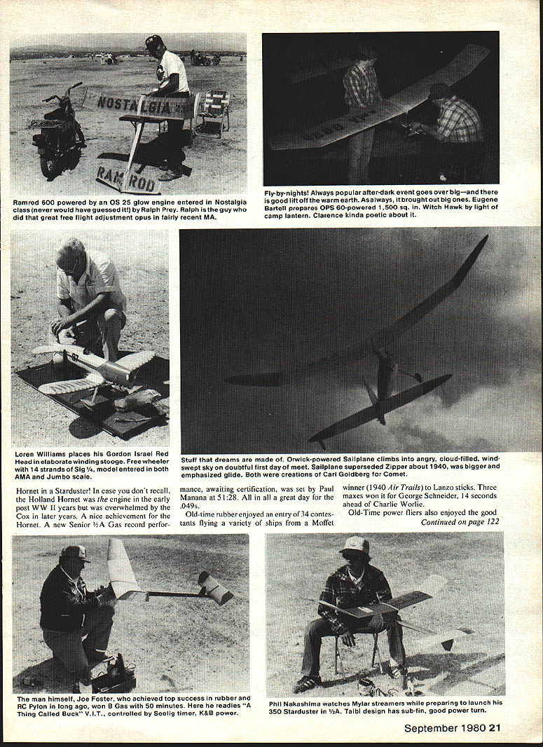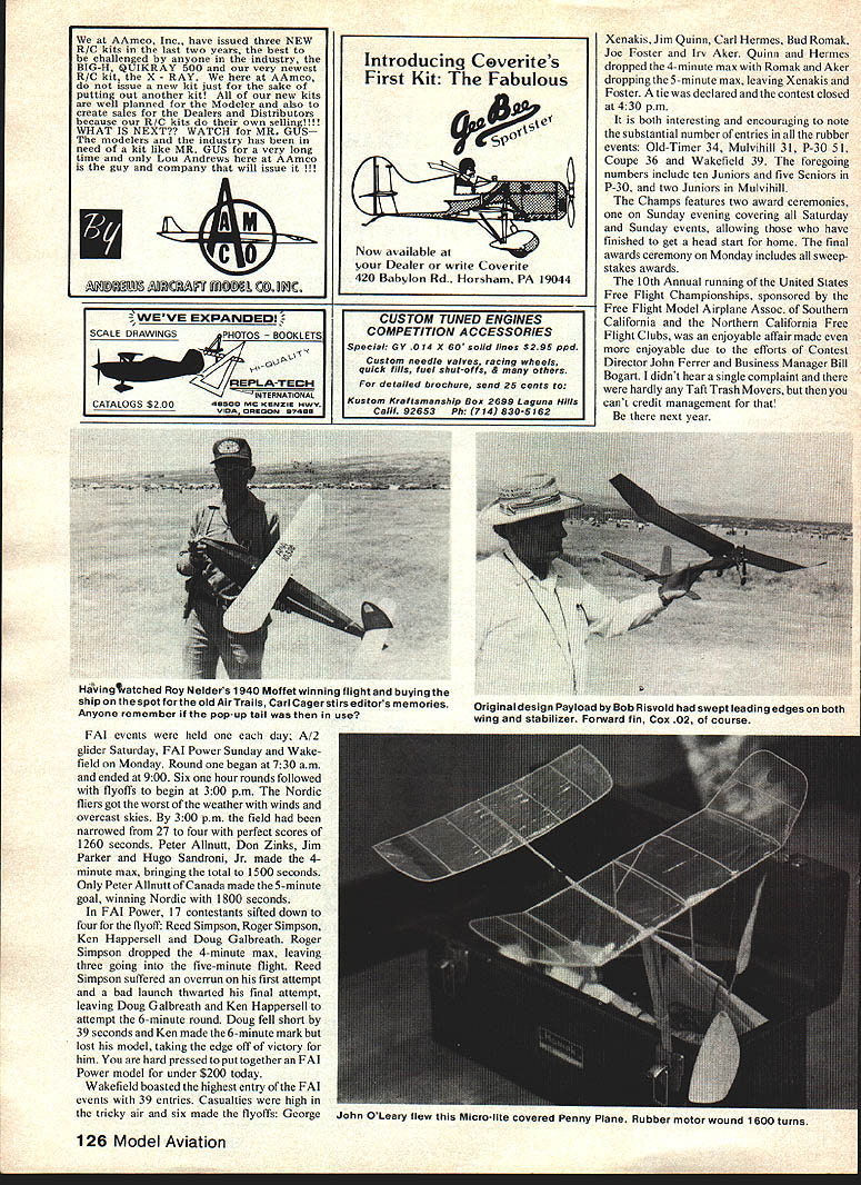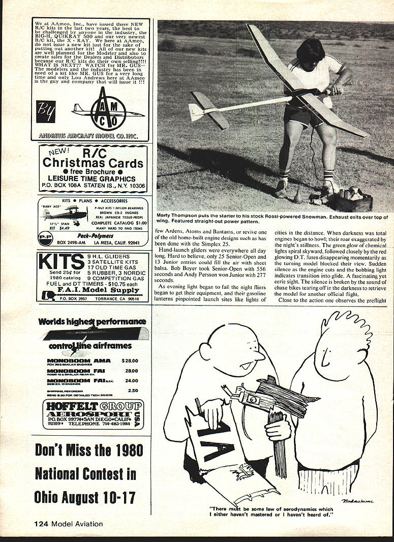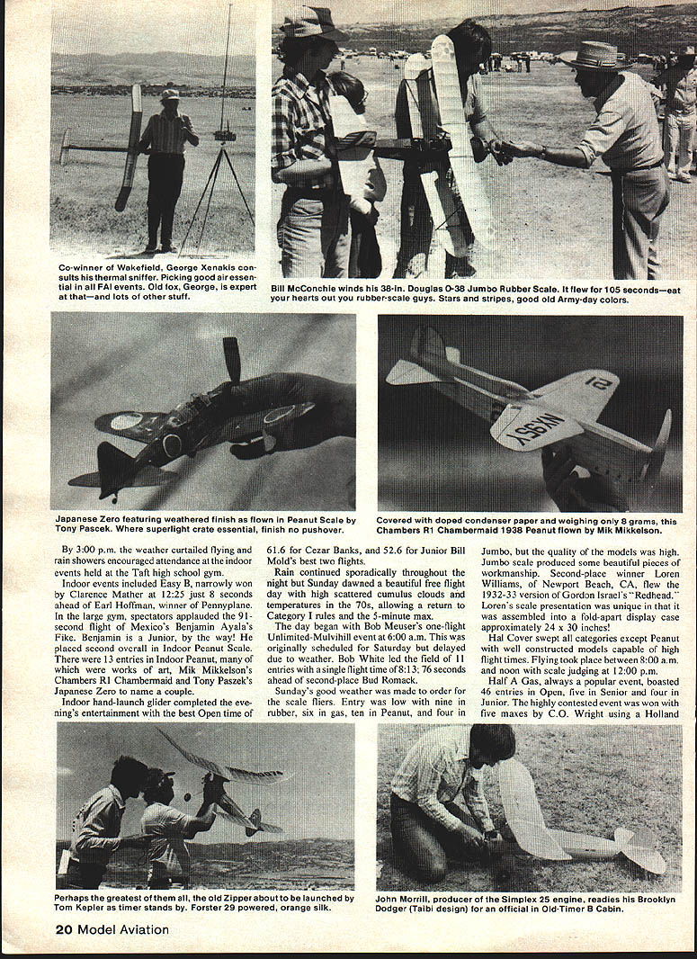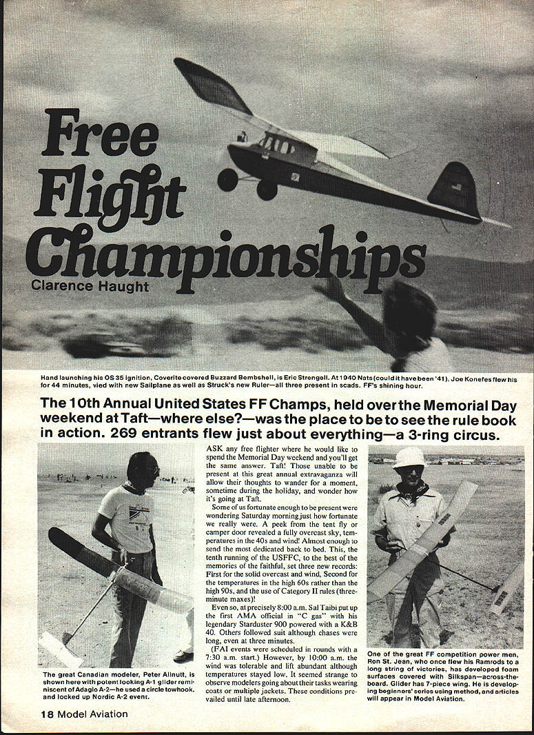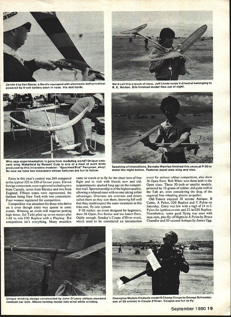Hand launching 0535 ignition Coverite covered Buzzard Bombshell Eric Strengell 1940 Nats coumo nave oeen qij Joe Ionefes flew 44 minutes vied new Sailplane well Strucks new Rulerall three present scads FFs shining hour 10th Annual United States FF Champs held overthe Memorial Day weekend Taftwhere elsewas place beto seethe rule book action 269 entrants flew just about everythinga 3-ring circus ASK free fighter would like spend Memorial Day weekend youll get same answer Taft unable present great annual extravaganza will allow thoughts wander moment sometime during holiday wonder its going Taft Some us fortunate enough present wondering Saturday morning just fortunate really peek tent fly camper door revealed fully overcast sky tem peratures 40s wind Almost enough send dedicated back bed tenth running USFFC best memories faithful set three new records First solid overcast wind Second temperatures high 60s rather high 90s use Category II rules three minute maxes precisely 800 am Sal Taibi put up first AMA official legendary Starduster 900 powered K&B 40 Others followed suit although chases long three minutes FAI events scheduled rounds 730 am start However 1000 am wind tolerable lift abundant although temperatures stayed low seemed strange observe modelers going about tasks wearing coats multiple jackets conditions pre vailed until late afternoon 18 Model Aviation great Canadian moueier Peter Allnutt shown herewith potent looking A-i glider remi niscent Adagio A-2he used circle towhook locked up Nordic A-2 event great etition power men Ron St Jean once flew Ramrods long string victories has developed foam surfaces covered Silkspanacross-the board Glider has 7-piece wing develop ing beginners series using method articles will appear Model Aviation Entry years contest 269 compared typical 325 350 former years Eleven foreign contestants registered including two Canada seven Mexico two England Fifteen states represented farthest being New York two contestants Four women registered competition Competition abundant thrive though entry sparse some events Winning event still required posting high times Sal Taibi piled up seven maxes plus 148 win 020 Replica Playboy competition isnt everything modelers came watch fly sheer love free flight visit friends new old acquaintances sparked long ago competi tion trail Sportsmanship highest quality allowing relaxed meet no taking unfair advantages Overruns overruns timers called saw knowing full well could expect same treatment time-one fly-one system P-30 rubber event designed beginners drew 36 Open five Senior ten Junior fliers Oddly enough Sundays Coupe dHiver event used considered introduction event serious rubber competition also drew 36 Open fliers Bob White won both Open class 30-inch smaller models powered 10 grams rubber did quite well Taft air considering drag required free-wheeling plastic propeller Old-Timers enjoyed 30 second Antique B Cabin Pylon 020 Replica C Pylon Saturday Entry low high 14 C Pylon ignition events 22 020 Replica Nonetheless some good flying seen max-outs plus fly-otT flights Pylon Bruce Chandler 30-second Antique James Ogg September 1980 19 Zenith 5 Ken auer idoraic equipped electronic dethermalizer powered 9-volt battery seen nose dad holds Wed call touch class Jeff Livoto holds V-dihedral belonging R E Norton Silk-finished model flew out sight wno says experimentation gone modeling world Unique cres cent wing Wakefield Russell CuIp fleet such birds produced innovative modeler Speckled Bird Perryman ahoy So now have two innovators fortunes fun follow Speaking innovations Barnaby Wainfan finished unusual P-30 motel night before Features equal area wing stab Unique winding stooge constructed John OLeary utilizes standard rowboat oar lock Allows turning model wind winding Champion Models Products moaei U Lnamp Coupe George Schroeder 36 entries Coupe dHiver Coupes fun fly Co-winner WaKefield George Xenakis con suits histhermal sniffer Picking good airessen tial FAI events Old fox George expert Bill McConchle winds 38-In Douglas 0-38 Jumbo Rubber Scale flew 105 secondseat thatand lots other stuff your hearts out rubber-scale guys Stars stripes good old Army-day colors 300 pm weather curtailed flying rain showers encouraged attendance indoor events held Taft high school gym Indoor events included Easy B narrowly won Clarence Mather 1225 just 8 seconds ahead Earl Hoffman winner Pennyplane large gym spectators applauded 91second flight Mexicos Benjamin Ayalas Fike Benjamin Junior way placed second overall Indoor Peanut Scale 13 entries Indoor Peanut works art Mik Mikkelsons Chambers Ri Chambermaid Tony Paszeks Japanese Zero name couple Indoor hand-launch glider completed eve nings entertainment best Open time 616 Cezar Banks 526 Junior Bill Molds best two flights Rain continued sporadically throughout night Sunday dawned beautiful free flight day high scattered cumulus clouds temperatures 70s allowing return Category rules 5-minute max day began Bob Meusers one-flight Unlimited-Mulvihill event 600 am originally scheduled Saturday delayed due weather Bob White led field 11 entries single flight time 813 76 seconds ahead second-place Bud Romack Sundays good weather made order scale fliers Entry low nine rubber six gas ten Peanut four Perhaps greatest old Zipper about launched Tom Kepler timer stands Forster 29 powered orange silk Jumbo quality models high Jumbo scale produced some beautiful pieces workmanship Second-place winner Loren Williams Newport Beach CA flew 1932-33 version Gordon IsraeVs Redhead Lorens scale presentation unique assembled fold-apart display case approximately 24 x 30 inches Hal Cover swept categories except Peanut well constructed models capable high flight times Flying took place between 800 am noon scale judging 1200 pm Half Gas always popular event boasted 46 entries Open five Senior four Junior highly contested event won five maxes CO Wright using Holland 20 Model Aviation japanese hero featuring weathered 