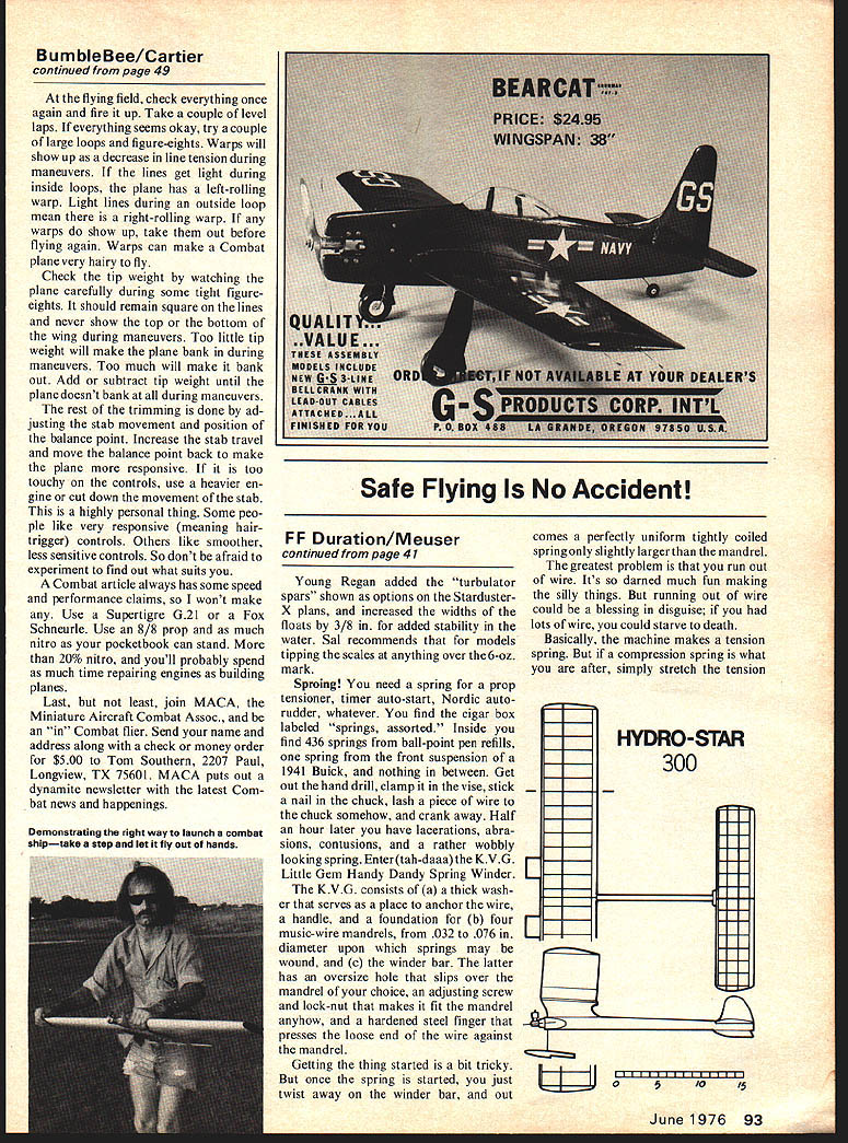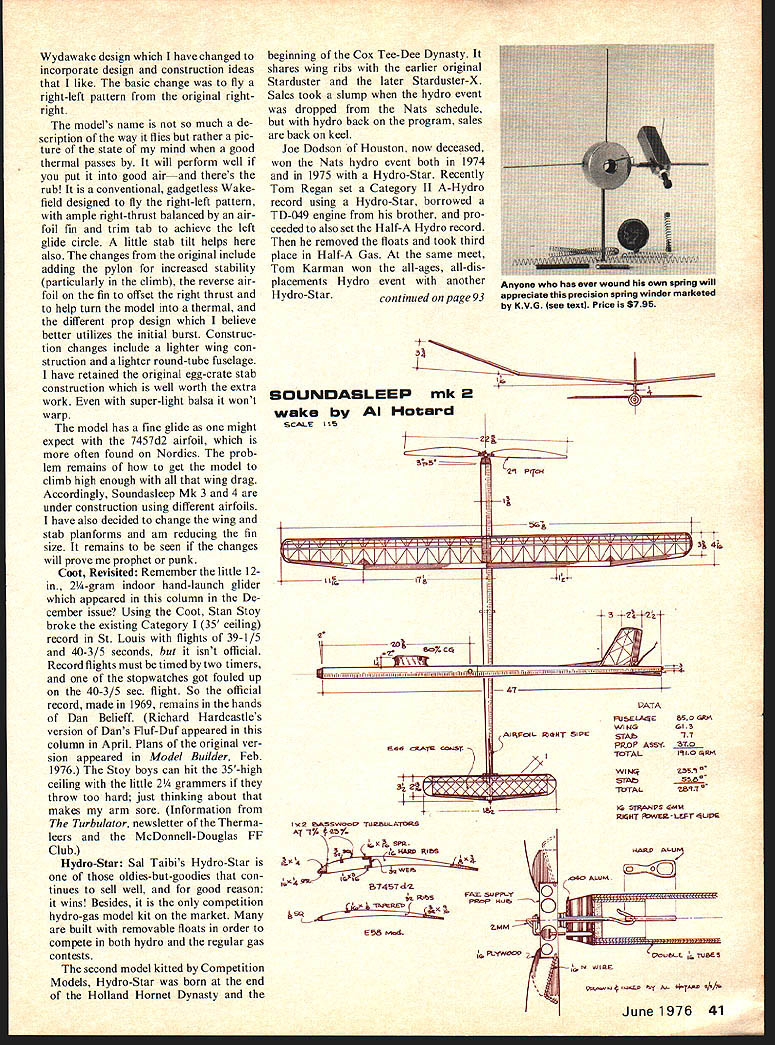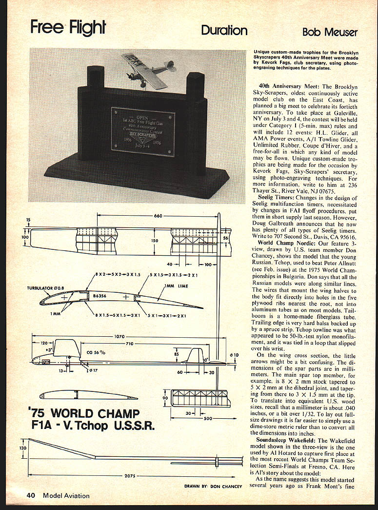 Free FIigh Duralion Bob Meuser 100 iiiiiI7j 40-4 K TURBULATOR 008 1070 K 120710 CG560I0 II -I--fm 85 13FL. 017 75 WORLD CHAMP FlA V Tchop USSR 90 K 30-li.500 Unique custom-made trophies Brooklyn Skyscrapers 40th Anniversary Meet made Kevork Fags club secretary using photo engraving techniques plates 40th Anniversary Meet Brooklyn Sky-Scrapers oldest continuously active model club East Coast has planned big meet celebrate its fortieth anniversary take place Galeville NY July 3 4 contest will held under Category 5-mm max rules will include 12 events HL Glider AMA Power events A/I Towline Glider Unlimited Rubber Coupe dHiver free-for-all kind model may flown Unique custom-made tro phies being made occasion Kevork Fags Sky-Scrapers secretary using photo-engraving techniques information write him 236 Thayer St River Vale NJ 07675 Seelig Timers Changes design Seelig multifunction timers necessitated changes FAI flyoff procedures put short supply last season However Doug Galbreath announces now has plenty types Seelig timers 56Write 707 Second St Davis CA 95616 World Champ Nordic feature 3view drawn US team member Don Chancey shows model young Russian Tchop used beat Peter Allnutt see Feb issue 1975 World Cham pionships Bulgaria Don says Russian models along similar lines wires mount wing halves body fit directly holes five plywood ribs nearest root aluminum tubes models Tailboom home-made fiberglass tube Trailing edge very hard balsa backed up spruce strip Tchop towline what appeared 50-lb-test nylon monofila ment tied loop slipped over wrist 010 On wing cross section little arrows might bit confusing di mensions spar parts milli meters main spar top member example 8 X 2 mm stock tapered 5 X 2 mm dihedral joint taper ing 3 X 15 mm tip translate equivalent US wood sizes recall millimeter about 040 inches bit over 1/32 lay out fullsize drawings far easier simply use dime-store metric ruler convert dimensions inches Soundasleep Wakefield Wakefield model shown three-view used Al Hotard capture first place the recent World Champs Team Se lection Semi-Finals Fresno CA Als story about model As name suggests model started several years ago Frank Monts fine DRAWN DON CHANCEY 40 Model Aviation 15 V 130 Wydawake design have changed incorporate design construction ideas like basic change fly right-left pattern original rightright models name much de scription way flies rather pic ture state mind good thermal passes will perform well put good airand theres rub conventional gadgetless Wake field designed fly right-left pattern ample right-thrust balanced air foil fm trim tab achieve left glide circle little stab tilt helps also changes original include adding pylon increased stability particularly climb reverse air foil fin offset right thrust help turn model thermal different prop design believe better utilizes initial burst Construc tion changes include lighter wing con struction lighter round-tube fuselage have retained original egg-crate stab construction well worth extra work super-light balsa wont warp model has fine glide might expect 7457d2 airfoil often found Nordics prob lem remains get model climb high enough wing drag Accordingly Soundasleep Mk 3 4 under construction using different airfoils have also decided change wing stab planforms am reducing fin size remains seen changes will prove prophet punk Coot Revisited Remember little 12in 2/4-gram indoor hand-launch glider appeared column De cember issue Using Coot Stan Stoy broke existing Category 135 ceiling record St Louis flights 39-1/5 40-3/5 seconds isnt official Record flights must timed two timers stopwatches got fouled up 40-3/5 sec flight So official record made 1969 remains hands Dan Belieff Richard Hardcastles version Dans Fluf-Duf appeared column April Plans original ver sion appeared Model Builder Feb 1976 Stoy boys can hit 35-high ceiling little 2 grammers throw too hard just thinking about makes arm sore Information Turbulator newsletter Therma leers McDonnell-Douglas FF Club Hydro-Star Sal Taibis Hydro-Star oldies-but-goodies con tinues sell well good reason wins Besides competition hydro-gas model kit market built removable floats order compete both hydro regular gas contests second model kitted Competition Models Hydro-Star born end Holland Hornet Dynasty beginning Cox Tee-Dee Dynasty shares wing ribs earlier original Starduster later Starduster-X Sales took slump hydro event dropped Nats schedule hydro back program sales back keel Joe Dodson Houston now deceased won Nats hydro event both 1974 1975 Hydro-Star Recently Tom Regan set Category II A-Hydro record using Hydro-Star borrowed TD-049 engine brother pro ceeded also set Half-A Hydro record removed floats took third place Half-A Gas same meet Tom Karman won all-ages all-dis placements Hydro event another Hydro-Starcontinued page 93 SOUNDASLEEP mk 2 wake Hatard SCALE I5 2 4WVNH/j VN/i\VVI/KIA\ II1 2 EgE cgAT CO~ST S~JO TU2BUA7aS AT1% 377 5NA5D S IS S b7457d/ESS ioL 29 Pqc & 5Gj 3 4i 41pMI AIPFOdL 5HT SIPE PATA FUSE LA4E WING STAb PaoP ASSY TOTAL 850 GRIA GI3 l7 1910 RN 55O ibTAL2897 IG STANS NM RIGHT wES-LEFr 4up5 FAr SUPPLY PSOP NUb PI-Yw00P P Anyone has ever wound own spring will appreciate precision spring winder marketed KVG Isee textl Price $795 6 s WISE 4 .5D 1 AE- *1AAP 2/5$ June 1976 41 Burn ble Bee/Ca rtie r continued page 49 flying field check everything once again fire up Take couple level laps everything seems okay try couple large ioops figure-eights Warps will show up decrease line tension during maneuvers lines get light during inside loops plane has left-rolling warp Light lines during outside loop mean right-rolling warp warps show up take out before flying again Warps can make Combat plane very hairy fly Check tip weight watching plane carefully during some tight figureeights should remain square lines never show top bottom wing during maneuvers Too little tip weight will make plane bank during maneuvers Too much will make bank out Add subtract tip weight unt