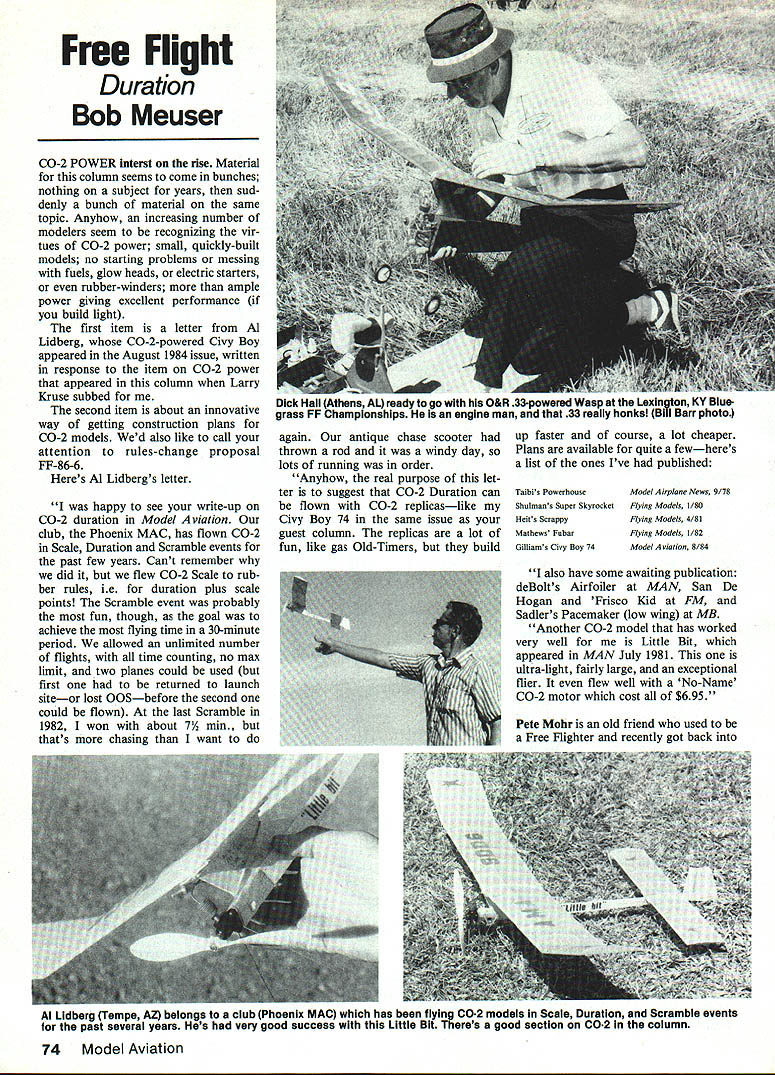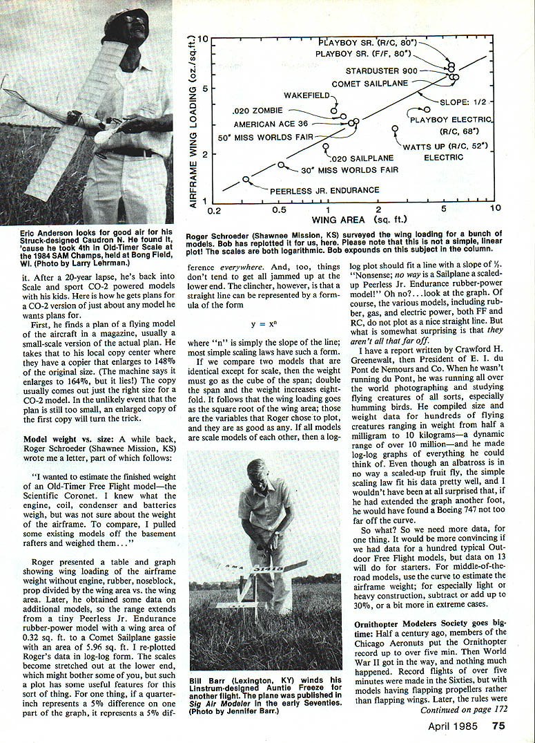 Free Flight Duration Bob Meuser CO-2 POWER lnterst rise Material column seems come bunches nothing subject years sud denly bunch material same topic Anyhow increasing number modelers seem recognizing vir tues CO-2 power small quickly-built models no starting problems messing fuels glow heads electric starters rubber-winders ample power giving excellent performance build light first item letter Al Lidberg CO-2-powered Civy Boy appeared August 1984 issue written response item CO-2 power appeared column Larry Kruse subbed second item about innovative way getting construction plans CO-2 models Wed also like call attention rules-change proposal FF-86-6 Heres Al Lidbergs letter happy see write-up CO-2 duration Model Aviation club Phoenix MAC has flown CO-2 Scale Duration Scramble events past few years Cant remember did flew CO-2 Scale rub ber rules ie duration plus scale points Scramble event probably fun though goal achieve flying time 30-minute period allowed unlimited number flights time counting no max limit two planes could used first returned launch siteor lost OOSbefore second could flown last Scramble 1982 won about TA mm thats chasing want again antique chase scooter thrown rod windy day lots running order Anyhow real purpose let ter suggest CO-2 Duration can flown CO-2 replicaslike Civy Boy 74 same issue guest column replicas lot fun like gas Old-Timers build up faster course lot cheaper Plans available quite fewheres list ones Ive published Taibis Powerhouse Shulmans Super Skyrocket Heits Scrappy Mathews Fubar Giltiams Civy Boy 74 Model Airplane News 9/78 Flying Models 1/80 Flying Models 4/81 Flying Models 1/82 Model nation 8/84 also have some awaiting publication deBolts Airfoiler MAN San De Hogan Frisco Kid FM Sadlers Pacemaker low wing MB Another CO-2 model has worked very well Little Bit appeared MAN July 1981 ultra-light fairly large exceptional flier flew well No-Name CO-2 motor cost $695 Pete Mohr old friend used Free Flighter recently got back Al Lidberg Tempe AZ belongs club Phoenix MAC has flying CO2 models Scale Duration Scramble events past several years Hes very good success Little Bit Theres good section CO-2 column 74 Model Aviation Dick Hall Athens AL ready go 0&R 33-powered Wasp Lexington KY Blue grass FF Championships engine man 33 really honks Bill Barr photo it After 20-year lapse hes back Scale sport CO-2 powered models kids gets plans CO-2 version just about model wants plans First finds plan flying model aircraft magazine usually small-scale version actual plan takes local copy center have copier enlarges 148% original size machine says enlarges 164% lies copy usually comes out just right size CO-2 model unlikely event plan still too small enlarged copy first copy will turn trick Model weight vs size back Roger Schroeder Shawnee Mission KS wrote letter part follows wanted estimate finished weight Old-Timer Free Flight modelthe Scientific Coronet knew what engine coil condenser batteries weigh sure about weight airframe compare pulled some existing models off basement rafters weighed them. Roger presented table graph showing wing loading airframe weight engine rubber noseblock prop divided wing area vs wing area Later obtained some data additional models range extends tiny Peerless Jr Endurance rubber-power model wing area 032 sq ft Comet Sailplane gassie area 596 sq ft re-plotted Rogers data log-log form scales become stretched out lower end might bother some such plot has some useful features sort thing thing quarterinch represents 5tJ70 difference part graph represents 5% dif Co S N 0 0 z 0 0 -j 0 z w U 52kAYBOY SR RIG 80 PLAYBOY SR F/F 80 STARDUSTER 900 COMET SAILPLANE WAKEFIELD SLOPE 1/2020 ZOMBIE AMERICAN ACE 36PLAYBOY ELECTRIC 50 MISS WORLDS FAIRRIG 68 020 SAILPLANE 1 02 30 MISS WORLDS FAIR PEERLESS JR ENDURANCE 05 12 WING AREA sq ft WATTS UP RIG 52 ELECTRIC 5 10 Roger Schroeder Shawnee Mission KS surveyed wing loading bunch models Bob has replotted us Please no simple linear plot scales both logarithmic Bob expounds subject column ference everywhere too things dont tend get jammed up lower end clincher however straight line can represented form ula form y mply slope line simple scaling laws have such form compare two models identical except scale weight must go cube span double span weight increases eight fold follows wing loading goes square root wing area variables Roger chose plot good models scale models other loglog plot should fit line slope Nonsense no way Sailplane scaledup Peerless Jr Endurance rubber-power model Oh no. look graph course various models including rub ber gas electric power both FF RC plot nice straight line what somewhat surprising arent far off have report written Crawford H Greenewalt President E du Pont de Nemours Co wasnt running du Pont running over world photographing studying flying creatures sorts especially humming birds compiled size weight data hundreds flying creatures ranging weight half milligram 10 kilogramsa dynamic range over 10 millionand made log-log graphs everything could think though albatross no way scaled-up fruit fly simple scaling law fit data pretty well wouldnt have surprised extended graph another foot would have found Boeing 747 too far off curve So what So need data thing would convincing data hundred typical Out door Free Flight models data 13 will starters middle-of-theroad models use curve estimate airframe weight especially light heavy construction subtract add up 30% bit extreme cases Ornithopter Modelers Society goes bigtime Half century ago members Chicago Aeronuts put Ornithopter record up over five mm World War II got way nothing much happened Record flights over five minutes made Sixties models having flapping propellers rather flapping wings Later rules Continued page 172 April 1985 75 Eric Anderson looks good air Struckdeslgned Caudron N found cause took 4th 0ldTimer Scale 1984 SAM Champs held Bong Field WI Photo Larry Lehrman Bill Barr Lexington KY winds Linstrum-designed Auntie Freeze