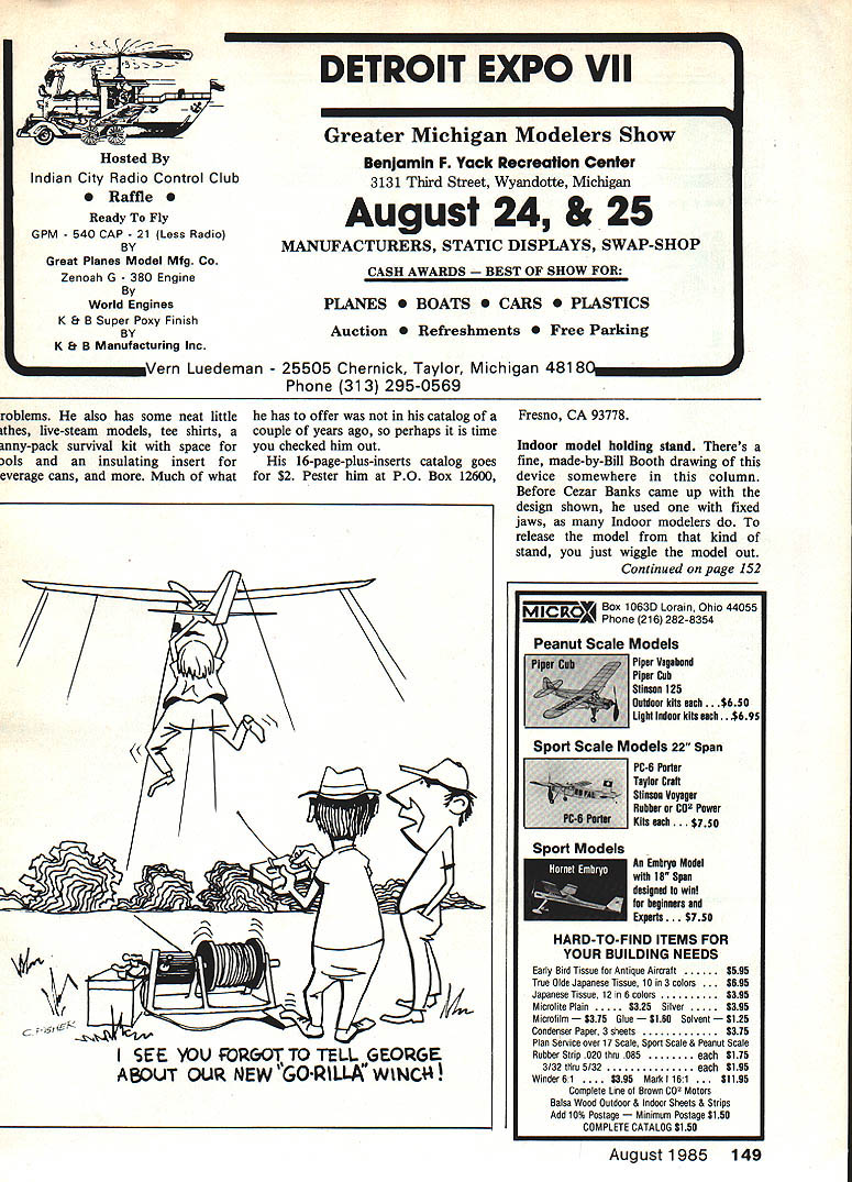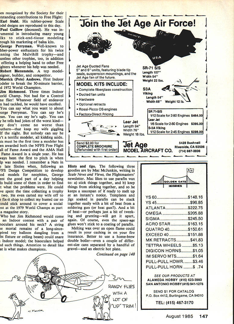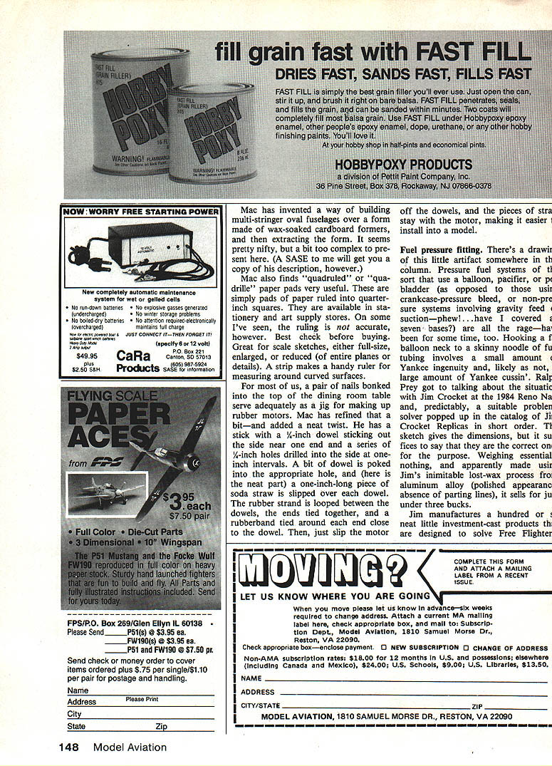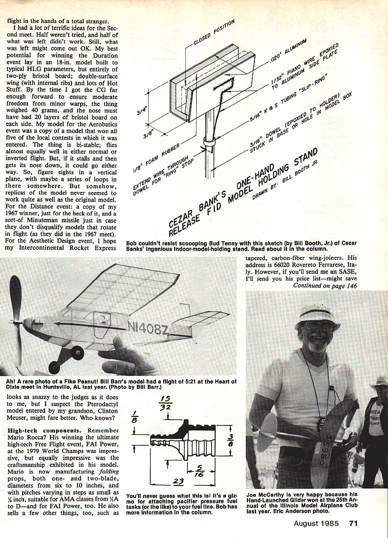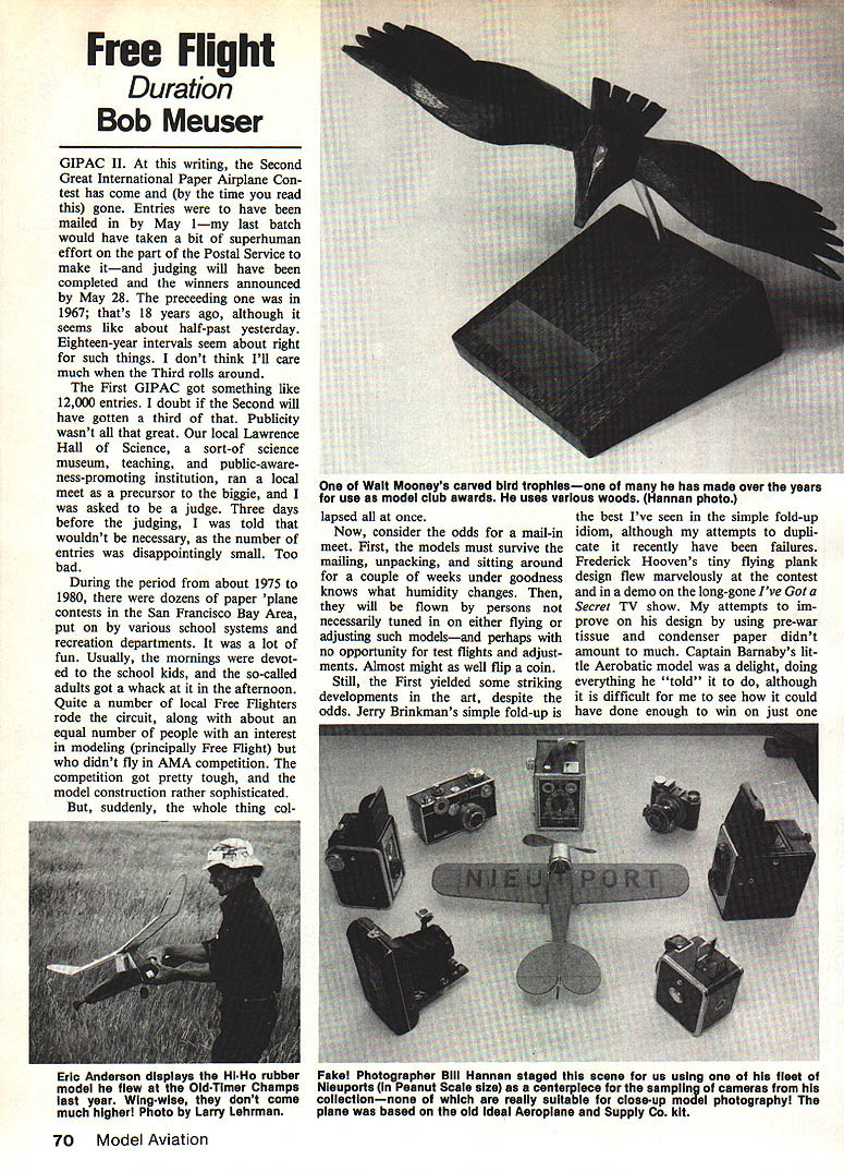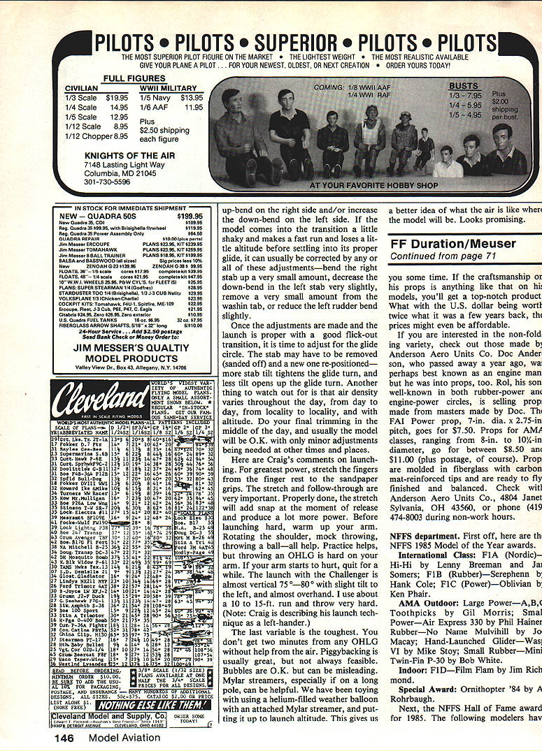 Free Flight Duration Bob Meuser GIPAC II writing Second Great International Paper Airplane Con test has come time read gone Entries have mailed May 1my last batch would have taken bit superhuman effort part Postal Service make itand judging will have completed winners announced May 28 preceeding 1967 thats 18 years ago although seems like about half-past yesterday Eighteen-year intervals seem about right such things dont think Ill care much Third rolls around First GIPAC got something like 12000 entries doubt Second will have gotten third Publicity wasnt great local Lawrence Hall Science sort-of science museum teaching public-aware ness-promoting institution ran local meet precursor biggie asked judge Three days before judging told wouldnt necessary number entries disappointingly small Too bad During period about 1975 1980 dozens paper plane contests San Francisco Bay Area put various school systems recreation departments lot fun Usually mornings devot ed school kids so-called adults got whack afternoon Quite number local Free Flighters rode circuit along about equal number people interest modeling principally Free Flight didnt fly AMA competition competition got pretty tough model construction rather sophisticated suddenly whole thinn col lapsed once Now consider odds mail-in meet First models must survive mailing unpacking sitting around couple weeks under goodness knows what humidity changes will flown persons necessarily tuned either flying adjusting such modelsand perhaps no opportunity test flights adjust ments Almost might well flip coin Still First yielded some striking developments art despite odds Jerrv Brinkmans simnie fnld-un i best Ive seen simple fold-up idiom although attempts dupli cate recently have failures Frederick Hoovens tiny flying plank design flew marvelously contest demo long-gone Ive Got Secret TV show attempts im prove design using pre-war tissue condenser paper didnt amount much Captain Barnabys lit tle Aerobatic model delight doing everything told although difficult see could have done enou2h win just 70 Model Aviation Wait Mooneys carved bird trophiesone has made over years use model club awards uses various woods Hannan photo Eric Anderson displays HiHo rubber Fakel Photographer Bill Hannan staged scene us using fieet modei fiew Qid-Timer Champs Nieuports Peanut Scaic size centerpiece sampilng cameras last year Wing-wise dont come coiiectionnone reaiiy suitabie cioseup model photography much higher Photo Larry Lehrman piane based old Ideal Aeroplane Supply Co kit flight hands total stranger lot terrific ideas Sec ond meet Half werent tried half what left didnt work Still what left might come out OK best potential winning Duration event lay 18-in model built typical HLG parameters entirely two-ply bristol board double-surface wing internal ribs lots Hot Stuff time got CG far enough forward ensure moderate freedom minor warps thing weighed 40 grams nose must have 20 layers bristol board side model Aerobatics event copy model won five local contests entered thing bi-stable flies almost equally well either normal inverted flight stalls gets its nose down could go either way So figure eights vertical plane maybe series loops somewhere somehow replicas model never seemed work quite well original model Distance event copy 1967 winner just heck sort-of Minuteman missile just case dont disqualify models rotate flight did 1967 meet Aesthetic Design event hope Intercontinental Rocket Express elA eosIliON fU01 jO 0 00N f0 iN N000 CZAS Bob couldnt resist accooping Bud Tenny sketch Bill Booth Jr Cezar Banks ingenious indoor-model-holding stand Read about column Ahi rare photo Fike Peanutl Bill Barrs model flight 521 Dixie meet Huntsville AL last year Photo Bill Barr looks snazzy judges does suspect Pterodactyl model entered grandson Clinton Meuser might fare better knows High-tech components Remember Mario Rocca winning ultimate high-tech Free flight event FAT Power 1979 World Champs impres sive equally impressive craftsmanship exhibited model Mario now manufacturing folding props both one- two-blade diameters six 10 inches pitches varying steps small inch suitable AMA classes AA Dand FAT Power too also sells few other things too such Heart 3 -t Youll never guess what its giz mo attaching pacifier pressure fuel tanks like fuel line Bob has information column tapered carbon-fiber wing-joiners address 66020 Rovereto Ferrarese Ita ly However youll send SASE Ill send price llstmight save Continued vale 146 / 8 3 Joe Mccarthy very happy because Hand-Launched Gilder won 25th An nual Illinois Model Airplane Club last year Eric Anderson photo LOTS TS RIOR TS T THE MOST SUPERIOR PILOT FIGURE ON THE MARKET LIGHTEST WEIGHT MOST REALISTIC AVAILABLE GIVE YOUR PLANE PILOT FOR YOUR NEWEST OLDEST OR NEXT CREATION R YOURS TODAY FULL FIGURES CIVILIANWWIIMILITARY 1/3 Scale$19951/5 Navy$1395 1/4 Scale14951/6AAF1195 1/5 Scale1295PIus 1/12 Scale895$250shipping 1/12Chopper 895each figure KNIGHTS OF THE AIR 7148 Lasting Light Way Columbia MD 21045 301-730-5596 IN STOCK FOR IMMEDIATE SHIPMENTup-bend right side and/or increase New RA SOS$19995the down-bend left side Quad 35 cDl$10995 Reg Ocdre35 $9995 Brisighelleflywlrsel$11995model comes transition little Reg Quadra 35 Power Asoesbly Only$9450fastand loses QUADRA REPAIR $1000 plus pens shaky makes run lit Jin Meser ERcOUPE PLANS $2399 KIT $23995 JlnMessrTOMAHAWKPLANS $2395 KIT$25995tle altitude before settling its proper Jin Men. BBALL TRAINERPLANS $1895 KIT $19995glide can usually corrected BALSA end BASSWOOD nice Sig prices 15010% NewZENOAI4 023 $13995ZENOAHI 035$ 9995all adjustmentsbend right FLOATS 3515 scalecores $1795conplste kit $3595 FLOATS 4914 scale cores 92195conplete kit $4795stab up very small amount decrease 19 WWI WHEELS3595 P&W CYLS FLEETS$2595 PLANS SUPER STEARMAN 1/4 Godfrey$3595down-bend left stab very slightly STARDUSTER TOO 14lBrisiglrellel 1/3 J3 CUB Nelito $2995 VOLKSPLANE1I3lChickenCherllelremove very small amount COCKPI