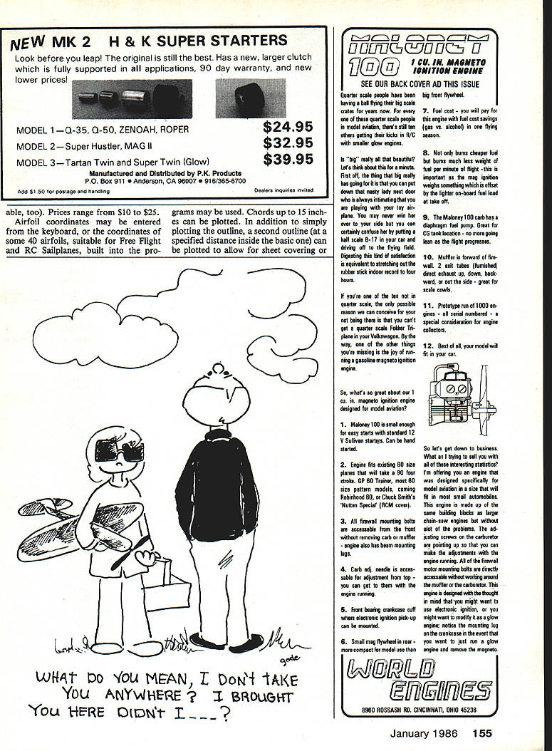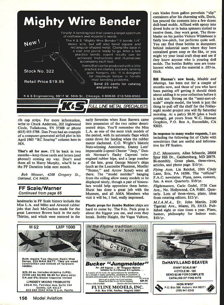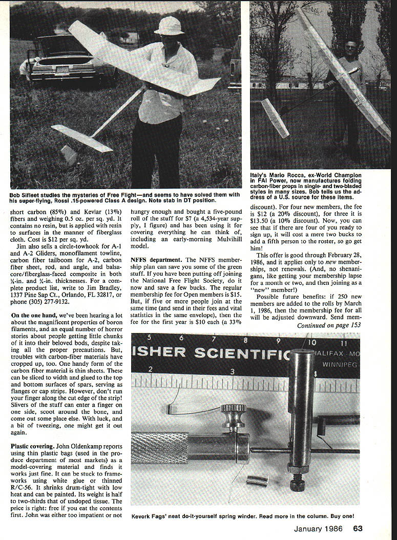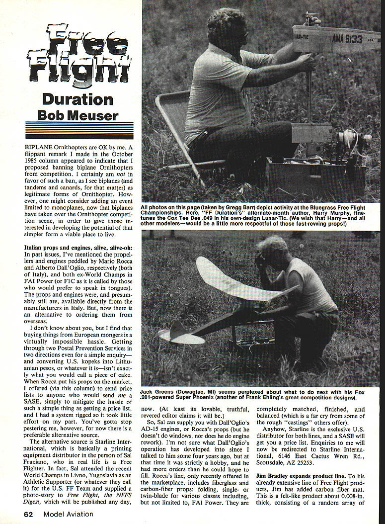 hi Duration Bob Meuser BIPLANE Ornithopters OK flippant remark made October 1985 column appeared indicate proposed banning biplane Ornithopters competition certainly am favor such ban see biplanes tandems canards matter legitimate forms Ornithopter ever might consider adding event limited monoplanes now biplanes have taken over Ornithopter competi tion scene order give terested developing potential simpler form viable place live Italian props engines alive alive-oh past issues Ive mentioned propel lers engines peddled Mario Rocca Alberto DallOglio respectively both Italy both ex-World Champs FAI Power FiG called would prefer speak tongues props engines presum ably still available directly manufacturers Italy now alternative ordering overseas dont know about find buying things European mongers virtually impossible hassle Getting through two Postal Prevention Services two directions simple enquiry converting US kopeks Lithu anian pesos whatever isisnt exact ly what would call piece cake Rocca put props market offered via column send price lists anyone would send SASE simply mitigate hassle such simple thing getting price list system rigged took little effort part Youve gotta stop pestering however now preferable alternative source alternative source Starline Inter national basically printing equipment distributor person Sal Fruciano real life Free Flighter fact Sal attended recent World Champs Livno Yugoslavia Athletic Supporter whatever call US FE Team supplied photo-story Free Flight NFFS Digest will published day now least its lovable truthful revered editor claims will So Sal can supply DallOglios AD-iS engines Roccas props doesnt windows nor does engine rework Im sure what DallOglios operation has developed since talked him some four years ago time strictly hobby orders could hope fill Roccas line recently offered marketplace includes fiberglass carbon-fiber props folding single- twin-blade various classes including limited FAI Power completely matched finished balanced far cry some rough castings others offer Anyhow Starline exclusive US distributor both lines SASE will get price list Enquiries will now redirected Starline Interna tional 6146 East Cactus Wren Rd Scottsdale AZ 25253 Jim Bradley expands product line already extensive line Free Flight prod ucts Jim has added carbon fiber mat felt-like product about 0008-in thick consisting random array 62 Model Aviation photos page taken Gregg Barr depict activity Bluegrass Free Fiight Championships FF Durations aiternate-month author Harry Murphy finetunes Cox Tee Dee 049 own-design Lunar-Tic wish Harryand ail other modeierswouid ilttie respectfui fast-revving propsl Jack Greens Dowag lac Ml seems perplexed about what next Fox 201-powered Super Phoenix another ran Ehiings great competition designs short carbon 85% Keviar 13% fibers weighing 05 oz per sq yd contains no resin applied resin surfaces manner fiberglass cloth Cost $12 per sq yd Jim also sells circle-towhook A-i A-2 Gliders monofilament towline carbon fiber tailboom A-2 carbon fiber sheet rod angle balsacore/fiberglass-faced composite both -in -in thicknesses com plete product list write Jim Bradley 1337 Pine Sap Ct Orlando FL 32817 phone 305 277-9132 hand weve hearing lot about magnificent properties boron filaments equal number horror stories about people getting little chunks beloved bods despite tak ing proper precautions troubles carbon-fiber materials have cropped up too handy form carbon fiber material thin sheets can sliced width glued top bottom surfaces spars serving flanges cap strips However dont run finger along cut edge strip Slivers stuff can enter finger side scoot around bone come out some place else luck bit tweezing might get out again Plastic covering John Oldenkamp reports using thin plastic bags used pro duce department markets model-covering material finds works just fine can stuck frame works using white glue thinned R/C-56 shrinks drum-tight low heat can painted Its weight half two-thirds undoped tissue price right free eat contents first John either too impatient hungry enough bought five-pound roll stuff $7 4534-year sup ply figure has using covering everything can think including early-morning Mulvihill model NFFS department NFFS member ship plan can save some green stuff have putting off joining National Free Flight Society now save few bucks regular membership fee Open members $15 five people join same time send fees vital statistics same envelope fee first year $10 33% discount four new members fee $12 20% discount three $1350 10% discount Now can see four ready sign up will cost mere two bucks add fifth person roster go get him offer good through February 28 1986 applies new member ships renewals no shenani gans like getting membership lapse month two joining new member Possible future benefits 250 new members added rolls March 1 1986 membership fee will adjusted downward Send mem Continued page 153 January1986 63 Bob Sit loot studies mysteries Free Flightand seems have solved super-flying Rossi 15-powered Class design Note stab DT position Italys Mario Rocca ox-World Champion FAI Power now manufactures folding carbon-fiber props single- two-bladed styles sizes Bob tells us ad dress US source items Kevork Fags neat do-ityourself spring winder Read column Buy Everything very well organized plenty workers everyone excellent day racing Jamestown Note Bob Dart personally provided awards including fifth place both Sport Formula One. After races Bob donated cash proceeds UPRC treasury thanks Bob Results August 18 race Ham burg NY Sport 1 Dave Gierke ST 40 2 Ernie Nikodem Webra 3 Gary Gau ST 40-ring 4 Mark Sciandra OPS 40 5 Dave Thomas ST 40 Formula 1 Neil Watson 05 40 2 Mark Sciandra K&B 40 3 Rick Payne X 40 4 Doug Baker 05 40 5 Dave Kelly K&B 40 FAI SuperSport combined 1 Er nie Nikodem 05 40 2 Dave Ford K&B 40 Results August 25 race Jamestown NY Sport 1 Al Mack Webra 2 Dave Gierke ST 40 3 Neil Watson OPS 4 Ernie Nikodem Webra 5 Gary Gau ST 40-ring F