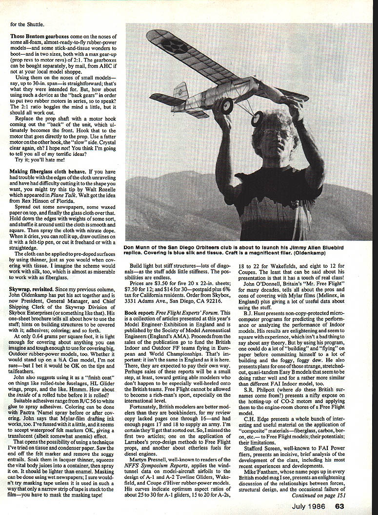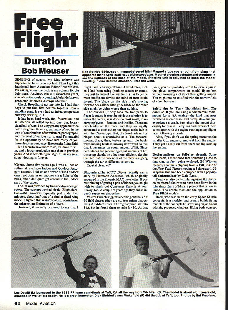 Free Flight Duration Bob Meuser SINGING swans May column supposed have last got frantic call Associate Editor Ross McMul len asking heck column July issue Anyhow Seventeen years almost continuously counting ModelAviadons precursor American Aircraft Modeler Chuck Broadhurst got four days put first column together standing start inked perspective cutaway drawing has hard work fun frustration satisfaction roiled up big loppy sided ball wax very greatly appreciate help Ive gotten great way contributions newsletters photographs material various sorts Im grateful opportunity have met through correspondence flying field seem have less time lower production rate previous years something must go swan song Nothing forever Gyros Some five years ago hot setting available Indoor Outdoor Autogyro records did set two Outdoor ones got done another via fluke rules didnt quite get around Indoor part caper lift provided two side-by-side rigid rotors concept worked nicely Flight dura tionstill akwas typically just under two minutes about half similar fixed-wing model figured wasnt too bad considering inherent inefficiencies gyro However recently occurred might have way off base fixed rotor such using nothing teeters cones just freewheel like windmills has inefficient device mind man could invent blade side thats moving forward does lifting blade other side might doing worse nothing obvious took five years figger out must obvious solution teeter rotors done small mancarrying gyrosBenson like two blades rotor rigidly connected other hinged hub Cierva type two-blade unit hinged about chordwise axis forwardmoving blade teeters up until back ward-moving blade moving downward fast generates equal amount lift Since both blades generating equal amounts lift setup should lot efficient despite fact two sides rotor going through air different velocities Crystal clear eh BinocularsThe NFFS Digest recently ran story Hermann Andreson originally appeared Phoenix MAC newsletter thinking getting pair binocs might wish check out Consumer Reports library too couple years ago did indepth report binoculars Walter Erbach suggests checking out 35 x 50 field glasses true prism binocu lars K-Mart stores regular price $10 $12 found sale $9 price can probably afford leave pair glove compartment model flying box worrying lot about getting swiped might satisfied narrow field view however Safety tips Terry Thorkildsen Satellite using commercial radial mount enginethe kind goes between crankcase backplateand experience crash best check mount thor oughly cracks Terry has several come apart engine running flights later following crash Also dont use spring starter smaller Cox engines remove engine Terry got nasty cut flip-starting engine Dethermalizers full-size aircraft Some time back mentioned something close fact being explored Ed Whitten recently sent clipping 1983 issue New York Times showing Schweizer 1-36 sailplane equipped pop-uptail dethermalizer Dale Reed Reed also contemplating using device aircraft have flown thin atmosphere Mars project now limbo article mentions application Free Flight models Reed early Space Shuttle concepts modeler usually builds flying models concepts working did proposed wingless lifting-body concept Lee Dewitt CL journeyed 1985 FF team semi-fInals Taft CA way Wichita KS model about eight years aid qualified Wakefield easily great innovator Dick Siefrieds new Wakefield R did job Taft too Photos Sal Pruciano 62 Model Aviation Bob Spinks 45-in-span magnet-steered Mini-Magnet slope soarer built plans appeared April1985 issue ofAeromodeller Magnet Steering actuatorand steering fIn ugliness nose model Steering unit adjusted keep model heading desired directioninto wind Shuttle Bentom gearboxes come noses some all-foam almost-ready-to-fly rubber-power modelsand some stick-and-tissue wonders bootand two sizes both max gear-up prop revs motor revs 21 gearboxes can bought separately mail AHC local model shoppe Using noses small models say up 30-in spanis straightforward thats what intended about using such device back gears order put two rubber motors series speak 21 ratio boggles mind little should work out Replace prop shaft motor hook coming out back unit ul timately becomes front Hook motor goes directly prop Use fatter motor other hook slow side Crystal clear again eh hope think Im going tell terrific ideas Try youll hate Making fiberglass cloth behave have trouble edges cloth unraveling have difficulty cutting shape want might try tip Walt Rozelle appeared Plane Talk Walt got idea Rex Hinson Florida Spread out some newspapers some waxed paper top finally glass cloth over Hold down edges weights some sort shuffle around until cloth smooth square spray cloth nitrate dope dries can roll up draw outlines felt-tip pen cut freehand straightedge cloth can applied pre-doped surfaces using thinner just would cov ering tissue imagine scheme would work silk too almost miserable work fiberglass Skywrap revIsIted Since previous column Johii Oldenkamp has put act together now President General Manager Chief Shipping Clerk Skywrap Division Skybox Enterprises something like one-sheet brochure tells about use stuff hints building structures covered adhesives coloring forth 064 grams per square foot light enough covering about anything can imagine tough enough use covering big Outdoor rubber-power models too Whether would stand up Gas model Im surebut bet would OK tips tailfeathers John also suggests using finish coat things like rolled-tube fuselages HL Glider wings props like Hmmm about inside rolled tube before rolled Suitable adhesives range H/C 56 white glue spray adhesives Coloring can done Pactra Namel spray before after cov ering John says Mylar-flim drafting ink works too Ive fussed little seems accept waterproof felt markers OK glving translucent albeit somewhat anemic effect opens possibility using technique Ive tried tissue condenser paper Saw end off felt marker remove soggy entrails Soak lacquer thinner squeeze v