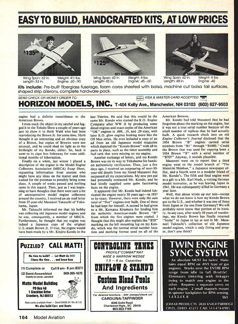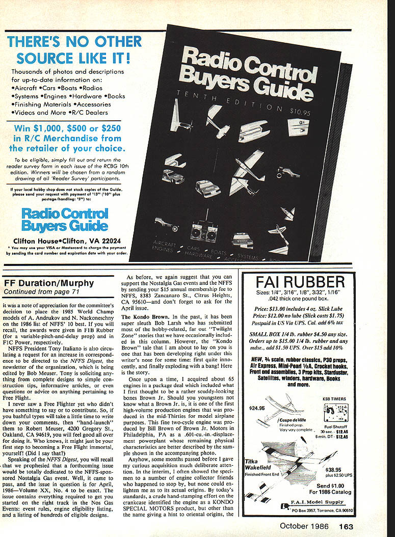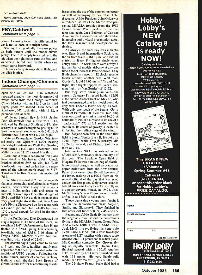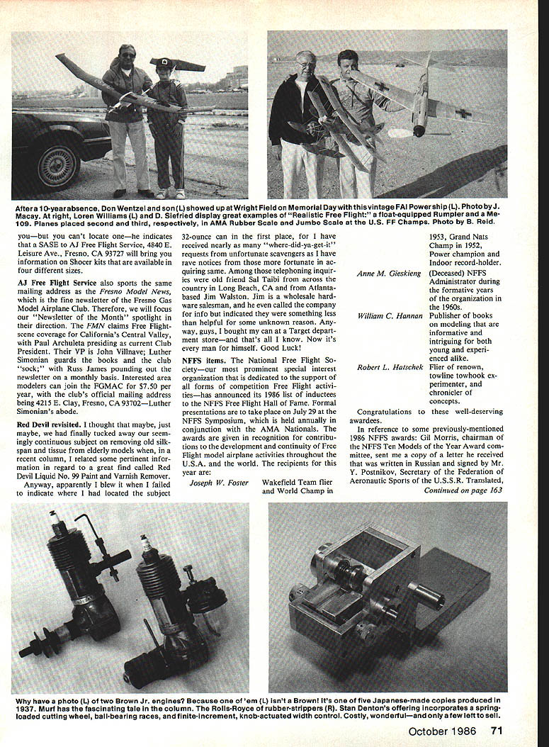 Free Flight Duration Harry Murphy THANKS interim since last session volume fresh postal commentary column feedback has gratifying probably sufficient fulfill space quota issue should attempt honor responses hope indication passing items interest rate Ill get pro gram enable covering much mail bag material possibleand thanks take time contribute writ ten words Free Flight Dentons stripper Serious-minded rubberpower competitors alerted Larry Kruse sent photo Stan Dentons custom-made rub ber stripper fantastic machine may worlds best purpose intended Ma chined bar stock spring-loaded cut ting wheel ball-bearing races stripper calibrated increments one-hundredths inch adjustments being made two knurled knobs Larry advises Stan has produced initial batch 25 devices last conversation him indicated few left Whether additional pro duction unknown writing gadget appears built virtually destructable might make good club pur chase well tab $100 plus $275 shipping Stans mailing address Denton Motors Ltd 1107 SW 42nd St Oklahoma City OK 73109 Youve got admit photo exudes quality Stuff Starline Sal Fruciano Starline International sent accompanying photo ex-Hoosier Ed Lidgard posing 110-square-inch silk-covered model design calls Sparky excellentlyperforming design originally conceived early Forties Ed worked Com et Model Airplane Company Chicago Sal further comments Ed now retired has regular Taft CA contests late although doesnt seem compete officially can usually found toying fine original rubber model designs under 150 square inches wing area Catching Ed downwind Free Flight Champs retrieving 100-square-inch allbalsa cabin model Sal relates Ed volun teered design retrieved cabin model also dated back 1940 used have design contests lunchtime pro cedure give everyone clean sheet paper time limit 15 minutes come up original design within rules workable Gee thats amazing Ive working same gas design past 15 years still questionable whether can con sidered workable Indicating steady growth Starline International Sal also sent copy its new quality catalog chock full items interest outdoor Free Flight buff will recall recently relayed advertising plug Starlines digital Thermal Sniffer thermometer result apparently peddled long-time modeler Henry Struck turn commented hey day thermals called risers Conse quently thought instead thermal sniffer device should appropri ately labeled riser recognizer addition aforementioned thermaldetecting device Starlines new catalog cludes multitude other goodies geared interest outdoor Free Flight competition rank file such Montreal Stop units Eurostyle front ends prop blanks forming blocks rubber lube other acces sories serious rubber-power competitor also offers Campbell kit line Italian Rocca prop line including folders Toyo line precision hobby lathes ac cessories dollar bill will get copy catalog additional $2 will bring eight-page price list catalog Toyo stuff address still Starline International 6146 E Cactus Wren Rd Scottsdale AZ 85253 Phone 602/948-5798 FF Fresno Free Flighter Mel Schmidt sent photo beautifully-built Super tigre G21/29-powered Shocer model victorious B Gas 86 Taft Free Flight Champs posted winning time 4230 Mel advises ship built stock Shocer kit Should kit interest 70 Model Aviation Mel Schmidt sent photo Shocer 600 copped B Gas US FF Champs Taft CA Power isa STG21 /29 winningtimewas4230 Wanta Shocerkitand cantfind local hobby shop Murf has information source column Ed Lidgard isa noted designer small rubber-powered models Heres Fortiesvintage silk-covered Sparky Look great flying site Photo S Fruciano Aftera 1 0-yearabsence Don Wentzel son L showed up Wright Field Memorial Daywith thisyintage FAI PowershipL Photo byJ Macay right Loren Williams L D Siefried display great examples Realistic Free Flight float-equipped Rumpler Me109 Planes placed second third respectively AMA Rubber Scale Jumbo Scale US FF Champs Photo B Reid youbut cant locate onehe indicates SASE AJ Free Flight Service 4840 E Leisure Ave Fresno CA 93727 will bring information Shocer kits available four different sizes AJ Free Flight Service also sports same mailing address Fresno Model News fine newsletter Fresno Gas Model Airplane Club Therefore will focus Newsletter Month spotlight direction FMN claims Free Flightscene coverage Californias Central Valley Paul Archuleta presiding current Club President VP John Villnave Luther Simonian guards books club sock Russ James pounding out newsletter monthly basis Interested area modelers can join FOMAC $750 per year clubs official mailing address being 4215 E Clay Fresno CA 93702Luther Simonians abode Red Devil revisited thought maybe just maybe finally tucked away seem ingly continuous subject removing old silkspan tissue elderly models recent column related some pertinent infor mation regard great find called Red Devil Liquid No 99 Paint Varnish Remover Anyway apparently blew failed indicate located subject 32-ounce can first place have received nearly where-did-ya-get-it requests unfortunate scavengers have rave notices fortunate ac quiring same Among telephoning inquir ies old friend Sal Taibi across country Long Beach CA Atlantabased Jim Waiston Jim wholesale hard ware salesman called company info indicated something less helpful some unknown reason Any way guys bought can Target depart ment storeand thats know Now its man himself Good Luck NFFS items National Free Flight So cietyour prominent special interest organization dedicated support forms competition Free Flight activi tieshas announced its 1986 list inductees NFFS Free Flight Hall Fame Formal presentations take place July 29 NFFS Symposium held annually conjunction AMA Nationals awards given recognition contribu tions development continuity Free Flight model airplane activities throughout USA world recipients year Joseph W Foster Wakefield Team flier World Champ Anne M Gieskieng William C Hannan Robert L Hatschek 1953 Grand Nats Champ 1952 Power champion Indoor record-holder
