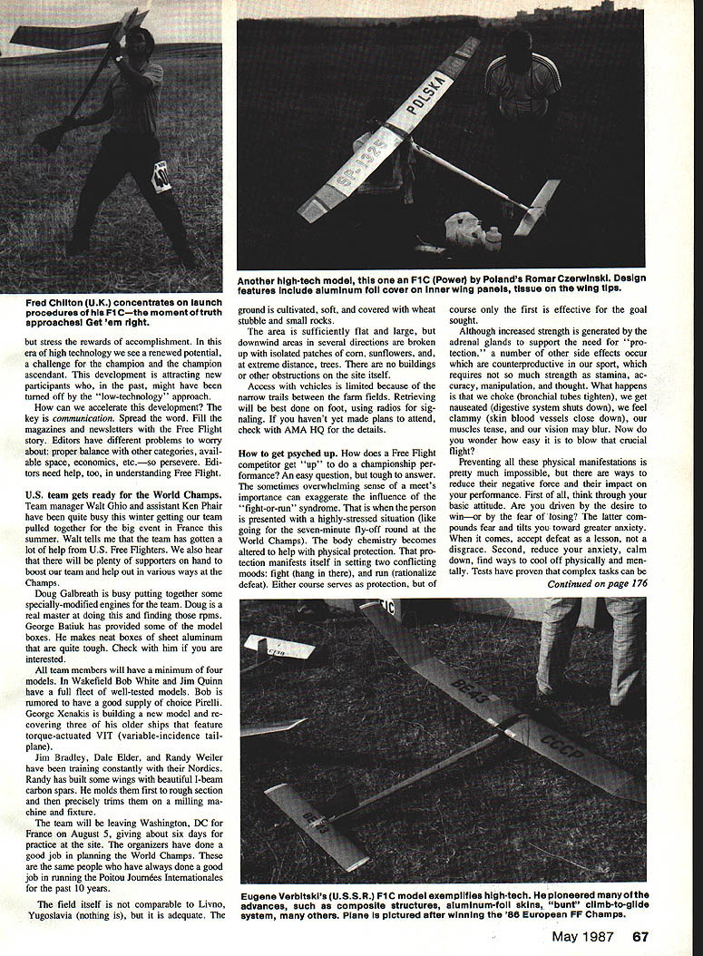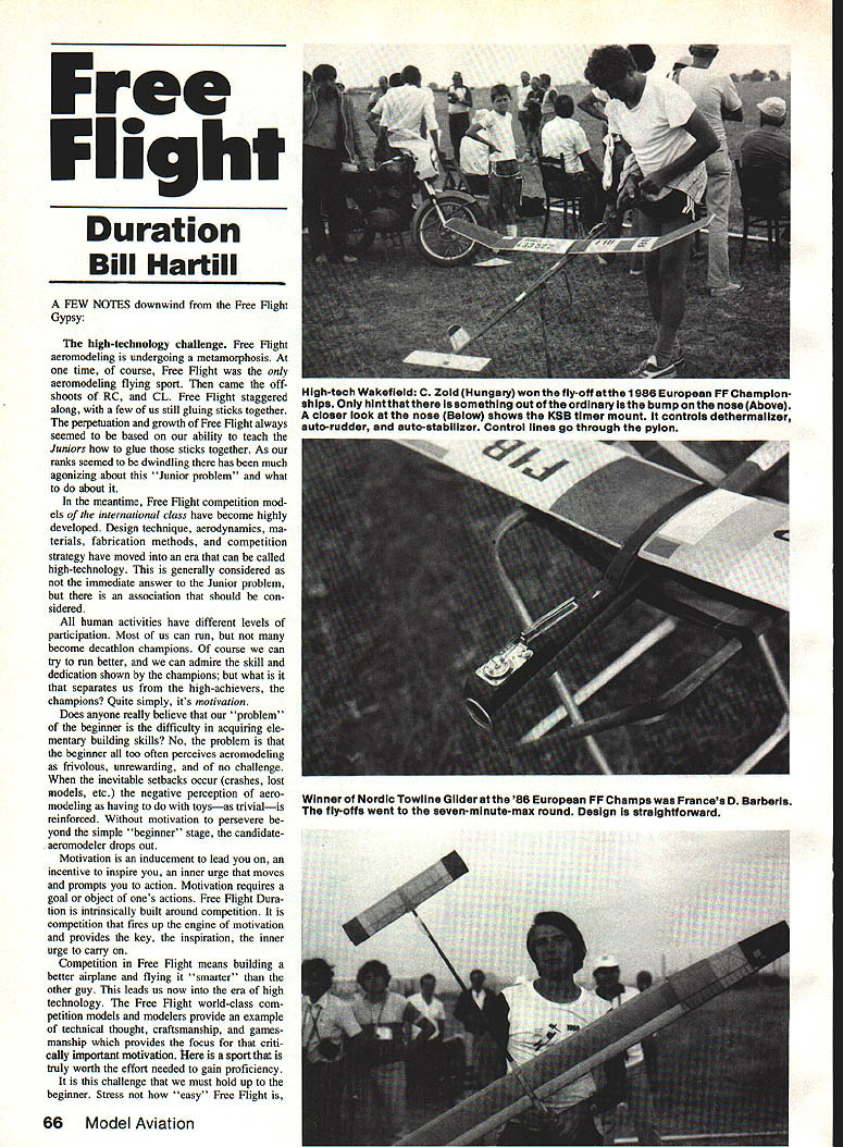 Free Flight Duration Bill Hartill FEW NOTES downwind Free Flight Gypsy high-technology challenge Free Flight aeromodeling undergoing metamorphosis time course Free Flight aeromodeling flying sport came off shoots RC CL Free Flight staggered along few us still gluing sticks together perpetuation growth Free Flight always seemed based ability teach Juniors glue sticks together As ranks seemed dwindling has much agonizing about Junior problem what about meantime Free Right competition mod els international class have become highly developed Design technique aerodynamics ma terials fabrication methods competition strategy have moved era can called high-technology generally considered immediate answer Junior problem association should con sidered human activities have different levels participation Most us can run become decathlon champions course can try run better can admire skill dedication shown champions what separates us high-achievers champions Quite simply its motivation Does anyone really believe problem beginner difficulty acquiring ele mentary building skills No problem beginner too often perceives aeromodeling frivolous unrewarding no challenge inevitable setbacks occur crashes lost models etc negative perception aero modeling having toysas trivialis reinforced Without motivation persevere yond simple beginner stage candidate aeromodeler drops out Motivation inducement lead incentive inspire inner urge moves prompts action Motivation requires goal object ones actions Free Flight Dura tion intrinsically built around competition competition fires up engine motivation provides key inspiration inner urge carry Competition Free Flight means building better airplane flying smarter other guy leads us now era high technology Free Flight world-class com petition models modelers provide example technical thought craftsmanship games manship provides focus criti cally important motivation sport truly worth effort needed gain proficiency challenge must hold up beginner Stress easy Free Flight 66 Model Aviation High-tech Wakefield C Zoid Hungay won fiy-off atthe 1986 European PF Champion ships Oniy hint thatthere something out ordinary bump nose Above closer look nose Below shows KSB timer mount controls dethermalizer auto-rudder auto-stabilizer Control lines go through pylon Winner Nordic Towilne Gilder 86 European FF Champs Prances D Barberis fly-offs went seven-minute-max round DesIgn straightforward stress rewards accomplishment era high technology see renewed potential challenge champion champion ascendant development attracting new participants past might have turned off low-technology approach can accelerate development key communication Spread word Fill magazines newsletters Free Flight story Editors have different problems worry about proper balance other categories avail able space economics etcso persevere Edi tors need help too understanding Free Right US team gets ready World Champs Team manager Walt Ghio assistant Ken Phalr have quite busy winter getting team pulled together big event France summer Walt tells team has gotten lot help US Free Flighters also hear will plenty supporters hand boost team help out various ways Champs Doug Galbreath busy putting together some specially-modified engines team Doug real master doing finding rpms George Batiuk has provided some model boxes makes neat boxes sheet aluminum quite tough Check him interested team members will have minimum four models Wakefield Bob White Jim Quinn have full fleet well-tested models Bob rumored have good supply choice Pirelli George Xenakis building new model re covering three older ships feature torque-actuated VIT variable-incidence tailplane Jim Bradley Dale Elder Randy Weiler have training constantly Nordics Randy has built some wings beautiful I-beam carbon spars molds first rough section precisely trims milling ma chine fixture team will leaving Washington DC France August 5 giving about six days practice site organizers have done good job planning World Champs same people have always done good job running Poitou Journes Internationales past 10 years field itself comparable Livno Yugoslavia nothing adequate ground cultivated soft covered wheat stubble small rocks area sufficiently flat large downwind areas several directions broken up isolated patches corn sunflowers extreme distance trees no buildings other obstructions site itself Access vehicles limited because narrow trails between farm fields Retrieving will best done foot using radios sig naling havent yet made plans attend check AMA HQ details get psyched up does Free Right competitor get up championship per formance An easy question tough answer sometimes overwhelming sense meets importance can exaggerate influence fight-or-run syndrome person presented highly-stressed situation like going seven-minute fly-off round World Champs body chemistry becomes altered help physical protection pro tection manifests itself setting two conflicting moods fight hang run rationalize defeat Either course serves protection course first effective goal sought Although increased strength generated adrenal glands support need pro tection number other side effects occur counterproductive sport requires much strength stamina ac curacy manipulation thought What happens choke bronchial tubes tighten get nauseated digestive system shuts down feel clammy skin blood vessels close down muscles tense vision may blur Now wonder easy blow crucial flight Preventing physical manifestations pretty much impossible ways reduce negative force impact performance First think through basic attitude Are 4riven desire winor fear losing latter com pounds fear tilts toward greater anxiety comes accept defeat lesson disgrace Second reduce anxiety calm down find ways cool off physically men tally Tests have proven complex tasks can Continued page 176 May1987 67 Fred Chilton UK concentrates launch procedures Fl Cthe moment truth approachesl Get em rIght Another high-tech model Fl C Power Poiands Ro