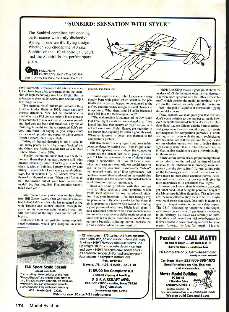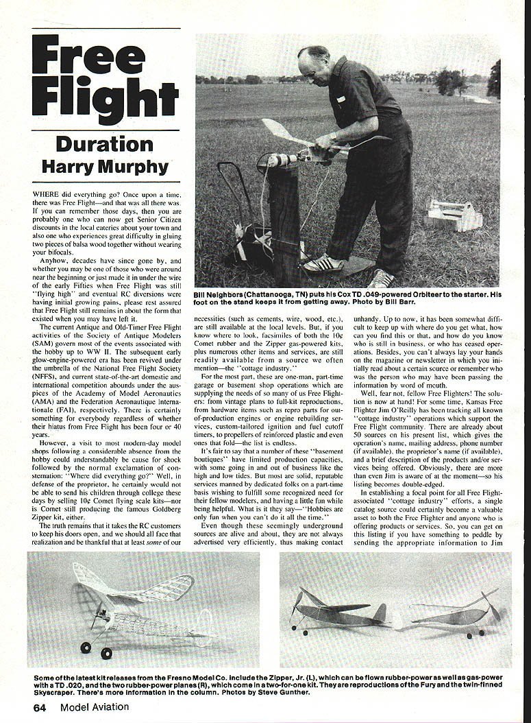 Free Flight Duration Harry Murphy WHERE did everything go Once upon time Free Flightand was can remember days probably can now get Senior Citizen discounts local eateries about town also experiences great difficulty gluing two pieces balsa wood together wearing bifocals Anyhow decades have since gone whether may around near beginning just made under wire early Fifties Free Flight still flying high eventual RC diversions having initial growing pains please rest assured Free Flight still remains about form existed may have left current Antique Old-Timer Free Flight activities Society Antique Modelers SAM govem events associated hobby up WW II subsequent early glow-engine-powered era has revived under umbrella National Free Flight Society NFFS current state-of-the-art domestic intemational competition abounds under aus pices Academy Model Aeronautics AMA Federation Aeronautique Intema tionale FAI respectively certainly something everybody regardless whether hiatus Free Flight has four 40 years However visit modem-day model shops following considerable absence hobby could understandably cause shock followed normal exclamation con stemation did everything go Well defense proprietor certainly would able send children through college days selling log Comet flying scale kitsnor Comet still producing famous Goldberg Zipper kit either truth remains takes RC customers keep doors open should face realization thankful least some necessities such cements wire wood etc still available local levels know look facsimiles both log Comet rubber Zipper gas-powered kits plus numerous other items services still readily available source often mentionthe cottage industry part one-man part-time garage basement shop operations supplying needs us Free Flight ers vintage plans full-kit reproductions hardware items such repro parts outof-production engines engine rebuilding ser vices custom-tailored ignition fuel cutoff timers propellers reinforced plastic ones foldthe list endless Its fair say number basement boutiques have limited production capacities some going out business like high low tides solid reputable services manned dedicated folks part-time basis wishing fulfill some recognized need fellow modelers having little fun being helpful What sayHobbies fun cant ttme though seemingly underground sources alive about always advertised very efficiently thus making contact unhandy Up now has somewhat diffi cult keep up get what can find know still business has ceased oper ations Besides cant always lay hands magazine newsletter ini tially read about certain source remember person may have passing information word mouth Well fear fellow Free Flighters solu tion now hand some time Kansas Free Flighter Jim OReilly has tracking known cottage industry operations support Free Flight community already about 50 sources present list gives operations name mailing address phone number available proprietors name available brief description products and/or ser vices being offered Obviously Jim aware momentso listing becomes double-edged establishing focal point Free Flightassociated cottage industry efforts single catalog source could certainly become valuable asset both Free Flighter anyone offering products services So can get listing have something peddle sending appropriate information Jim 64 Model Aviation Bill Neighbors Chattanooga TN puts Cox TD 049-powered Orbiteerto starter foot stand keeps getting away Photo Bill Barr Some latest kit releases Fresno Model Co Include ZIpper Jr CL can flown rubber-power saweil sagas-power TD 020 two rubber-power planes CR come two-for-one kit Theyare reproductions Fury thetwin-finned Skyscraper Theres information column Photos Steve Gunther OReilly 4760 N Battin Wichita KS 67220 SASE dollar bill will get copy current information too Since listing will no doubt ever-changing periodic updating new information would seem appropriate also Oh yeah thing seems imminent Jim going getting lot mail Jetex revival usual newsletter-of-the-month takes little different purpose time focus specialty rag attempting reestablish solid fuel rocket events once knew Jetex can remember few years back such acute shortage Jetex 150 fuel pellets original supplier went Out production movement com pletely erase Rocket event official Free Flight AMA competition Free Flight Contest Board Chairman Chris Mat suno ultimately saved event absolute ob livion suggesting rather eradicating event entirely should revert back Provisional status thereby tossing event Special Event category rather ash can seemed rational resolu tion Chris purpose leave event Provisional Event springboard case some decided begin producing approprite fuel once again would much easier get event reinstated some eventual miracle came about Good thinking Chris As onetime AMA Nats winner event rather enjoyed getting fingers singed occasion ally hot tubes fuel supply ran out 82 Lincoln Nats just enough pel lets remaining put couple official flights remaining two Jetex 150 rocket-powered models Both models went quite well insofar both drifted deep downwind cornfield Since out fuel apparently convinced Jetex-shall-never-rise-again didnt bother go look Dumb lazytake pick how recently saw advertisement British model mag counterpart Jetex 50 pellets available again Whether intend produce 150 size cannot say writing Also just last week received letter Roger Wathen has diligently plodding away attempting keep Jetex fuse burning publishing Jetex Newsletter cur rently claims over 70 subscribers including some far away Saudi Arabia Switzerland rag promotes interest preserving concept Jetex-powered flying info abouts plans fuel motors Roger cur rently issue #9 newsletter has subscription price $3 address 3242 N DeQuincy St Indianapolis IN 46218 150 fuel becomes available may take look same cornfield years 87 Lincoln Nats after ll whatever outcome Long live Jetex' Zipper Jr last session stated Marion Crowders Fresno Model Airplane Co number other neat vintage rubbe