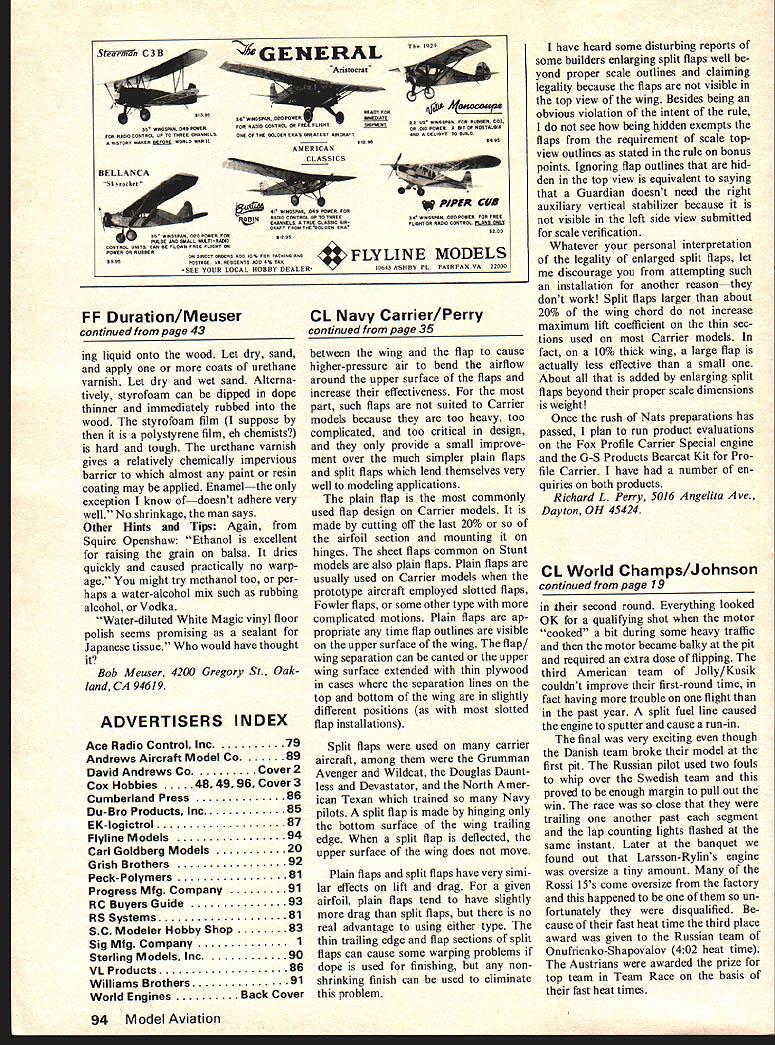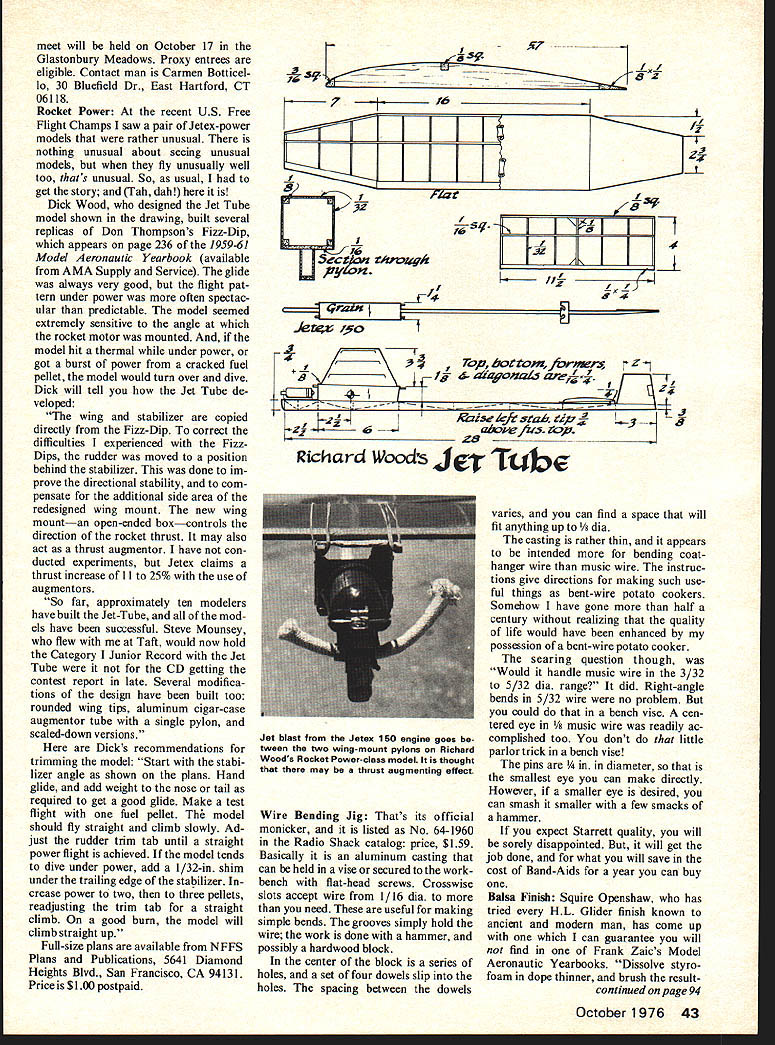 Duration Beyond Belieff Before take task lousy spelling let explain Dan Belieff lad has held Category Open Indoor HL Glider rec ord better part decade cant help cant spell Getting beyond Dan Belieff Cat IHLG will take some ing Im sure wont lose sleep over implied threat glider shown drawing may may great design has done well several oc casions recently beating former low-ceil ing record holders Ron Wittman Lee Hines competition has some interesting features Before make wisecracks about fuselage looking like hind leg dog better sure pooch within earshot dont think would take kindly started out looking pretty normal swooped up under wing save weight later tentionally broke re-glued get sufficient turn incidence warp ing tail surfaces out shape Its 24-in span l0-gr weight give far greater overall size weight far greater wing loading anything anyone right mind would fly 22ft ceiling typical would 16-in span weight 4 5 gr airfoil combination lot things bears some resemblance used model Erv Rodemsky built very thick near leading edge thin ning rapidly aft very front wing vertical lower front corner leading edge sharp notion came foils Hank Cole George Xen akis have used Nordics FAI Power models Wakefields Wakefield props res. Bob Meuser Undercamber easily overdone glider has Previous experience smaller gliders seemed indicate best way add camber bend down trailing edge form flap rather distribute camber uniformly through-hole turbulators result 20-year-old article ero Modeller recently sent Prasanta Banerjee India figured didnt work could always plug dabs glue Cole leading edge hole turbulators intend ed models flying Reynolds numbers three four times high model really worked model would rather fortuitous can say sure couldnt have hurt performance much model did seem stable less susceptible gusts conventional leading edge Having model suddenly come stop fall altitude four feet can rather discon certing model started out life eyeballed Supersweep Rons original model made rough much lighter copy plain dihedral Since model originally built stabilizer area rudder area have decreased tailboom has shortened think tran sition launch glide would im proved dihedral increased rudder area decreased still further Almost everyone flies low-ceiling gliders uses left-left pattern Im right handed cant throw glider wings level let alone banked left So right-right 0201*0/es ofl 1/4 centers. ~oot air/oil Beyond BCIIEIT bij Dob Meuser 1st 4ac 19T6 VFreeRiyhtCbanttis W dihedral KX2 model has flown three occasions rather drastic modifi cations between flying sessions three sessions under competition condi tions such circumstances does what thinks will maximize chances bringing home trophy means play cool dont take un necessary chances have few flights remaining first place sured within sight go broke far different tactical game plays developing model future competition model has highly developed like said has some interesting unusual fea tures over 31 sec 22-ft usable ceiling height bad Ron Wittman called tonight ex pressed interest doing some practic ing almost cheating dont think IHLG fliers have heretofore done flying between annual FreeFlight Championships would nice see some real competition going West Coast low-ceiling Indoor HLG again Ron Lee have let Dan hang onto record far too long Henry Struck Honored can scarcely pick up pre-WWII model magazine out finding some reference Henry Struck Henry built least 80 models plans large fraction published Struck-designed models still being built Old-Timer rub ber-power Flying Scale competition Henry still active FAI World Championships program Wakefield rubber-power models honor Henrys great contribution sport Sam-7 club Connecti cut will sponsor unique contest limited models designed Henry Struck 42 Model Aviation Henry Struck well-known modeler since Thirties honored contest open replicas designs meet will held October 17 Glastonbury Meadows Proxy entrees eligible Contact man Carmen Botticel lo 30 Bluefield Dr East Hartford CT 06118 Rocket Power recent US Free Flight Champs saw pair Jetex-power models rather unusual nothing unusual about seeing unusual models fly unusually well too thats unusual So usual get story Tah dah Dick Wood designed Jet Tube model shown drawing built several replicas Don Thompsons Fizz-Dip appears page 236 1959-61 Model Aeronautic Yearbook available AMA Supply Service glide always very good flight pat tern under power often spectac ular predictable model seemed extremely sensitive angle rocket motor mounted model hit thermal under power got burst power cracked fuel pellet model would turn over dive Dick will tell Jet Tube de veloped wing stabilizer copied directly Fizz-Dip correct difficulties experienced FizzDips rudder moved position behind stabilizer done im prove directional stability com pensate additional side area redesigned wing mount new wing mountan open-ended boxcontrols direction rocket thrust may also act thrust augmentor have con ducted experiments Jetex claims thrust increase 11 25% use augmentors So far approximately ten modelers have built Jet-Tube mod els have successful Steve Mounsey flew Taft would now hold Category Junior Record Jet Tube CD getting contest report late Several modifica tions design have built too rounded wing tips aluminum cigar-case augmentor tube single pylon scaled-down versions Dicks recommendations trimming model Start stabi lizer angle shown plans Hand glide add weight nose tail required get good glide Make test flight fuel pellet Th model should fly straight climb slowly Ad just rudder trim tab until straight power flight achieved model tends dive under power add 1/32-in shim under trailing edge stabilizer crease power two three pellets readjusting trim tab straight climb good bum model will climb straight up Full-size plans available NFFS Plans Publications 5641 Diamond Heights Blvd San Francisco CA 94131 Price $100 postpaid A7 -__ 3Ii _ 82 44LII 16 I 4 rt1f1=tU 1----- 4IX - 4 F ~ Top bottom form