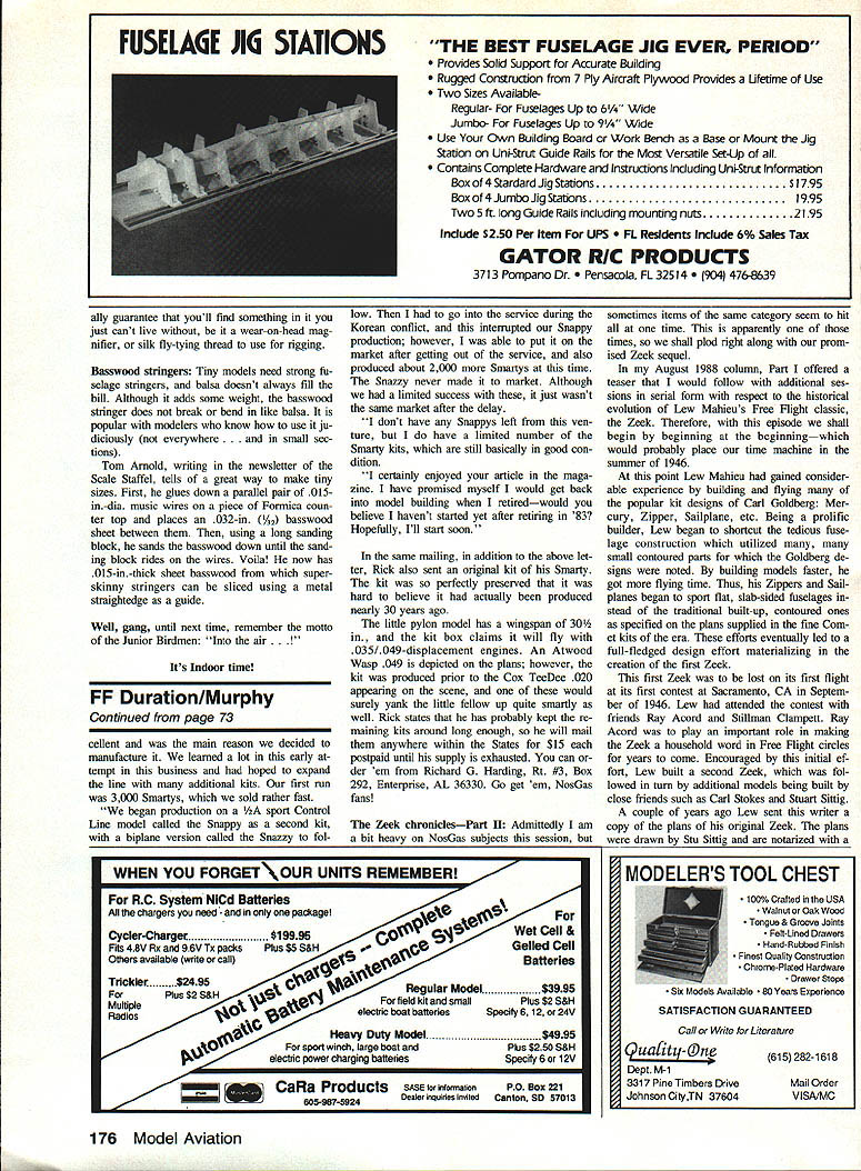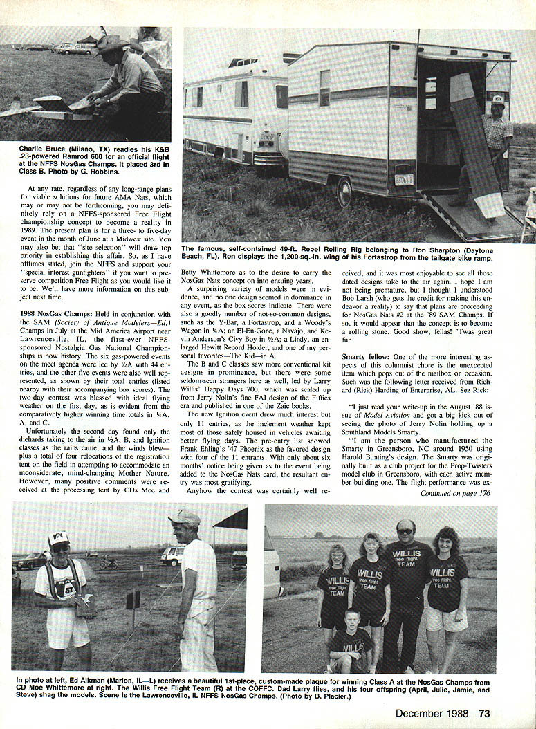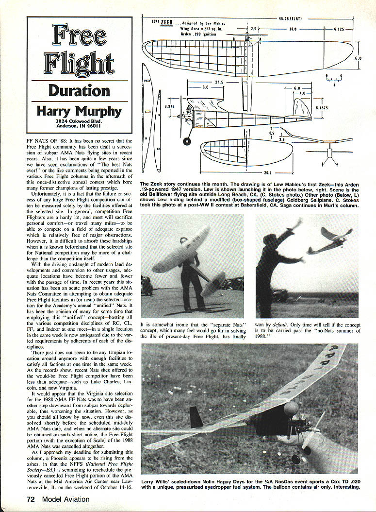 FF NATS OF 88 has no secret Free Flight community has dealt succes sion subpar AMA Nats flying sites recent years Also has heen quite few years since have seen exclamations best Nats ever like comments being reported various Free Flight columns aftermath once-distinctive annual contest bore former champions lasting prestige Unfortunately fact failure suc cess large Free Flight competition can ten measured solely facilities offered selected site general competition Free Flighters hardy lot will sacrifice personal comfortor travel milesto able compete field adequate expanse relatively free major obstructions However difficult absorb hardships known beforehand selected site National competition may chal lenge competition itself driving onslaught modem land de velopments conversion other usages ade quate locations have become fewer fewer passage time recent years sit uation has acute problem AMA Nats Committee attempting obtain adequate Free Flight facilities near selected loca tion Academys annual unified Nats has opinion some time employing unified concepthosting various competition disciplines RC CL FF Indoor meetin single location same week now antiquated due var ied requirements adherents of dis ciplines just does seem Utopian lo cation around anymore enough facilities satisfy factions time same week As records show recent Nats sites offered would-be Free Flight competitor have less adequatesuch Lake Charles Lin coln now Virginia would appear Virginia site selection 1988 AMA FF Nats have other step downward subpar towards deplor able thus worsening situation However should know now site dis solved shortly before scheduled mid-July AMA Nats date no alternate site could obtained such short notice Free Flight portion exception Scale 1988 AMA Nats cancelled altogether As approach deadline submitting column Phoenix appears rising ashes NFFS National Free Flight SocietyEd scrambling reschedule pre viously cancelled Free Flight portion AMA Nats Mid America Air Center near Law renceville IL weekend October 14-16 . gned h1 ten Mjhieu Wing Area sq Arden 199 Ignition 11111 0525 FLAT 29140 -0I25 tv-v 215 0060 200 Zeek story continues month drawing Lew Mahieus first Zeekthis Arden 19-powered 1947 version Lew shown launching photo below right Scene old Beliflower flying site outside Long Beach CA C Stokes photo Other photo Below L shows Lew hiding behind modified box-shaped fuselage Goldberg Sailplane C Stokes took photo post-WW II contest Bakersfield CA Saga continues Murfs column somewhat ironic separate Nats concept feel would go far solving ills present-day Free Flight has finally won default Only time will tell concept carried past no-Nats summer 1988 72 Model Aviation Free Flight Duration Harry Murphy 3824 Oakwood Blvd Anderson IN 46011 Larry Willis scaled-down Noun Happy Days iAA NosGas event sports Cox TD 020 unique pressurized eyedropper fuel system balloon contains air Interesting rate regardless long-range plans viable solutions future AMA Nats may may forthcoming may defi nitely rely NFFS-sponsored Free Flight championship concept become reality 1989 present plan three- five-day event month June Midwest site may also bet site selection will draw top priority establishing affair So have ofttimes stated join NFFS support special interest gunfighters want pre serve competition Free Flight would like Well have information sub ject next time 1988 NosGas Champs Held conjunction SAM Society Antique ModelersEd Champs July Mid America Airport near Lawrenceville IL first-ever NFFS sponsored Nostalgia Gas National Champion ships now history six gas-powered events meet agenda led 44 en tries other five events also well rep resented shown total entries listed nearby accompanying box scores two-day contest blessed ideal flying weather first day evident comparatively higher winning time totals AA C Unfortunately second day found diehards taldng air B Ignition classes rains came winds blew plus total four relocations registration tent field attempting accommodate inconsiderate mind-changing Mother Nature However positive comments re ceived processing tent CDs Moe Betty Whittemore desire carry NosGas Nats concept ensuing years surprising variety models evi dence no design seemed dominance event box scores indicate also goodly number not-SO-common designs such Y-Bar Fortastrop Woodys Wagon AA El-En-Gone Navajo Ke vin Andersons Civy Boy /2A Lindy en larged Hewitt Record Holder per sonal favoritesThe Kidin B C classes saw conventional kit designs prominence some seldom-seen strangers well led Larry Willis Happy Days 700 scaled up Jerry Nolins fine FAI design Fifties era published Zale books new Ignition event drew much interest 11 entries inclement weather kept safely housed vehicles awaiting better flying days pre-entry list showed Frank Eblings 47 Phoenix favored design four 11 entrants about six months notice being given event being added NosGas Nats card resultant en try gratiiing Anyhow contest certainly well re ceived enjoyable see dated designs take air agalo hope am being premature thought understood Bob Larsh gets credit making en deavor reality say plans proceeding NosGas Nats #2 89 SAM Champs would appear concept become rolling stone Good show fellas Twas great fun Smarty fellow interesting pects columnist chore unexpected item pops out mailbox occasion Such following letter received Rich ard Rick Harding Enterprise AL Sez Rick just read write-up August 88 sue Model Aviation got big kick out seeing photo Jerry Nolin holding up Southland Models Smarsy am person manufactured Smarsy Greensboro NC around 1950 using Harold Buntings design Smarty origi nally built club project Prop-Twisters model club Greensboro active mem ber building flight performance ex Continued page 176 photo left Ed Aikman Marion ILL receives beautiful 1st-place custom-made plaque winning Class NosGas Champs CD Moe Whittemore right Willis Free Flight Team R COFFC Dad Larry flies four offspring April Julie Jamie Steve shag models 