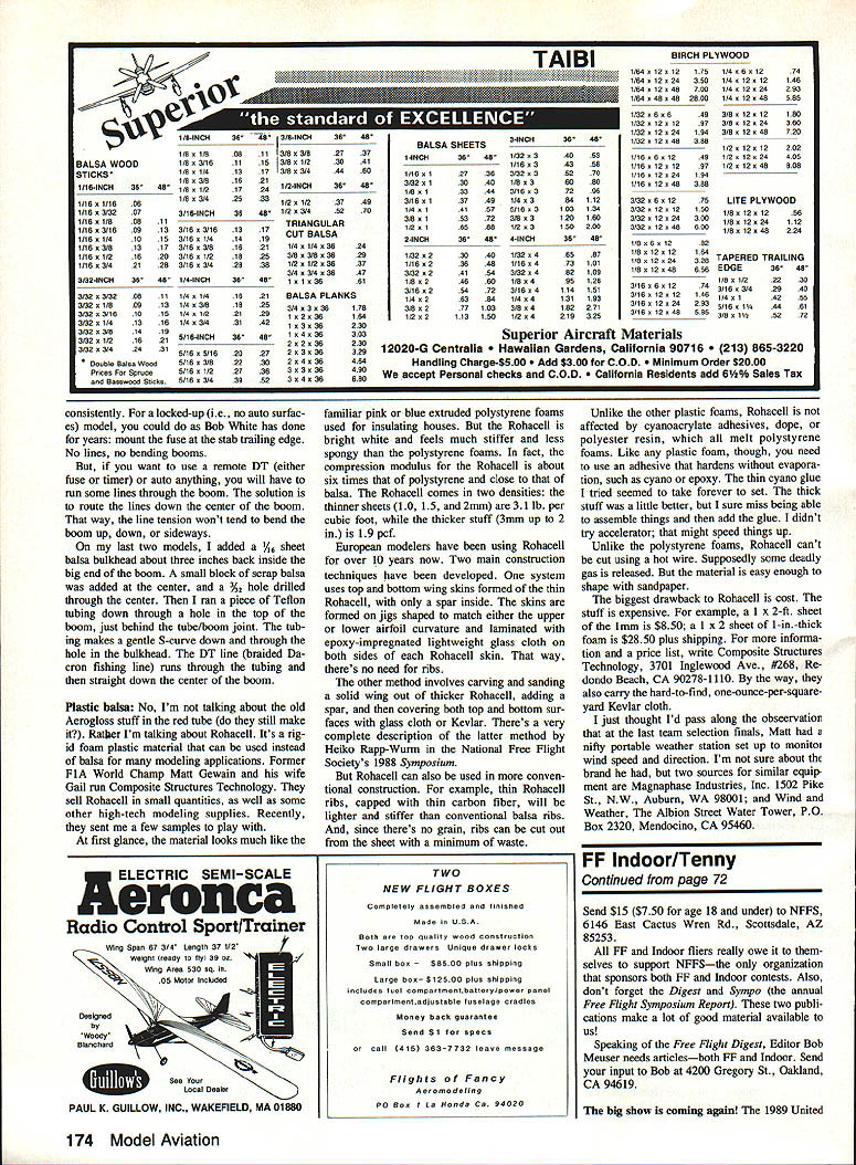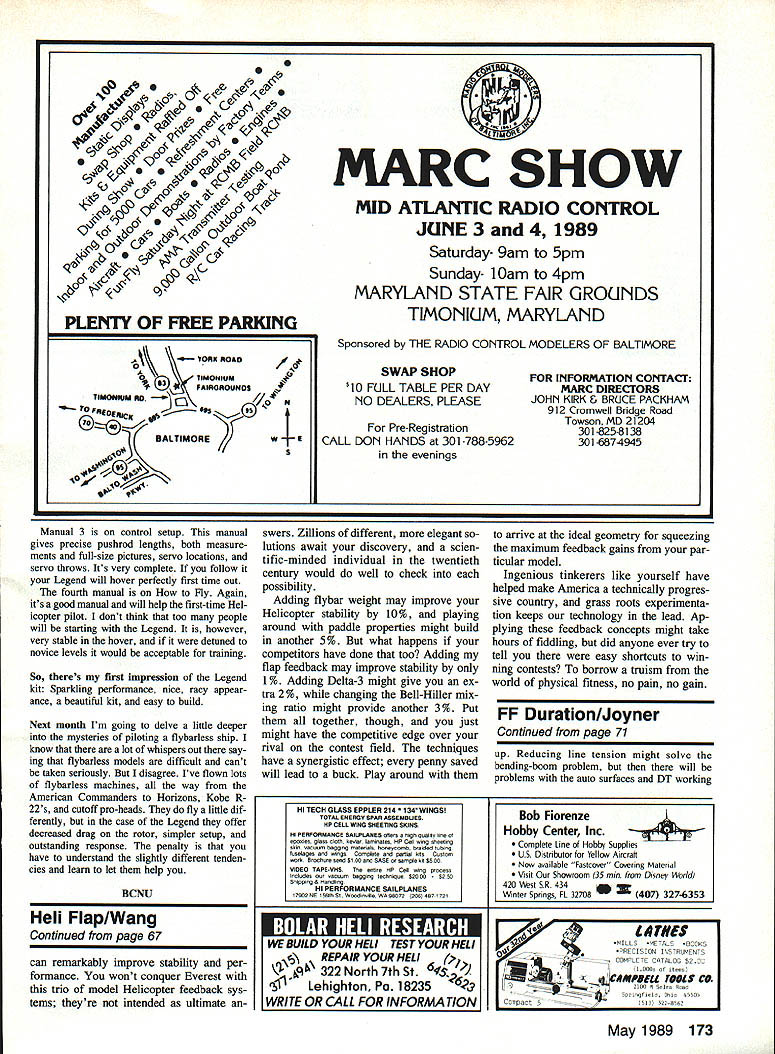 BEEPER BELIEVER feeling familiar anyone has ever flown Free Flighta mix ture joy panic realize model has just maxed Out big thermaland its coming down Thats what feeling got fence about mile downwind annual Pensacola contest last June About time started over fence Jim Bradley pedaled up all-terrain bicycle Jim hopped off bike lifted over fence climbed over pedaled off after Nordic same thermal Wakefield Through small radio receiver Jims hand putting out its static-clouded squawk climbed back truck looped out main gate went driving after Jim Another mile downwind spotted Jims bicycle saw Jim off pasture Neither model sight Jims beeper picking up signal some woods farther downwind headed Brer Rabbit would have felt right home briar patch woods mixed pines hardwoods dense undergrowth bram bles blackberries quite ripe small scanner Jim carrying short whip tenna Jim used body direction finder would hold scanner agalnst chest slowly turn body signal dropped off would about-face head off direction spread out helped him search half hour headed back fly next round Jim stayed search Less hour later Jim pedaled back flight line model Despite several hours searching later afternoon next morning Wake beeper stays bur ied woods Believe next models will have some sort beeper board several com mercial units around Jim Bradley sells individ ual beeper well thats part elec tronic Nordic timer Jim Walston has developed sophisticatedand very lightweighttransmitter receiver directional antenna Gil Morris sells inexpensive transmitter kit Its teresting note folks east Mississippi addresses youd like information Bradley Model Products 1337 Pine Sap Ct Orlando FL 32825 Jim Walston Retrieval Systems 725 Cooper Lake Rd SE Smyrna GA 30080 Gil Morris 2810 Brackicy Rd Columbus OH 43220 Wakefield front ends unit photo graph slick-looking front end Poland Adam Tracy brought back Junior World Championships last sutmner work manship unbelievable looks like piece jewelry model part alumi num parts highly polished look chrome plated balsa nose block spinner finished deep red high-gloss lacquer Besides finish front end incorporates several unusual features bobbin bayonets 70 Model Aviation Free Flight Duration Louis Joyner 3657 Bmokwood Rd Blnnlngham AL 35223 Adam Tracy obtained fabulous Wakefield front end Poland 88 FF Jr World Champs appears production item Maybe some US entrepreneur will import Hooks prop hub rubberbands aid folding blades Info column Also Poland way Arizona aluminum engine mount/front fuselage Randy Archers FiC model Russian-style mechanical timer uses notched disc actuate autosurface functiona stacked-disc scroll dethermalizer actuation Doug Joyces custom fleid box provides preflight nest canard PlC plane Aluminum-skinned wing pops up DT onto rear shaft theres no chance off-center motor causing bobbin wobble hit inside motor tube Instead usual Montreal-style drop pin front end uses pivoting arm thats spring loaded Motor torque holds arm out torque drops off spring swings arm catches notch rim nose block Evidenfly front ends commercially made Lets hope somebody will begin importing drawings limited-production de layed prop release DPR front end Yugoslav ian Wake flier engineer Marjan Klenovsek making Like Russian DPR front end used Andrukov 1981 World Champs units holds propeller blades Out feathered launch After hard vertical launch clock work timer releases line wire arm blades go preset pitch setting begin turn everything works gain height something around 30 ft Note nor variable-pitch VP front end Marjan says tests have shown VP wasnt beneficial DPR DPR front end sells $145 plus postage Marjan also makes light simple reverse-Montreal front end thats $44 plus $4 postage Send payment dol lars check international department local bank sure include both side outside diameters motor tube Marjan can custom-fit front end address Marian Klenovsek Milcinskega 8 63000 Celje Yugoslavia Bending booms Its Catch-22s Free Flight make tail boom light enough wont strong enough After years trying build lightbut stifftail booms Wakefields decided step back take look real problem First question does boom bend Surely aerody namic loads 20% stab What about auto surface DT lines running through boom Thats like Typically control lines enter tail boom top just behind rear motor peg Any tension line will tend bend boom Continued page 173 May 1989 71 Back FF after few years off Ed William son Sarasota FL placed 9th Wake recent team selection finals Sheeted-wing plane has auto-stab rudder twin turbul stars prop blades Ken Denise Phair celebrate Kens 1st FiC Octobers team selection finals also 85 US FAI Power team 0 C5 cQn co LENTY OF FREE PARKING AV SORN ROAD WIMONIUM TIMOffiUM52FAIROROIJNOS lOFAEOEgI TIMOREW S IE MARC SHOW MID ATLANTIC RADIO CONTROL JUNE 3 4 1989 Saturday- 9am 5pm Sunday- Qam 4pm MARYLAND STATE FAIR GROUNDS TIMONIUM MARYLAND Sponsored THE RADIO CONTROL MODELERS OF BALTIMORE SWAP SHOP $10 FULL TABLE PER DAY NO DEALERS PLEASE Pre-Registration CALL DON HANDS 301-788-5962 evenings FOR INFORMATION CONTACT MARC DIRECTORS JOHN KIRK & BRUCE PACKHAM 912 Cromwell Bridge Road Towson MD 21204 301-825-8138 301 -687-4945 Manual 3 control setup manual gives precise pushrod lengths both measure ments full-size pictures servo locations servo throws Its very complete follow Legend will hover perfectly first time out fourth manual Fly Again its good manual will help first-time Hel icopter pilot dont think too people will starting Legend however very stable hover detuned novice levels would acceptable training So theres first impression Legend kit Sparkling performance nice racy appear ance beautiful kit easy build Next month Im going delve little deeper mysteries piloting flybarless ship know lot whispers Out say ing flybarless models difficult cant taken seriously disagree Ive flown lots flybarless machines way American Commanders Horizons Kobe R 22s cutoff pro-heads fly little dif ferently case Legend offer decreased drag ro