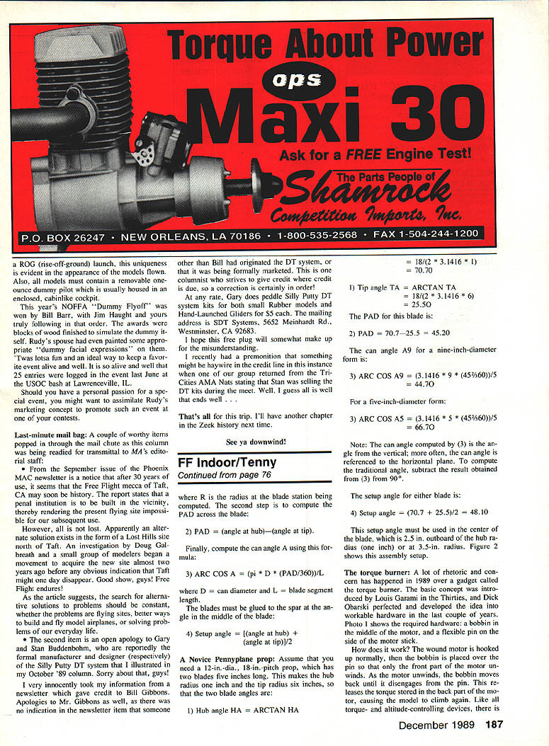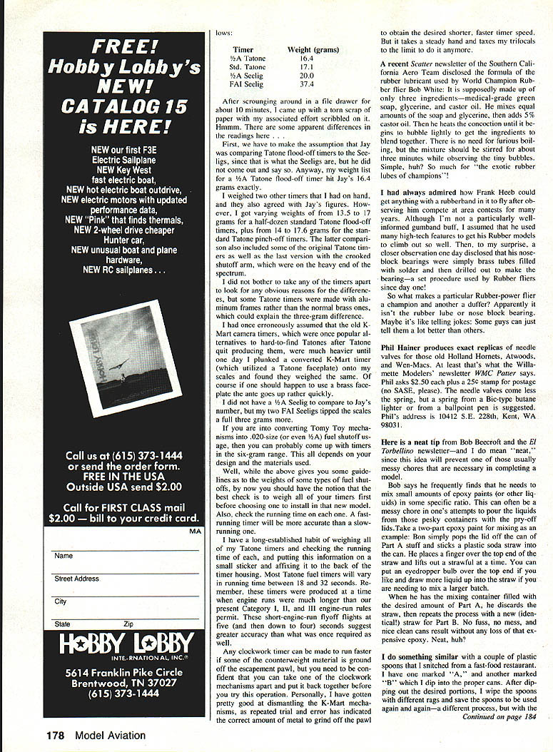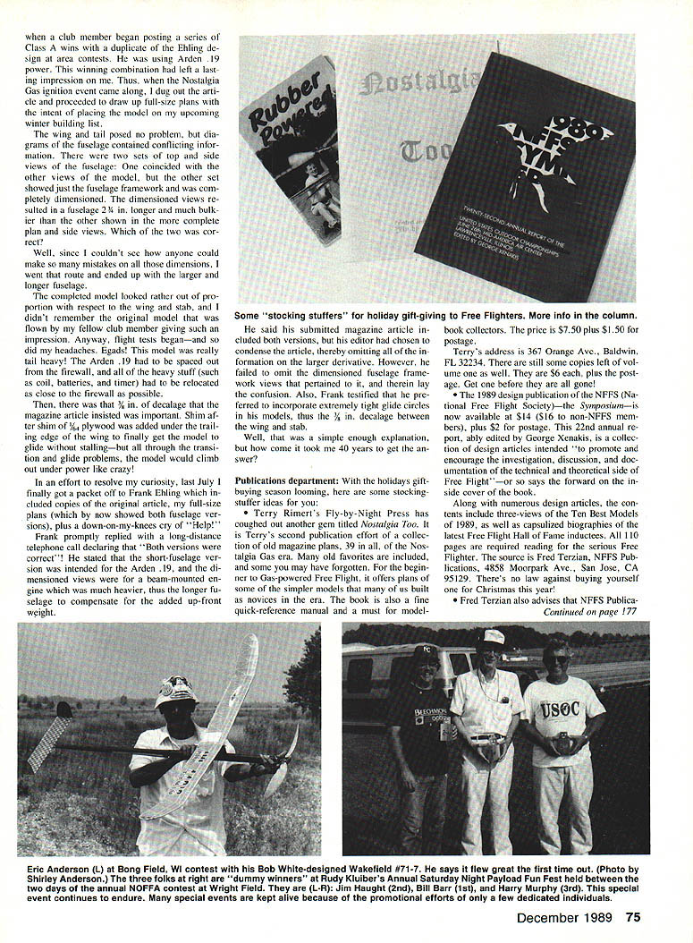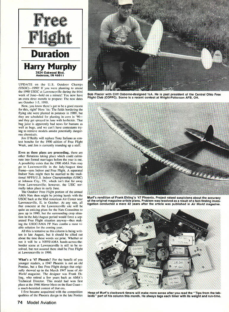 UPDATE US Outdoor Champs USOCl990 planning attend 1990 USOC Lawrenceville during third week Junehold minute now have extra three months prepare new dates October 1-5 1990 Now know theres got good reason right tis fields bordering flying site planted potatoes 1989 scheduled planting corn 90 get sprayed June herbicide bug juice apparently bad news humans well bugs cant have contestants try ing retrieve models amidst potentially danger ous chemicals Jim OReilly will replace Tony Italiano con test honcho 1990 edition Free Flight Week Jim currently rounding up staff plans proceeding other flirtations taking place could culmi nate formal marriages before year out possibility exists 1990 AMA Nats may go Lawrenceville July/August time framesans Indoor Free Flight separated Indoor Nats might married tradi tional NFFS/US Indoor Championships USIC Johnson City TN isnt far away Lawrenceville however USIC nor mally takes place early June Outdoor Free Flight portion annual AMA Nats might joining hands USOC back Mid American Air Center near Lawrenceville IL October rate concrete Lawrenceville site will quite enticing plum Nats Committee pass up 1990 surrounding crop situa tion July/August period would force sep arated Free Flight situation anywaythus mak ing USOC/AMA FF Nats combo vi able solution coming year tentative column being writ ten late August should sifted out about time words see print Whether will NFFS/AMA hands-across-theborder scene Lawrenceville still re solved rest assured shall Free Flight Lawrenceville 1990 Whats 47 Phoenix benefit younger readers 1947 Phoenix old Pontiac fine Free Flight design origi nally showed up March 1947 issue Air World magazine designer Frank Eh ling retired few years back AMAs Technical Director model won first place 1946 Mirror Meet East Coast much-heralded contest era first became acquainted competition qualities Phoenix design late Forties 74 Model Aviation Free Flight Duration Harry Murphy 3924 Oakwood Blvd Anderson IN 46011 Bob Placier Cliff Osborne-designed past president Central Ohio Free Flight Club COFFC Scene recent contest Wright-Patterson AFB OH iviurvs renaution Frank Ehirngs rnoenlx rroject rausca suspicions aDout tne accuracy original magazine-article plans Problem resolved result fact-finding inves tigation conducted mere 42 years after article published Air World magazine Heap Murfs clockwork timers will make sense after read Tips tab loids part column month always tags timer its weight run-time club member began posting series Class wins duplicate Ehling de sign area contests using Arden ower winning combination left last ing impression Thus Nostalgia Gas ignition event came along 1 dug out arti cle proceeded draw up full-size plans intent placing model upcoming winter building list wing tail posed no problem dia grams fuselage contained conflicting infor mation two sets top side views fuselage coincided other views model other set showed just fuselage framework com pletely dimensioned dimensioned views re sulted fuselage 23/s longer much bulk ier other shown complete plan side views Which two cor rect Well since couldnt see anyone could make mistakes dimensions went route ended up larger longer fuselage completed model looked rather out pro portion respect wing stab didnt remember original model flown fellow club member giving such impression Anyway flight tests beganand did headaches Egads model really tail heavy Arden 19 spaced out firewall heavy stuff such coil batteries timer relocated close firewall possible % decalage magazine article insisted important Shim af ter shim 4 plywood added under trail ing edge wing finally get model glide stallingbut through transi tion glide problems model would climb out under power like crazy effort resolve curiosity last July finally got packet off Frank Ehling cluded copies original article full-size plans now showed both fuselage ver sions plus down-on-my-knees cry Help Frank promptly replied long-distance telephone call declaring Both versions correct ed short-fuselage ver sion intended Arden 19 di mensioned views beam-mounted en gine much heavier thus longer fu selage compensate added up-front weight said submitted magazine article cluded both versions editor chosen condense article thereby omitting formation larger derivative However failed omit dimensioned fuselage frame work views pertained therein lay confusion Also Frank testified pre ferred incorporate extremely tight glide circles models thus lage between wing stab Well simple enough explanation come took 40 years get swer Publications department holidays giftbuying season looming some stockingstuffer ideas Terry Rimerts Fly-by-Night Press has coughed out another gem titled Nostalgia Too Terrys second publication effort collec tion old magazine plans 39 Nos talgia Gas era old favorites included some may have forgotten begin ner Gas-powered Free Flight offers plans some simpler models us built novices era book also fine quick-reference manual must modelbook collectors price $750 plus $150 postage Terrys address 367 Orange Ave Baldwin FL 32234 still some copies left vol ume well $6 plus post age Get before gone 1989 design publication NFFS Na tional Free Flight Societythe Symposiumis now available $14 $16 non-NFFS mem bers plus $2 postage 22nd annual re port ably edited George Xenakis collec tion design articles intended promote encourage investigation discussion doc umentation technical theoretical side Free Flight says forward side cover book Along numerous design articles con tents include three-views Ten Best Models 1989 well capsulized biographies latest Free Flight Hall Fame inductees 110 pages required reading serious Free Flighter source Fred Terzian NFFS Pub lications 4858 Moorpark Ave San Jose CA 95129 Theres no law against buying yourself Christmas year Fred Terzian also advises NFFS Publica Continued page 177 Eric Anderson 1 Bong Field WI contest Bob White-designed Wakefield #71-7 says flew great first time out Photo Shirley Ander