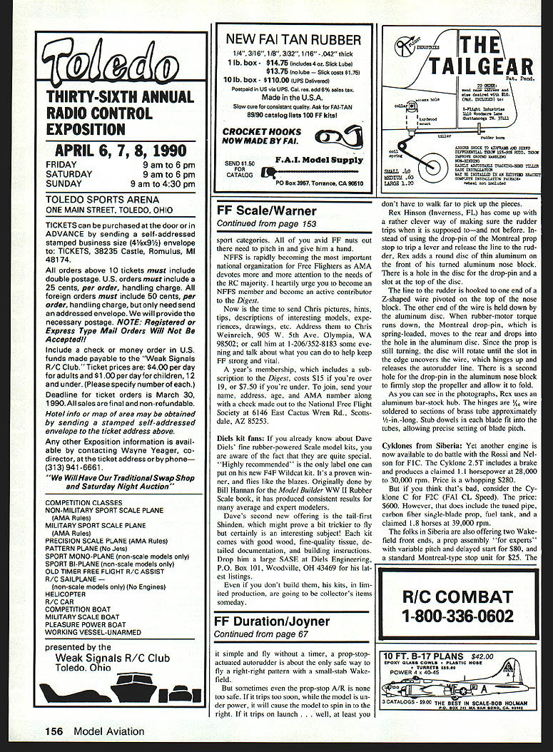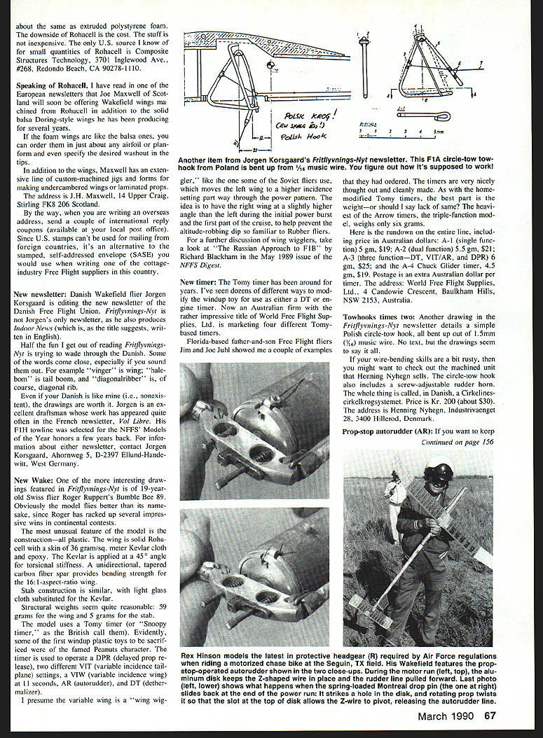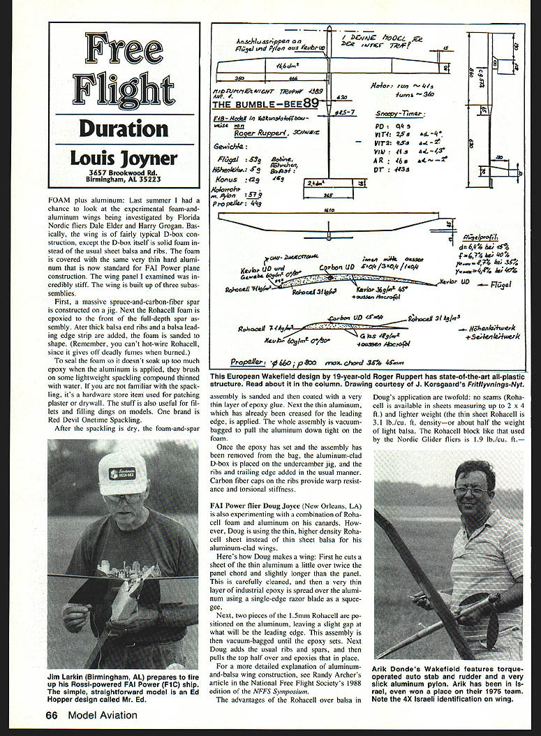 FOAM plus aluminum Last summer chance look experimental foam-andaluminum wings being investigated Florida Nordic fliers Dale Elder Harry Grogan Bas ically wing fairly typical D-box con struction except D-box itself solid foam stead usual sheet balsa ribs foam covered same very thin hard alumi num now standard FAI Power plane construction wing panel examined credibly stiff wing built up three subas semblies First massive spruce-and-carbon-fiber spar constructed jig Next Rohacell foam epoxied front full-depth spar sembly Ater thick balsa end ribs balsa lead ing edge strip added foam sanded shape Remember cant hot-wire Rohacell since gives off deadly fumes burned seal foam doesnt soak up too much epoxy aluminum applied brush some lightweight spackling compound thinned water familiar spack ling its hardware store item used patching plaster drywall stuff also useful fil lets filling dings models brand Red Devil Onetime Spackling After spackling dry foam-and-spar Anschlussrppen 7gj d P1Ioi us fewbpt AAL 1DflJV/6t 4/6#T mophv 489 AM BUMBLEBEE89 riB MatkI Iq *U4wsstskffhau tAsa r RuppeA en us 429 dWAbfl S~ propeJId 44g S K /YoOCL e4or u, ES7 PD O4s yin 2/s VIT2 Js 41-s AR 46s 4JSS d44% & eI H5hEf/0we-k Sek,leJ4wezk Pr-opdaa p id 3A6 *j089 European Wakefield design 19-year-old Roger Ruppert has state-of-the-art all-plastic structure Read about column Drawing courtesy J Korsgaards Frittlyvnings-Nyt assembly sanded coated very thin layer epoxy glue Next thin aluminum has already creased leading edge applied whole assembly vacuumbagged pull aluminum down tight foam Once epoxy has set assembly has removed bag aluminum-clad D-box placed undercamber jig ribs trailing edge added usual manner Carbon fiber caps ribs provide warp resist ance torsional stiffness FAI Power flier Doug Joyce New Orleans LA also experimenting combination Roha cell foam aluminum canards ever Doug using thin higher density Roha cell sheet instead thin sheet balsa aluminum-clad wings Heres Doug makes wing First cuts sheet thin aluminum little over twice panel chord slightly longer panel carefully cleaned very thin layer industrial epoxy spread over alumi num using single-edge razor blade squee gee Next two pieces 15mm Rohacell po sitioned aluminum leaving slight gap what will leading edge assembly vacuum-bagged until epoxy sets Next Doug adds usual ribs spars pulls top half over epoxies place detailed explanation aluminumand-balsa wing construction see Randy Archers article National Free Flight Societys 1988 edition NFFS Symposium advantages Rohacell over balsa Dougs application twofold no seams Roha cell available sheets measuring up 2 x 4 ft lighter weight thin sheet Rohacell 31 lb/cu ft densityor about half weight light balsa Rohacell block like used Nordic Glider fliers 19 lb/cu ft 66 Model Aviation Free Flight Duration Louis Joyner 3657 Drookwood Rd Birmingham AL 35223 Ad 4 j 4---W7 Dk uCerbon UD s4 /3504 /sq4 Rot OAEJI RchocdSIgAsKevkrJgA 45 zai Agv&b &fIm oAc4OLE Jim Larkin Birmingham AL prepares fire up Rossi-powered FAI Power FiC ship simple straightforward model Ed Hopper design called Mr Ed Arik Dondes Wakefield features torqueoperated auto stab rudder very slick aluminum pylon Arik has rael won place 1975 team Note 4X Israeli identification wing about same extruded polystyrene foam downside Rohacell cost stuff inexpensive US source know small quantities Rohacell Composite Structures Technology 3701 Inglewood Ave #268 Redondo Beach CA 90278-1110 Speaking Rohacell have read European newsletters Joe Maxwell Scot land will soon offering Wakefield wings ma chined Rohacell addition solid balsa Doring-style wings has producing several years foam wings like balsa ones can order just about airfoil planform specify desired washout tips addition wings Maxwell has exten sive line custom-machined jigs forms making undercambered wings laminated props address JH Maxwell 14 Upper Craig Stirling FK8 206 Scotland way writing overseas address send couple international reply coupons available local post office Since US stamps cant used mailing foreign countries its alternative stamped self-addressed envelope SASE would use writing cottageindustry Free Flight suppliers country New newsletter Danish Wakefield flier Jorgen Korsgaard editing new newsletter Danish Free Flight Union Frirflyvnings-Nyr Jorgens newsletter also produces Indoor News title suggests writ ten English Half fun get out reading Frirflyvnings Nyr trying wade through Danish Some words come close especially sound out example vinger wing hale bom tail boom diagonalribber course diagonal rib Danish like ie nonexis tent drawings worth Jorgen ex cellent draftsman work has appeared quite often French newsletter Vol Libre FIH towline selected NFFS Models Year honors few years back infor mation about either newsletter contact Jorgen Korsgaard Ahornweg 5 D-2397 Ellund-Hande witt West Germany New Wake interesting draw ings featured Frirflyvnings-Nyt 19-yearold Swiss flier Roger Rupperts Bumble Bee 89 Obviously model flies better its name sake since Roger has racked up several impres sive wins continental contests unusual feature model constructionall plastic wing solid Roha cell skin 36 gram/sq meter Kevlar cloth epoxy Kevlar applied 450 angle torsional stiffness unidirectional tapered carbon fiber spar provides bending strength 161-aspect-ratio wing Stab construction similar light glass cloth substituted Kevlar Structural weights seem quite reasonable 59 grams wing 5 grams stab model uses Tomy timer py timer British call Evidently some first windup plastic toys sacrif iced famed Peanuts character timer used operate DPR delayed prop re lease two different VIT variable incidence tailplane settings VIW variable incidence wing II seconds AR autorudder DT dether malizer presume variable wing wing wigfi /Q2 II II fl Refe 9cUs~ MooiZ II 234Sn gler like some Soviet fliers use moves left wing higher incidence setting part way through power pattern idea have right wing slightly higher angle l