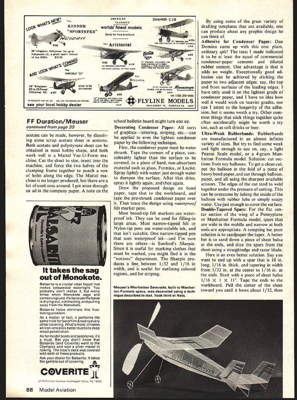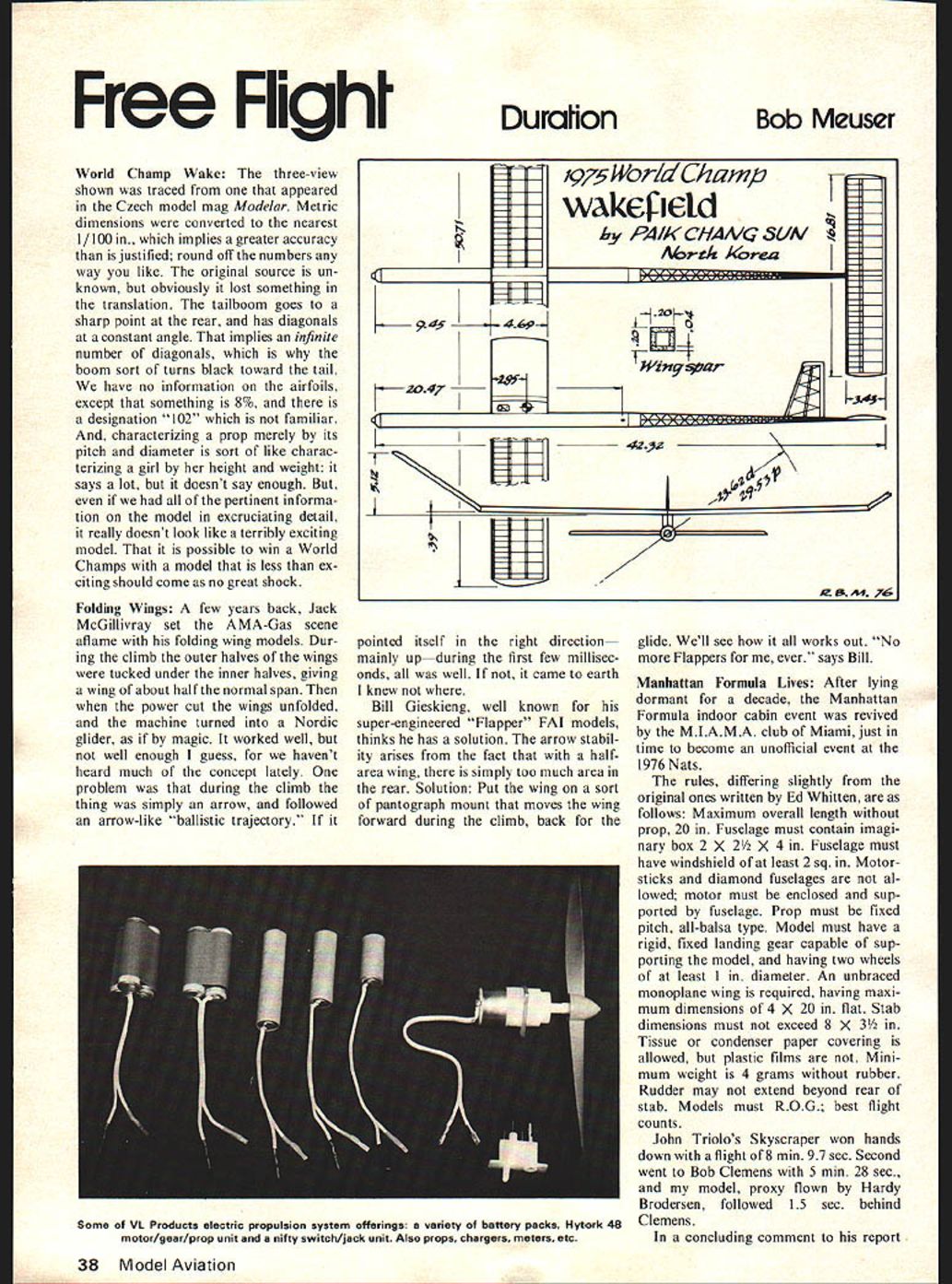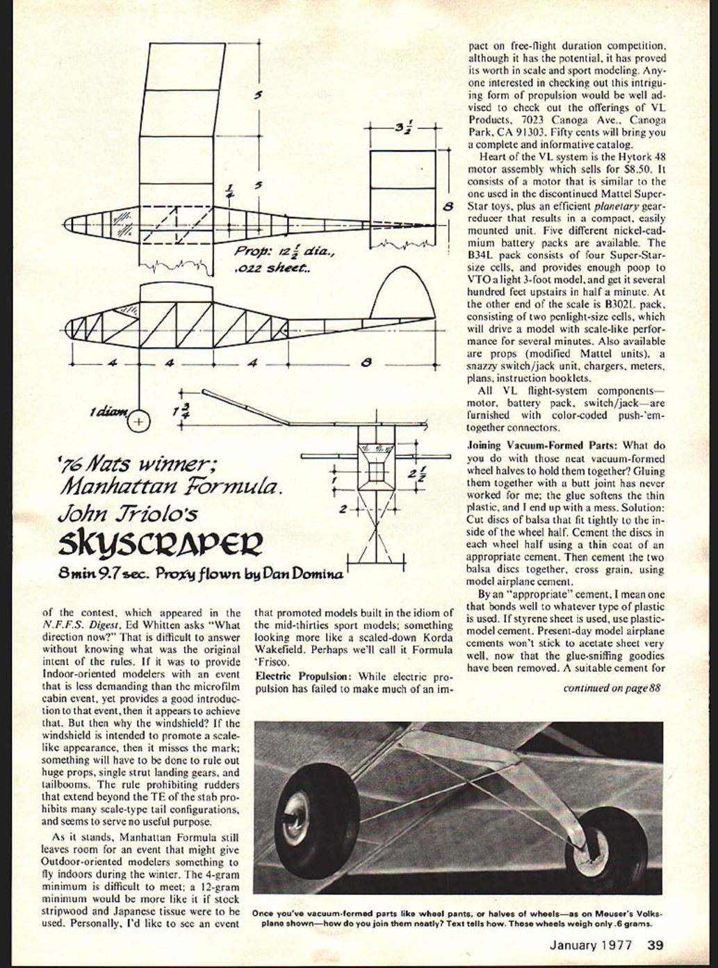 Free Flight Durallon Bob Meuser World Champ Wake three-view shown traced appeared Czech model mag Modelar Metric dimensions converted nearest 1/100 implies greater accuracy justified round off numbers way like original source un known obviously lost something translation tailboom goes sharp point rear has diagonals constant angle implies infinite number diagonals boom sort turns black toward tail have no information airfoils except something 8% designation 102 familiar characterizing prop merely its pitch diameter sort like charac terizing girl height weight says lot doesnt say enough pertinent informa tion model excruciating detail really doesnt look like terribly exciting model possible win World Champs model less ex citing should come no great shock Folding Wings few years back Jack McGillivray set AMA-Gas scene aflame folding wing models Dur ing climb outer halves wings tucked under inner halves giving wing about half normal span power cut wings unfolded machine turned Nordic glider magic worked well well enough guess havent heard much concept lately problem during climb thing simply arrow followed arrow-like ballistic trajectory ZZ~LrFm 2047 II2~ 1 q pointed itself right direction mainly upduring first few millisec onds well came earth knew Bill Gieskieng well known super-engineered Flapper FAI models thinks has solution arrow stabil ity arises fact halfarea wing simply too much area rear Solution Put wing sort pantograph mount moves wing forward during climb back glide Well see works out No Flappers ever says Bill Manhattan Formula Lives After lying dormant decade Manhattan Formula indoor cabin event revived MIAMA club Miami just time become unofficial event 1976 Nats rules differing slightly original ones written Ed Whitten follows Maximum overall length prop 20 Fuselage must contain imagi nary box 2 X 2 X 4 Fuselage must have windshield least 2 sq Motorsticks diamond fuselages al lowed motor must enclosed sup ported fuselage Prop must fixed pitch all-balsa type Model must have rigid fixed landing gear capable sup porting model having two wheels least diameter An unbraced monoplane wing required having maxi mum dimensions 4 X 20 flat Stab dimensions must exceed 8 X 3 Tissue condenser paper covering allowed plastic films Mini mum weight 4 grams rubber Rudder may extend beyond rear stab Models must ROG best flight counts John Triolos Skyscraper won hands down flight 8 mm 97 sec Second went Bob Clemens 5 mm 28 sec model proxy flown Hardy Brodersen followed 15 sec behind Clemens concluding comment report 38 Model Aviation 1975 World Champ wakE4Ield PA/K C/IAVQ SUM Abrek 14rea ________ R 0 A-I 76 Some VI Products electric propulsion system offerings variety battery packs Hytork 48 motor/gear/prop unit nifty switch/jack unit Also props chargers meters etc 5 rfl L4 dhzu Liz / I / I 1 5 -I- Ii Prop 4 dia 022 shece 48 _ 6iYats wrner JtwiAattan Fcrmtda /ohn Trio/os SkySCQAPEQ 8mm 97sec Pn~j flown Domuia contest appeared NFFS Digest Ed Whitten asks What direction now difficult answer knowing what original intent rules provide Indoor-oriented modelers event less demanding microfilm cabin event yet provides good introduc tion event appears achieve windshield windshield intended promote scalelike appearance misses mark something will have done rule out huge props single strut landing gears tailbooms rule prohibiting rudders extend beyond TE stab pro hibits scale-type tail configurations seems serve no useful purpose As stands Manhattan Formula still leaves room event might give Outdoor-oriented modelers something fly indoors during winter 4-gram minimum difficult meet 12-gram minimum would like stock stripwood Japanese tissue used Personally Id like see event promoted models built idiom mid-thirties sport models something looking like scaled-down Korda Wakefield Perhaps well call Formula Frisco Electric Propulsion electric pro pulsion has failed make much im pact free-flight duration competition although has potential has proved its worth scale sport modeling Any interested checking out intrigu ing form propulsion would well ad vised check out offerings VL Products 7023 Canoga Ave Canoga CA 91303 Fifty cents will bring Park complete informative catalog Heart VL system Hytork 48 motor assembly sells $850 consists motor similar used discontinued Mattel Super8Star toys plus efficient planetary gear reducer results compact easily mounted unit Five different nickel-cad mium battery packs available B34L pack consists four Super-Starsize cells provides enough poop VTO light 3-foot model get several hundred feet upstairs half minute other end scale B302L pack consisting two penlight-size cells will drive model scale-like perfor mance several minutes Also available props modified Mattel units snazzy switch/jack unit chargers meters plans instruction booklets VL flight-system components motor battery pack switch/jack furnished color-coded push-em together connectors Joining Vacuum-Formed Parts What neat vacuum-formed wheel halves hold together Gluing together butt joint has never worked glue softens thin plastic end up mess Solution Cut discs balsa fit tightly side wheel half Cement discs wheel half using thin coat appropriate cement cement two balsa discs together cross grain using model airplane cement appropriate cement mean bonds well whatever type plastic used styrene sheet used use plasticmodel cement Present-day model airplane cements won t stick acetate sheet very well now glue-sniffing goodies have removed suitable cement continued page 88 January 1977 39 Once youve vacuum-formed parts like wheel pants halves wheelsas Mousers Volks plane shownhow join neatly Text tells wheels weigh 6 grams Th KINNER SPORTSTER 39 weEgopon 049 power nop 3 channels 0/c gleot Sport trainer 19300Sf295 49 Wingopon e fl9 to25 PowerOflUOORCCd 3Channet 9/C *107 VA REORARTS*Rc400RXAOE 0% ron rACKING 000 0050000 see local hobby dealer FF Duration/Meuser continued page 39 acetate can made however dissolv ing some scrap acet