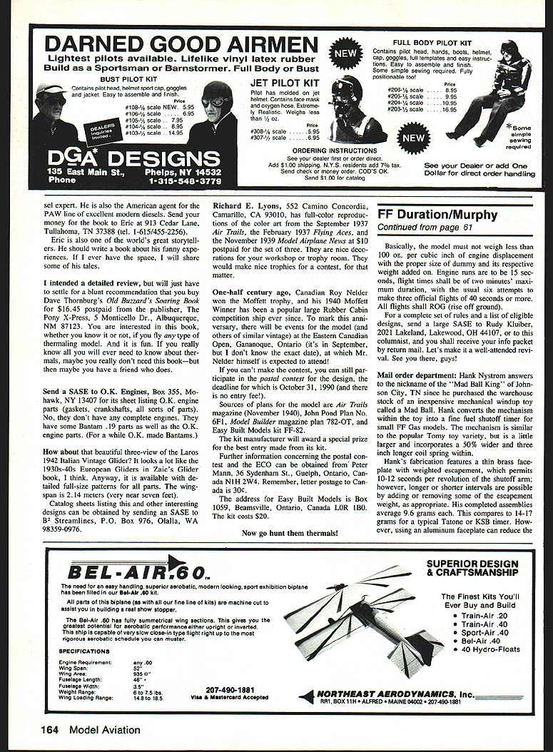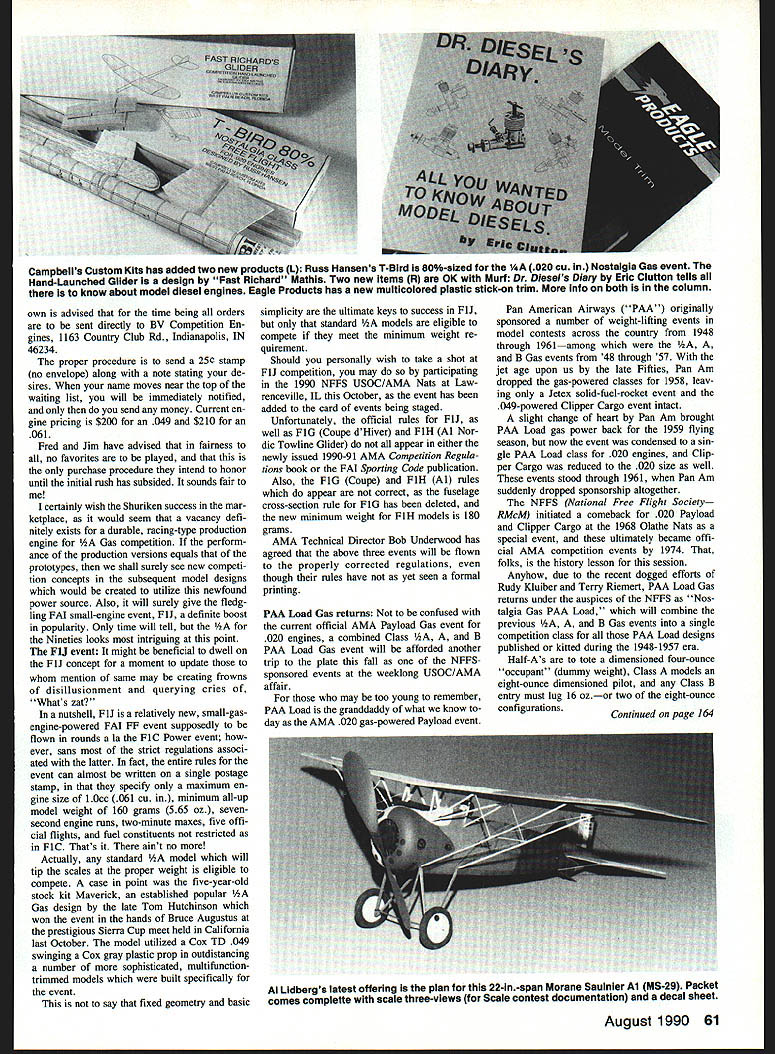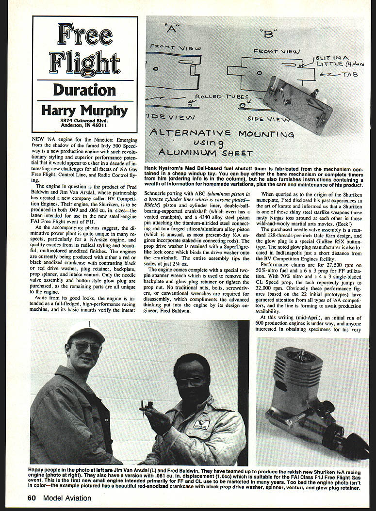 NEW engine Nineties Emerging shadow famed Indy 500 Speed way new production engine such revolu tionary styling superior performance poten tial would appear usher decade teresting new challenges facets AA Gas Free Flight Control Line Radio Control fly ing engine question product Fred Baldwin Jim Van Arsdal partnership has created new company called Competi tion Engines engine Shuriken produced both 049 061 cu sizesthe latter intended use new small-engine FAI Free Flight event FIJ As accompanying photos suggest di minutive power plant quite unique re spects particularly A-size engine quality exudes its radical styling beauti ful multicolored anodized finishes engines currently being produced either red black anodized crankcase contrasting black red drive washer plug retainer backplate prop spinner intake venturi Only needle valve assembly button-style glow plug purchased remaining parts unique engine Aside its good looks engine tended full-fledged high-performance racing machine its basic innards veri intent Schnuerle porting ABC aluminum piston bronze cylinder liner chrome plated RMcM piston cylinder liner double-ballbearing-supported crankshaft has vented crankpin 4340 alloy steel piston pin attaching titanium-nitrided steel connect ing rod forged siliconlaluminum alloy piston unusual present-day en gines incorporate staked-in connecting rods prop drive washer retained SuperTigre like lock cone binds drive washer onto crankshaft entire assembly tips scales just 214 oz engine comes complete special twopin spanner wrench used remove backplate glow plug retainer tighten prop nut No traditional nuts bolts screwdriv ers conventional wrenches required disassembly compliments advanced thinking put engine its design en gineer Fred Baldwin queried origin Shuriken nameplate Fred disclosed past experiences art karate informed us Shuriken shiny steel starlike weapons nasty Ninjas toss around other wild-and-wooly martial arts movies Eeek purchased needle valve assembly stan dard 128-threads-per-inch Dale Kim design glow plug special GloBee R5X buttontype noted glow plug manufacturer also lo cated Indianapolis just short distance BV Competition Engines facility Performance claims 27500 rpm 50%-nitro fuel 6 x 3 prop FF utiliza tion 70% nitro 4 x 3 single-bladed CL Speed prop tach reportedly jumps 32000 rpm Obviously performance fig ures based 22 initial prototypes have garnered attention types competi tors line forming await production availability writing mid-April initial run 600 production engines under way anyone interested obtaining specimens very 60 Model Aviation Free Flight Duration Harry Murphy 3824 Oakwood Blvd Aaderson IN 46011 Hank Nystroms Mad Ball-based fuel shutoff timer fabricated mechanism con tained cheap windup toys can buy either bare mechanism complete timers him ordering Info column also furnishes instructions containing wealth information homemade variations plus care maintenance product Happy people photo left Jim Van Aradal U Fred Baldwin have teamed up produce rakish new Shuriken V2A racing engine photo right also have version 061 cu displacement 10cc suitable FAI Class F1J Free Flight Gas event first new small engine Intended primarily FF CL use marketed years Too bad engine photo Isnt colorthe example pictured has beautiful red-anodized crankcase black prop drive washer spinner venturi glow plug retainer Campbells Custom Kits has added two new products L Russ Hansens T-Bird 80%-sized 020 Cu Nostalgia Gas event Hand-Launched Glider design Fast Richard Mathis Two new Items R OK Mur Dr Diesels Diary Eric Clutton tells eli know about modei diesei engines Eagle Products has new multicolored plastic stick-on trim Info both column own advised time being orders sent directly BV Competition En gines 1163 Country Club Rd Indianapolis IN 46234 proper procedure send 25 stamp no envelope along note stating de sires name moves near top waiting list will immediately notified send money Current en gine pricing $200 049 $210 061 Fred Jim have advised fairness no favorites played purchase procedure intend honor until initial rush has subsided sounds fair certainly wish Shuriken success mar ketplace would seem vacancy defi nitely exists durable racing-type production engine Gas competition perform ance production versions equals prototypes shall surely see new competi tion concepts subsequent model designs would created utilize newfound power source Also will surely give fledg ling FAT small-engine event FTJ definite boost popularity Only time will tell the Nineties looks intriguing point F1J event might beneficial dwell F IJ concept moment update mention same may creating frowns disillusionment querying cries Whats zat nutshell FlJ relatively new small-gasengine-powered FAI FF event supposedly flown rounds Ia FiC Power event ever sans strict regulations associ ated latter fact entire rules event can almost written single postage stamp specify maximum en gine size 10cc 061 cu minimum all-up model weight 160 grams 565 oz sevensecond engine runs two-minute maxes five offi cial flights fuel constituents restricted FTC Thats aint no Actually standard model will tip scales proper weight eligible compete case point five-year-old stock kit Maverick established popular /ZA Gas design late Tom Hutchinson won event hands Bruce Augustus prestigious Sierra Cup meet held California last October model utilized Cox TD 049 swinging Cox gray plastic prop outdistancing number sophisticated multifunction trimmed models built specifically event say fixed geometry basic simplicity ultimate keys success F1J standard models eligible compete meet minimum weight re quirement Should personally wish take shot F1J competition may participating 1990 NFFS USOC/AMA Nats Law renceville IL October event has added card events being staged Unfortunately official rules FTJ well FiG Coupe dHiver F1H AT Nor dic Towline Glider appear either newly issued 1990-91 AMA Competition Regula tions book FAT Sporting Code publication Also FT
