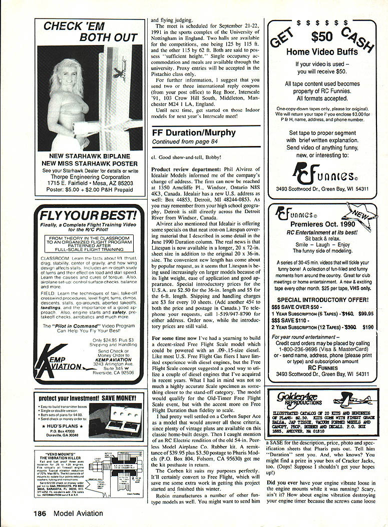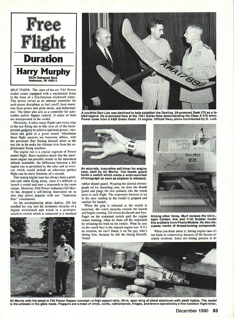 SELF-TIMER The state-of-the-art FAI Power model comes equipped mechanical brain form five-function clockwork timer device serves onboard controller such preset disciplines fuel cutoff bunt transi tion power glide mode dethermal izer timer also acts controller autorudder and/or flapper control either both incorporated model Obviously takes flights trips test flying site fine tune incor porated gadgetry achieve optimum power tran sition glide given model Oftentimes flight sessions lonesome affairs persistent flier finding himself alone test site seeks ultimate trim phisticated flying machine engine run crucial segment Power model flight Since modelers know maxi mum engine run possible results maximum altitude attainable difference between full engine run permitted rules over run would default otherwise perfect flight can mere fractions second Fine tuning engine runs has always prob lem task flying alone since its difficult launch model start stopwatch same instant However FAI Power enthusiast Gil Mor ris has dropped self-timing innovation us may prove popular lonesome flier constituents As accompanying photo depicts Gil has needled way miniature circuitry digital wristwatch wired pressure sensitive switch contained standard rubber thumb guard Wearing altered chrono graph launching arm dons thumb guard plugs two contacts watch prior flight stopwatch function set zero reading model gripped readied launch grip released model launched watch instantly records launch begins running Gil closes thumb fore finger contained switch until engine ceases running shuts off stopwatch releasing hold switch What sees watch face elapsed engine run its overrun cant blame guy whos timing him because did timing himself Neato think about timing engine runs ten leads controversy because human el ement involved Since timing process inDecember 1990 83 Free Flight Duration Harry Murphy 3824 Oakwood Blvd Anderson IN 46011 youthful Dan Lutz destined help establish Dooling 29-powered Zeek 575 fa bled legend pictured 1951 Dallas Nets demonstrating Class 575 entry Power came K&B Green Head 19 engine Official Navy photo contributed D Lutz An accurate innovative self-timer engine runs built Gil Morris thumb guard holds switch starts wrist-mounted chronograph soon airplane released Among other items Murf reviews 54-inspan Corben Ace P-30 Rubber model kits available Pharis Models also die cusses merits thread-locking compounds Gil Morris latest FAI Power flapper concepta high aspect ratio 95-in span wing sheet aluminum small tipiets model ultimate glide mode Flappers maze wires cords rubberbands hinges end levers operated five-function flight timer 64625 825189375 -1 8375 FTg1 - Ii E 31 4 1 5A25jL~ -F -IL 10875 3925 20Balance 65% 1~~ 325 875 rFr 3 K 29 75 7It--- 74375 II I H2jFT III IIIIIIj III III _ _ -L 4375 5625f3125 Np25K875 ZEEK 515 Lew Mahieu Bill Cranford last derivative Zeek series 575 ThIs version B/C class model fiat-bottomed airfoil 575 sq never marketed kit plans Murphy finally found copy plans New England 35 years continent away originated fluenced quickness accuracy sight hearing second individual qualifica tions efficiency often knows nothing about flier has little no control over selftiming system Gil has created could least give flier basis argument situations could interpreted close calls Gils mechanism doesnt eliminate human unpredicta bility shutting off stopwatch end engine run does approach ultimate starting watch because can little doubt end flight launch watch activation simultaneous Gil stopped return Bong FAI invitational July coaxed new much-flown 95-in -span Nelson-powered flapper out car trunk take some pho tographs Trying understand le vers springs rubberbands lines etc model function mind-boggling cant argue results As submit column editor just three short weeks USA team fi nals Lost Hills CA Gil will join others seeking membership 91 FAI Power team Good luck alland thanks Gil permitting us peek latest innova tion Hey guys getting closer electronic flight timer innovation John Oldenkamp sent pho tos Bob Beecrofts ingenious P-30 design model has 122 sq wing area rolled tube fuselage covered bright red cellophane wrapping material using 3M 77 spray adhesive Skywrap also attached 3M 77 deco rates relatively dinky tail surfaces Beecrofts ship uses Czech prop FAI Model Supply also incorporates wing DT wing rather stab pops up supposedly guarantees trustworthy descent out strong thermals light weight models wing itself sports self turbulating Goldberg Goot 193 airfoil red Peck-Polymers brand tissue applied Aero dyne dope Hows innovative mix coverings adhesives various parts single model special note plug-in tail boom connec tion Its lathe-turned hardware store PVC sprinkler pipe weighs gram All-up weight model itself 42 grams Naturally airplane claimed have straight-up climb flat glide What could ask rate Beecrofts pas tiche design features results very neat modContinued page 186 Bob Beecroff 122-sq-in CACA BOX P-30 design unique plug-In tall uses pipe connector made PVC Photo J Oldenkamp 84 Model Aviation CHECK EM BOTH OUT FLY YOUR BEST Finally Complete Flight Training Video R/C Piloti FROM THEORY IN THE CLASSROOM TO ORGANIZED FLIGHT PROGRAM PATTERNED AFTER FULL-SCALE FLIGHT TRAINING CLASSROOM Learn foctn about lift thrust drag Stability center gravity now wing design affects Stalls Includes in-depth siudy turns effect load stall speed Learn causes cures torque Also airplane set-up control surface checks ha ance FIELD Learn toe techniques taxi take-off crosswind procedures level flight turns climbs descents stalls go arounds aborted takeoffs landings toe importance good up proaco Also engine starts safety pre takeoff checks aerobatics much Pilot Command Video Program Can Help Fly Bestt Only $2495 Plus $3 Shipping Handling Send Check Money Ordxr KEMP AVIATION 3243 Arlington Ave - Suite 345 w Riverside CA 92506 IIIATIrsA protect Investment SAVE MONEY Easy build Iransonster boxes Singie doubte version 