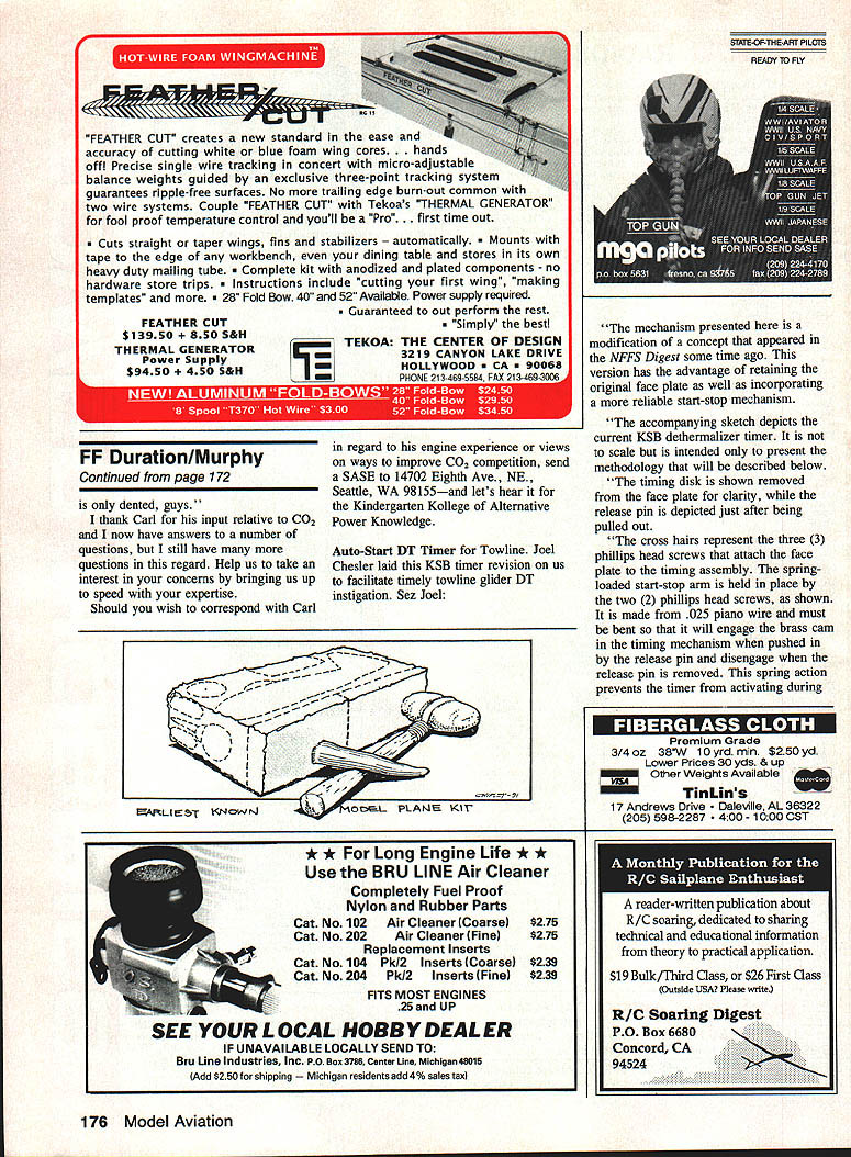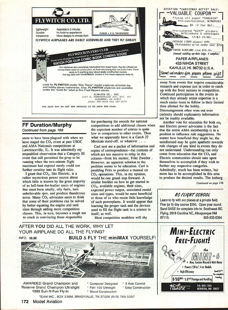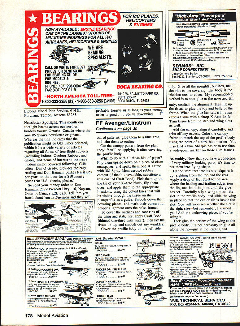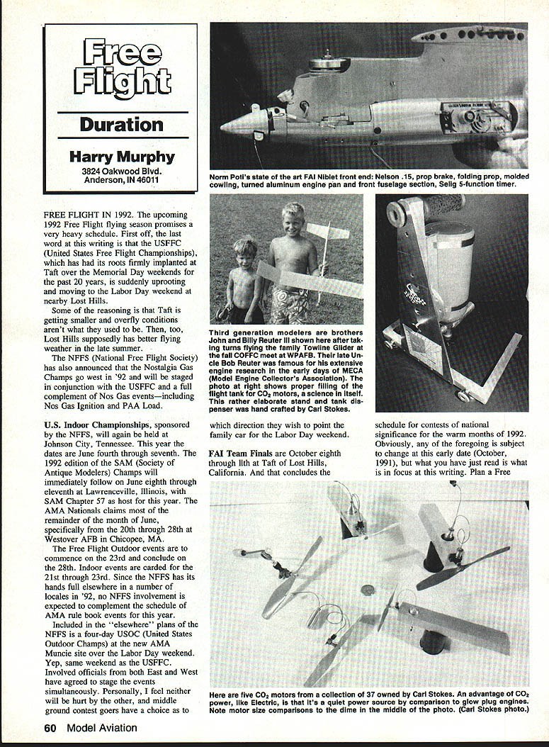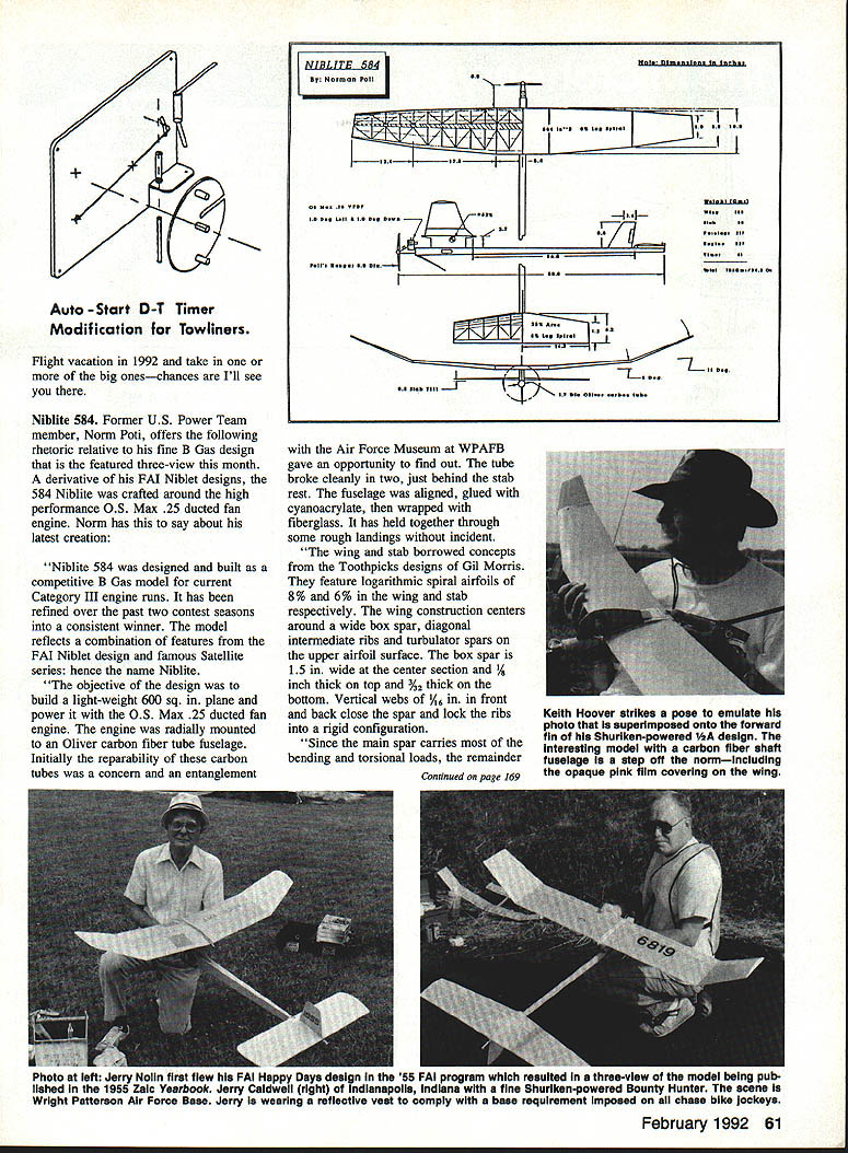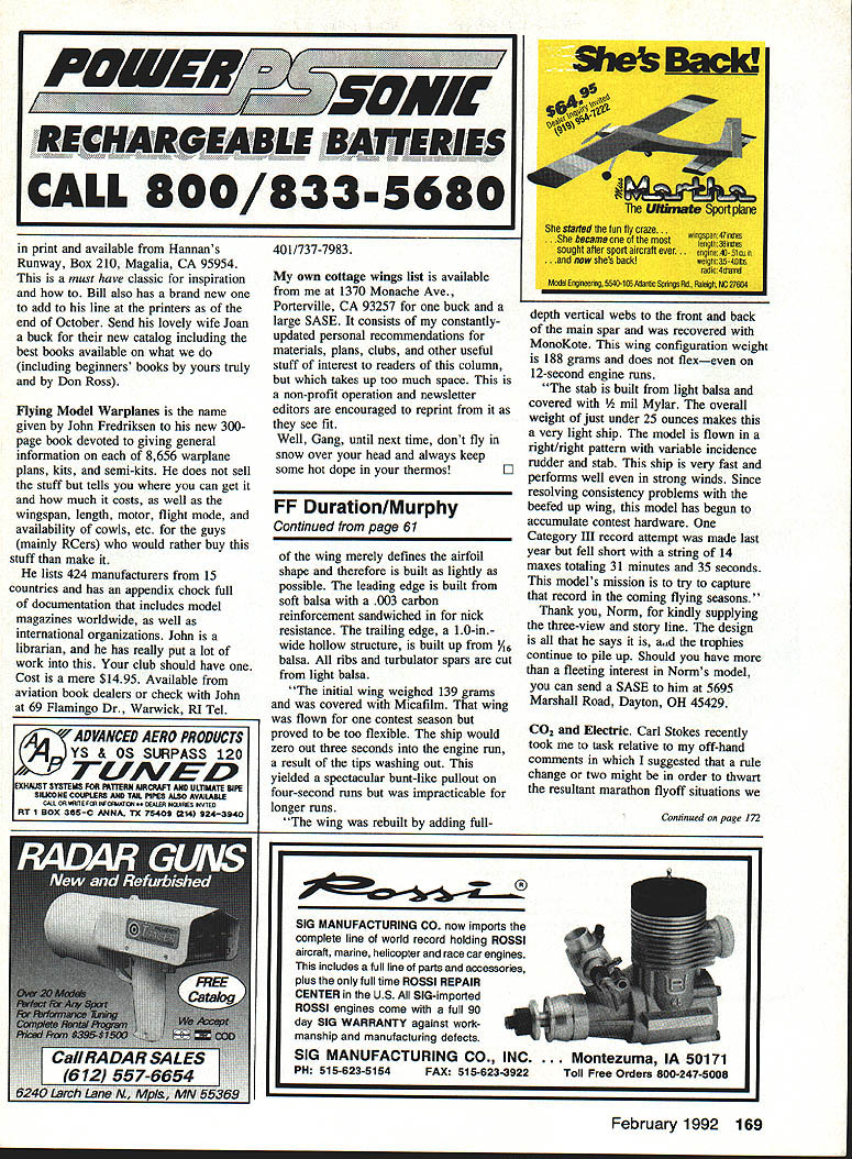 FREE FLIGHT IN 1992 upcoming 1992 Free Flight flying season promises very heavy schedule First off last word writing USFFC United States Free Flight Championships has its roots firmly implanted Taft over Memorial Day weekends past 20 years suddenly uprooting moving Labor Day weekend nearby Lost Hills Some reasoning Taft getting smaller overfly conditions arent what used too Lost Hills supposedly has better flying weather late summer NFFS National Free Flight Society has also announced Nostalgia Gas Champs go west 92 will staged conjunction USFFC full complement Nos Gas eventsincluding Nos Gas Ignition PAA Load US Indoor Championships sponsored NFFS will again held Johnson City Tennessee year dates June fourth through seventh 1992 edition SAM Society Antique Modelers Champs will immediately follow June eighth through eleventh Lawrenceville Illinois SAM Chapter 57 host year AMA Nationals claims remainder month June specifically 20th through 28th Westover AFB Chicopee MA Free Flight Outdoor events commence 23rd conclude 28th Indoor events carded 21st through 23rd Since NFFS has its hands full elsewhere number locales 92 no NFFS involvement expected complement schedule AMA rule book events year Included elsewhere plans NFFS four-day USOC United States Outdoor Champs new AMA Muncie site over Labor Day weekend Yep same weekend USFFC Involved officials both East West have agreed stage events simultaneously Personally feel neither will hurt other middle ground contest goers have choice direction wish point family car Labor Day weekend FM Team Finals October eighth through 11th Taft Lost Hills California concludes schedule contests national significance warm months 1992 Obviously foregoing subject change early date October 1991 what have just read what focus writing Plan Free 60 Model Aviation Duration Harry Murphy 3824 Oakwood Blvd Anderson IN 46011 Norm Potis state art FAI Nibiet front end Nelson 15 prop brake folding prop molded cowling turned aluminum engine pan front fuselage section SelIg 5-function timer Third generation modelers brothers John Blily Reuter lii shown after tak ing turns flying family Towline Glider fail COFFC meet WPAFB late Un cle Bob Reuter famous extensive engine research eariy days MECA Model Engine Collectors Association photo right shows proper fliling flight tank CO2 motors science itself rather elaborate stand tank dis penser hand crafted Carl Stokes live CO2 motors collection 37 owned arI STokes An advantage CO2 power like Electric Its quiet power source comparison glow plug engines Note motor size comparisons dime middle photo Carl Stokes photo I H Auto -Start D-T Timer ModiFication Towliners Flight vacation 1992 take big oneschances Ill see Niblite 584 Former US Power Team member Norm Poti offers following rhetoric relative fine B Gas design featured three-view month derivative FM Niblet designs 584 Niblite crafted around high performance 05 Max 25 ducted fan engine Norm has say about latest creation Niblite 584 designed built competitive B Gas model current Category HI engine runs has refined over past two contest seasons consistent winner model reflects combination features FM Niblet design famous Satellite series hence name Niblite objective design build light-weight 600 sq plane power 0S Max 25 ducted fan engine engine radially mounted Oliver carbon fiber tube fuselage Initially reparability carbon tubes concern entanglement -4Poll i-i 1tJI. Ia aI 01 Mc 2* fbI II bl Uft 0 la C. 00 a11 Cl.j.s J L.I Air Force Museum WPAFB gave opportunity find out tube broke cleanly two just behind stab rest fuselage aligned glued cyanoacrylate wrapped fiberglass has held together through some rough landings incident wing stab borrowed concepts Toothpicks designs Gil Morris feature logarithmic spiral airfoils 8% 6% wing stab respectively wing construction centers around wide box spar diagonal intermediate ribs turbulator spars upper airfoil surface box spar 15 wide center section 1/ inch thick top %2 thick bottom Vertical webs ront back close spar lock ribs rigid configuration Since main spar carries bending torsional loads remainder February 1992 61 Hal Dl.fttOh I. 1001 Nj&kuA Keith Hoover strikes pose emuiate photo superimposed onto forward fin Shuriken-powered Y2A design interesting model carbon fiber shaft fuseiage step off norminciuding Continued paRe 169the opaque pink film covering wing Photo ieff Jerry Noun TErm new nEc ERI nappy umys design 55 FAI program resuited three-view modei being pub lished 1955 Zaic Yearbook Jerry Caidweii right Indianapolis indiana fine Shuriken-powered Bounty Hunter scene Wright Patterson Air Force Base Jerry wearing refieotive vest oompiy base requirement Imposed aii chase bike jockeys i- Z~wg REcHARO ABLE B ATTERIES CALL 800/833-5680 print available Hannans Runway Box 210 Magalia CA 95954 must have classic inspiration Bill also has brand new add line printers end October Send lovely wife Joan buck new catalog including best books available what including beginners books yours truly Don Ross Flying Model Warplanes name given John Fredriksen new 300page book devoted giving general information 8656 warplane plans kits semi-kits does sell stuff tells you can get much costs well wingspan length motor flight mode availability cowls etc guys mainly RCers would rather buy stuff make lists 424 manufacturers 15 countries has appendix chock full documentation includes model magazines worldwide well international organizations John librarian has really put lot work club should have Cost mere $1495 Available aviation book dealers check John 69 Flamingo Dr Warwick RI Tel 401/737-7983 own cottage wings list available 1370 Monache Ave Porterville CA 93257 buck large SASE consists constantlyupdated personal recommendations materials plans clubs other useful stuff interest readers column takes up too much space non-profit operation newsletter editors encouraged reprint see fit Well Gang until next time dont fly snow over head always keep some hot dope thermo