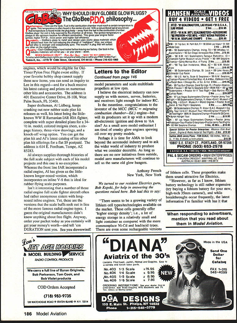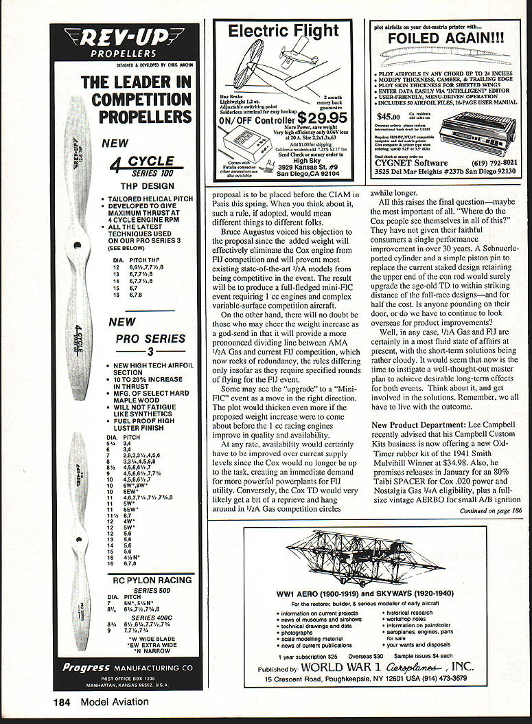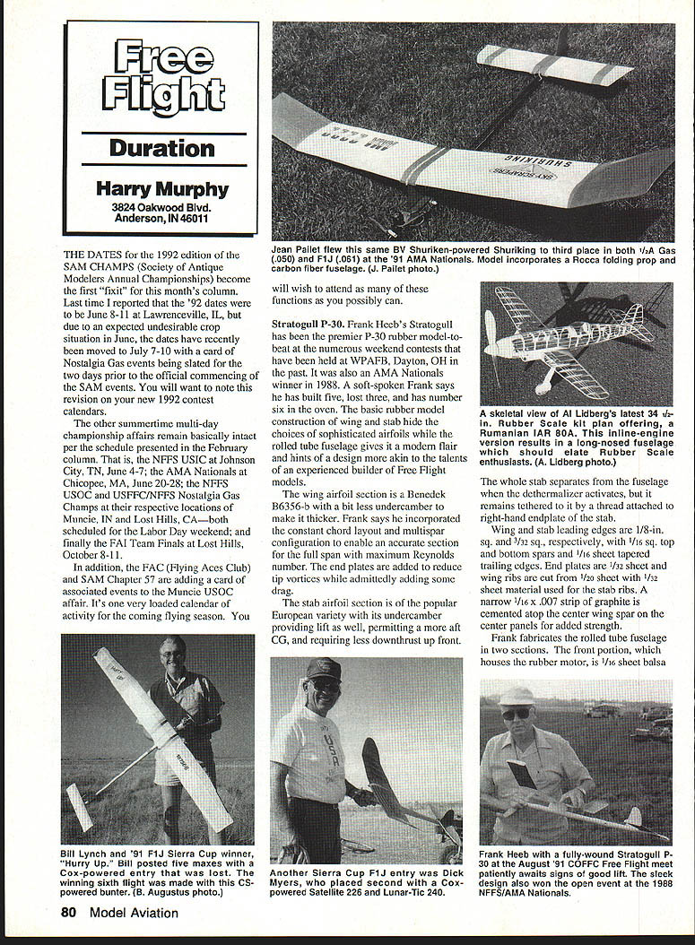 THE DATES 1992 edition SAM CHAMPS Society Antique Modelers Annual Championships become first fixit months column Last time reported 92 dates June 8-11 Lawrenceville IL due expected undesirable crop situation June dates have recently moved July 7-10 card Nostalgia Gas events being slated two days prior official commencing SAM events will want note revision new 1992 contest calendars other summertime multi-day championship affairs remain basically intact per schedule presented February column NFFS USIC Johnson City TN June 4-7 AMA Nationals Chicopee MA June 20-28 NFFS USOC USFFCINFFS Nostalgia Gas Champs respective locations Muncie IN Lost Hills CAboth scheduled Labor Day weekend finally FAI Team Finals Lost Hills October 8-11 addition FAC Flying Aces Club SAM Chapter 57 adding card associated events Muncie USOC affair Its very loaded calendar activity coming flying season will wish attend functions possibly can Stratogull P30 Frank Heebs Stratogull has premier P-30 rubber model-tobeat numerous weekend contests have held WPAFB Dayton OH past also AMA Nationals winner 1988 soft-spoken Frank says has built five lost three has number six oven basic rubber model construction wing stab hide choices sophisticated airfoils rolled tube fuselage gives modem flair hints design akin talents experienced builder Free Flight models wing airfoil section Benedek B6356-b bit less undercamber make thicker Frank says incorporated constant chord layout multispar configuration enable accurate section full span maximum Reynolds number end plates added reduce tip vortices admittedly adding some drag stab airfoil section popular European variety its undercamber providing lift well permitting aft CG requiring less downthrust up front whole stab separates fuselage dethermalizer activates remains tethered thread attached right-hand endplate stab Wing stab leading edges 1/8-in sq I32 sq respectively 1/16 sq top bottom spars 1/16 sheet tapered trailing edges End plates /32 sheet wing ribs cut 1/20 sheet 1/32 sheet material used stab ribs narrow /16 x 007 strip graphite cemented atop center wing spar center panels added strength Frank fabricates rolled tube fuselage two sections front portion houses rubber motor 1/16 sheet balsa 80 Model Aviation Duration Harry Murphy 3824 Oakwood Blvd Anderson IN 46011 Jean Pailet flew same BV Shuriken-powered Shuriking third place bath 1/2A Gas 050 F1J 061 91 AMA Nationals Model incorporates Rocca folding prop carbon fiber fuselage J Pallet photo # sieieiai view pi Llaoergs jaxesi SQ 112in Rubber Scale kit plan offering Rumanian IAR BOA inline-engine version results long-nosed fuselage should elate Rubber Scale enthusiasts Lidberg photo Bill Lynch 91 F1J Sierra Cup winner Hurry Up Bill posted five maxes Cox-powered entry lost winning sixth flight made CSpowered bunter B Augustus photo Another Sierra up nj entry uIcK Myers placed second Cox powered Satellite 226 Lunar-Tic 240 Frank eeo win lully-wound tratoguil 30 August 91 COFFC Free Flight meet patiently awaits signs good lift sleek design also won open event 1988 NFFS/AMA Nationals rolled around length aluminum tubing old lawn chair tapered tail boom form used candle wrapped masking tape achieve desired taper vertical fin 1/16 sheet pylon has 1/8-in sq front rear upright posts two 1/32 sheet uprights evenly spaced between both sides 1/32 sheet pylon built separately securely cemented fuselage until after initial glide tests have determined its optimum location Frank insists 20 decalage maintained determining position should establish CG about 90% wing chord Six strands l/gjn rubber make up 10-gram motor pylon taped position model should produce slight stall high speed glide tests correct move pylon fore aft accordingly maintaining 20 decalage Attempt low power flights before permanently securing pylon fuselage Thanks Frank sharing design us Personally have yet observe consistent flying P-30 design Should require information send SASE Frank 485 Grange Hall Rd Beavercreek OH 45430 Have go gumbanders FIJ status studying resultant box scores 112A Open event AMA Free Flight Nationals 1991 understandable might assume 30-year reign venerable Cox TD 049 may have come abrupt end Youll need look down fourth place find Cox-powered entry Two BV Shurikens Galbreath set-up CS copped top three positions trophy line increased number Fokker Red Shurikens being utilized subsequent FlJ event quite evident well Jean Pailets fine Shuriken-powered Shuriking design managed win third place both Open /2A event FlJ competition against 84 other 12A contestants 26 fellow FIJ combatants respectivelynot bad performance Anyway could thus presume arrival /2A racing powerplant clear WING RIB B TIP PLATE ss OIAI PROP lODLA Rt CLIMB L OLIDE 100 PEHEEBS SINAISGULL P3640 1931 1i32 PL10 1Tmr --U-- STAB RIB B TIP PLATE 99 V B I/lB SHY --44ZZ SO I3B SCALE evident Whereas subject 91 FF Nationals predominantly attended competitors Eastern Midwestern sections country Bruce Augustus sent us report heralded FAI Sierra Cup tends paint different picture demise Cox may little slower coming Far West report coupled some other recent associated happenings may tend reshape opinions short term forecasters altogether Therefore might interesting take glance facets affecting 1/2A Gas FlJ time before panic prematurely run out bury Cox TDs back yard Bruces report indicates annual California-based Sierra Cup meet took place last fall staged FlJ 29 STAB TILT I, 12/91 event fourth consecutive year first event won using engine other Cox winner Bill Lynch used Cox-powered model accomplish maxes initial five rounds went CS bunter backup model Cox powered entry lost five-minutemax fifth round also interesting note no Shuriken-powered model placed top ten Dick Myers contested Bill Lynchs sixth-round flyoff flight stock Satellite 226 powered Cox fell short 47 seconds earn second place laurels Bruce opines although competitors experimenting new 1 cc 061 cu displacement engines no single engine has 