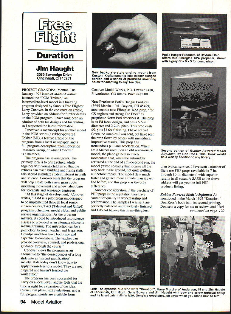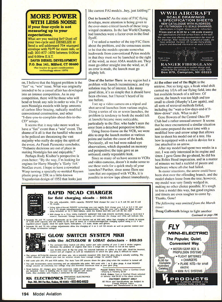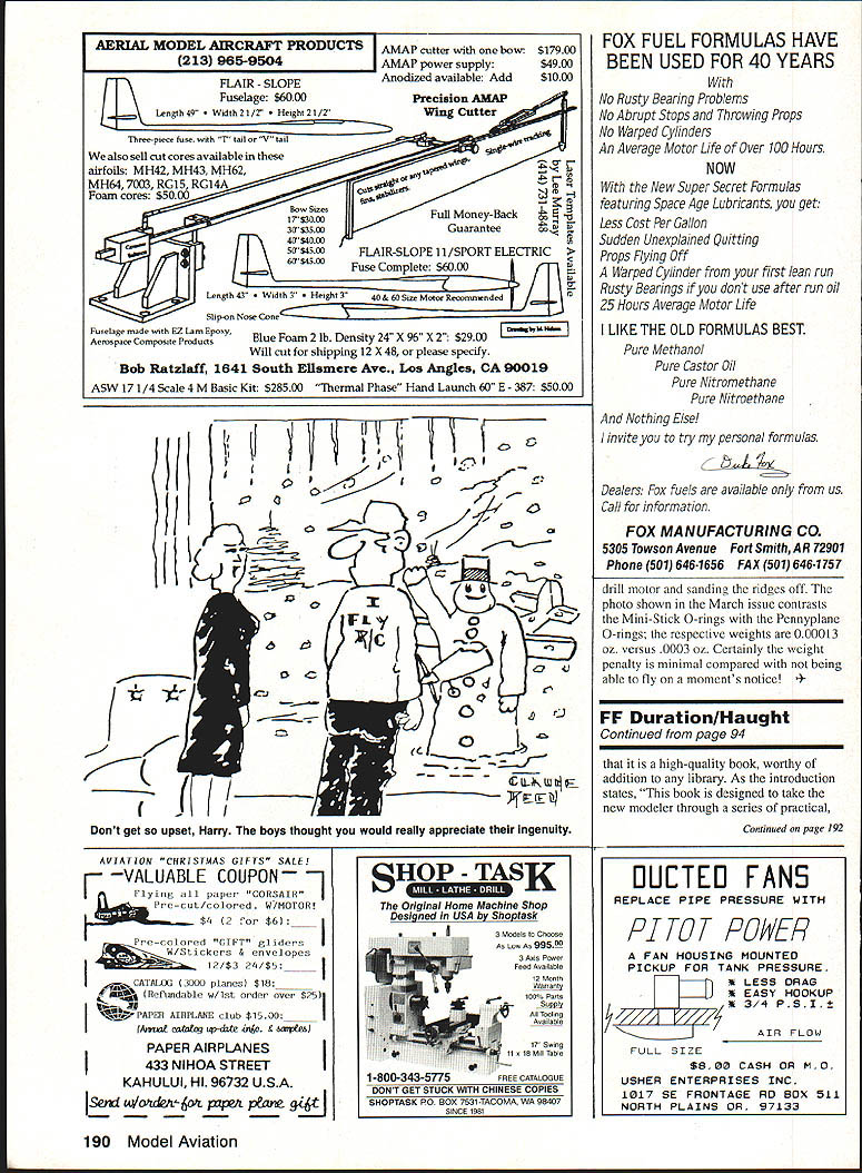 PROJECT GRANDPA Mentor January 1992 issue Model Aviation featured PGM Trainer intermediate-level model building program designed famous Free Flighter Larry Conover construction article Larry provided address further details PGM program have long admirer both designs writing requested latest information received manuscript another model PGM series rubber-powered Fokker E-II feature article program local newspaper full program description Education Research Group Conover member program has several goals primary idea bring retired adults together young children retirees can teach building flying skills should stimulate student interest math science Conover feels program will help create both new grass roots modeling movement new talent base scientists aerospace engineers stage development Conover writes PGM pilot program designed implemented through local senior citizen centers TAG Taiented Gifted programs churches model clubs public service organizations As program matures could introduced science classes provided alternate choice manual training instruction can joint effort between teacher layperson Grandpa modelers have both time expertise contribute teacher can provide overview counsel professionai guidance through course Conover views program alternative consequences long slide instant gratification society Kids today dont know apply themselves model prepared havent learned work ethic program has successful Larry local level feels time right expansion idea Curriculum plans text evaluations full program guide available Conover Model Works PO Drawer 1488 Silverthorne CO 80489 Price $200 New Products Potis Hangar Products 5695 Marshall Rd Dayton OH 45429 announces new Fibreglas 1/2A prop CS engines strong Tee Dees proprietor Norm Poti describes prop Ed Keck design has 56-in diameter 27-in pitch prop costs $5 plus $3 finishing have yet flown samples sent have seen prop flown others immediate impressive results prop has tremendous pull acceleration Dale Mateer used old seven-ounce model plane gained much momentum autorudder activated end five-second run model yawed badly came way back ground quite pulling out before impact model flew much faster gained altitude ever before prop difference Another consideration purchase PHP props reputation have earned quality workmanship performance samples sent perfectly balanced flawlessly finished believe anything less Second edition Rubber Powered Model Airplanes Don Ross book would worthy addition library typical service have seen number fliers use PHP props available 7-in through 10-in diameters superior results cases SASE above address will get full PHP products listing Rubber Powered ModelAirplanes As mentioned March 1992 Duration Don Rosss book its second printing Don sent copy for me review feel continued page 190 94 Model Aviation Duration Jim Haught 3069 Sovereign Drive Cincinnati OH 45251 Potis Hangar Products Dayton Ohio offers Fibreglas 1/2A propeller shown gray Cox 6 x 3 comparison New backplate-style engine mount Kustom Kraftsmanship has thicker flanged portion series predrilled mounting holes adapting Tee Dee Left dynamic duo write Duration Harry Murphy Anderson IN Jim Haught Cincinnati OH Right Gene Bowers Jim Haught bow arrow retrieval setup its latest catch Jims 1/2A Genes good shot.so smile stand next him ft 11 a~9 tJ 0 8 66 o o L -11 1 Dont get upset Harry boys thought would really appreciate ingenuity AVIATION CRIISTMAS GIFTS SALE F VALUABLE COUPON ying paper CORSAIR Procut/colored W/MOTOR $4 2 $6 Procolored GIFT gliders N/Stickers & envelopes 12 /$3 24/$5 _____ ,-CATALOG 3000 planes $18____ Refimdable w/lst order over $251 PAPER AIRPLANE club $15 _____ cazf up-dIe o PAPER AIRPLANES 433 NIHOA STREET KAHULUI HI 9632 USA Iseiti UfOL p pa CJ -FOX FUEL FORMULAS HAVE BEEN USED FOR 40 YEARS No Rusty Bearing Problems No Abrupt Stops Throwing Props No Warped Cylinders An Average Motor Life Over 100 Hours NOW New Super Secret Formulas featuring Space Age Lubricants get Less Cost Per Gallon Sudden Unexplained Quitting Props Flying Off Warped Cylinder first lean run Rusty Bearings dont use after run oil 25 Hours Average Motor Life LIKE THE OLD FORMULAS BEST Pure Methanol Pure Castor Oil Pure Nitromethane Pure Nitroethane Nothing Else invite try personal formulas Dealers Fox fuels available us Call information FOX MANUFACTURING CO 5305 Towson Avenue Fort Smith AR 72901 Phone 501 6461656 FAX 501 646-1757 drill motor sanding thc ridges off photo shown March issue contrasts Mini-Stick 0-rings Pennyplane 0-rings respective weights 0000 13 oz versus 0003 oz Certainly weight penalty minimal compared being able fly moments notice urationlHaught Continued page 94 high-quality book worthy addition library As introduction states book designed take new modeler through series practical Continued page 192 190 Model Aviation AERIAL MODEL AIRCRAFT PRODUCTS AMAP cutter bow $17900 213 9659504I AMAP power supply$4900 FLAIR SLOPEAnodized available Add$1000 Three-piece fuse T tail 1 tail also sell cut cores available airfoils MH42 MH43 MH62 MH64 7003 RGI5 RGI4A Foam cores $5000 17 $3oaFull Money-Back 35153Guarantee 50 $45FLAIR-SLOPE 11/SPORT ELECTRIC Fuse Complete $6000 Length 43 h 3 ht 40& 60 Size htotor Recommended Slip-en Nose Cone Fuselage made EZ Lam Epoxy Blue Foam 2 lb24 X 96 X 2 $2900 Aerospace Composite ProductsDensity Will cut shipping 12 X 48 please specify Bob Rntzlaff 1641 South Elismere Ave. Los Angles CA 90019 ASW 171/4 Scale 4 M Basic Kit $28500 Thermal Phase Hand Launch 60 E 387 $5000 SHOP TASK Original Home Machine Shop Designed USA Shoptask DUETED FAN5 REPLACE PIPE PRESSURE WITH RI TO T ROWER FAN HOUSING MOUNTEO PICKUP FOR TANK PRESSURE LESS DRAG S EASY HOOKUP 5 3/4 PSI AIR FLOW FULL SIZE $800 CASH OR MO USHER ENTERPRISES INC 1017 SE FRONTAGE RD BOX 511 NORTH PLAINS OR 97133 HTSYSTEMS-~ THE BEST IN ELECTRIC FLIGHT SpeCIalIzIng ASTRO FLIGHT SYSTEMS Sales & dSIrrSuIOn WE CATER TO ThE ELECTRIC FLYER EXPERT 30 pPnn U PC epp,ecp 0 peas 01 EPUp PIpr Pp