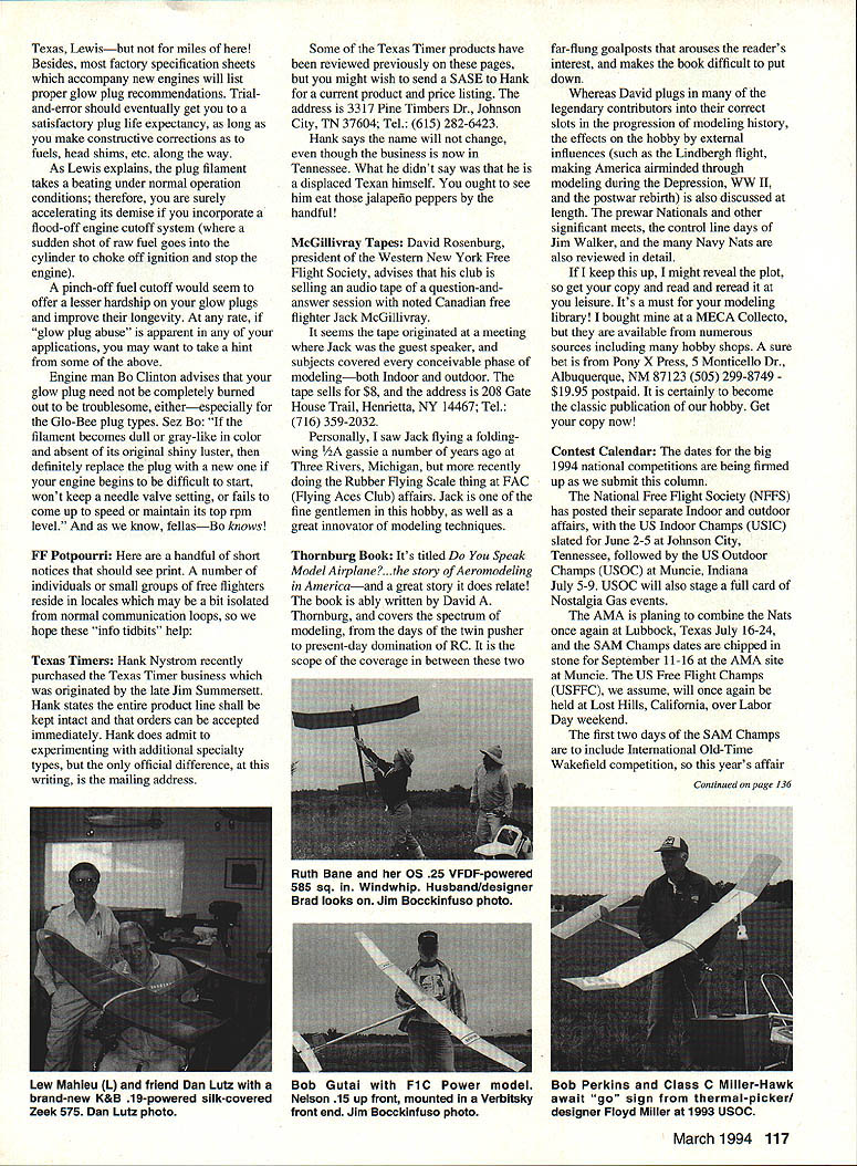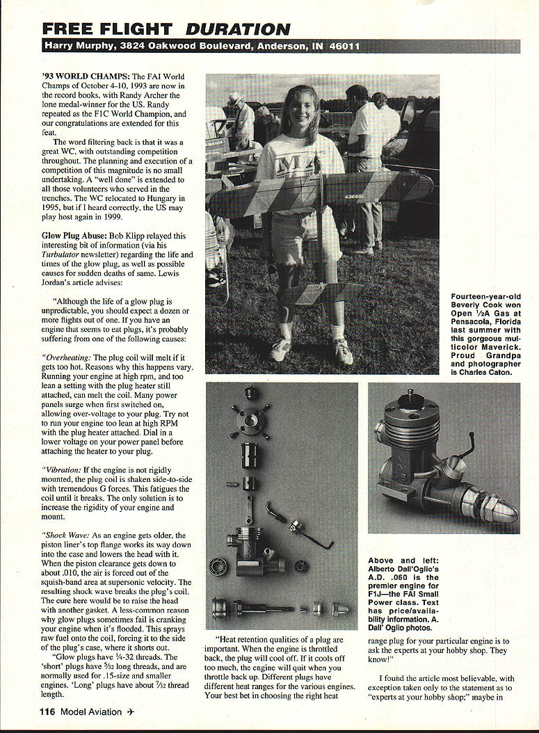 FREE FLIGHT DURATION 93 WORLD CHAMPS FAT World Champs October 4-10 1993 now record books Randy Archer lone medal-winner US Randy repeated FIC World Champion congratulations extended feat word filtering back great WC outstanding competition throughout planning execution competition magnitude no small undertaking well done extended volunteers served trenches WC relocated Hungary 1995 heard conectly US may play host again 1999 Glow Plug Abuse Bob Klipp relayed interesting bit information via Turbulator newsletter regarding life times glow plug well possible causes sudden deaths same Lewis Jordans article advises Although life glow plug unpredictable should expect dozen flights out have engine seems eat plugs its probably suffering following causes Overheating plug coil will melt gets too hot Reasons happens vary Running engine high rpm too lean setting plug heater still attached can melt coil power panels surge first switched allowing over-voltage plug Try run engine too lean high RPM plug heater attached Dial lower voltage power panel before attaching heater plug Vibration engine rigidly mounted plug coil shaken side-to-side tremendous G forces fatigues coil until breaks solution increase rigidity engine mount Shock Wave As engine gets older piston liners top flange works its way down case lowers head piston clearance gets down about 010 air forced out squish-band area supersonic velocity resulting shock wave breaks plugs coil cure would raise head another gasket less-common reason glow plugs sometimes fail cranking engine its flooded sprays raw fuel onto coil forcing side plugs case shorts out Glow plugs have -32 threads short plugs have 5A2 long threads normally used 15-size smaller engines Long plugs have about 7A2 thread length Heat retention qualities plug important engine throttled back plug will cool off cools off too much engine will quit throttle back up Different plugs have different heat ranges various engines best bet choosing right heat range plug particular engine ask experts hobby shop know found article believable exception taken statement experts hobby shop maybe 116 Model Aviation teen-year-old Beverly Cook won Open /2A Gas Pensacola Florida last summer gorgeous mul ticolor Maverick Proud Grandpa photographer Charles Caton Texas Lewisbut miles Besides factory specification sheets accompany new engines will list proper glow plug recommendations Trialand-error should eventually get satisfactory plug life expectancy long make constructive corrections fuels head shims etc along way As Lewis explains plug filament takes beating under normal operation conditions therefore surely accelerating its demise incorporate flood-off engine cutoff system sudden shot raw fuel goes cylinder choke off ignition stop engine pinch-off fuel cutoff would seem offer lesser hardship glow plugs improve longevity rate glow plug abuse apparent applications may want take hint some above Engine man Bo Clinton advises glow plug need completely burned out troublesome eitherespecially Gb-Bee plug types Sez Ho filament becomes dull gray-like color absent its original shiny luster definitely replace plug new engine begins difficult start wont keep needle valve setting fails come up speed maintaln its top rpm level know fellasBo knows FF Potpourri handful short notices should see print number individuals small groups free fighters reside locales may bit isolated normal communication loops hope info tidbits help Texas Timers Hank Nystrom recently purchased Texas Timer business originated late Jim Summersett Hank states entire product line shall kept intact orders can accepted immediately Hank does admit experimenting additional specialty types official difference writing mailing address Some Texas Timer products have reviewed previously pages might wish send SASE Hank current product price listing address 3317 Pine Timbers Dr Johnson City TN 37604 Tel 615 282-6423 Hank says name will change though business now Tennessee What didnt say displaced Texan himself ought see him eat jalapeflo peppers handful McGillivray Tapes David Rosenburg president Western New York Free Flight Society advises club selling audio tape question-andanswer session noted Canadian free fighter Jack McGillivray seems tape originated meeting Jack guest speaker subjects covered conceivable phase modelingboth Indoor outdoor tape sells $8 address 208 Gate House Trail Henrietta NY 14467 Tel 716 359-2032 Personally saw Jack flying foldingwing /2A gassie number years ago Three Rivers Michigan recently doing Rubber flying Scale thing FAC Flying Aces Club affairs Jack fine gentlemen hobby well great innovator modeling techniques Thornburg Book Its titled Speak Model Airplane.the story Aeromodeling Americaand great story does relate book ably written David Thornburg covers spectrum modeling days twin pusher present-day domination RC scope coverage between two far-flung goalposts arouses readers interest makes book difficult put down Whereas David plugs legendary contributors correct slots progression modeling history effects hobby external influences such Lindbergh flight making America airminded through modeling during Depression WW II postwar rebirth also discussed length prewar Nationals other significant meets control line days Jim Walker Navy Nats also reviewed detail keep up might reveal plot get copy read reread leisure Its must modeling library bought MECA Collecto available numerous sources including hobby shops sure bet Pony X Press 5 Monticello Dr Albuquerque NM 87123 505 299-8749 $1995 postpaid certainly become classic publication hobby Get copy now Contest Calendar dates big 1994 national competitions being firmed up submit column National Free flight Society NFFS has posted separate Indoor outdoor affairs US Indoor Champs USIC slated June 2-5 Johnson City Tennessee followed US Outdoor Champs USOC Muncie Indiana July 5-9 USOC will also stage full card Nostalgia Gas events AMA planing combine Nats once again Lubbock Texas July 16-24 SA