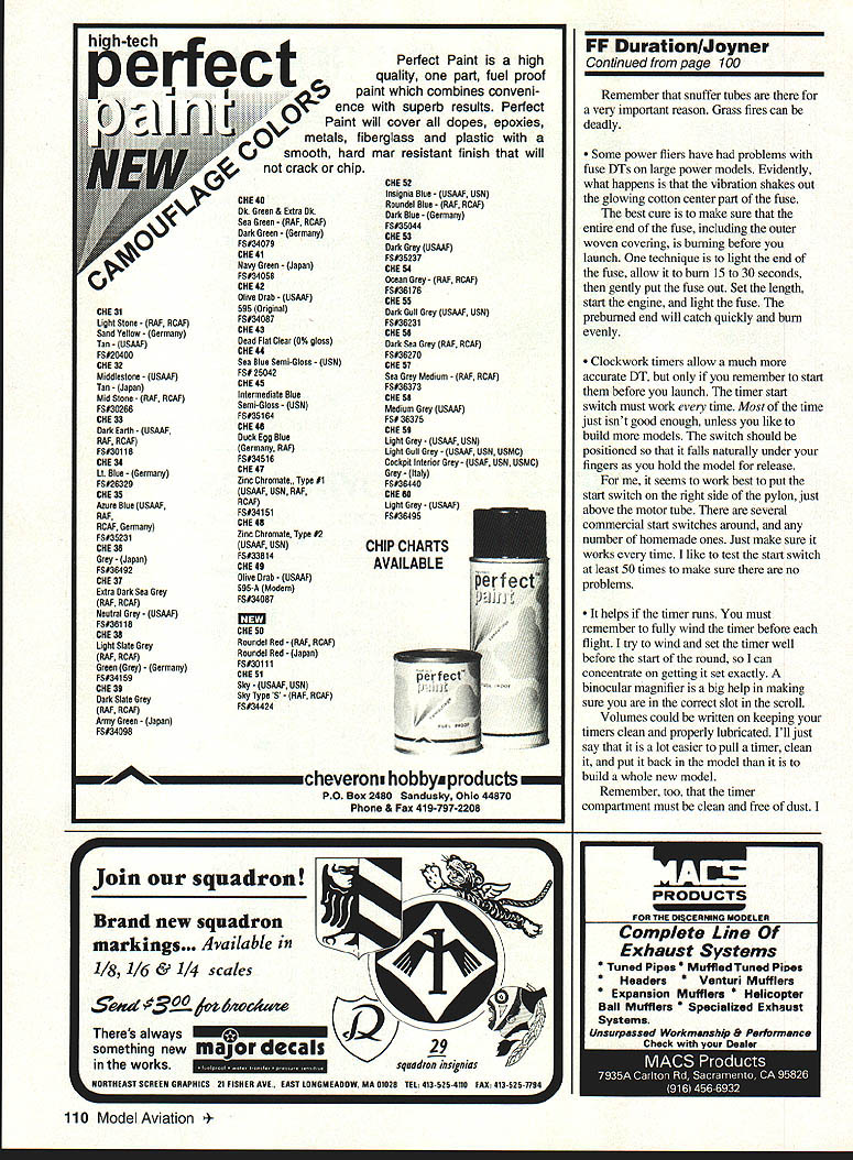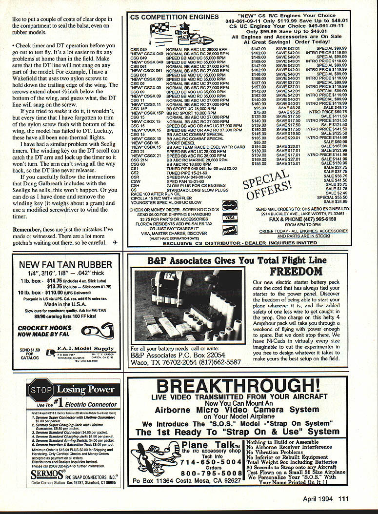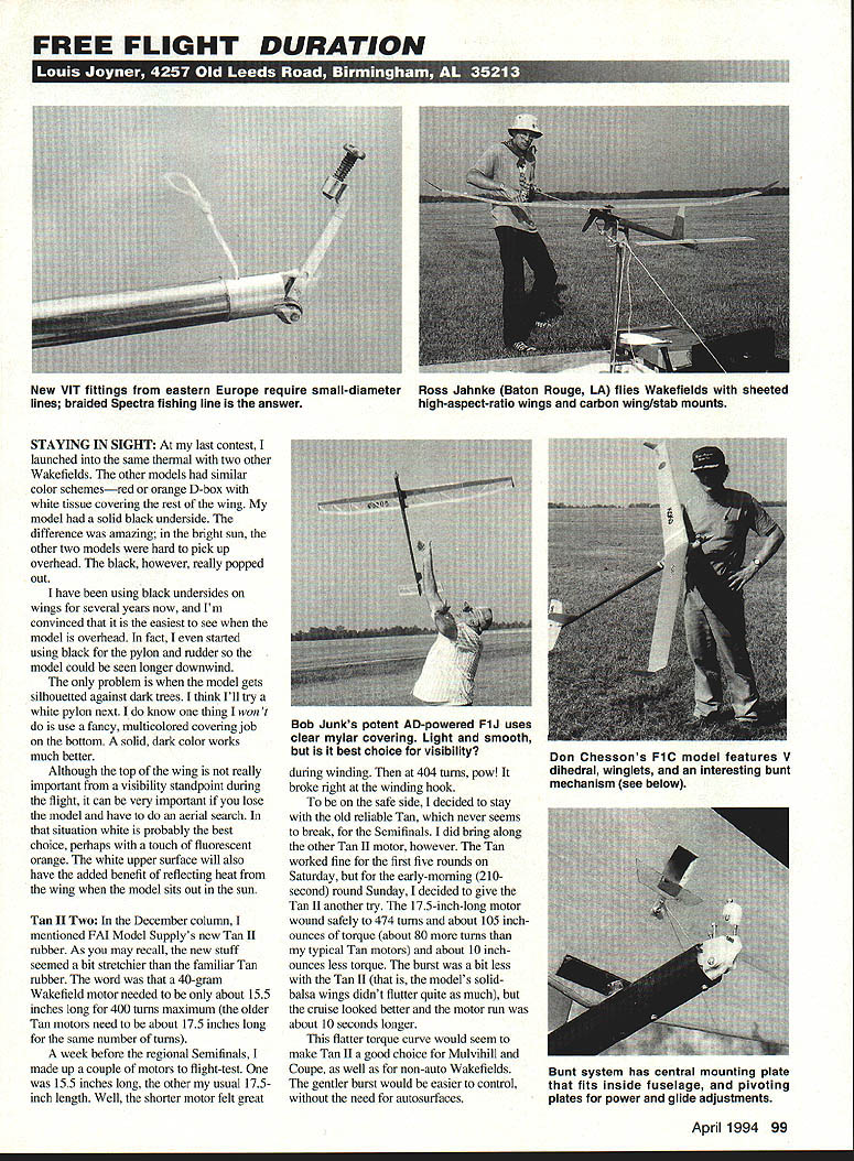 FREE FLIGHT DURATION STAVING IN SIGHT last contest launched same thermal two other Wakefields other models similar color schemesred orange D-box white tissue covering rest wing model solid black underside difference amazing bright sun other two models hard pick up overhead black however really popped out have using black undersides wings several years now Im convinced easiest see model overhead fact started using black pylon rudder model could seen longer downwind problem model gets silhouetted against dark trees think Ill try white pylon next know thing wont use fancy multicolored covering job bottom solid dark color works much better Although top wing really important visibility standpoint during flight can very important lose model have aerial search situation white probably best choice perhaps touch fluorescent orange white upper surface will also have added benefit reflecting heat wing model sits out sun Tan II Two December column mentioned FAI Model Supplys new Tan II rubber As may recall new stuff seemed bit stretchier familiar Tan rubber word 40-gram Wakefield motor needed about 155 inches long 400 turns maximum older Tan motors need about 175 inches long same number turns week before regional Semifinals made up couple motors flight-test 155 inches long other usual 175inch length Well shorter motor felt great during winding 404 turns pow broke right winding hook safe side decided stay old reliable Tan never seems break Semifinals did bring along other Tan II motor however Tan worked fine first five rounds Saturday early-morning 2 10second round Sunday decided give Tan II another try 175-inch-long motor wound safely 474 turns about 105 inchounces torque about 80 turns typical Tan motors about 10 inchounces less torque burst bit less Tan II models solidbalsa wings didnt flutter quite much cruise looked better motor run about 10 seconds longer flatter torque curve would seem make Tan II good choice Mulvihill Coupe well non-auto Wakefields gentler burst would easier control need autosurfaces April 1994 99 New VIT fittings eastern Europe require small-diameter Ross Jahnke Baton Rouge LA flies Wakefields sheeted lines braided Spectra fishing line answer high-aspect-ratio wings carbon wing/stab mounts Bob Junks potent AD-powered F1J uses clear mylar covering Light smooth best choice visibility Don Chessons FiC model features V dihedral winglets interesting bunt mechanism see below Bunt system has central mounting plate fits inside fuselage pivoting plates power glide adjustments way carefully checked winding hook blown motor 10 power magnifying glass lot rough machining marks may have contributed breakage few minutes file emery board buffing wheel took care problem Carbon Castings Ross Jahnke has come up very simple easy way cast parts carbon fiber Instead machining reusable mold Ross makes out scrap balsa sheet cut glued up form cavity part packs mixture epoxy resin carbon fiber tow No mold release used Next covers top mold plastic tape clamps piece scrap plywood push down carbon-epoxy mixture After epoxy sets up Ross simply breaks away balsa leaving finished carbon part Sanding filing clean up rough edges Since balsa molds quick cheap make usually makes multiple molds casts extra parts Lighter Lines new Russian/Ukraineinspired Wakes use some very small parts especially back end weight important Andriukov VIT fitting example measures about long Needless say holes lines running back timer small usual line Cortland Micron 20# test fly line hacking just too big Ed Turner told eastern Europeans use thin 8# 12# test monofilament line thought using monofilament just too scary An article local newspaper early last summer mentioned new braided Kevlar fishing line sounded promising Unfortunately line short supply never could find did come across braided Spectra line called Versitex bought 35# test line lightest could find about half diameter Micron braided Dacron line weight slightly 12# monofilament feel much comfortable using new braided stuff should able find Versitex line sporting goods stores write Versitex America Ltd Spring City PA 19475 Easier Bunting Most bunt mechanisms Ive seen power models look pretty complicated Don Chesson Baton Rouge showed simple system made Ray Harlan Hardy Brodersen-designed Koko FlC model Although Dons example nicely machined mechanism could easily made using hand tools drill press consists central plate 1/s-inch Delrin sheet familiar Delrin very easy-to-machine plastic plate fits carbon fiber fuselage tube Four screws hold place central cutout saves bit weight acts guide tube takes stab pull-down line through 900 bend stitched place soft wire running through series holes Delrin plate rear unit small rectangular blocks Deirin mounted either side single pivot screw blocks spring-loaded rear using two safety pin-type springs Lines running timer pull blocks forward launch stab pulled down until hits power adjustment screw top block bunt line holding left block forward released timer pivots back out way stab pulled down against bunt adjustment screw top center plate Next timer releases line stab moves up against glide adjust screw Early versions used needle valve finer adjustment later version uses Delrin block adjustment screw DT right block pivots back timer releases line Sympo 26 Twenty-Sixth Annual National Free Flight Society Symposium out Actually has out since Nats last September As usual Sympo offers rich blend technical articles down-to-earth pieces particular interest series short technical articles originally appeared NFFS Digest back early 1970s Andrew Bauer continues series computer-simulated flights time exploring bunt FlA gliders Interesting stuff never has chase flight Ten Models Year selection includes Pierre Bruns Nordic Dan Tracys Wakefield Doug Joyces FlC model yes canard international category Marvin Mace takes Large AMA Gas honors Bruce Augustus FlJ getting Small Gas award Bud Romaks Mulvihill picked Large Rubber model year John ODwyers Wint