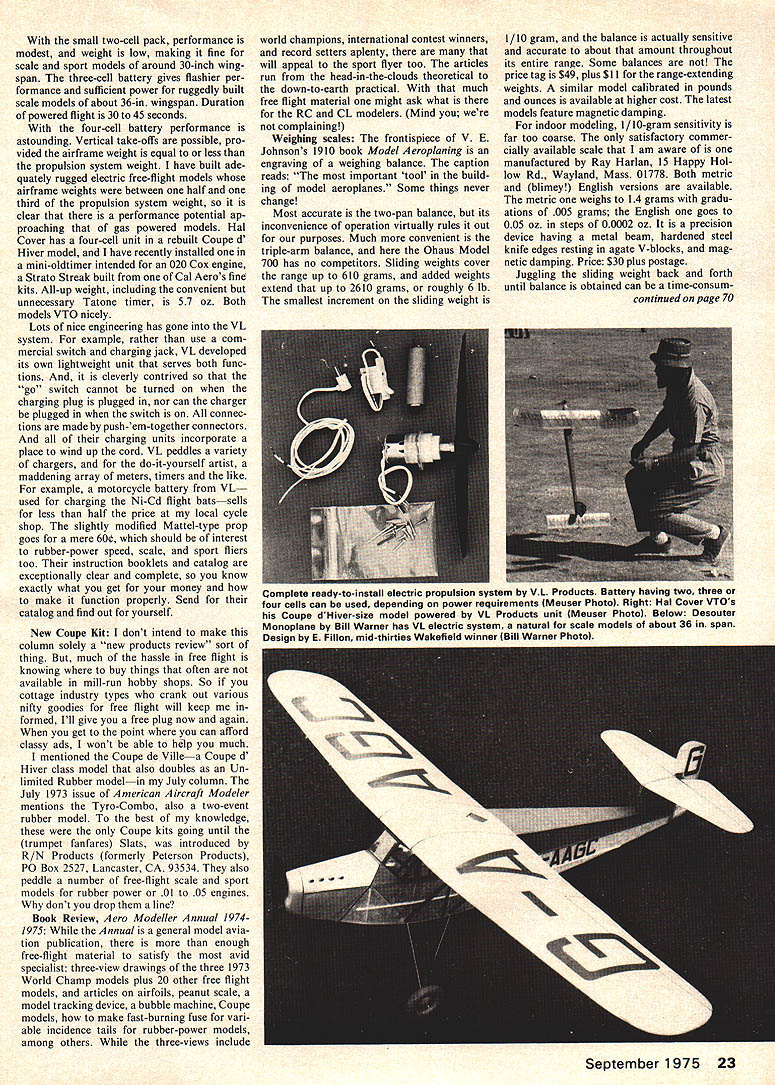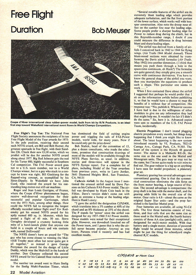 Free Flight Duration Free Flights Top Ten National Free Flight Society announces recipients its ten Free Flight Model Year awards 1975 pole position receiving second such NFFS award Bill Bob Hunter greatest spectacle free flight Satel lite 226 Check new GLH series predict will due another NFFS award along about 1977 Big Red Johnson gets nod Tarter 800 highly successful Southern Cal competition FAI Power award goes US team member nor World Champs winner guy stuck con cept knew right Bill Gieskieng flapped-wing concept exemplified Siren-Dippity Wakefield have John Gard received award Out standing long-motor-run still-air machine Roger Jean Louis Garrigou France Coupe dHiver phenomenon began receive well-deserved recognition successful popular Garricoupe won 1973 Nats among other things could NFFS fail recognize longest officially recorded indoor flight ever Erv Rod emsky got second NFFS award aptly named 600 sq Monster has posted flight 45 mm 50 sec Steve Geraghty developed crummy looking little mite hand-launch glider anyone can build couple hours win contests named Driftwould NFFS doesnt have award guy has come closest winning Mul vihill Trophy often never quite got together instead gave George Perryman award design Little Daddy won Mulvihill hands another Don Chancey collected second NFFS award Canned Heat rocket-power model number ten award went Hans Seelig Seelig Multi-Function Timer 22 Model Aviation Bob Meuser has dominated field cutting engine power wiggling tails FAI-Power models world wide years Now could get price down Bob Stalick head committee 15 plus dozen consultants made selec tions promises construction drawings of models will available through NFFS Plans Service usual addition stories three-views will appear NFFS Sympo report complete list plans including Model Year awardees previous years write Larry Jordan 5641 Diamond Heights Blvd San Francisco CA 94131 Cathexis Airroil August issue men tioned unusual airfoil used Dave Par sons Cathexis FAI-Power model air foil developed Hank Cole back Fifties Daves version didnt come out quite extreme hump leading edge Hanks story gave airfoil designation CP5408 translates 5% camber 40% chord 8% thickness 25% chord P stands power since airfoil designed 1957-1960 FAI Power models models noted exceptional glide However downdraft knocked off Power team guess air foil never became popular Anyway know Parsons tried recently has excellent results Several notable features airfoil its extremely blunt leading edge provides adequate turbulation flat front portion lower surface works well boxspar construction Also note droop nose ef fect camber line near leading edge Some people prefer sharper leading edge Power reduce drag during climb Reynolds-number range doubt could measure difference drag between blunt sharp leading edges airfoil derived family air foils conceived back 1942 1944 flying wings Air Trails 1944 Model Annual blunt-nosed sections obtained trans forming Davis airfoil formulas Air Trails May 1942 another dimension think means push through hole space-time continuum eh Hank formulas quite general simply give smooth curve continuous derivatives have know general shape airfoil want manipulate equations produce such shape particular seems work first contacted Dave about airfoil suggested perhaps would prefer sit information awhile before publishing would have chance reap benefits fear competition response No publish Whatever success have due willingness other modelers give information might help wouldnt fair didnt same So Advanced copies sent members US FAI Power Team incidentally Electric Propulsion dont intend plugging electric propulsion month things keep happening think might like know about latest happening new system introduced recently VL Products 7023-D Canoga Ave Canoga Park CA 91303 heart system Hytork 48 geared motor motor Mabuchi RE-26 same size used Mattel Monogram units guts may may same Im quite ready ruin find out gear reducer leg up anything have seen model propulsion planetary gear set Planetary gearing has several advantages over conventional gearing symmet rical construction eliminates side force front motor bearing large source fric tion second advantage compactness prop shaft line motor shaft gearing adds little overall size motor Gear ratio 48about same original Super Star unitsand prop fur nished familiar Mattel prop Four batteries available using Ni-Cd cells first three batteries consist two three four cells same size used Mattel unit fourth battery consists three AA size penlight cells designated multi-motor models battery single motor duration powered flight would around three minutes might just thing schoolyard singlechannel R/C models Coupe dHiver international class rubber-power model built kit R/N Products ideal first step toward Wakefield international event flown World Champs Competition CP5408 ar hwx CoLe X 0 /2525 5 75 /0/5202530405060706090/00 U 074 * 3 6o 66 7883 6y90 68 &z Z 6i 46 2910 2 0-062 -075 -v6 -o4 -03 00 0609 1 14 12 10 cA 050 small two-cell pack performance modest weight low making fine scale sport models around 30-inch wing span three-cell battery gives flashier per formance sufficient power ruggedly built scale models about 36-in wingspan Duration powered flight 30 45 seconds four-cell battery performance astounding Vertical take-offs possible pro vided airframe weight equal less propulsion system weight have built ade quately rugged electric free-flight models airframe weights between half third propulsion system weight clear performance potential ap proaching gas powered models Hal Cover has four-cell unit rebuilt Coupe d Hiver model have recently installed mini-oldtimer intended 020 Cox engine Strato Streak built Cal Aeros fine kits All-up weight including convenient unnecessary Tatone timer 57 oz Both models VTO nicely Lots nice engineering has gone VL system example rather use com mercial switch charging jack VL developed its own lightweight unit serves both func tions cleverly cont