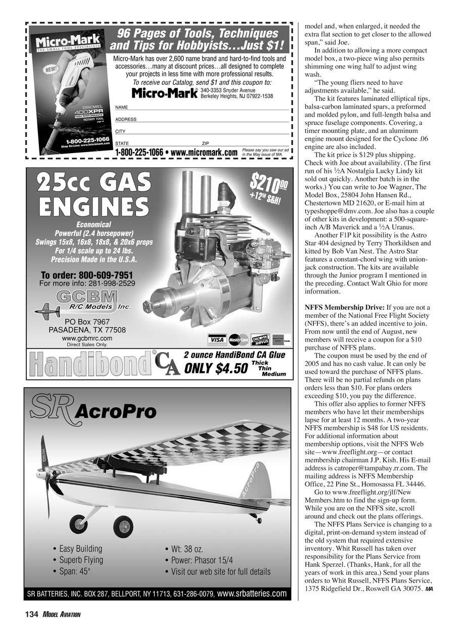 inches). Any engine up to 1cc (.061 cu. in.) can be used; there are no