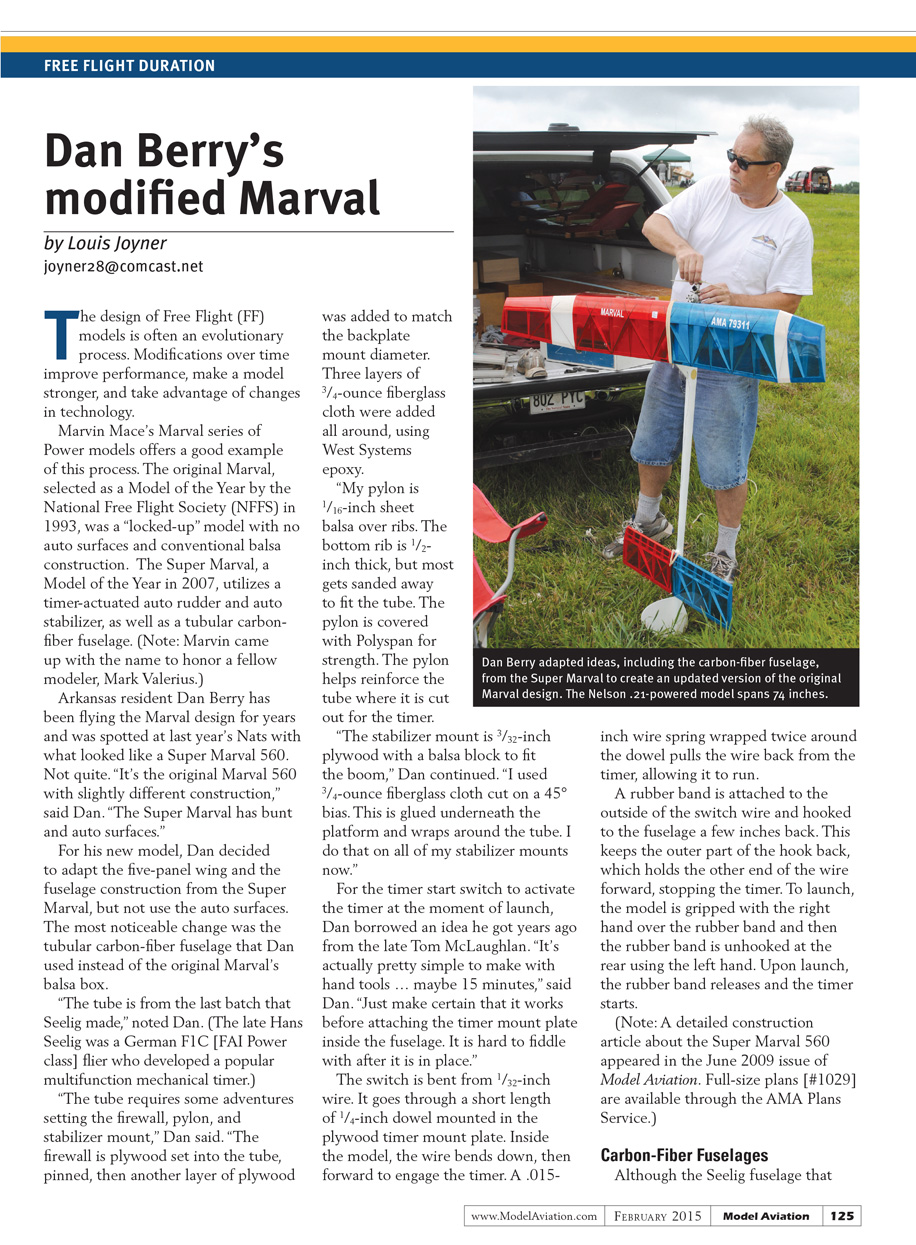 Marvin Mace’s Marval series of Power models offers a good example of this process. The original Marval, selected as a Model of the Year by the National Free Flight Society (NFFS) in 1993, was a “locked-up” model with no auto surfaces and conventional balsa construction. The Super Marval, a Model of the Year in 2007, utilizes a timer-actuated auto rudder and auto stabilizer, as well as a tubular carbon-fiber fuselage.