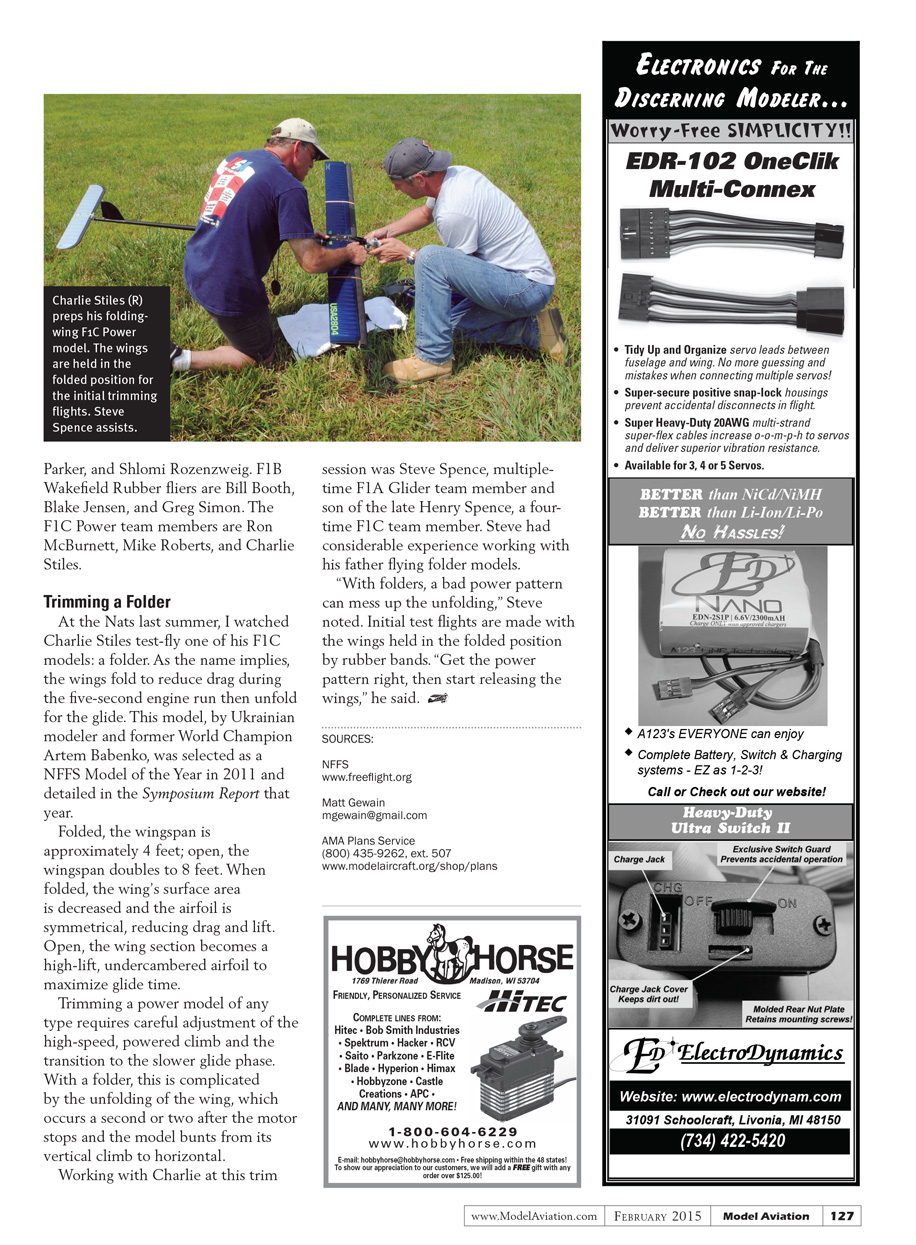 At the Nats last summer, I watched Charlie Stiles test-fly one of his F1C models: a folder. As the name implies, the wings fold to reduce drag during the five-second engine run then unfold for the glide. This model, by Ukrainian modeler and former World Champion Artem Babenko, was selected as a NFFS Model of the Year in 2011 and detailed in the Symposium Report that year.