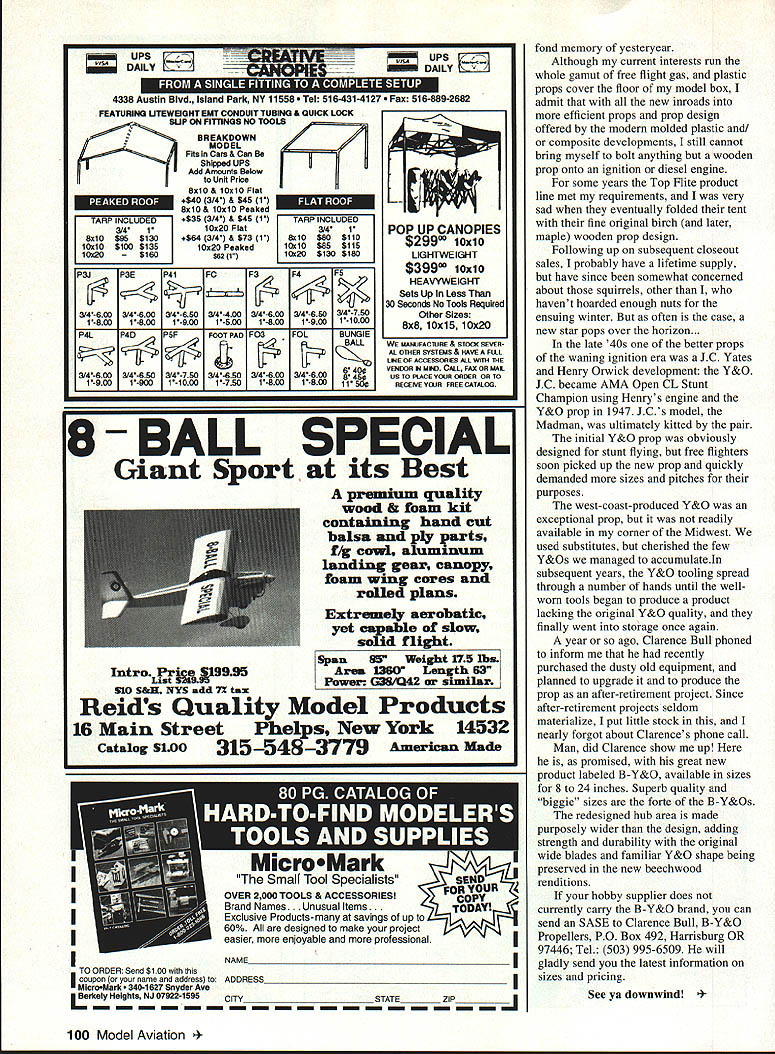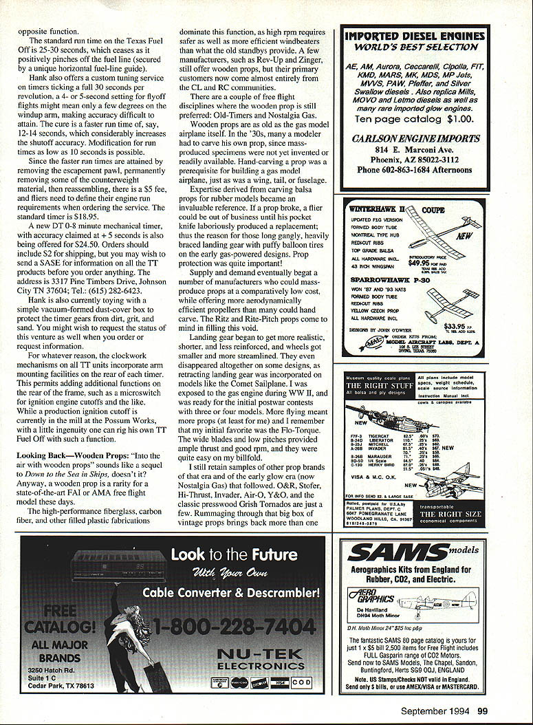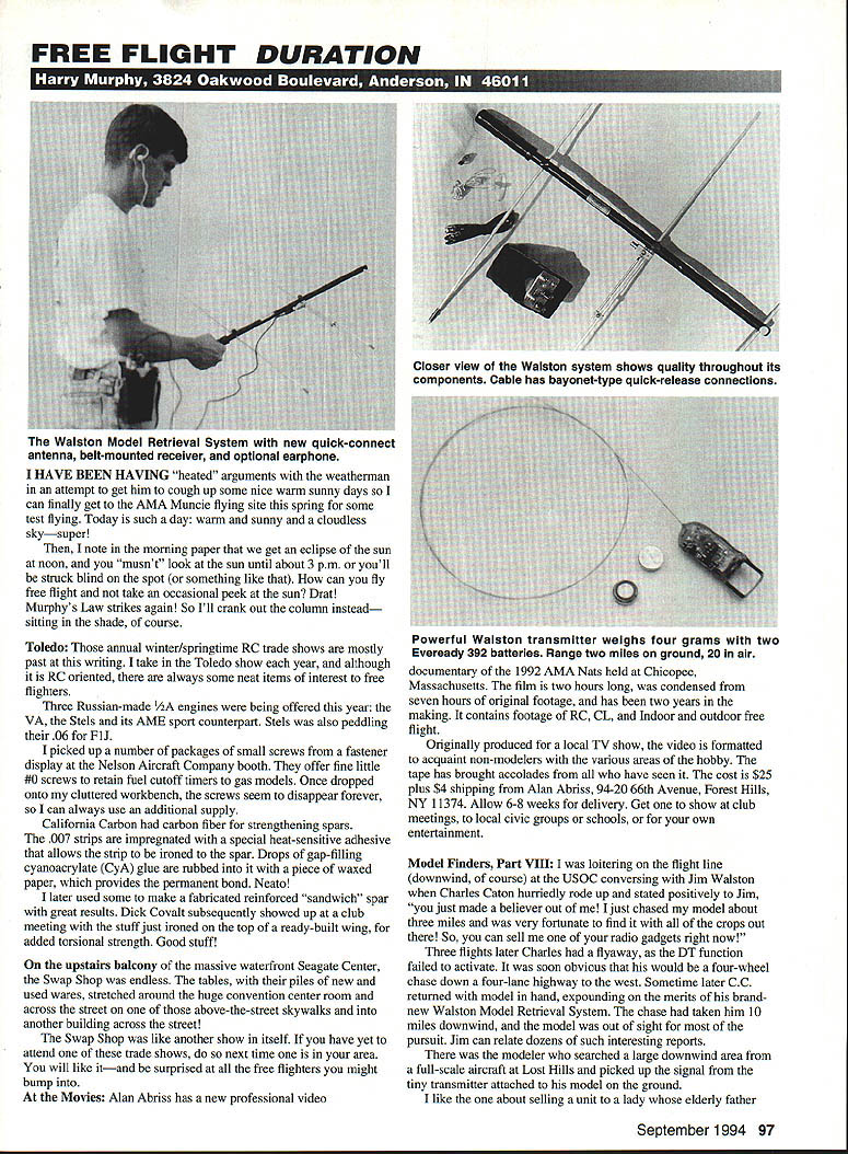 FREE FLIGHT DURATION HAVE BEEN HAVING heated arguments weatherman attempt get him cough up some nice warm sunny days can finally get AMA Muncie flying site spring some test flying Today such day warm sunny cloudless skysuper note morning paper get eclipse sun noon musnt look sun until about 3 pm youll struck blind spot something like can fly free flight take occasional peek sun Drat Murphys Law strikes again So Ill crank out column instead sitting shade course Toledo annual winter/springtime RC trade shows mostly past writing take Toledo show year although RC oriented always some neat items interest free fighters Three Russian-made 1/2A engines being offered year VA Stels its AIvIE sport counterpart Stels also peddling 06 FlJ picked up number packages small screws fastener display Nelson Aircraft Company booth offer fine little #0 screws retain fuel cutoff timers gas models Once dropped onto cluttered workbench screws seem disappear forever can always use additional supply California Carbon carbon fiber strengthening spars 007 strips impregnated special heat-sensitive adhesive allows strip ironed spar Drops gap-filling cyanoacrylate CyA glue rubbed piece waxed paper provides permanent bond Neato later used some make fabricated reinforced sandwich spar great results Dick Covalt subsequently showed up club meeting stuff just ironed top ready-built wing added torsional strength Good stuff upstairs balcony massive waterfront Seagate Center Swap Shop endless tables piles new used wares stretched around huge convention center room across street above-the-street skywalks another building across street Swap Shop like another show itself have yet attend trade shows next time area will like itand surprised free fighters might bump Movies Alan Abriss has new professional video Powerful Waiston transmitter weighs tour grams two Eveready 392 batteries Range two miles ground 20 air documentary 1992 AMA Nats held Chicopee Massachusetts film two hours long condensed seven hours original footage has two years making contains footage RC CL Indoor outdoor free flight Originally produced local TV show video formatted acquaint non-modelers various areas hobby tape has brought accolades have seen cost $25 plus $4 shipping Alan Abriss 94-2066th Avenue Forest Hills NY 11374 Allow 6-8 weeks delivery Get show club meetings local civic groups schools own entertainment Model Finders Part VIII loitering flight line downwind course USOC conversing Jim Waiston Charles Caton hurriedly rode up stated positively Jim just made believer out just chased model about three miles very fortunate find crops out So can sell radio gadgets right now Three flights later Charles flyaway DT function failed activate soon obvious would four-wheel chase down four-lane highway west Sometime later CC returned model hand expounding merits brandnew Walston Model Retrieval System chase taken him 10 miles downwind model out sight pursuit Jim can relate dozens such interesting reports modeler searched large downwind area full-scale aircraft Lost Hills picked up signal tiny transmitter attached model ground like about selling unit lady elderly father September 1994 97 Waiston Model Retrieval System new quick-connect antenna belt-mounted receiver optional earphone Closer view Waiston system shows quality throughout its components Cable has bayonet-type quick-release connections kept running away rest home simply sewed transmitter lining clothes next time ventured out staff little difficulty locating wandering gentleman Lawrenceville few years ago noticed large gas model drifting deep ocean head-high corn behind stepped out open after retrieving own model sea green As rounded bend perimeter trail another flier approaching holding familiar Walston antenna front him like divining rod Thinking might help him some queried looking large gas job As trudged answered no Gollywock Obviously model size weight hardly influenced diminutive onboard transmitter tips scales four grams However have yet see hand-launched glider must assume has its limitations somewhere Jims model finder new sport has use some time Its highly regarded its effectiveness easily installed lightweight transmitter versatility removal transferring other models 20-mile air range twomile ground-range quite accurate directional antenna plus potted transmitter virtually crashproof waterproof Improvements have ongoing receiver presently uses standard low-cost AA penlight batteries new compact sturdier effective quick-connect antenna supplied new units describes Standard 3-channel receiver however additional receiver options available 10 64 200 channels Obviously price goes up increased number channels As costs often vary time other factors send SASE Jim receive latest pricing writing price $334 Standard receiver price tags 10- 64- 200-channel models escalating respectively three-element quick-connect antenna nylon canying case $79 original folding antenna option case $103 miniature transmitters $135 incorporates about 18 inches bralded wire cable its antenna Jim recommends buying least two transmitters different channels best utility No systems inexpensive Jim states makes absolutely no sense spend hours building model test drive long distance contest just lose good model-finder system adds new dimension chase phase just like introduction chase bike did some years ago Dropping model cornfield little consequence can retrieved minutes can return flight line relatively short time Downwind obstacles much less problem overfly conditions loom such dense crops wooded areas housing projects swamps whatever age marathon flyoff flights events just getting back flight line reasonable time can contribute whether win lose becomes important move closer iIcorporating round Y&O props back B-Y&Os Clarence Bull offers quality props diameters eight 24 inches system competing FAI events Like anything else user must assess can get biggest bang buck low-cost audio model finder device up expensive electronic system