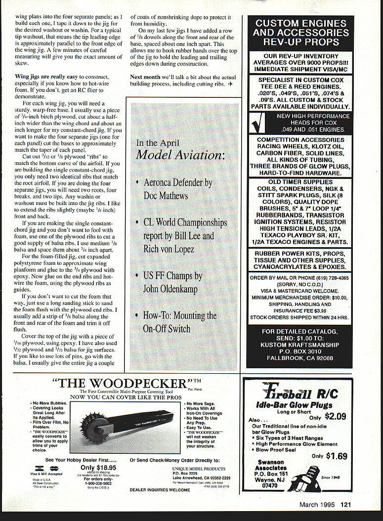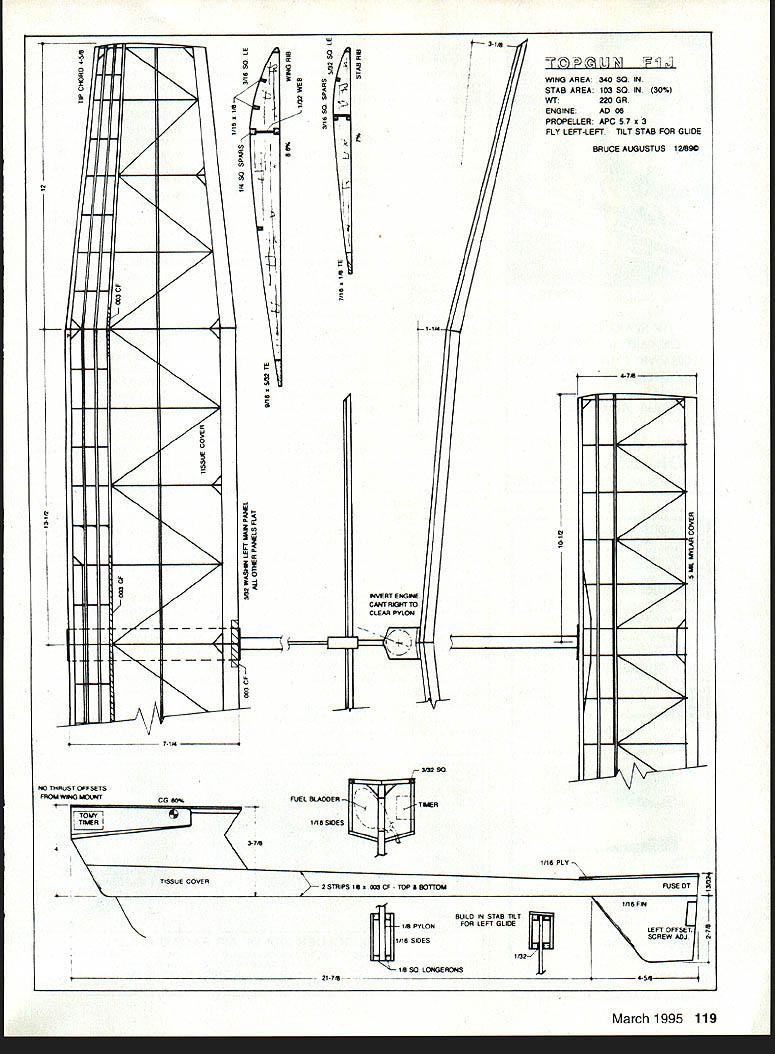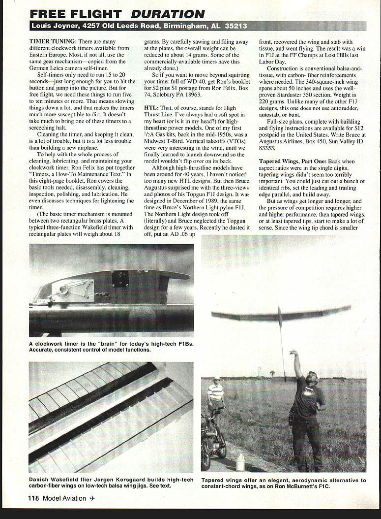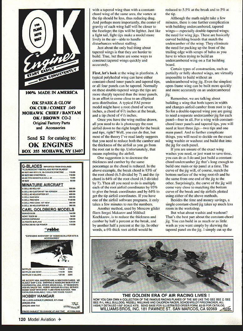 FREE FLIGHT DURATION TIMER TUNING different clockwork timers available Eastern Europe Most use same gear mechanismcopied German Leica camera self-timer Self-timers need run 15 20 secondsjust long enough hit hutton jump picture free flight need things run five ten minutes means slowing things down lot makes timers much susceptible dirt doesnt take much bring timers screeching halt Cleaning timer keeping clean lot trouble lot less trouble building new airplane help whole process cleaning lubricating maintaining clockwork timer Ron Felix has put together Timers How-To Maintenance Text eight-page booklet Ron covers basic tools needed disassembly cleaning inspection polishing lubrication discusses techniques lightening timer basic timer mechanism mounted between two rectangular brass plates typical three-function Wakefield timer rectangular plates will weigh about 18 grams carefully sawing filing away plates overall weight can reduced about 14 grams Some commercially-available timers have already done So want move beyond squirting timer full WD-40 get Rons booklet $2 plus $1 postage Ron Felix Box 74 Solebury PA 18963 HTL course stands High Thrust Line Ive always soft spot heart head high thrustline power models first /2A Gas kits back mid-1950s Midwest T-Bird Vertical takeoffs VTOs very interesting wind until finally learned launch downwind model wouldnt flip over its back Although high-thrustline models have around 40 years havent noticed too new HTL designs Bruce Augustus surprised three-views photos Topgun FlJ design designed December 1989 same time Bruces Northern Light pylon FlJ Northern Light design took off literally Bruce neglected Topgun design few years Recently dusted off put AD 06 up front recovered wing stab tissue went flying result win FlJ FF Champs Lost Hills last Labor Day Construction conventional balsa-andtissue carbon- fiber reinforcements needed 340-square-inch wing spans about 50 inches uses wellproven Starduster 350 section Weight 220 grams Unlike other F1J designs does use autorudder autostab bunt Full-size plans complete building flying instructions available $12 postpaid United States Write Bruce Augustus Airlines Box 450 Sun Valley ID 83353 Tapered Wings Part Back aspect ratios single digits tapering wings didnt seem too terribly important could just cut out bunch identical ribs set leading trailing edge parallel build away wings get longer longer pressure competition requires higher higher performance tapered wings least tapered tips start make lot sense Since wing tip chord smaller 118 Model Aviation kwork timer brain todays high-tech FiBs Accurate consistent control model functions Danish Wakefield flier Jorgen Korsgaard builds high-tech carbon-fiber wings low-tech balsa wing jigs See text Tapered wings offer elegant aerodynamic alternative constant-chord wings Ron McBurnetts FiG fun will ff1111 IHIi 111111 14p ffli [I liii 0 JUL tt 21 K 4 N 0 U 7 N 0 1 Emj 1114 UIWRTENOW4E CLEAR PYLON N___________ 1 WING AREA 340 SO IN STAB AREA 103 SO IN 30% WT220 GR ENGINEAD 06 PROPELLER APC 57 x 3 FLY LEFT-LEFT TILT STAB FOR GLIDE BRUCE AUGUSTUS 12M9C 2 S-ill C r H1ADOER TER II\1PLU I/Il SICES TOEIY TIEER 37 TISSUE COVER2SThIPSIg ISIS CFTtPABOTTOtd 21-ill--- ill PYLON 1116 SIDES ill SO LONGERONS IllS PLY BUD N STAB T T FOR EFIG CE IIiHI T FUSE OT] 1116 FIN LEFT OFFSET March1995 119 1143 T1IRUST OFFSETS FRO14 WING NGINIT CG 10% OK SPARK & GLOW OK CUB COMET 049 MOHAWK CHIEF/ BANTAM OK BROWN CO-2 Onginal Factoty Parts Accessories Send $2 catalog OK ENGINES BOX 355 MOHAWK NY 13407 tapered wing constantchord wing same area vortex tip should less thus reducing drag perhaps importantly center gravity wing half will closer fuselage tips will lighter Just like light tail light tips make model lively airable handle disturbances stalling Just about bad thing about tapered wings harder build True some ways construct tapered wings quickly accurately First lets look wing planform typical polyhedral wing can have either constant-chord inner panels tapered tips four panels can tapered Normally double-tapered wings tips sharply tapered inner panels effort come close elliptical area distribution typical FAI power model might have root chord seven inches chord 61/2 inches break tip chord 4/2 inches Once have wing outline drawn need photocopy root airfoil down right length break tips right Well can theory Ive read lately suggests need reduce both camber thickness airfoil go root out tip Unfortunately means replotting airfoil suggestion decrease thickness camber same percentage chord reduced above example break chord 93% root chord 65 divided 7 tip chord 64% root chord 45 divided 7 need multiply root airfoil coordinates 93% give break coordinates 64% get tip airfoil coordinates have airfoil software programs takes few minutes run numbers Another method used Moscow glider fliers Sergei Makarov Mikhail Kochkarov reduce thickness camber half percent break another half percent tip other words 6% thick root airfoil would reduced 55% break 5% tip Although math might take few minutes further complication building undercambered tapered wings especially double-tapered wings need wing jigs basically curved building boards match undercamber wing eliminate need packing up front trailing edge scraps balsa have trying build undercambered wing flat building board Certain types construction such partially fully sheeted wings virtually impossible build undercambered wing jig simplest open-frame wing can built quickly accurately undercambered jig Remember talking about building wing both tapers width changes airfoil camber root tip So double-tapered wing going need separate undercamber jig panelfour wing constantchord inner panels tapered tips will need least three jigstwo tips main panel further complicate things will need decide exact wing washin washout build jig panel unsure exact wing washes need just want save time can just build constantchord undercamber jig thats long enough build main tip panel time curve