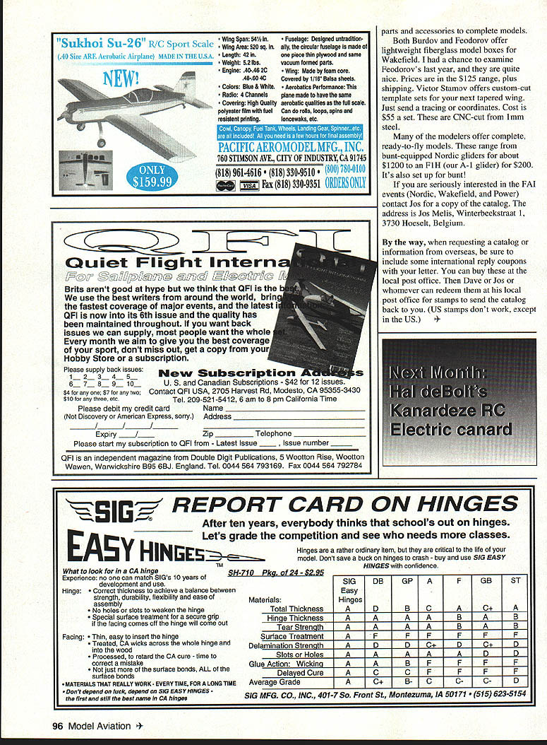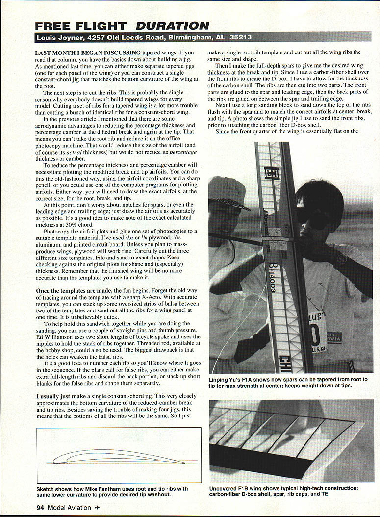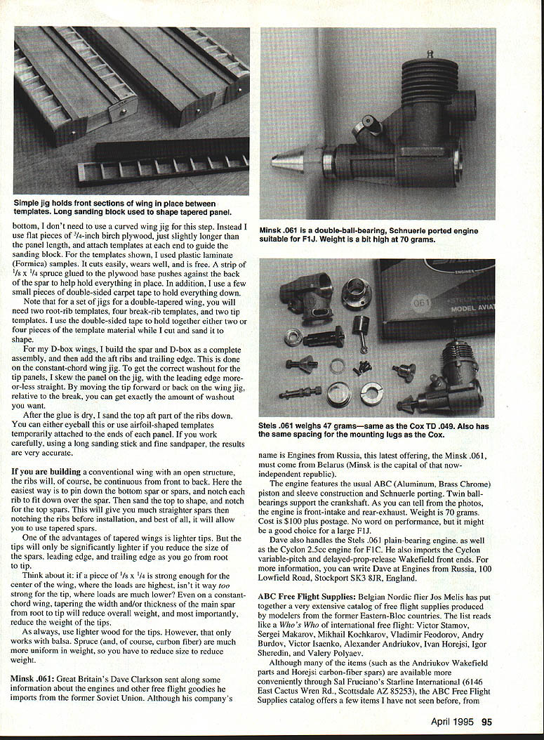 FREE FLIGHT DURATION LAST MONTH BEGAN DISCUSSING tapered wings read column have basics down about building jig As mentioned last time can either make separate tapered jigs panel wing can construct single constant-chord jig matches bottom curvature wing root next step cut ribs probably single reason everybody doesnt build tapered wings model Cutting set ribs tapered wing lot trouble cutting bunch identical ribs constant-chord wing previous article mentioned some aerodynamic advantages reducing percentage thickness percentage camber dihedral break again tip means cant take root rib reduce office photocopy machine would reduce size airfoil course its actual thickness would reduce its percentage thickness camber reduce percentage thickness percentage camber will necessitate plotting modified break tip airfoils can old-fashioned way using airfoil coordinates sharp pencil could use computer programs plotting airfoils Either way will need draw exact airfoils correct size root break tip point dont worry about notches spars leading edge trailing edge just draw airfoils accurately possible Its good idea make note exact calculated thickness 30% chord Photocopy airfoil plots glue set photocopies suitable template material Ive used /32 1/ plywood 1/16 aluminum printed circuit board Unless plan massproduce wings plywood will work fine Carefully cut three different size templates File sand exact shape Keep checking against original plots shape especially thickness Remember finished wing will no accurate templates use make Once templates made fun begins Forget old way tracing around template sharp X-Acto accurate templates can stack up some oversized strips balsa between two templates sand out ribs wing panel time unbelievably quick help hold sandwich together doing sanding can use couple straight pins thumb pressure Ed Williamson uses two short lengths bicycle spoke uses nipples hold stack ribs together Threaded rod available hobby shop could also used biggest drawback holes can weaken balsa ribs Its good idea number rib youll know goes sequence plans call false ribs can either make extra full-length ribs discard back portion stack up short blanks false ribs shape separately usually just make single constant-chord jig very closely approximates bottom curvature reduced-camber break tip ribs Besides saving trouble making four jigs means bottoms ribs will same So just Sketch shows Mike Fantham uses root tip ribs same lower curvature provide desired tip washout make single root rib template cut out wing ribs same size shape make full-depth spars give desired wing thickness break tip Since use carbon-fiber shell over front ribs create D-box have allow thickness carbon shell ribs cut two parts front parts glued spar leading edge back parts ribs glued between spar trailing edge Next use long sanding block sand down top ribs flush spar match correct airfoils center break tip photo shows simple jig use sand front ribs prior attaching carbon fiber D-box shell Since front quarter wing essentially flat 94 Model Aviation ing Yus FlA shows spars can tapered root tip max strength center keeps weight down tips Uncovered Fl B wing shows typical high-tech construction carbon-fiber D-box shell spar rib caps TE bottom dont need use curved wing jig step Instead use flat pieces 3/4-inch birch plywood just slightly longer panel length attach templates end guide sanding block templates shown used plastic laminate Formica samples cuts easily wears well free strip 1/5 x 1/4 spruce glued plywood base pushes against back spar help hold everything place addition use few small pieces double-sided carpet tape hold everything down Note set jigs double-tapered wing will need two root-rib templates four break-rib templates two tip templates use double-sided tape hold together either two four pieces template material cut sand shape D-box wings build spar D-box complete assembly add aft ribs trailing edge done constant-chord wing jig get correct washout tip panels skew panel jig leading edge moreor-less straight moving tip forward back wing jig relative break can get exactly amount washout want After glue dry sand top aft part ribs down can either eyeball use airfoil-shaped templates temporarily attached ends panel work carefully using long sanding stick fine sandpaper results very accurate building conventional wing open structure ribs will course continuous front back easiest way pin down bottom spar spars notch rib fit down over spar sand top shape notch top spars will give much straighter spars notching ribs before installation best will allow use tapered spars advantages tapered wings lighter tips tips will significantly lighter reduce size spars leading edge trailing edge go root tip Think about piece /s x 1/4 strong enough center wing loads highest isnt way too strong tip loads much lower constantchord wing tapering width andlor thickness main spar root tip will reduce overall weight importantly reduce weight tips As always use lighter wood tips However works balsa Spruce course carbon fiber much uniform weight have reduce size reduce weight Minsk 061 Great Britains Dave Clarkson sent along some information about engines other free flight goodies imports former Soviet Union Although companys name Engines Russia latest offering Minsk 061 must come Belarus Minsk capital nowindependent republic engine features usual ABC Aluminum Brass Chrome piston sleeve construction Schnuerle porting Twin ballbearings support crankshaft As can tell photos engine front-intake rear-exhaust Weight 70 grams Cost $100 plus postage No word performance might good choice large FlJ Dave also handles Stels 061 plain-bearing engine well Cyclon 25cc engine FlC also imports Cyclon variable-pitch delayed-prop-release Wakefield front ends information can write Dave Engines Russia 100 Lowfield Road Stockport 5K3 8JR England ABC Free Flight Supplies Belgian Nordic flier Jos Melis has put together very extensive catalog free flight supplies produced modeters former 