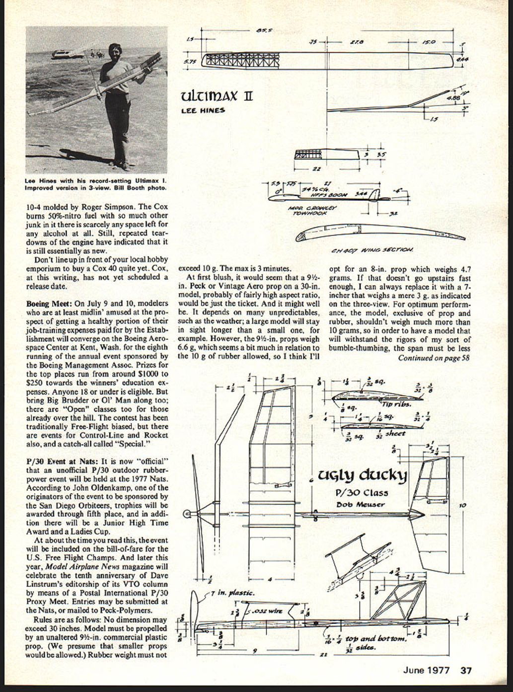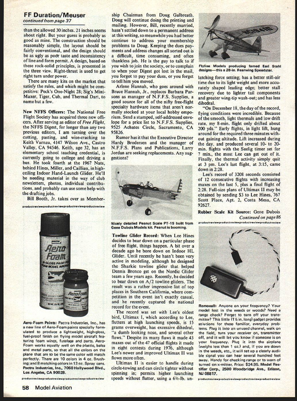 Duralion f0 Bob Meuser GYSOB It has around now some eight years Ed Bellingers prototype its still half cured epoxy finish still flying taking trophy now again Despite few have built models arent kitted published built large numbersit has man aged accumulate rather impressive track record West its July 1976 issue however Model Builder magazine presented construction article about Gysob should seeing few full-size plans order No7763 M B Plans Service 621 West 19th St Costa Mesa CA 92627 Price $400 3rd Class postage paid plus 45 1st Class postage plus 6% California resi dents Recently former FAI Power team member Doug Galbreath decided try some big stuff acquired prototype Cox 40 elected use Gysob pur pose applied few FAI-Power standard tricks ran off both Category Category II Class C records Doug uses timer-operated auto-rudder auto-stabilizer set-up typical FAI Power models re-trim model after power cuts Doug claims trimming big over-powered machine like auto surfaces easier trimming Half-A mentioned Doug llj 4--lz tried sell local FAI Power flier virtues silence electric propulsion responded Man dont make lotta noise aint no fun Doug allowed lot truth hear racket feel tug hot 40 really know have couple hands full horsepower Doug incidentally wears Mickey Mouse ear protectors sensible power fliers nowadays Doug claims flying big Gysob has fun total previous modeling experience has put up around 150 flights Gysob burned out about five special Cox glowplugs process leaned out too much has flown flights using same prop fiberglass replica Graupner 50L HT 4 SIDES9 4 SHTHT pI\J~Q16QSPII Ed Bc/lingers848 C/a3s Ctcords Cat land if_________________ bjf Doug Qaibreath_____ 36 Model Aviation I Above Here turning loose Cox 40 Gysob its record flights see text Doug Galbreath has around 150 flights model Right New Cox 40 yet released powered Gysob two Class C free-flight records 85 /5 71 uLtmn2Ax II LEE HINES 71 K7II -1 EEZ7 I7/5 K ZZ ii 10-4 molded Roger Simpson Cox burns 50%-nitro fuel much other junk scarcely space left alcohol Still repeated teardowns engine have indicated still essentially new Dont line up front local hobby emporium buy Cox 40 quite yet Cox writing has yet scheduled release date Boeing Meet July 9 10 modelers least midlin amused pro spect getting healthy portion job-training expenses paid Estab lishment will converge Boeing Aero space Center Kent Wash eighth running annual event sponsored Boeing Management Assoc Prizes top places run around $1000 $250 towards winners education ex penses Anyone 18 under eligible bring Big Brudder 01 Man along too Open classes too already over hill contest has traditionally Free-Flight biased events Control-Line Rocket also catch-all called Special P/30 Event Nats now official unofficial P/30 outdoor rubberpower event will held 1977 Nats According John Oldenkamp originators event sponsored San Diego Orbiteers trophies will awarded through fifth place addi tion will Junior High Time Award Ladies Cup about time read event will included bill-of-fare US Free Flight Champs later year Model Airplane News magazine will celebrate tenth anniversary Dave Linstrums editorship its VTO column means Postal International P/30 Proxy Meet Entries may submitted Nats mailed Peck-Polymers Rules follows No dimension may exceed 30 inches Model must propelled t unaltered 9-in commercial plastic 8 prop presume smaller props would allowed Rubber weight must Maa oer /47 4-h4/e scr exceed 10g max 3 minutes first blush would seem 9in Peck Vintage Aero prop 30-in model probably fairly high aspect ratio would just ticket might well depends unpredictables such weather large model will stay sight longer small example However 9-in props weigh 66 g seems bit much relation 10 g rubber allowed think Ill 2 rnn k 4 7 Sn- plastic 1 2 1 opt 8-in prop weighs 47 grams doesnt go upstairs fast enough can always replace 7incher weighs mere 3 g indicated three-view optimum perform ance model exclusive prop rubber shouldnt weigh much 10 grams order have model will withstand rigors sort bumble-thumbing span must less Continued page 58 ij1 2sq3 iS 22 -43 IT14 eov bottom. 8 sides 10 June1977 37 Lee Hines record-setting Ultimax Improved version 3-view Bill Booth photo FF Duration/Meuser continued page 37 allowed 30 inches 21 inches seems about right guess probably good construction should reasonably simple layout should fairly conventional design should ugly poor taste inconsistency line form permit design based rock-solid principles presented three view Right-thrust used get right turn under power kits market satisfy rules might com petitive Pecks One-Night 28 Sigs Mini Maxer Tiger Cub Thermal Dart name few New NFFS Officers National Free Right Society has acquired three new offi cers After serving editor Free Flight NFFS Digest longer two previous editors am turning over cutting pasting wise-cracking Keith Vamau 4147 Wilson Ave Castro Valley CA 94546 Keith age 32 has elementary school teaching credential currently going college driving bus took fourth 1967 Nats behind Hines Miller Cailliau highceiling Indoor Hand-Launch Glider Hell needing material way club newsletters photos individual contribu tions probably can use some help drafting jobs Bill Booth Jr takes over MemberAero-Foam Paints Pactra Industries Inc has new line Aero-Foam paints specialty form ulated produce lightweight high-gloss fuel-proof finish flying model aircraft fea turing foam wings fuselage parts Aero Foam works equally well plastic balsa metal parts colors plane same color will match perfectly 10 colors 4 oz Brush ingand8matchingcolorsin l3oz Spray cans Pactra Industries Inc 7060 Hollywood Blvd Los Angeles CA 90028 productreviwproductreviwproducrviewproductrviw ship Chairman Doug Galbreath Doug will continue doing printing mailing However Bill recently married hasnt settled down permanent address writing meanwhile better continue address membership problems Doug Keeping dues pay ments address changes sorted out difficult time