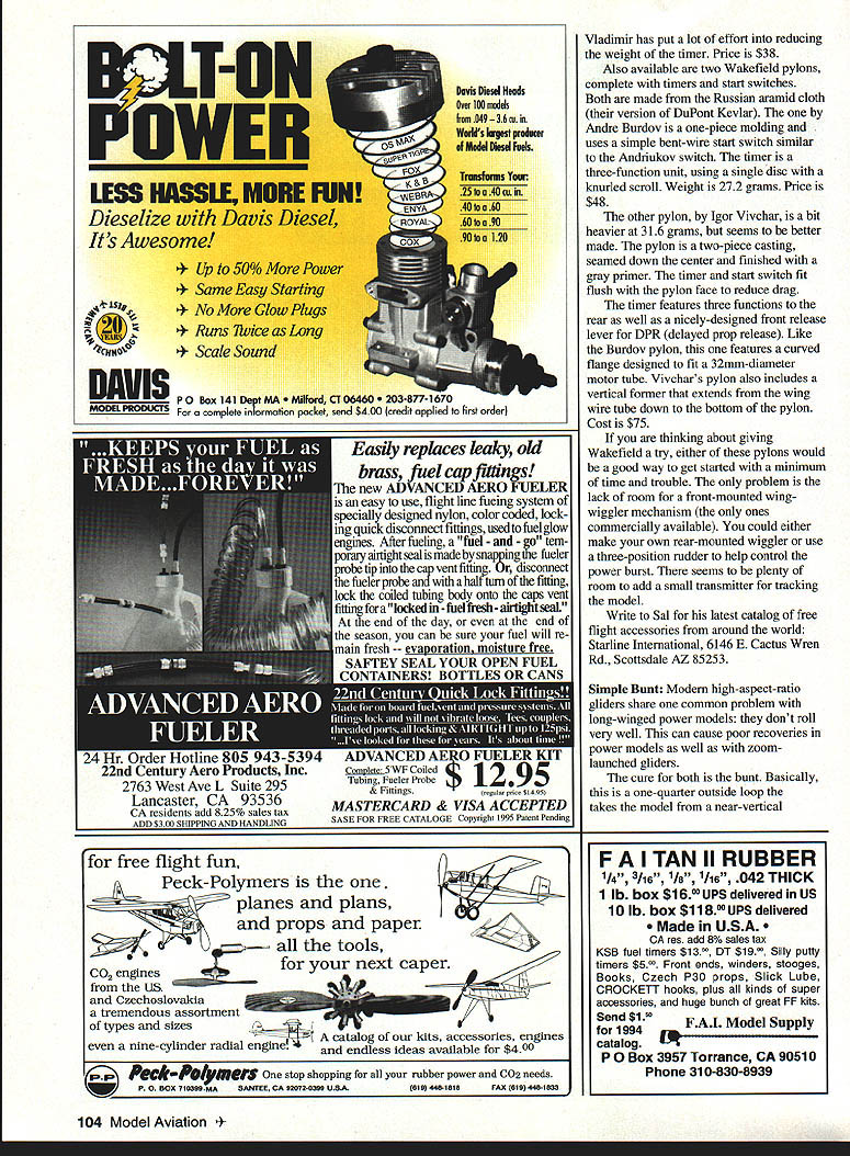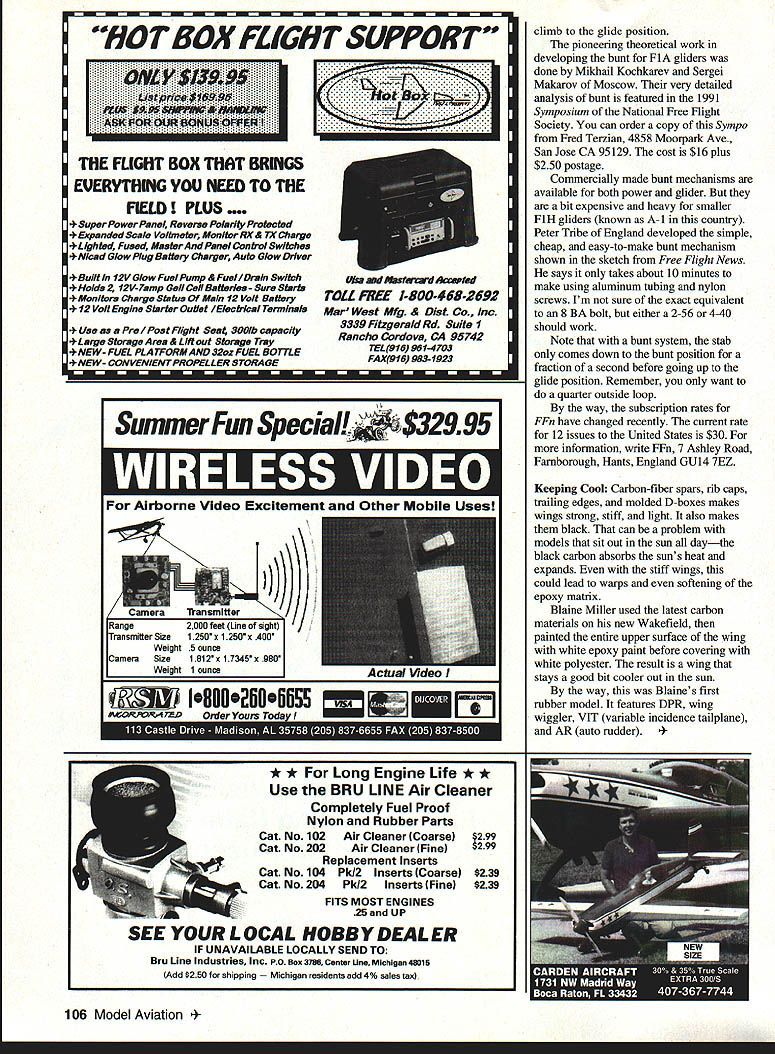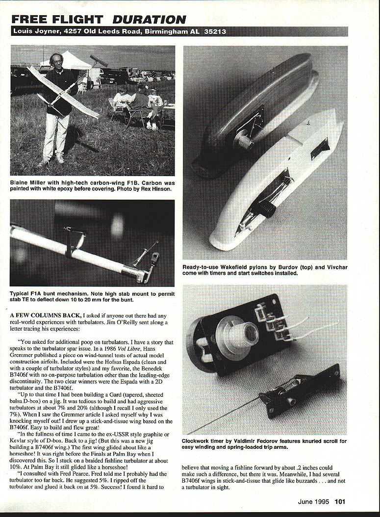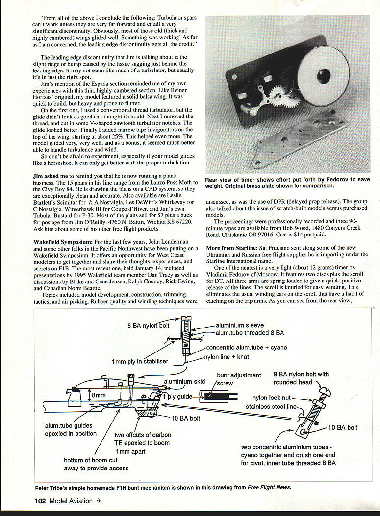 FREE FLIGHT DURATION Typical FlA bunt mechanism Note high stab mount permit stab TE deflect down 10 20 mm bunt FEW COLUMNS BACK asked anyone out real-world experiences turbulators Jim OReilly sent along letter tracing experiences asked additional poop turbulators have story speaks turbulator spar issue 1986 Vol Libre Hans Gremmer published piece wind-tunnel tests actual model construction airfoils Included Hofsas Espada clean couple turbulator styles favorite Benedek B7406f no on-purpose turbulation other leading-edge discontinuity two clear winners Espada 2D turbulator B7406f Up time building Gard tapered sheeted balsa D-box jig tedious build aggressive turbulators about 7% 20% although recall used 7% saw Gremmer article asked myself knocking myself out drew up stick-and-tissue wing based B74O6f Easy build flew great fullness time came ex-USSR style graphite Kevlar style D-box Back jig new jig building B7406f wing first wing glided about like horseshoe right before Finals Palm Bay discovered So stuck bralded fishline turbulator about 10% Palm Bay still glided like horseshoe consulted Fred Pearce Fred told probably turbulator too far back suggested 5% ripped off turbulator glued back 5% Success found hard Clockwork timer Valdimir Fedorov features knurled scroll easy winding spring-loaded trip arms believe moving fishline forward about 2 inches could make such difference Meanwhile several B7406f wings stick-and-tissue glide like buzzards. turbulator sight June1995 101 Blame Miller high-tech carbon-wing FiB Carbon painted white epoxy before covering Photo Rex Hinson Ready-to-use Wakefield pylons Burdov top Vivchar come timers start switches installed above conclude following Turbulator spars cant work unless very far forward entail very significant discontinuity Obviously old thick highly cambered wings glided well Something working As far am concerned leading edge discontinuity gets credit leading edge discontinuity Jim talking about slight ridge bump caused tissue sagging just behind leading edge may seem like much turbulator usually its just right spot Jims mention Espada section reminded own experiences thin highly-cambered section Like Reiner Hoffsas original model featured solid balsa wing quick build heavy prone flutter first used conventional thread turbulator glide didnt look good thought should Next removed thread cut some V-shaped sawtooth turbulator notches glide looked better Finally added narrow tape invigorators top wing starting about 25% helped model glided very very well bonus seemed much better able handle turbulence wind So dont afraid experiment especially model glides like horseshoe can get better proper turbulation Jim asked remind now running plans business 15 plans line range Lanzo Puss Moth Civy Boy 84 drawing plans CAD system exceptionally clean accurate Also available Leslie Bartletts Scimitar 1/2 Nostalgia Les DeWitts Whirlaway C Nostalgia Winterhawk III Coupe dHiver Jims own Tubular Bustard P-30 Most plans sell $7 plus buck postage Jim OReilly 4760 N Battin Wichita KS 67220 Ask him about some other free flight products Wakefield Symposium last few years John Lenderman some other folks Pacific Northwest have putting Wakefield Symposium offers opportunity West Coast modelers get together share thoughts experiences secrets FlB recent held January 14 included presentations 1995 Wakefield team member Dan Tracy well discussions Blake Gene Jensen Ralph Cooney Rick Ewing Canadian Norm Beattie Topics included model development construction trimming tactics air picking Rubber quality winding techniques alumtube guides epoxied position discussed use DPR delayed prop release group also talked about issue scratch-built models versus purchased models proceedings professionally recorded three 90minute tapes available Bob Wood 1480 Conyers Creek Road Clatskanie OR 97016 Cost $14 postpaid Starline Sal Fruciano sent along some new Ukrainian Russian free flight supplies importing under Starline Interuational name neatest very light about 12 grams timer Vladimir Fedorov Moscow features two discs plus scroll DT three arms spring loaded give quick positive release lines scroll knurled easy winding eliminates usual winding ears scroll have habit catching trip arms As can see rear view 8 BA nylon boltaluminium sleeve alumtube threaded 8 BA concentric alumtube o 1mm ply stabiliser n line bunt adjustment8 BA nylon bolt aluminium skidscrewrounded head nylon lock nut... stainless steel line 10 BA bolt 10 BA bolt two offcuts carbon TE epoxied boom 1mm apart bottom boom cut away provide access two concentric aluminium tubes cyano together crush end pivot inner tube threaded 8 BA Peter Tribes simple homemade Fl H bunt mechanism shown drawing Free Flight News 102 Model Aviation view timer shows effort put forth Fedorov save weight Original brass plate shown comparison Easily replaces leaky old brass fuel cap fittings new ADVANCED AERO FUELER easy use flight line fucing system ecially designed nylon color coded lock g quick disconnect fittings used fuel glow ciigines After fueling fuel Ott tern orary airtight seal made snapping fueler obe tipintothecap vent fluin r disconnect fueler prube half turn fitting 4 coiled tubing body onto caps vent gforalockedin -fuelfresh-airtigbtseaL iu end day end season can sure fuel will re nain fresh -- free AIlTIiV Vladimir has put lot effort reducing weight timer Price $38 Also available two Wakefield pylons complete timers start switches Both made Russian aramid cloth version DuPont Kevlar Andre Burdov one-piece molding uses simple bent-wire start switch similar Andriukov switch timer three-function unit using single disc knurled scroll Weight 272 grams Price $48 other pylon Igor Vivchar bit heavier 316 grams seems better made pylon two-piece casting seamed down center finished gray primer timer start switch fit flush pylon face reduce drag timer features three functions rear well nicely-designed front release lever DPR delayed prop release Like Burdov pylo