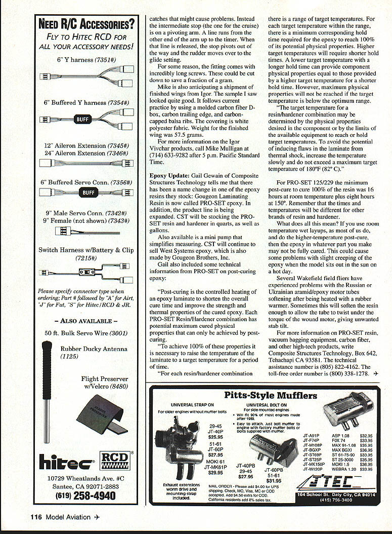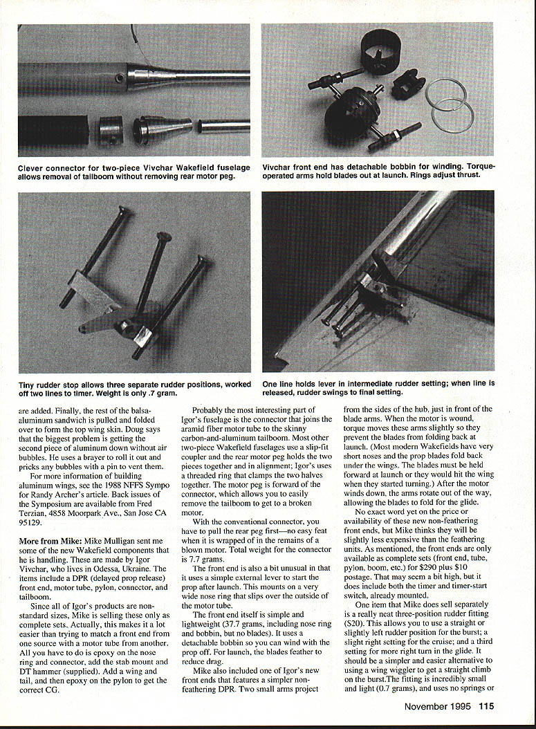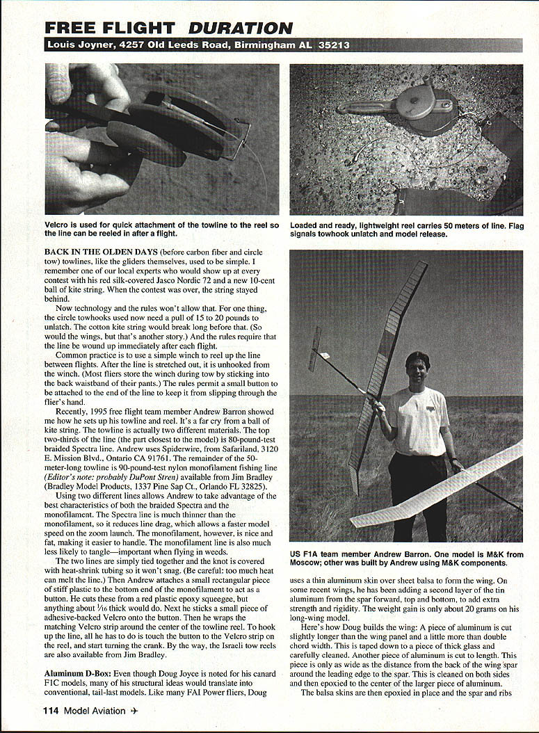 FREE FLIGHT DURATION BACK IN THE OLDEN DAYS before carbon fiber circle tow towlines like gliders themselves used simple remember local experts would show up contest red silk-covered Jasco Nordic 72 new 10-cent ball kite string contest over string stayed behind Now technology rules wont allow thing circle towhooks used now need pull 15 20 pounds unlatch cotton kite string would break long before So would wings thats another story rules require line wound up immediately after flight Common practice use simple winch reel up line between flights After line stretched out unhooked winch Most fliers store winch during tow sticking back waistband pants rules permit small button attached end line keep slipping through fliers hand Recently 1995 free flight team member Andrew Barron showed sets up towline reel Its far cry ball kite string towline actually two different materials top two-thirds line part closest model 80-pound-test braided Spectra line Andrew uses Spiderwire Safariland 3120 E Mission Blvd Ontario CA 91761 remainder 50meter-long towline 90-pound-test nylon monofilament fishing line Editors note probably DuPont Stren available Jim Bradley Bradley Model Products 1337 Pine Sap Ct Orlando FL 32825 Using two different lines ailows Andrew take advantage best characteristics both braided Spectra monofilament Spectra line much thinner monofilament reduces line drag allows faster model speed zoom launch monofilament however nice fat making easier handle monofilament line also much less likely tangleimportant flying weeds two lines simply tied together knot covered heat-shrink tubing wont snag careful too much heat can melt line Andrew attaches small rectangular piece stiff plastic bottom end monofilament act button cuts red plastic epoxy squeegee anything about 46 thick would Next sticks smail piece adhesive-backed Velcro onto button wraps matching Velcro strip around center towline reel hook up line ail has touch button Velcro strip reel start turning crank way Israeli tow reels also available Jim Bradley Aluminum D-Box though Doug Joyce noted canard FiC models structurai ideas would translate conventional tail-last models Like FAI Power fliers Doug uses thin aluminum skin over sheet balsa form wing some recent wings has adding second layer tin aluminum spar forward top bottom add extra strength rigidity weight gain about 20 grams long-wing model Heres Doug builds wing piece aluminum cut slightly longer wing panel little double chord width taped down piece thick glass carefully cleaned Another piece aiuminum cut length piece wide distance back wing spar around leading edge spar cleaned both sides epoxied center larger piece aluminum balsa skins epoxied place spar ribs 114 Model Aviation ro used quick attachment towline reel line can reeled after flight Loaded ready lightweight reel carries 50 meters line Flag signals towhook unlatch model release US FlA team member Andrew Barron model M&K Moscow other built Andrew using M&K components added Finally rest balsaaluminum sandwich pulled folded over form top wing skin Doug says biggest problem getting second piece aluminum down air bubbles uses brayer roll out pricks bubbles pin vent information building aluminum wings see 1988 NFFS Sympo Randy Archers article Back issues Symposium available Fred Terzian 4858 Moorpark Ave San Jose CA 95129 Mike Mike Mulligan sent some new Wakefield components handling made Igor Vivchar lives Odessa Ukraine items include DPR delayed prop release front end motor tube pylon connector tailboom Since Igor s products non standard sizes Mike selling complete sets. Actually makes lot easier trying match front end source motor tube another have epoxy nose ring connector add stab mount DT hammer supplied Add wing tail epoxy pylon get correct CG Probably interesting part Igors fuselage connector joins aramid fiber motor tube skinny carbon-and-aiuminum tailboom Most other two-piece Wakefield fuselages use slip-fit coupler rear motor peg holds two pieces together alignment Igors uses threaded ring clamps two halves together motor peg forward connector ailows easily remove tailboom get broken motor conventional connector have pull rear peg firstno easy feat wrapped remains blown motor Totai weight connector 77 grams front end also bit unusual uses simple external lever start prop after launch mounts very wide nose ring slips over outside motor tube front end itself simple lightweight 377 grams including nose ring bobbin no blades uses detachable bobbin can wind prop off launch blades feather reduce drag Mike also included Igors new front ends features simpler nonfeathering DPR Two small arms project sides hub just front blade arms motor wound torque moves arms slightly prevent blades folding back launch Most modern Wakefields have very short noses prop blades fold back under wings blades must held forward launch would hit wing started turning After motor winds down arms rotate out way allowing blades fold glide No exact word yet price availability new non-feathering front ends Mike thinks will slightly less expensive feathering units As mentioned front ends available complete sets front end tube pylon boom etc $290 plus $10 postage may seem bit high does include both timer timer-start switch already mounted item Mike does sell separately really neat three-position rudder fitting $20 allows use straight slightly left rudder position burst slight right setting cruise third setting right turn glide should simpler easier alternative using wing wiggler get straight climb burstThe fitting incredibly small light 07 grams uses no springs November1995 115 U Clever connector two-piece Vivchar Wakefield fuselage allows removal tailboom removing rear motor peg Vivchar front end has detachable bobbin winding Torque operated arms hold blades out launch Rings adjust thrust Tiny rudder stop allows three separate rudder positions worked line holds lever intermediate rudder setting line off two lines timer Weight 7 gram released rudder swings f