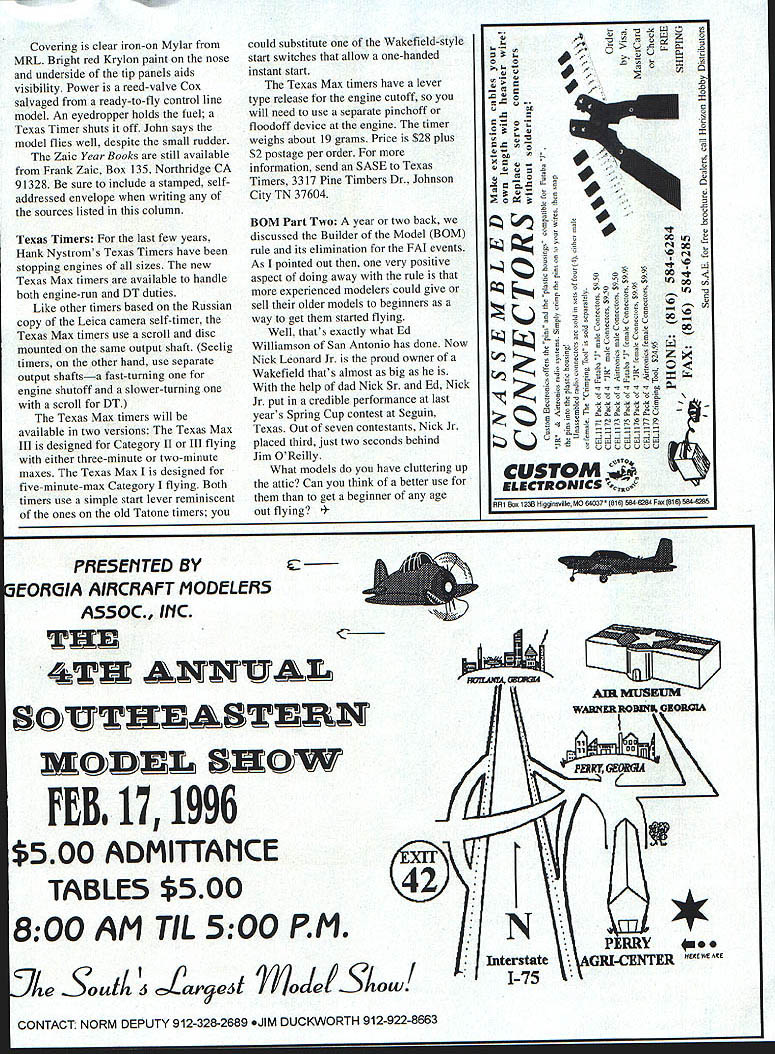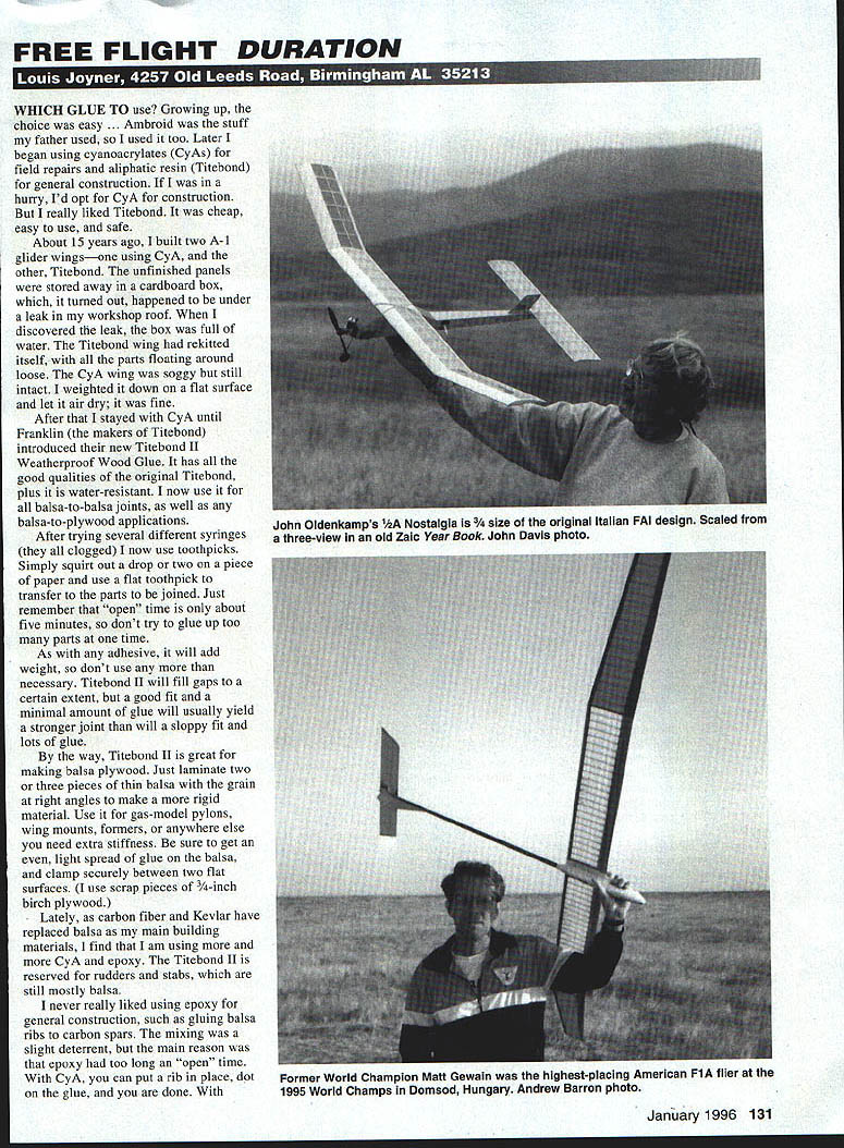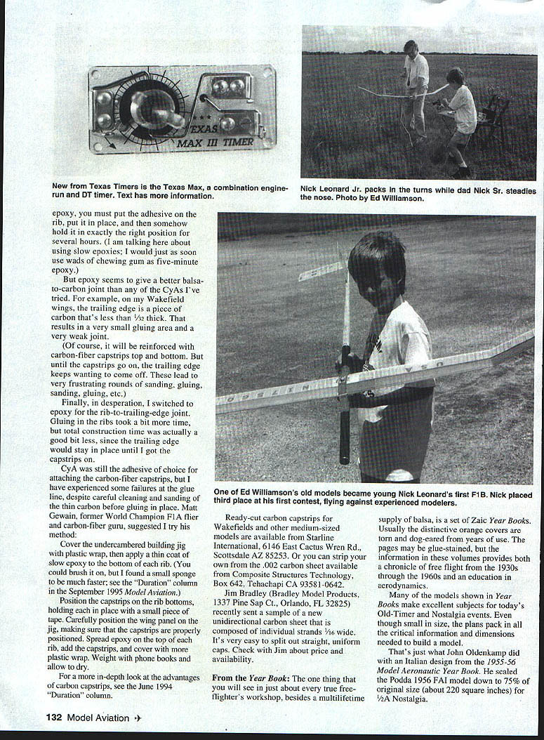 FREE FLIGHT DURATION WHICH GLUE TO use Growing up choice easy . Ambroid stuff father used used too Later began using cyanoacrylates CyAs field repairs aliphatic resin Titebond general construction hurry Id opt CyA construction really liked Titebond cheap easy use safe About 15 years ago built two A-i glider wingsone using CyA other Titebond unfinished panels stored away cardboard box turned out happened under leak workshop roof discovered leak box full water Titebond wing rekitted itself parts floating around loose CyA wing soggy still intact weighted down flat surface let air dry fine After stayed CyA until Franklin makers Titebond introduced new Titebond II Weatherproof Wood Glue has good qualities original Titebond plus water-resistant now use balsa-to-balsa joints well balsa-to-plywood applications After trying several different syringes clogged now use toothpicks Simply squirt out drop two piece paper use flat toothpick transfer parts joined Just remember open time about five minutes dont try glue up too parts time As adhesive will add weight dont use necessary Titebond II will fill gaps certain extent good fit minimal amount glue will usually yield stronger joint will sloppy fit lots glue way Titebond II great making balsa plywood Just laminate two three pieces thin balsa grain right angles make rigid material Use gas-model pylons wing mounts formers anywhere else need extra stiffness sure get light spread glue balsa clamp securely between two flat surfaces use scrap pieces 3/4-inch birch plywood Lately carbon fiber Kevlar have replaced balsa main building materials find am using more CyA epoxy Titebond II reserved rudders stabs still mostly balsa never really liked using epoxy general construction such gluing balsa ribs carbon spars mixing slight deterrent main reason epoxy too long 'open~ time CyA can put rib place dot glue done January 1996 131 John Oldenkamps Nostalgia original Italian FAI design Scaled three-view old Zaic Year Book John Davis photo Former World Champion Mall Gewain highest-placing American FlA flier 1995 World Champs Domsod Hungary Andrew Barron photo epoxy must put adhesive rib put place somehow hold exactly right position several hours am talking about using slow epoxies would just soon use wads chewing gum five-minute epoxy epoxy seems give better balsato-carbon joint CyAs Ive tried example Wakefield wings trailing edge piece carbon thats less /32 thick results very small gluing area very weak joint course will reinforced carbon-fiber capstrips top bottom until capstrips go trailing edge keeps wanting come off lead very frustrating rounds sanding gluing sanding gluing etc Finally desperation switched epoxy rib-to-trailing-edge joint Gluing ribs took bit time total construction time actually good bit less since trailing edge would stay place until got capstrips CyA still adhesive choice attaching carbon-fiber capstrips have experienced some failures glue line despite careful cleaning sanding thin carbon before gluing place Matt Gewain former World Champion FlA flier carbon-fiber guru suggested try method Cover undercambered building jig plastic wrap apply thin coat slow epoxy bottom rib could brush found small sponge much faster see Duration column September 1995 ModelAviation Position capstrips rib bottoms holding place small piece tape Carefully position wing panel jig making sure capstrips properly positioned Spread epoxy top rib add capstrips cover plastic wrap Weight phone books allow dry in-depth look advantages carbon capstrips see June 1994 Duration column Ready-cut carbon capstrips Wakefields other medium-sized models available Starline International 6146 East Cactus Wren Rd Scottsdale AZ 85253 can strip own 002 carbon sheet available Composite Structures Technology Box 642 Tehachapi CA 93581-0642 Jim Bradley Bradley Model Products 1337 Pine Sap Ct Orlando FL 32825 recently sent sample new unidirectional carbon sheet composed individual strands A6 wide Its very easy split out straight uniform caps Check Jim about price availability Year Book thing will see just about true free fighters workshop besides multilifetime supply balsa set Zaic Year Books Usually distinctive orange covers torn dog-eared years use pages may glue-stained information volumes provides both chronicle free flight 1 930s through 1 960s education aerodynamics models shown Year Books make excellent subjects todays Old-Timer Nostalgia events though small size plans pack critical information dimensions needed build model Thats just what John Oldenkamp did Italian design 1955-56 Model Aeronautic Year Book scaled Podda 1956 FAI model down 75% original size about 220 square inches 1/2A Nostalgia 132 Model Aviation Texas Timers Texas Max combination enginerun DT timer Text has information Nick Leonard Jr packs turns dad Nick Sr steadies nose Photo Ed Williamson Ed Williamsons old models became young Nick Leonards first Fl B Nick placed third place first contest flying against experienced modelers Covering clear iron-on Mylar MRL Bright red Krylon paint nose underside tip panels aids visibility Power reed-valve Cox salvaged ready-to-fly control line model An eyedropper holds fuel Texas Timer shuts off John says model flies well despite small rudder Zaic Year Books still available Frank Zaic Box 135 Northridge CA 91328 sure include stamped selfaddressed envelope writing sources listed column Texas Timers last few years Hank Nystroms Texas Timers have stopping engines sizes new Texas Max timers available handle both engine-run DT duties Like other timers based Russian copy Leica camera self-timer Texas Max timers use scroll disc mounted same output shaft Seelig timers other hand use separate output shaftsa fast-turning engine shutoff slower-turning scroll DT Texas Max timers will available two versions Texas Max III designed Category II III flying either three-minute two-minute maxes Texas Max designed five-minute-max Category flying Both timers use simple start lever reminiscent ones old T