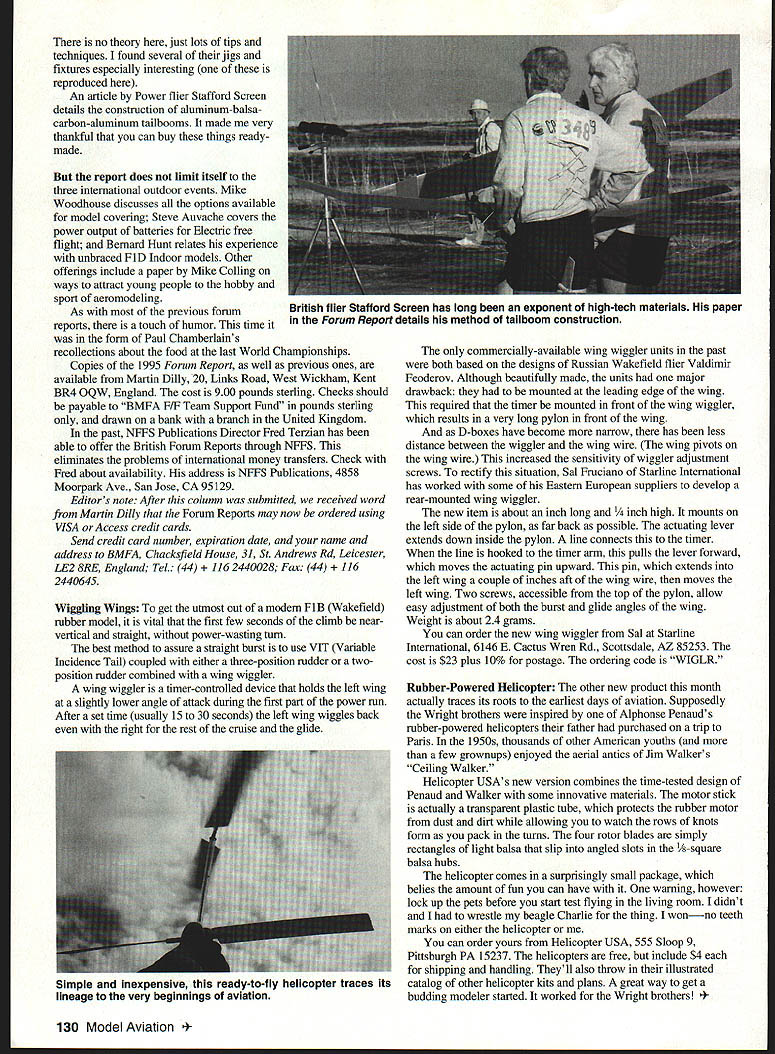 FREE FLIGHT DURATION SHOW OFF PART TWO Last month column featured threeview drawings Frank Ehlings Show Off 1953-vintage FAI Power model Its attractive design looks like could make potent Nostalgia model find out bit about model went right source sent letter off Frank Heres reply Dear Louis name Joe Harris antI Jam happy answer letter Frank because Noifolk VA competing FAI good friend Carl Wheeley remember well because first time lever met Frank Show Off vastly underpowered Cub glide good like Civy Boy truly best elimination Frank USA-minded wanted US engine other 15 engine available Thimble Drome car engine modified aircraft use owned Darrel Dalgner lost overrun Frank just missed making team am pleased someone has found three-view wont sorry building model has impressed Sweet 15 asked Frank about corrections said no keep light model covered light silkspan given 5 7 coats nitrate dope colored yellow aniline dye dissolved alcohol applied cotton ball coat ofhotfuel proofer over whole model may have engine mind would use early OS Max lSs Frank says later put Oliver Cub 09 diesel model said did quite well powerful 091 ever ran impressed designed couple models using thinking case wondering am am Joseph W Harris 1953 FAI Nordic team lam good friend Franks have taken care him since stroke memory good has very poor sight try help him some model projects interpretations what trying say loses something may may have seen Franks original models fantastic Chet Lanzo told once always impressed Franks models get set plans finished please send picture model hope letter last months plan will get lots folks inspired build Show Off kick things off Jim OReilly has offered draw up full-sized plans Show Off sufficient interest Drop Jim line 213 Wyndmere Place Garden Accurate building often requires special jigs such sanding spar web correct height angle City GA 31408 Check last months column about Jims excellent CADdrawn plans found interesting notes remarks Frank Joe made small three-view sent two words change engine arrow pointing Cub 14 readers build Show Off please drop snapshot Ill run first column send rest along Line connects long lever timer Frank Joeline released spring-loaded pin moves wing glide position British Free Flight Forum Martin Dilly sent along copy latest Free Flight Forum Report Now its eleventh year Forum Reports British equivalent own NFFS Sympos Forum Reports means raising necessary travel funding send British national teams World European free flight championships addition provide wealth in-depth information sport free flight 1995 Forum Report real gold information Being addicted Wakefield favorite article very comprehensive piece Peter King titled Developments Wakefield Climb Duration typical Peter King style includes graphs just about aspect FIB models performance effect aspect ratio FlB performance optimum cam shape variable pitch propellers counted 17 graphs 7 charts interesting two prominent Wakefield theoreticians Peter King Jean Wantzenriether respectively jazz musician priest Now what does say about Wakefield Other articles 1995 Forum Report include best explanation minimum-induced-loss propeller design have ever seen John Barker works through theoretical stuff rather quickly gets well way designing prop Rubber Power Chris Edge Mike Fantham have put together thoroughly practical piece construction carbon-fiber D-box wings method has become standard Nordic glider Wakefield construction increasingly finding favor FlC power fliers July1996 129 Wing wiggler FiBs moves left wing slightly during motor run provide optimum climb pattern FI,. 5 SPAR WEB SANDING JIG DOUBLE SIDED SANDING BLOCK ALLOW FOR ABRASIVE THICKNESS WHEN SEtTiNG GUIDE HEIGHTS SANDING GUIDE LOWER SPAR CAP ALUMINIUM STRIP ALUMINIUM ANGLE ADJUSTMENT SCREW SUPPORT BOX no theory just lots tips techniques found several jigs fixtures especially interesting reproduced An article Power flier Stafford Screen details construction aluminum-balsacarbon-aluminum tailbooms made very thankful can buy things readymade report does limit itself three international outdoor events Mike Woodhouse discusses options available model covering Steve Auvache covers power output batteries Electric free flight Bernard Hunt relates experience unbraced FlD Indoor models Other offerings include paper Mike Colling ways attract young people hobby sport aeromodeling As previous forum reports touch humor time form Paul Chamberlains recollections about food last World Championships Copies 1995 Forum Report well previous ones available Martin Dilly 20 Links Road West Wickham Kent BR4 OQW England cost 900 pounds sterling Checks should payable BMFA F/F Team Support Fund pounds sterling drawn bank branch United Kingdom past NFFS Publications Director Fred Terzian has able offer British Forum Reports through NFFS eliminates problems international money transfers Check Fred about availability address NFFS Publications 4858 Moorpark Ave San Jose CA 95129 Editors note After column submitted received word Martin Dilly Forum Reports may now ordered using VISA Access credit cards Send credit card number expiration date name address BMFA Chacksfield House 31 St Andrews Rd Leicester LE2 8RE England Tel 44 2440028 Fax 44 2440645 Wiggling Wings get utmost out modern FiB Wakefield rubber model vital first few seconds climb nearvertical straight power-wasting turn best method assure straight burst use VIT Variable Incidence Tail coupled either three-position rudder twoposition rudder combined wing wiggler wing wiggler timer-controlled device holds left wing slightly lower angle attack during first part power run After set time usually 15 30 seconds left wing wiggles back right rest cruise glide commercially-available wing wiggler units past both based designs Russian Wakefield flier Valdimir Feoderov Although beautifully made units major drawback mounted leading edge wing required timer mounted front wing wiggler results very long pylon front wing D-boxes have become 