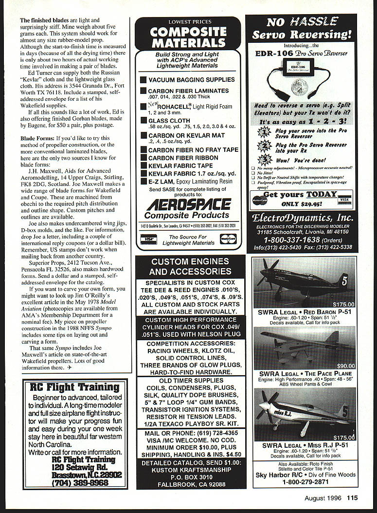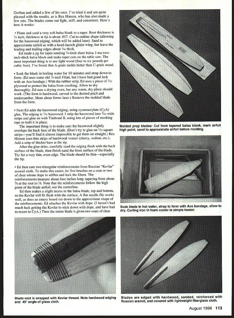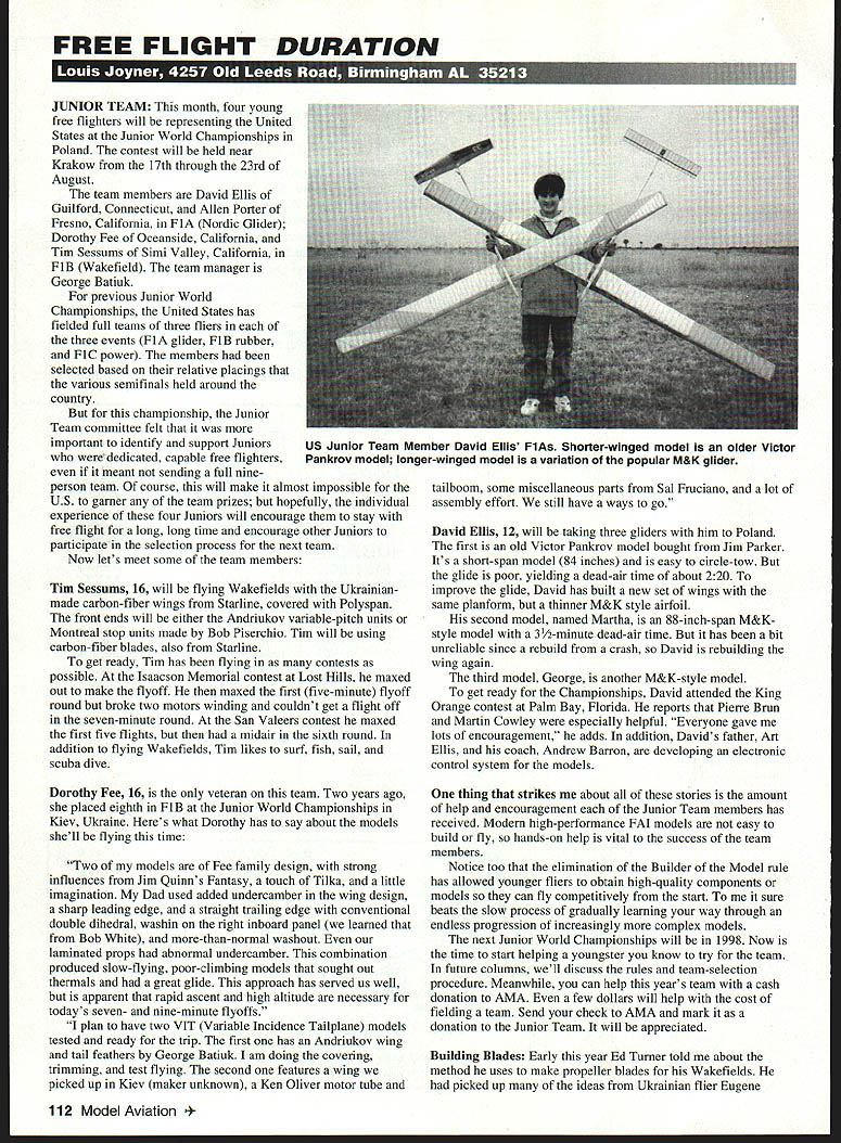 FREE FLIGHT DURATION JUNIOR TEAM month four young free fighters will representing United States Junior World Championships Poland contest will held near Krakow 17th through 23rd August team members David Ellis Guilford Connecticut Allen Porter Fresno California FlA Nordic Glider Dorothy Fee Oceanside California Tim Sessums Simi Valley California FiB Wakefield team manager George Batiuk previous Junior World Championships United States has fielded full teams three fliers three events FIA glider FiB rubber F IC power members selected based relative placings various semifinals held around country championship Junior Team committee felt important identify support Juniors dedicated capable free fighters meant sending full nineperson team course will make almost impossible US garner team prizes hopefully individual experience four Juniors will encourage stay free flight long long time encourage other Juniors participate selection process next team Now lets meet some team members Tim Sessums 16 will flying Wakefields Ukrainianmade carbon-fiber wings Starline covered Polyspan front ends will either Andriukov variable-pitch units Montreal stop units made Bob Piserchio Tim will using carbon-fiber blades also Starline get ready Tim has flying contests possible Isaacson Memorial contest Lost Hills maxed out make flyoff maxed first five-minute flyoff round broke two motors winding couldnt get flight off seven-minute round San Valeers contest maxed first five flights midair sixth round addition flying Wakefields Tim likes surf fish sail scuba dive Dorothy Fee 16 veteran team Two years ago placed eighth FlB Junior World Championships Kiev Ukraine Heres what Dorothy has say about models shell flying time Two models Fee family design strong influences Jim Quinns Fantasy touch Tilka little imagination Dad used added undercamber wing design sharp leading edge straight trailing edge conventional double dihedral washin right inboard panel learned Bob White more-than-normal washout laminated props abnormal undercamber combination produced slow-flying poor-climbing models sought out thermals great glide approach has served us well apparent rapid ascent high altitude necessary todays seven- nine-minute flyoffs plan have two VIT Variable Incidence Tailplane models tested ready trip first has Andriukov wing tail feathers George Batiuk am doing covering trimming test flying second features wing picked up Kiev maker unknown Ken Oliver motor tube tailboom some miscellaneous parts Sal Fruciano lot assembly effort still have ways go David Ellis 12 will taking three gliders him Poland first old Victor Pankrov model bought Jim Parker Its short-span model 84 inches easy circle-tow glide poor yielding dead-air time about 220 improve glide David has built new set wings same planform thinner M&K style airfoil second model named Martha 88-inch-span M&K style model 31/2-minute dead-air time has bit unreliable since rebuild crash David rebuilding wing again third model George another M&K-style model get ready Championships David attended King Orange contest Palm Bay Florida reports Pierre Brun Martin Cowley especially helpful Everyone gave lots encouragement adds addition Davids father Art Ellis coach Andrew Barron developing electronic control system models thing strikes about stories amount help encouragement Junior Team members has received Modern high-performance FAI models easy build fly hands-on help vital success team members Notice too elimination Builder Model rule has allowed younger fliers obtain high-quality components models can fly competitively start sure beats slow process gradually learning way through endless progression increasingly complex models next Junior World Championships will 1998 Now time start helping youngster know try team future columns well discuss rules team-selection procedure Meanwhile can help years team cash donation AMA few dollars will help cost fielding team Send check AMA mark donation Junior Team will appreciated Building Blades Early year Ed Turner told about method uses make propeller blades Wakefields picked up ideas Ukrainian flier Eugene 112 Model Aviation 4US Junior Team Member David Ellis FlAs Shorter-winged model older Victor Pankrov model longer-winged model variation popular M&K glider Gorban added few own Ive tried am quite pleased results Rex Hinson has also made few sets blades come out light stiff consistent Heres works Plane sand very soft balsa blank taper Root thickness inch thickness tip about 017 Cut outline shape allowing basswood edging will added later Sand approximate airfoil hand-launch glider wing leave leading trailing edges about 1A6 thick Ed made jig taper-sanding -inch sheet balsa use twoinch-thick balsa block make taper cuts table saw important thing use light wood four six pounds per cubic foot Ive found A-grain molds better C-grain wood Soak blank boiling water 10 minutes strap down form Ed uses some old -inch Filati have good luck Ace bandage rubber strip Ed uses piece 2 plywood protect balsa crushing Allow dry thoroughly Ed uses drying oven warm dry place should work form hardwood carved desired pitch undercamber about forms later Remove molded blade form Next Ed adds basswood edging using cyanoacrylate CyA glue edging 2 basswood strip basswood 3A6-wide strips glue Titebond II using lots pieces masking tape hold place important thing make sure basswood slightly overlaps back face blade Dont try glue 2 square stripsyoull find almost impossible get straight Rex Hinson uses thin strips hardwood veneer cherry walnut etc Add strip thicker bass tip After glue dries carefully sand edging flush back surface blade finish-sand front surface blade Try very thin edge blade should thinespecially tip Ed cuts two triangular reinforcements Russian Kevlar aramid cloth make easier first brushes coat two clear nitrate dope stiffen lock fibers reinforcements measure about four inches long tapering about 3/ root reinforcements follow high point blade airfoil centerline Ed