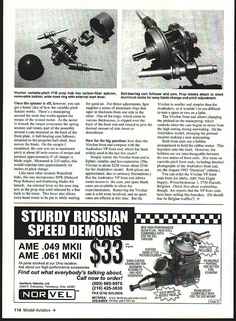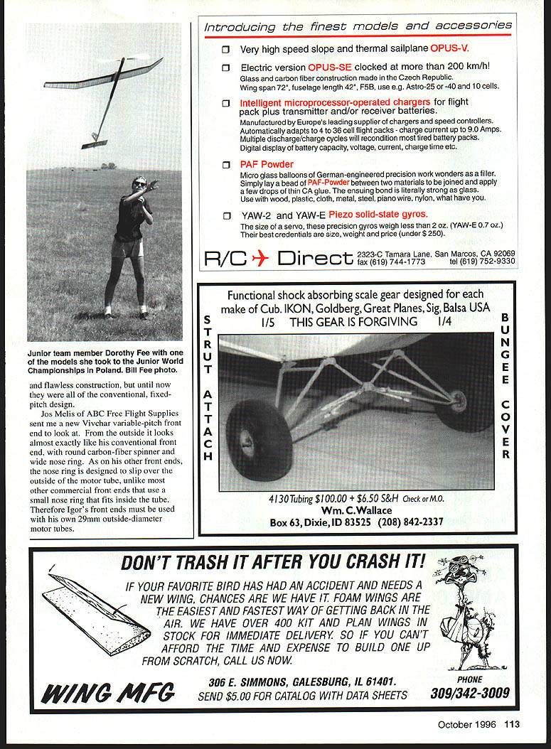 FREE FLIGHT DURATION SYMPO 96 Symposium National Free Flight Society better known Sympo annual publication combines technical practical articles aspects free flight design construction 1996 Sympo 29th edited Bill Bogart available NFFS Publications Director Fred Terzian 4858 Moorpark Ave San Jose CA 95 129-2132 cost $20 NFFS members $24 non-members Postage $3 Some papers 1996 Sympo Playing P-30 Models John ODwyer traces some experiments popular P-30 rubber class Flapped Wing FlC Gil Moms has worked long hard develop practical reliable power model wing changes camber reduced drag during climb increased lift glide Thoughts Handlaunched Glider Design Despite simple appearance hand-launched gliders challenge design build fly Glen Simpers paper presents ideas observations Evolution Very High Thrust Line Keith Hoover years strong proponent VHTL power models explores alternative way control power pattern gas model Making Propellers Rubber Powered Models Len Sherman offers tips techniques carving prop traditional way solid block balsa Universal Forming Block Propeller Blades Two Finnish modelers Kai Halsas Antti Jolma offer alternative way form Indoor rubber model blades using tapered can form Nordic Electronic Timers Stab Control Mechanisms Aram Schlosberg discusses latest developments electronic timers control bunt phase towline glider launch 96 Sympo also honors Ten Models Year Several should familiar regular readers column Small GasNorm Poti s Nibble 300 Large GasJays Bird Vic Jays Frank Parmenter Easy BLarry Coslicks Akron MiniStickK777 Joe Krush Catapult GliderFeather Shooter Bob Bienenstein FlG Rubberthe late Eric Johnstons Dream Catcher FIASergei Makarov Michail Kochkarevs Short Model FlB1995 World Champion Jerry Fitch FiCthe 1995 World Champion Team Gil Morris Mike Achterberg Roger Simpson Southern California Aero Team also received special award its Scatter newsletter Touch Color both Rex Hinson Blame Miller called raving about color finish Tom McCoys models decided check out Heres Toms method producing good-looking color finish new Polyspan covering material After usual finish-sanding Tom attaches Polyspan using full-strength clear dope shrinks polyester material using hot iron Next model gets two coats 50/50 dope brushed sprays model mixture 10 parts thinner 1 part Higgins fade-proof ink 2 parts clear dope small amount dope seems make difference perhaps makes mixture just sticky enough produce run-free finish can find Higgins ink art supply crafts stores just sure get fade-proof variety Sal Fruciano Starline International can supply Higgins ink well Polyspan covering material Sal US importer Polyspan last two years have covered about half-dozen wings Polyspan easy use very very durable attach full-strength dope covering bottom wing first use small brush work dope along both sides rib above make sure covering will stay attached undercambered ribs Ed Turner tells simply dopes wing frame 50/50 dope attaches Polyspan acetone Sure sounds simpler Polyspan instructions say after covering can either dope wing heat-shrink vice-versa Ive tried both ways found best heatshrink first before doping tried doping first some problems top bottom covering sticking together just front trailing edge very thin wings Tom McCoy also suggested using hot iron help Polyspan go around sharp corners built-up rubber model fuselages trims covering about 3A2 inch oversized laps around corner havent given Polyspan try order some Starline International 6146 East Cactus Wren Rd Scottsdale AZ 85253 cost $15 per roll plus $3 postage Ask catalog other hightech Free Flight items Vivchar VP Ukrainian Wakefield flier Igor Vivchar has considerable success last few years including winning World Cup third place 1995 World Championships equipment carefully designed madeoften military spec olivedrab-anodized finish aluminum parts surprising since instructor model building Ukrainian Army Wakefield front ends have noted light weight compact size October1996 111 Gil Morris third FiG last World Championships three Fl C team members honored 1996 NFFS Symposium Fl B World Champion Jerry Fitch checks timer model chosen NFFS Ten Models Year Junior team member Dorothy Fee models took Junior World Championships Poland Bill Fee photo flawless construction until now conventional fixedpitch design Jos Melis ABC Free Flight Supplies sent new Vivchar variable-pitch front end look outside looks almost exactly like conventional front end round carbon-fiber spinner wide nose ring As other front ends nose ring designed slip over outside motor tube unlike other commercial front ends use small nose ring fits inside tube Therefore Igor s front ends must used own 29mm outside-diameter motor tubes Introducing finest mode/s accessories 1 K N JVfNG MEG DONT TRASH IT AFTER YOU CRASH IT PHONE 309/342-3009 IF YOUR FAVORITE BIRD HAS HAD ACCIDENT AND NEEDS NEW WING CHANCES ARE WE HAVE IT FOAM WINGS ARE THE EASIEST AND FASTEST WAY OF GETTING BACK IN THE AIR WE HAVE OVER 400 KIT AND PLAN WINGS IN STOCK FOR IMMEDIATE DELIVERY SO IF YOU CANT AFFORD THE TIME AND EXPENSE TO BUILD ONE UP FROM SCRATCH CALL US NOW 306 E SIMMONS GAL ESBURS IL 61401 SEND $500 FOR CATALOG WITH DATA SHEETS October1996 113 ri Very high speed slope thermal sailplane OPUS-V l Electric version OPUS-SE clocked 200 km/h Glass carbon fiber construction made Czech Republic Wing span 72 fuselage length 42 F5B use eg Astro-25 -40 10 cells Intelligent microprocessor-operated chargers flight pack plus transmitter and/or receiver batteries Manufactured Europes leading supplier chargers speed controllers Automatically adapts 4 36 cell flight packs charge current up 90 Amps Multiple discharge/charge cycles will recondition tired battery packs Digital display battery capacity voltage current charge time etc PAF Powder Micro glass balloons German-engineered precision work wonders filler Simply lay bead PAF-Powder between two materials joined apply few drops thin CA glue ensuing bond literally strong glass 
