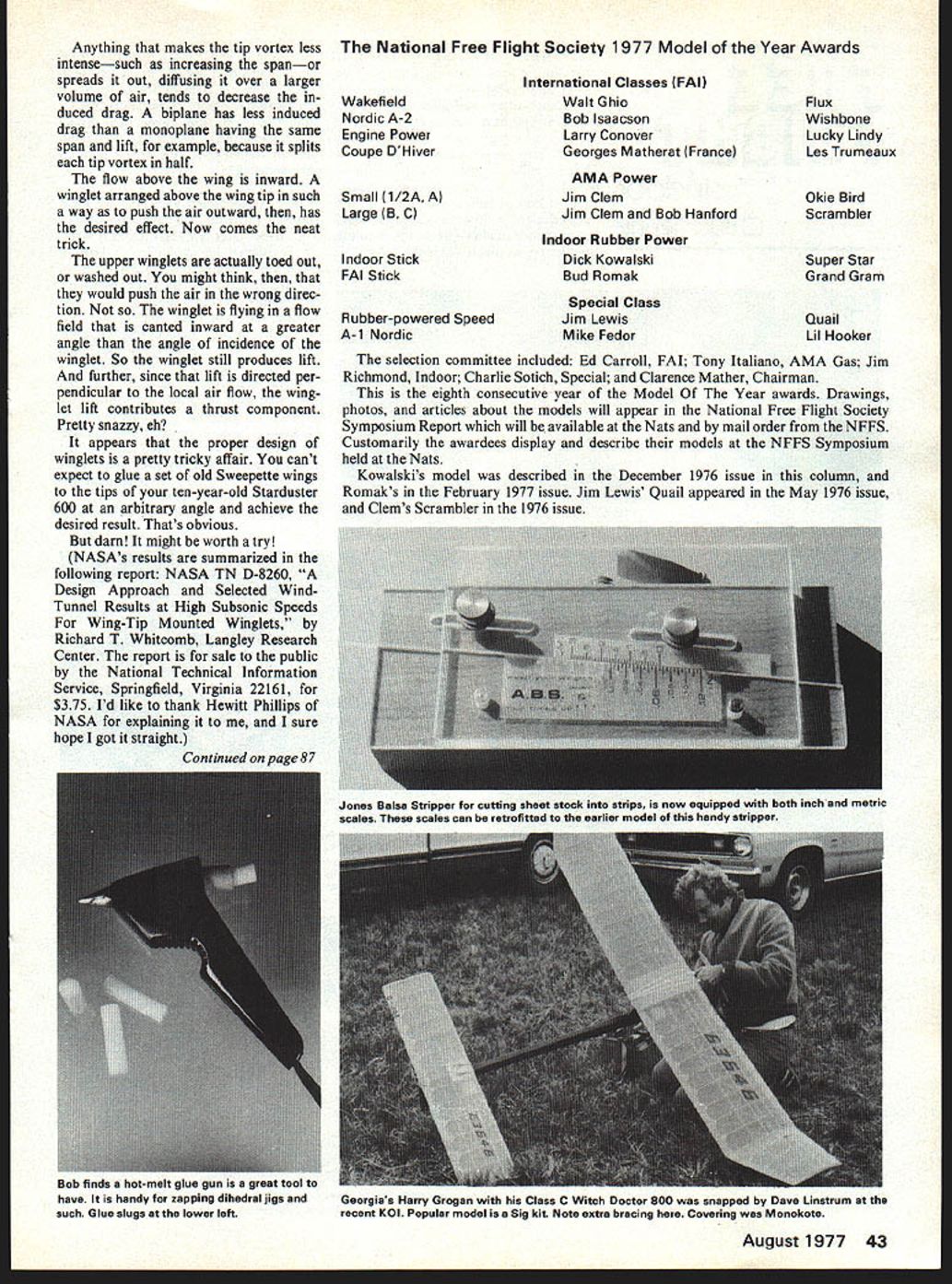 Duralion Meuser WINGLETS IN YOUR FUTURE Winglets small nearly vertical winglike surfaces mounted tips wing Recent NASA tests have shown propT#pica/ q,9Iet section Wing/ct i dug Upper-4 Loive root -7 Lo*wr 4 -ii 38 erly designed winglets reduced induced drag about 20% increased wing lift-drag ratio about 9% aircraft tested 14IcK C 65C ZC 5Zl /50 surface -F--- 4 geipw surface tip plates employed Garamis Strato Streak decades ago well known fact such tip plates patented Lancaster 1897 Arent winglets same thing long shot Tip plates characteristically low-aspect-ratio surfaces set parallel aircraft center line inhibit spillage air bottom wing fuzz up tip vortices reduce induced drag own frictional drag usually compen sates decrease induced drag difference between tip plates winglets innovative contribution NASAs Richard Whitcomb state art winglets efficient high-aspectratio surfaces carefully designed placed set angle incidence con trived produce best result cam bered proper airfoil section doubt winglets will have much im pact free-flight model aviation competition classes say winglets will appear World Champs-winning FAI Power model days often features survive indeed become fashionablenot cause superiority merely lack clear-cut inferiority span-limited eventsPayload Cargo FAI-Indoor Pennyplane Novice Pennyplanewinglets might indeed prove useful other events simplest way reduce induced drag increase span Further remember winglets lifting surfaces set incidence angle class climb near ly vertical speed under power much greater glide speed induced dragdrag resulting lift during climbis negligible anyhow winglets under such conditions can add drag understand winglets work re duce induced drag must first under stand what induced drag about .-"textbooks dont help much often fail distinguish between physical phe nomena mathematically convenient artifices best difficult subject So fasten seatbelts hang dear life go wing produces lift pressure / lower surface exceeds upper surface high-pressure air under wing tends move outward around N.the tips low-pressure region above wing results wing-tip vortices shown sketches Notice airflow downward region between vortices precisely wing happens vortices induce generally downward flow over wing drag effect produces -called induced drag effect wing flying through downward-sloping airflow field fly ing uphill lift forcethe force per pendicular airflowslopes back wards has component parallel flight path drag component drag resulting lift termed induced drag NASA winglets may cure-all free-flight models have spectacular success Varieze pg 20 Feb 1976 MA cruises 30% power62-hp Volkswagen engineat 135 mph 186 75% carries two people 1000 miles 70 miles per gallon 1 K~// / 1 / / / $1 /7% 2eor /\ \/\ \ j I N Fop vew What noteworthy about Whitcomb wingletshe man devised coke bottle fuselage vital breaking through so-called sound barrieris very great reduction induced drag diagram representation induced air flow about normal wing 2 42 Model Aviation Anything makes tip vortex less intensesuch increasing spanor spreads out diffusing over larger volume air tends decrease duced drag biplane has less induced drag monoplane having same span lift example because splits tip vortex half flow above wing inward winglet arranged above wing tip such way push air outward has desired effect Now comes neat trick upper winglets actually toed out washed out might think would push air wrong direc tion winglet flying flow field canted inward greater angle angle incidence winglet So winglet still produces lift further since lift directed per pendicular local air flow winglet lift contributes thrust component Pretty snazzy eh appears proper design winglets pretty tricky affair cant expect glue set old Sweepette wings tips ten-year-old Starduster 600 arbitrary angle achieve desired result Thats obvious darn might worth try NASAs results summarized following report NASA TN D-8260 Design Approach Selected WindTunnel Results High Subsonic Speeds Wing-Tip Mounted Winglets Richard T Whitcomb Langley Research Center report sale public National Technical Information Service Springfield Virginia 22161 $375 Id like thank Hewitt Phillips NASA explaining sure hope got straight National Free Flight Society 1977 Model Year Awards International Classes FAI Wakefield Nordic A-2 Engine Power Coupe DHiver Walt Ghio Bob Isaacson Larry Conover Georges Matherat France Flux Wishbone Lucky Lindy Les Trumeaux AMA Power Small l/2A Large B C Indoor Stick FAI Stick Jim Clem Jim Clem Bob Hanford Indoor Rubber Power Dick Kowalski Bud Romak Rubber-powered Speed A-i Nordic Special Class Jim Lewis Mike Fedor Okie Bird Scrambler Super Star Grand Gram Quail Lil Hooker selection committee included Ed Carroll FAI Tony Italiano AMA Gas Jim Richmond Indoor Charlie Sotich Special Clarence Mather Chairman eighth consecutive year Model Year awards Drawings photos articles about models will appear National Free Flight Society Symposium Report will available Nats mail order NFFS Customarily awardees display describe models NFFS Symposium held Nats Kowalskis model described December 1976 issue column Romaks February 1977 issue Jim Lewis Quail appeared May 1976 issue Clems Scrambler 1976 issue August1977 43 Continued page 87 Jones Balsa Stripper cutting sheet stock strips now equipped both inch metric scales scales can retrofitted earlier model handy stripper Bob finds hot-melt glue gun great tool have handy zapping dihedral jigs such Glue slugs lower left Georgias Harry Grogan Class C Witch Doctor 800 snapped Dave Linstrum recent KOI Popular model Sig kit Note extra bracing Covering Monokote two readers sent lengthy reports eight pages long said bum blebee cannot fly Anyway incredible may seem record stands what worth Austrian representa tive World Championship South Africa Karl Wasner witness flight Although acting official gave lengthy description scribe record-breaking flight attempts before electronic timers used runs respect spent