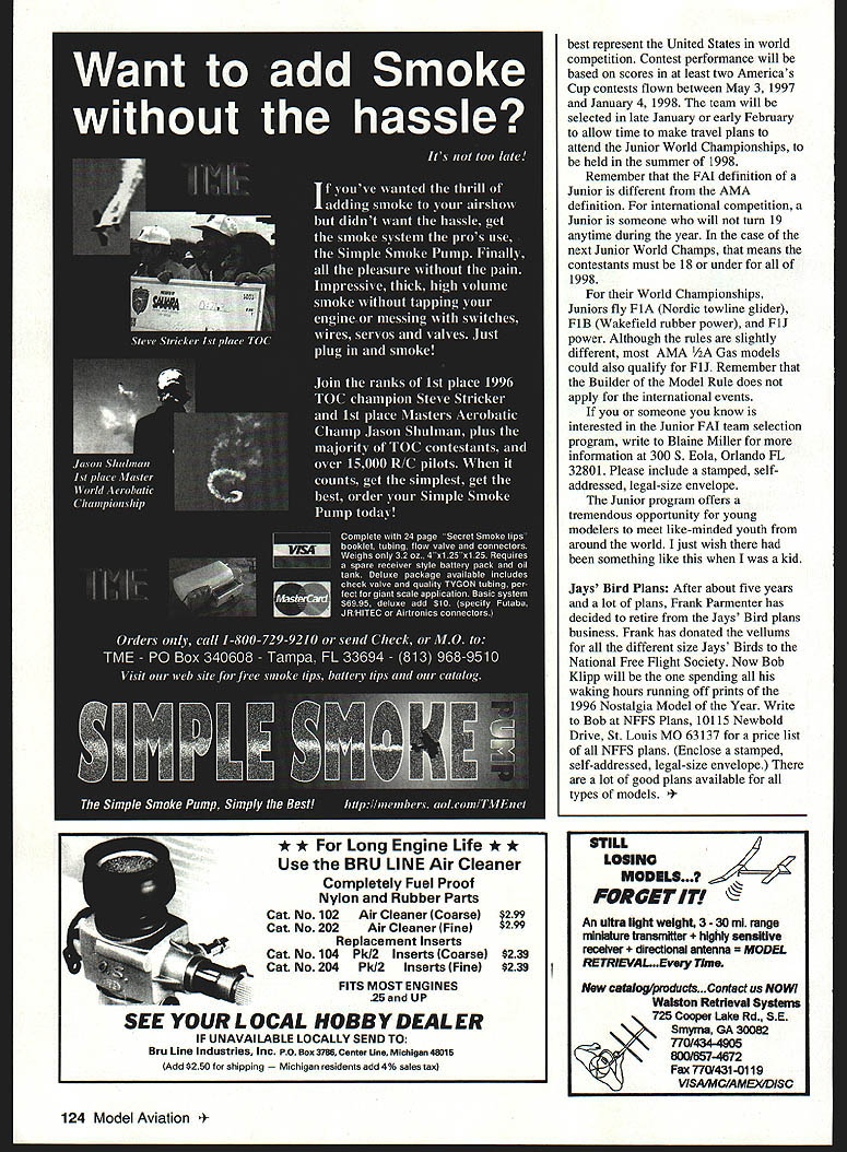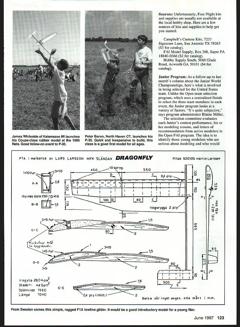 FREE FLIGHT DURATION WHERE TO BEGIN As writer thats often hardest part putting article paper someone interested Free Flight exactly get started can often toughest question Just no right way start story often isnt correct approach Free Flight Choosing type model begin will depend lot different factors Lets take look few much experience have modeling related activities Someone has building RC gliders plastic display models could attempt more-difficult first project someone has never held X-Acto knife far away nearest flying site live within easy driving distance Lost Hills other mega-sites build D Gas model other highperformance type available sites small look some lower-performance categories such Rubber Scale P-30 Coupe HandLaunched Glider keep up enthusiasm climb quickly up learning curve need flying often possible What other people area fly Lets face going need some help getting started Its lot easier build same type model folks around Its good idea pick same design nearby moreexperienced modeler flies What physical limitations Some events such Towline HandLaunched Glider require least some minimum level fitness Chasing also requires either reasonable fitness motorbike much money have spend Free Flight like other hobbies sports can inexpensive expensive want make tight budget consider Rubber Scale P-30 Hand-Launched Glider Catapult Glider FAI events Nordic Wakefield Power probably expensive build fly interested competition also need factor cost traveling contests much time have spend Often big deciding factor cost dollars Scale models can very time-consuming can building maintaining fleet Power models Since Builder Model rule eliminated FAI events can trade off building time money buy finished components readyto-fly model much space have can appropriate whole basement shop can build just about anything space limited may need restrict size models build well Are interested competition make easy yourself travel budget check around see what events flown local contests likely local schedule will include least few events simple models What types models interested Some people love sound high-revving engine smell burning castor oil other people like quiet grace glider circling overhead Pick something like extra enthusiasm will help get over inevitable hurdles Tom McCoys impeccable craftsmanship shows closeup crudelybuilt Kordas will fly Are interested latest technology Certain events notably FAI events almost demand use socalled high-tech materials such carbonfiber Kevlar Inmany other events can competitive using traditional materials such balsa tissue fact some events such Old Timer Nostalgia require use materials like variety competitive certain events requires almost total devotion event Often means building essentially same model over over making slight improvements time hope list will help narrow down choices Just note caution based personal experience Select event model build fly very easy have half-a-dozen projects going once never finish 122 Model Aviation McCoy certainly no beginner model Kordas 1939 Wakefield Winner fairly easy build offers good performance Sources Unfortunately Free Flight kits supplies usually available local hobby shop few sources kits supplies help get started Campbells Custom Kits 7233 Signature Lane San Antonio TX 78263 $3 catalog FAJ Model Supply Box 366 Sayre PA 18840-0366 $2 catalog Hobby Supply South 5060 Glade Road Acworth GA 30101 $4 catalog Junior Program As follow-up last months column about Junior World Championships heres what involved being selected United States team Unlike Open team selection program uses centralized finials select three team members event Junior program looks variety factors Its quite subjective says program administrator Blame Miller selection committee evaluates Juniors contest performance modeling resume letters recommendation active modelers Open FAI program idea identify young modelers serious about modeling would hyvias sista5011510 8-6 550 0COply r4 11 III Lii Iii - U Viflgbrygga 2 p1 N til 11 0 0 0 5I t FiA HeIbISa av LARS LARSSON MFK SLANOAN DRAGONFLY Riad 920105 Martin Larsson 10 spryg 1 I 7 -i z C 85 1U 2 Vinya 2904dm Stab- 44Scjrn2 Spannvidd 1980 Langd1040 Balsa dar inqet anes Alla rnt mm 0-0 15 500-J E 0 12 - dl U L Sweden comes simple rugged FlA towline glider would good introductory model young flier June 1997 123 James Whiteside Kalamazoo Ml launchesPeter Baron North Haven CT launches his Coupe-class rubber model 1996P-30 Quick inexpensive build Nats Good follow-on event P-30class good first model ages best represent United States world competition Contest performance will based scores least two Americas Cup contests flown between May 3 1997 January 4 1998 team will selected late January early February allow time make travel pians attend Junior World Championships held summer 1998 Remember FAL definition Junior different AMA definition international competition Junior someone will turn 19 anytime during year case next Junior World Champs means contestants must 18 under 1998 World Championships Juniors fly FlA Nordic towline glider FiB Wakefield rubber power F1J power Although rules slightly different AMA /2A Gas models could also qualify FlJ Remember Builder Model Rule does apply international events someone know interested Junior FAI team selection program write Blame Miller information 300 S Eola Orlando FL 32801 Please include stamped selfaddressed legal-size envelope Junior program offers tremendous opportunity young modelers meet like-minded youth around world just wish something like kid Jays Bird Plans After about five years lot plans Frank Parmenter has decided retire Jays Bird plans business Frank has donated vellums different size Jays Birds National Free Flight Society Now Bob Klipp will spending waking hours running off prints 1996 Nostalgia Model Year Write Bob NFFS Plans 10115 Newbold Drive St Louis MO 63137 price list NFFS plans Enclose stamped self-addressed legal-size envelope lot good plans availa